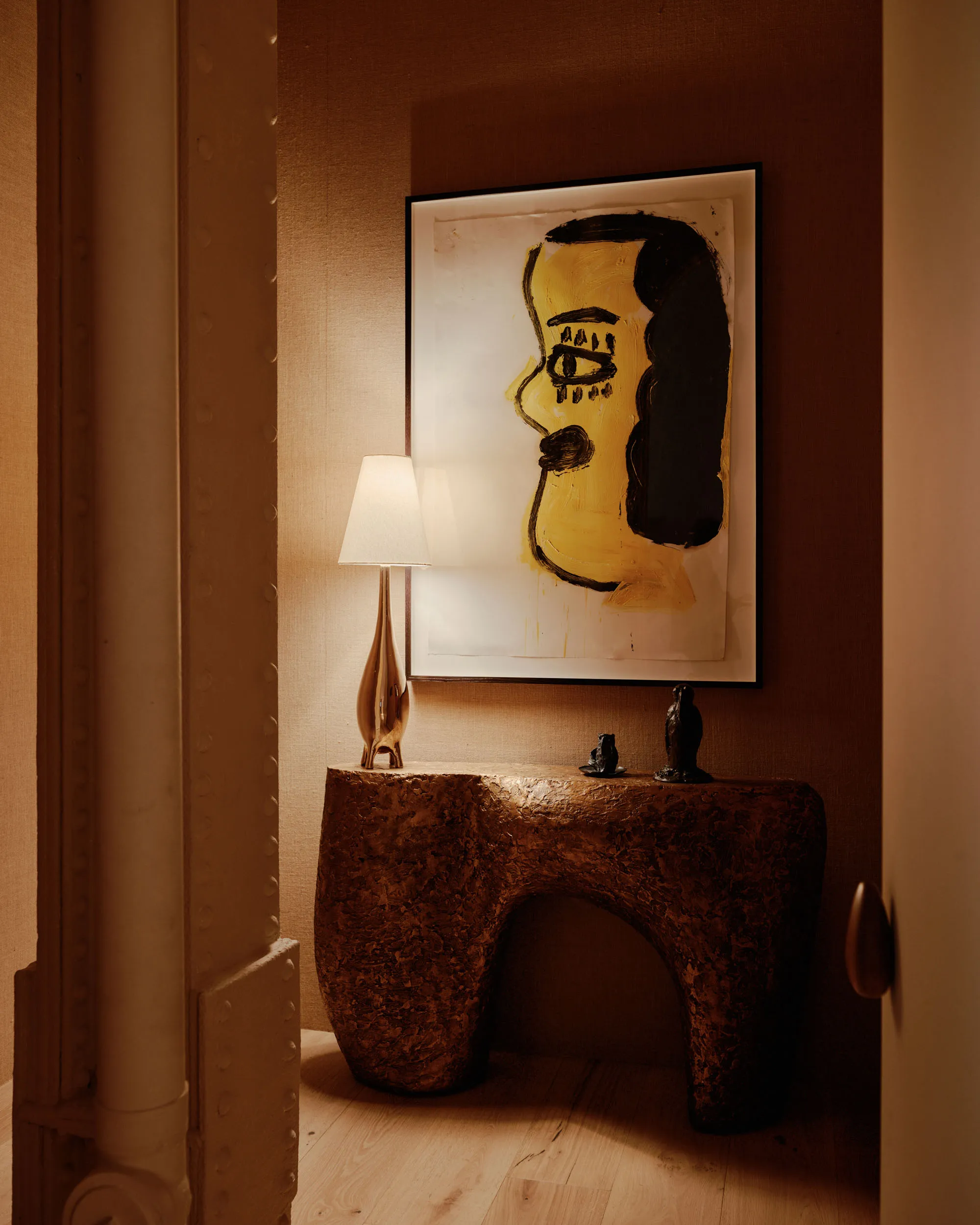 Venere Console by Simone Fanciullacci, limited edition 15 + 3AP – Gamot Bronze Table Lamp by David Aguirre, numbered edition – Broac II Bronze Sculpture by Victor Guedy, limited edition 8 + 4AP – Ceroferac Bronze Candle Holder by Victor Guedy, limited edition 8 + 4AP – Wood Door Pull by Nacho Polo & Robert Onuska – Painting from Nacho Polo & Robert Onuska private art collection – Rose Wylie, Yellow Head 1 (A Mother), 2020. Not for sale