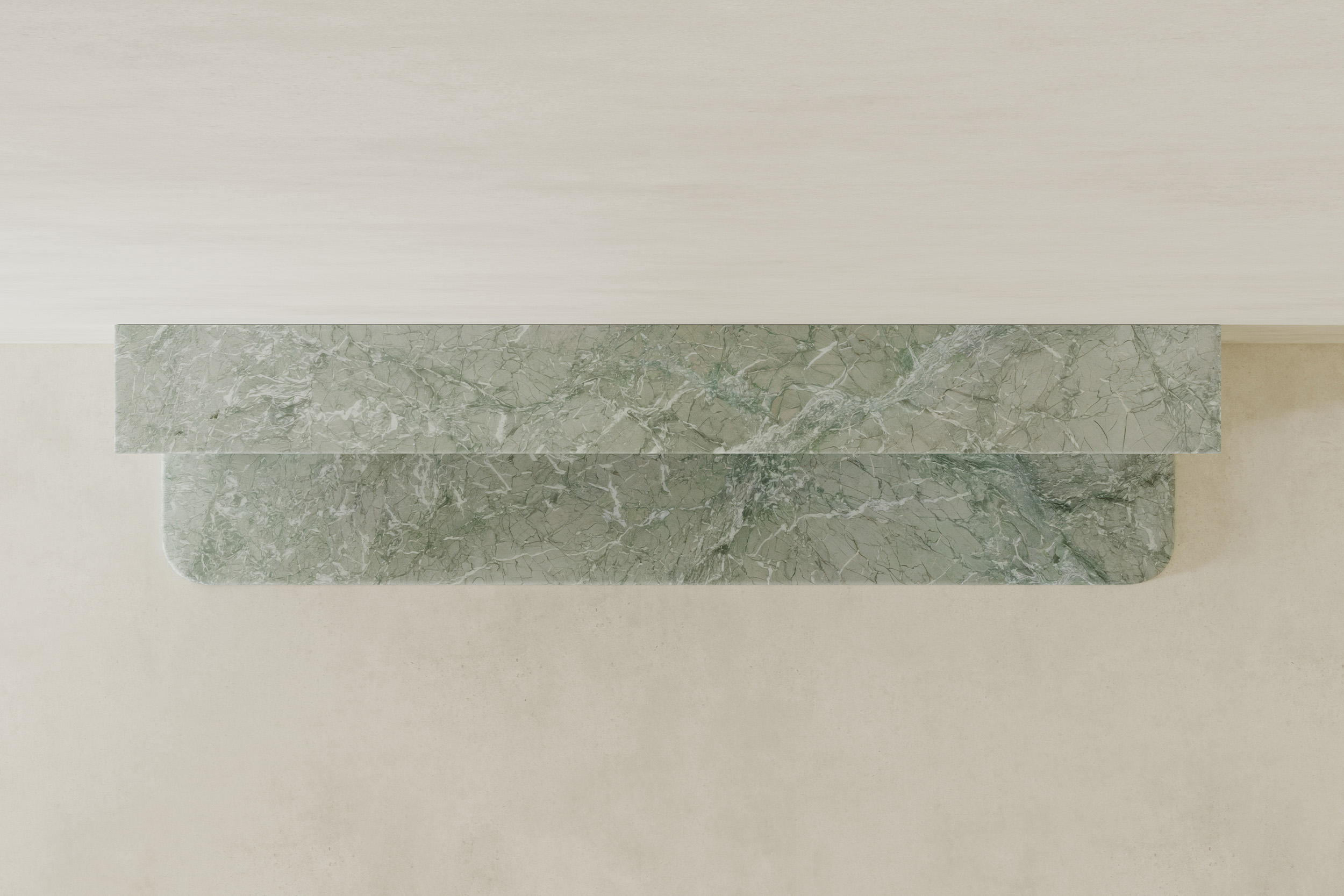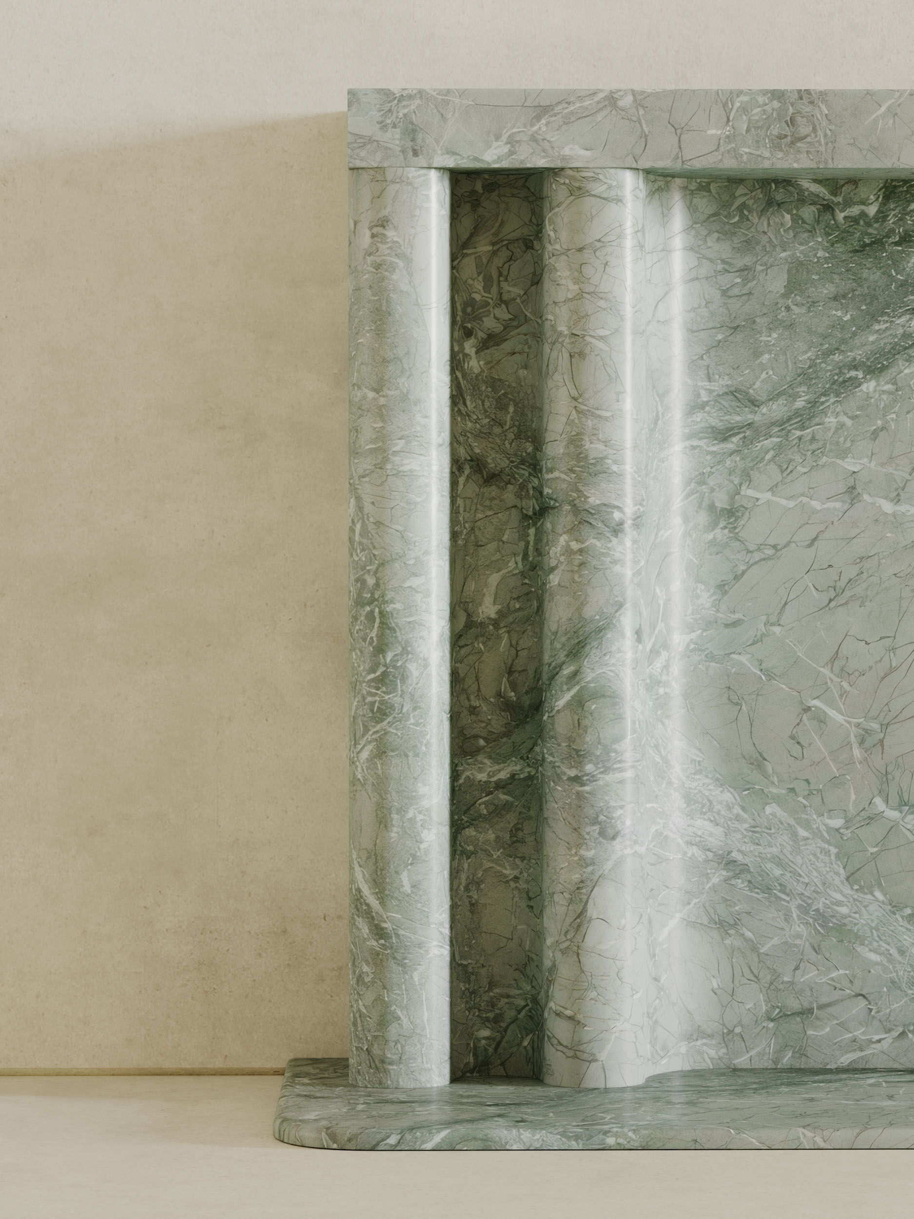 Material is central to Balzano’s philosophy of exposure. Executed in White Onyx, Grey Marble, and Green Marble, the collection allows stone to reveal its inner life. Veining, fragmentation, translucency, and density move across surfaces, animating the reduced geometry with natural rhythm. Surfaces are finished with restraint, preserving the character and tactile presence of stone