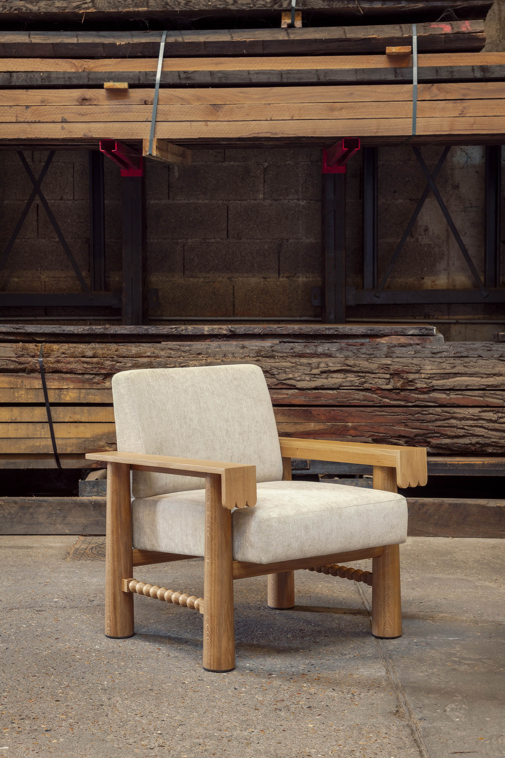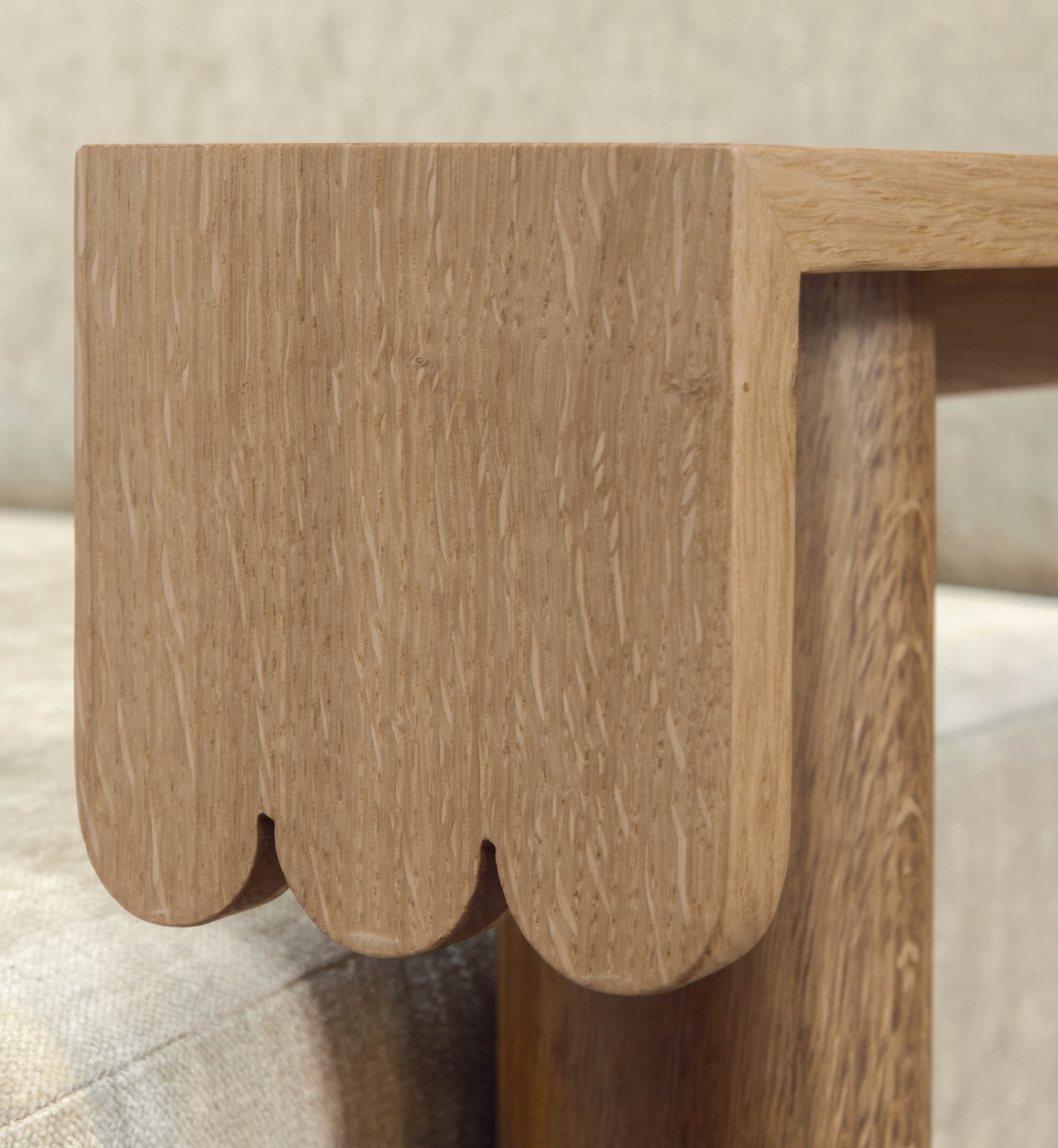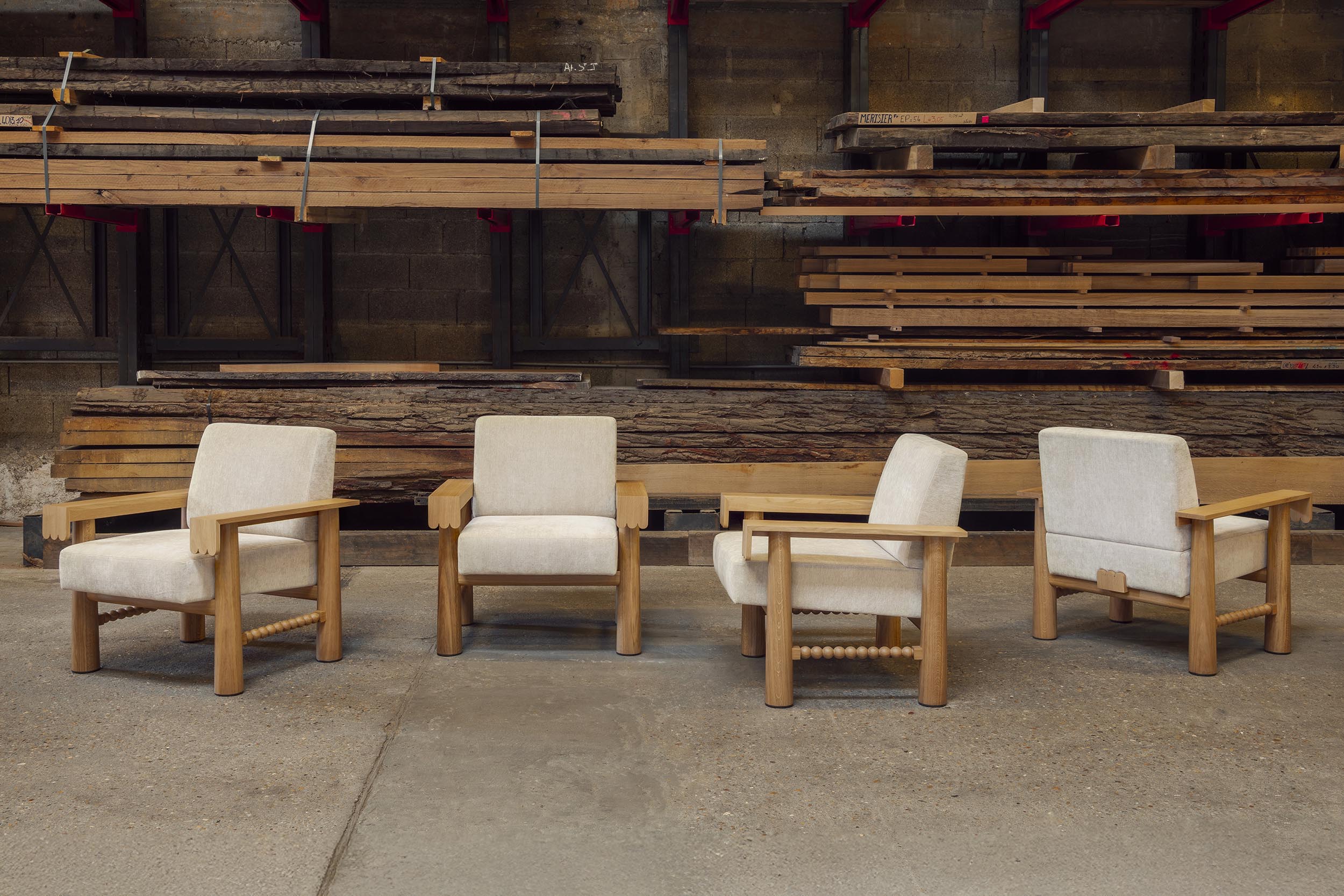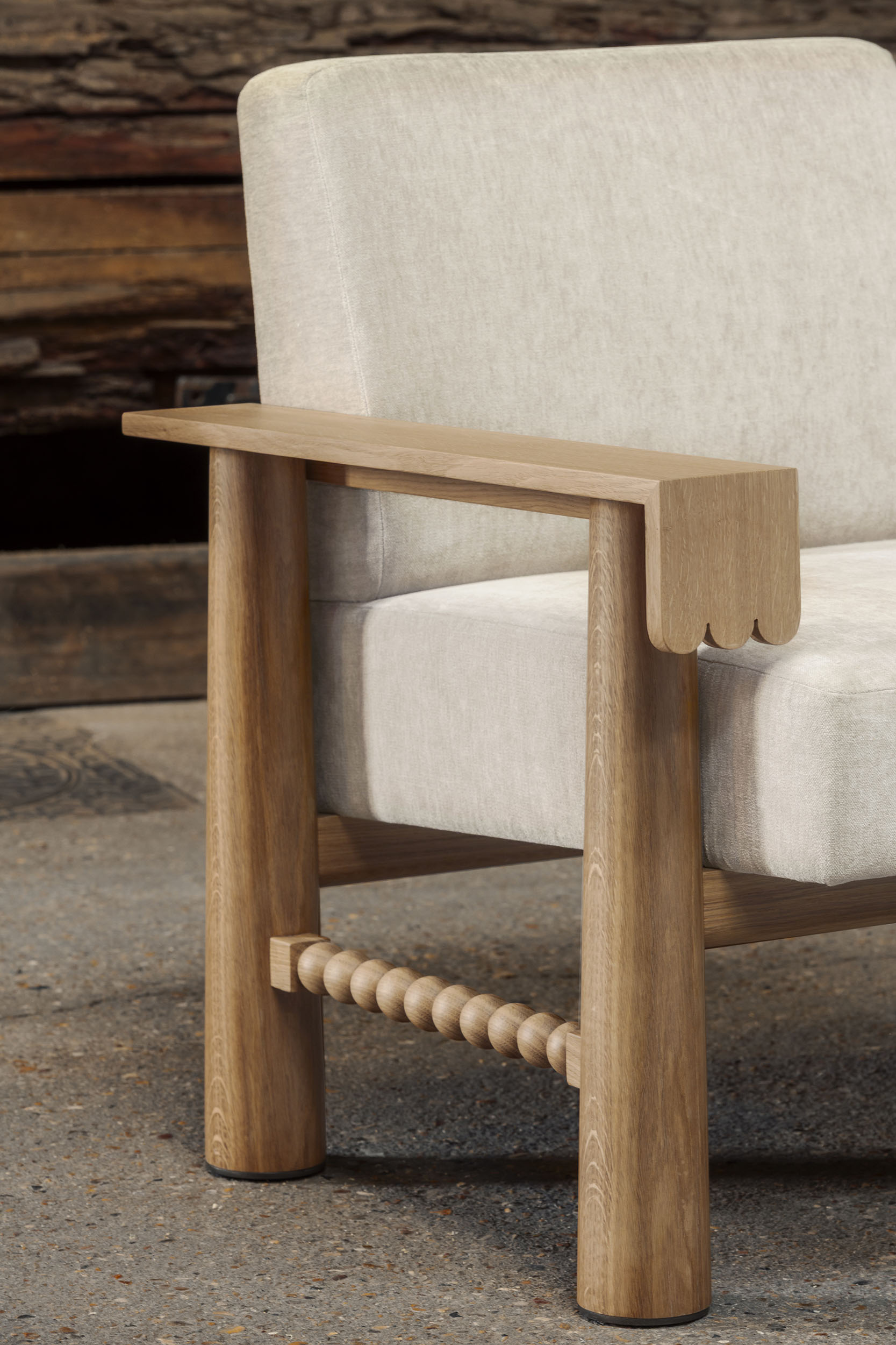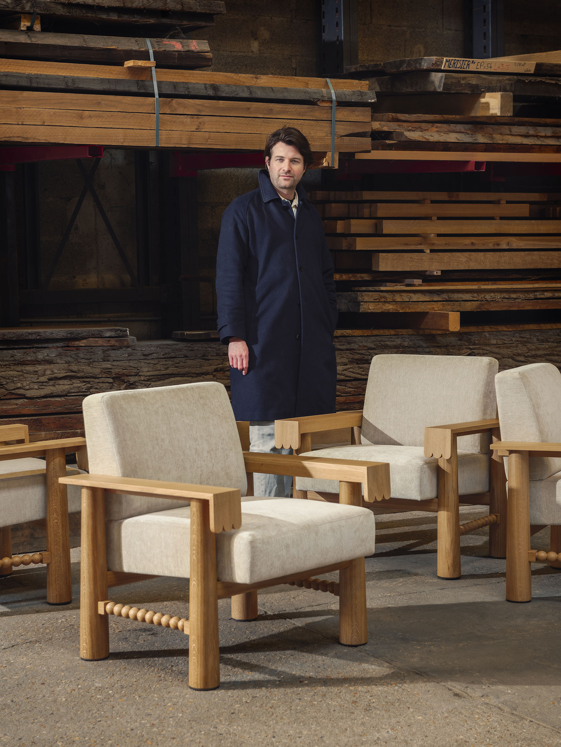 The collection draws inspiration from the primitive pine furniture of Axel Einar Hjorth, whose 1930s functionalism fused rustic craft with modernist rigor. Massé extends this lineage through the addition of ornament, humor, and tenderness, infusing rational construction with the sensual tactility of hand-carved oak, luminous limestone, and the softness of pale Dedar Belsuede upholstery