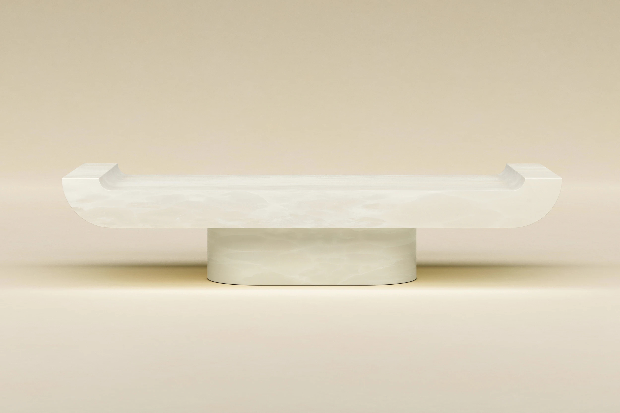 Boutillier’s selection of materials deepens the dialogue between beauty and danger, purity and darkness, subtlety and tempest. White onyx reveals translucent veins that catch and diffuse light, its surface glowing softly, like living tissue. Ziricote, by contrast, carries dramatic, shadow-rich graining, evoking wild pelts and the swirling, unpredictable patterns of the untamed world