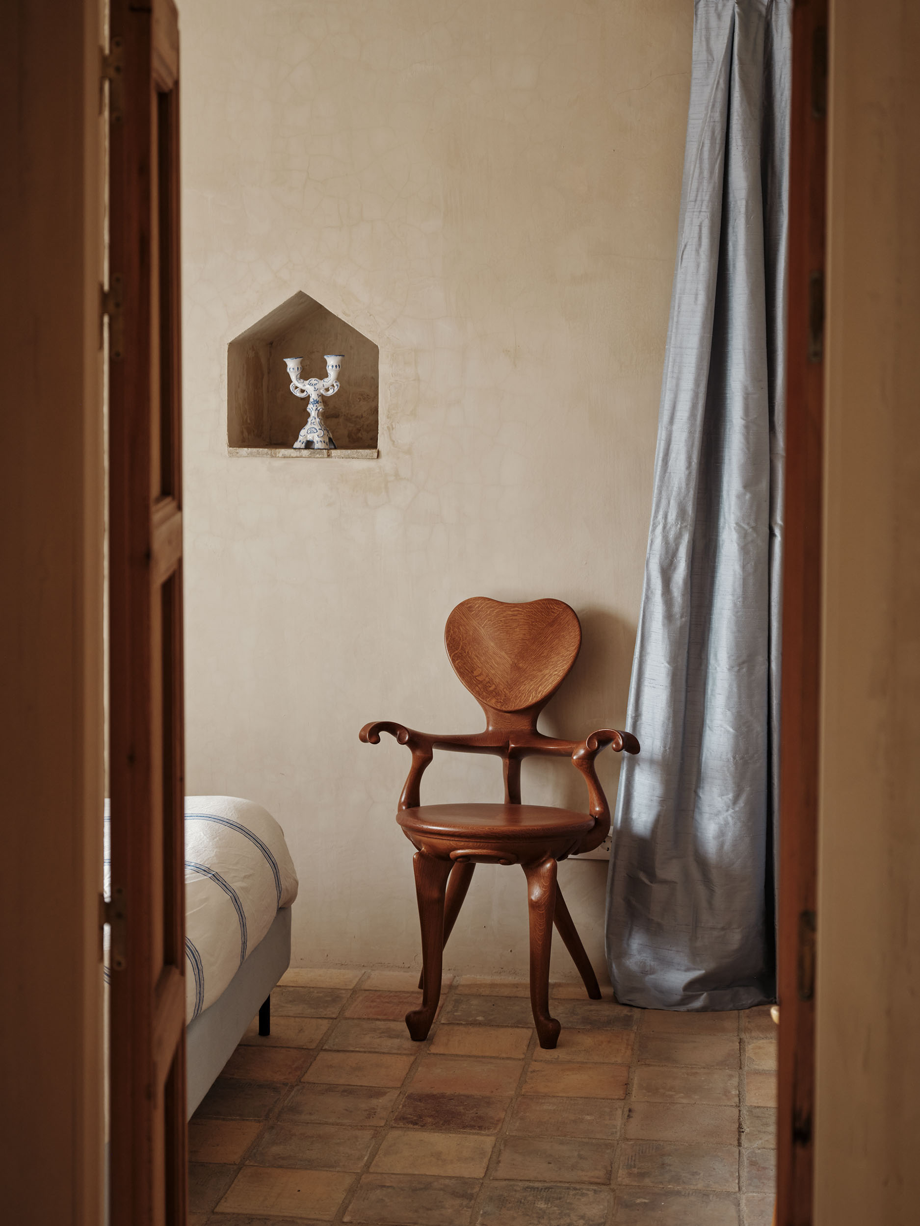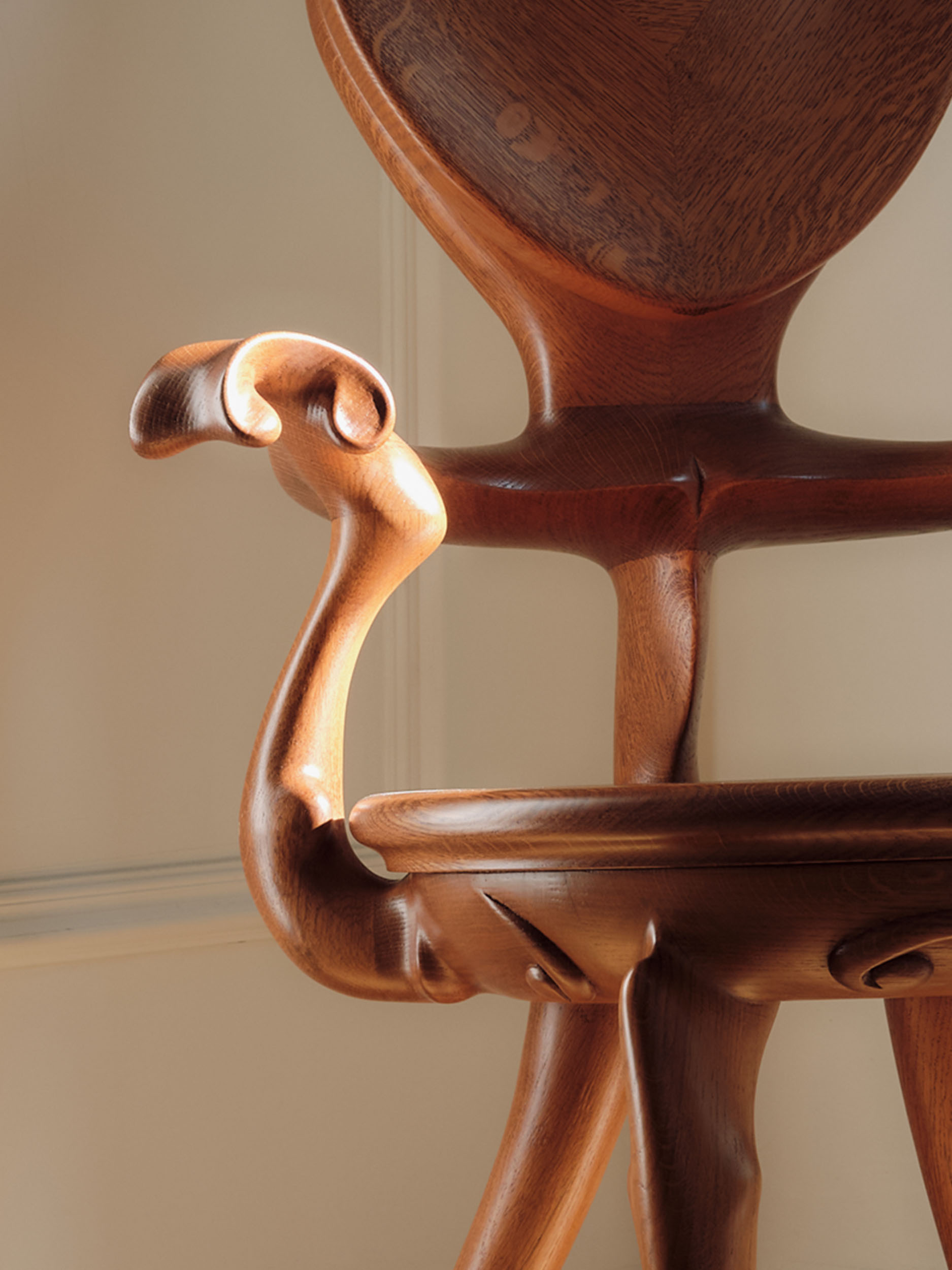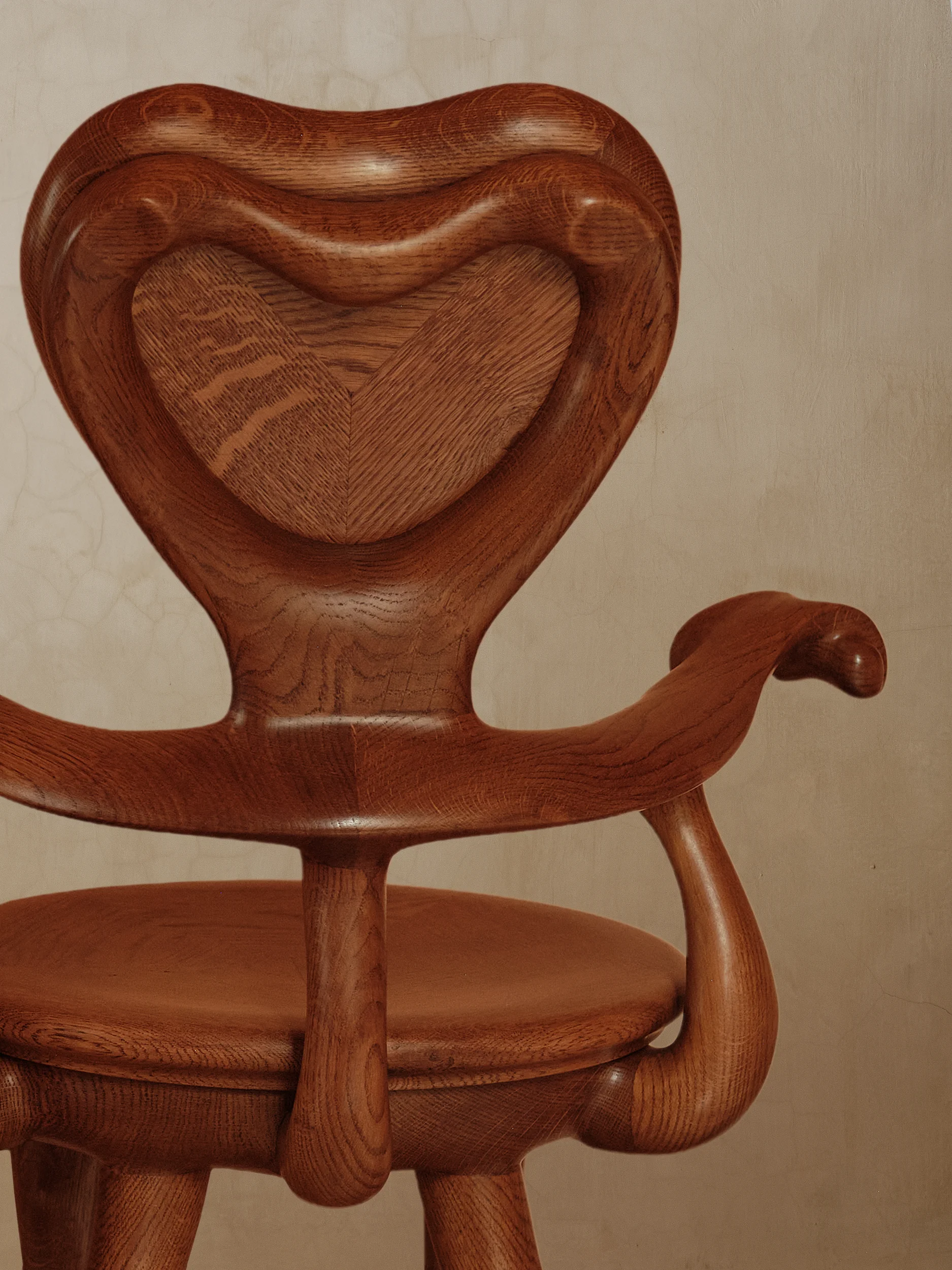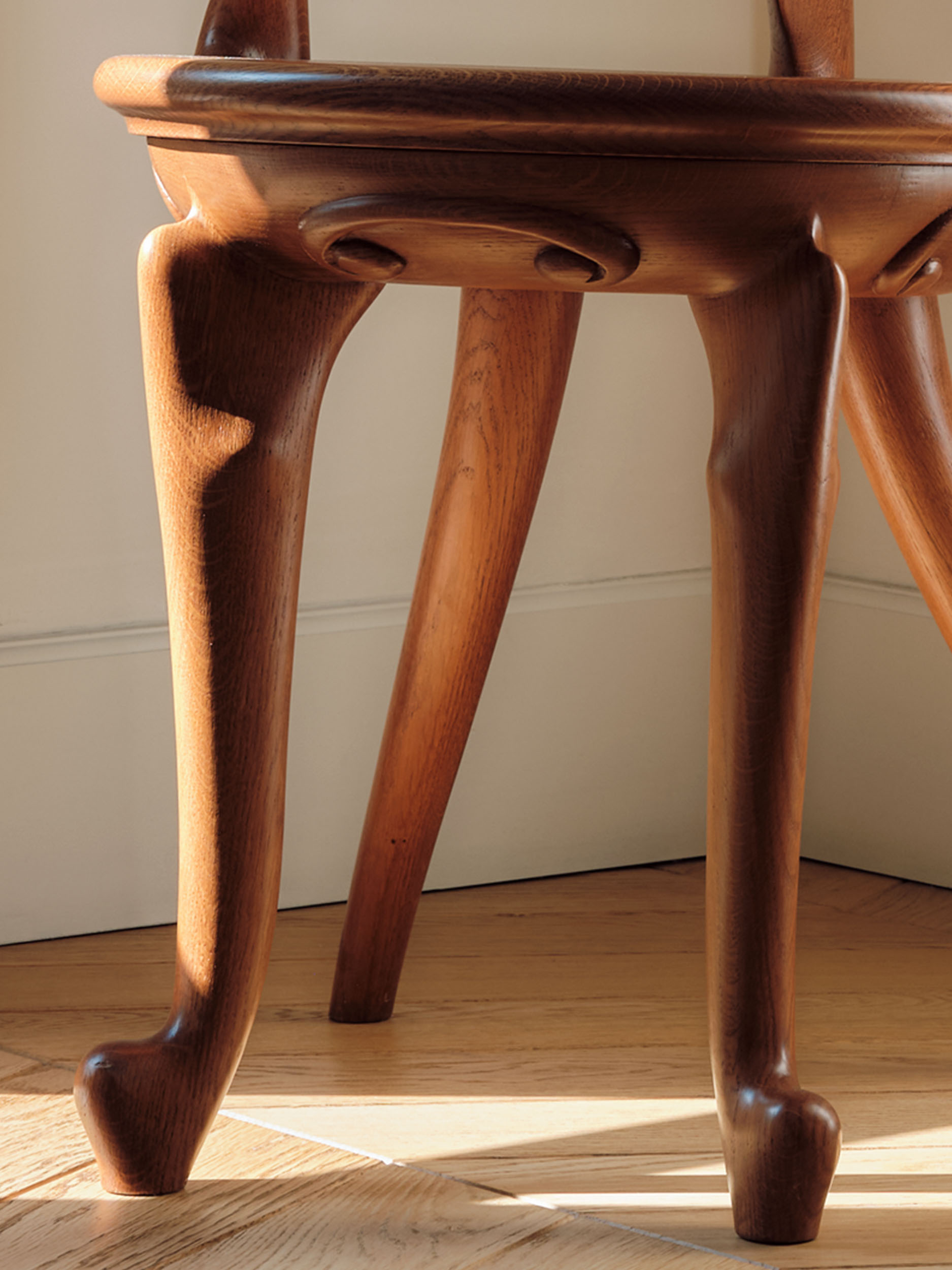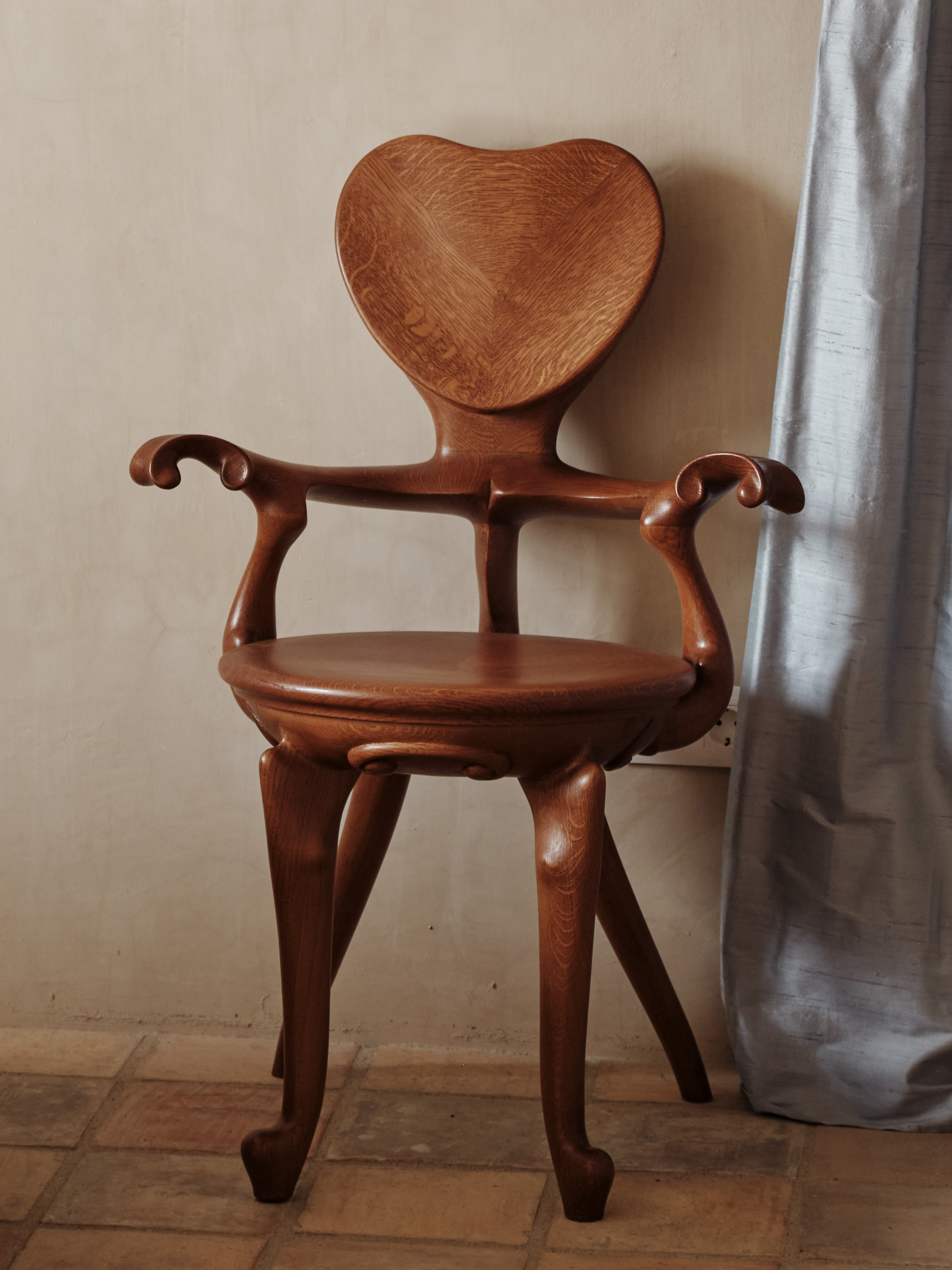 Crafted in solid oak, the armchair is produced today using the same traditional techniques employed in Gaudí’s time. Five distinct elements are precisely fitted together to form the chair’s sculptural body, giving rise to its thick neck, arched armrests, and distinctive heart-shaped backrest. This carefully articulated construction reveals Gaudí’s ability to transform structural necessity into expressive form