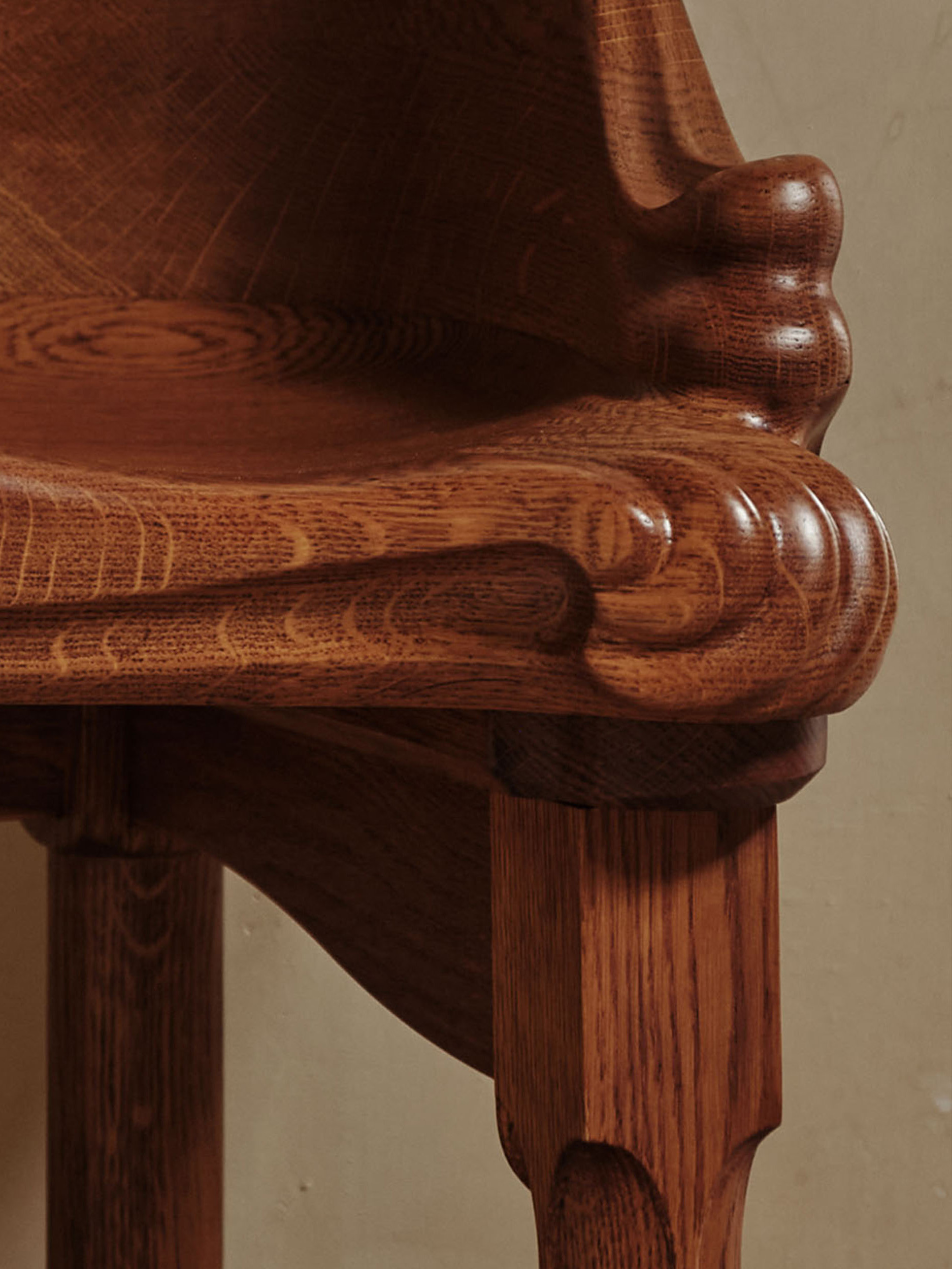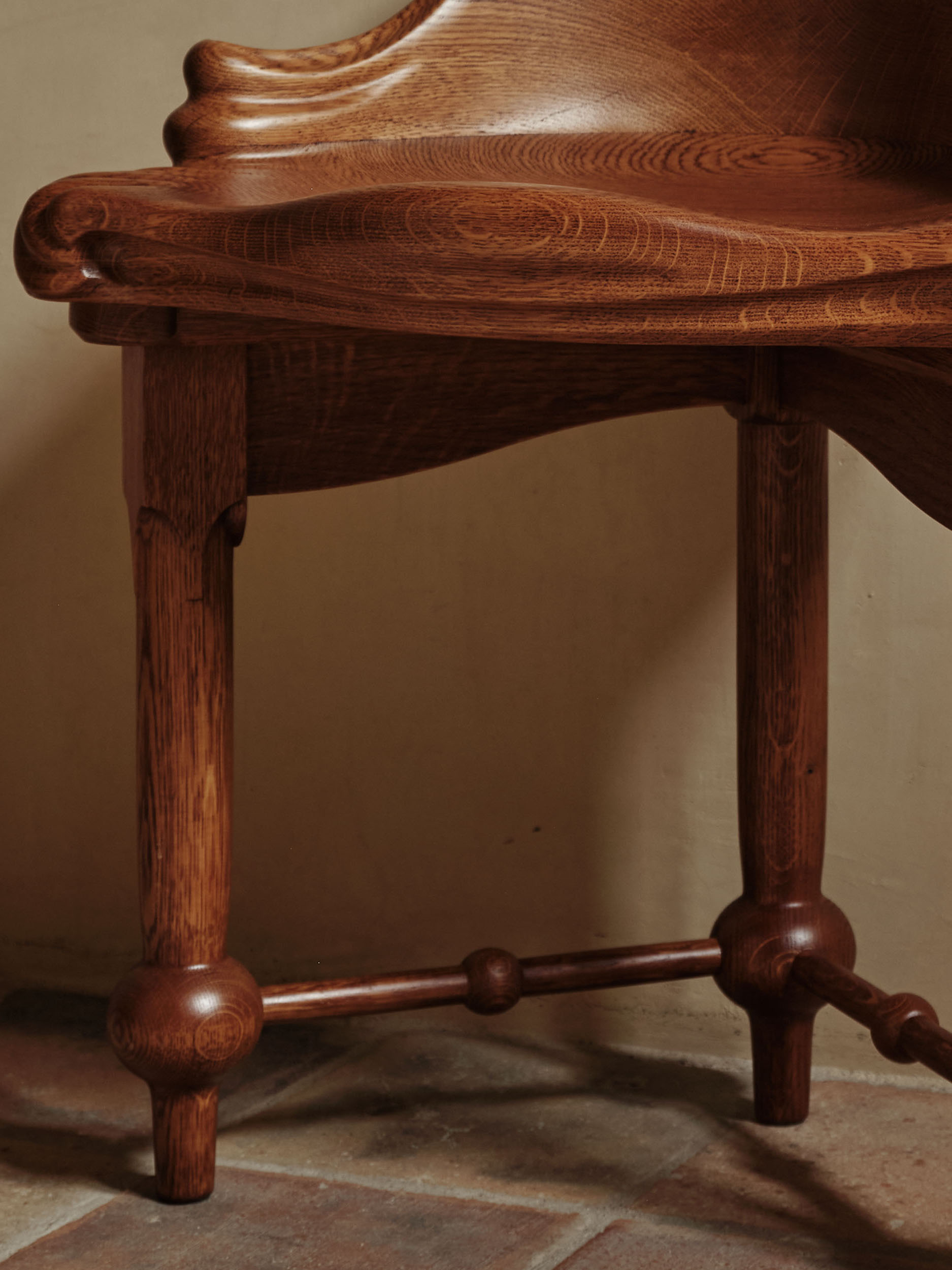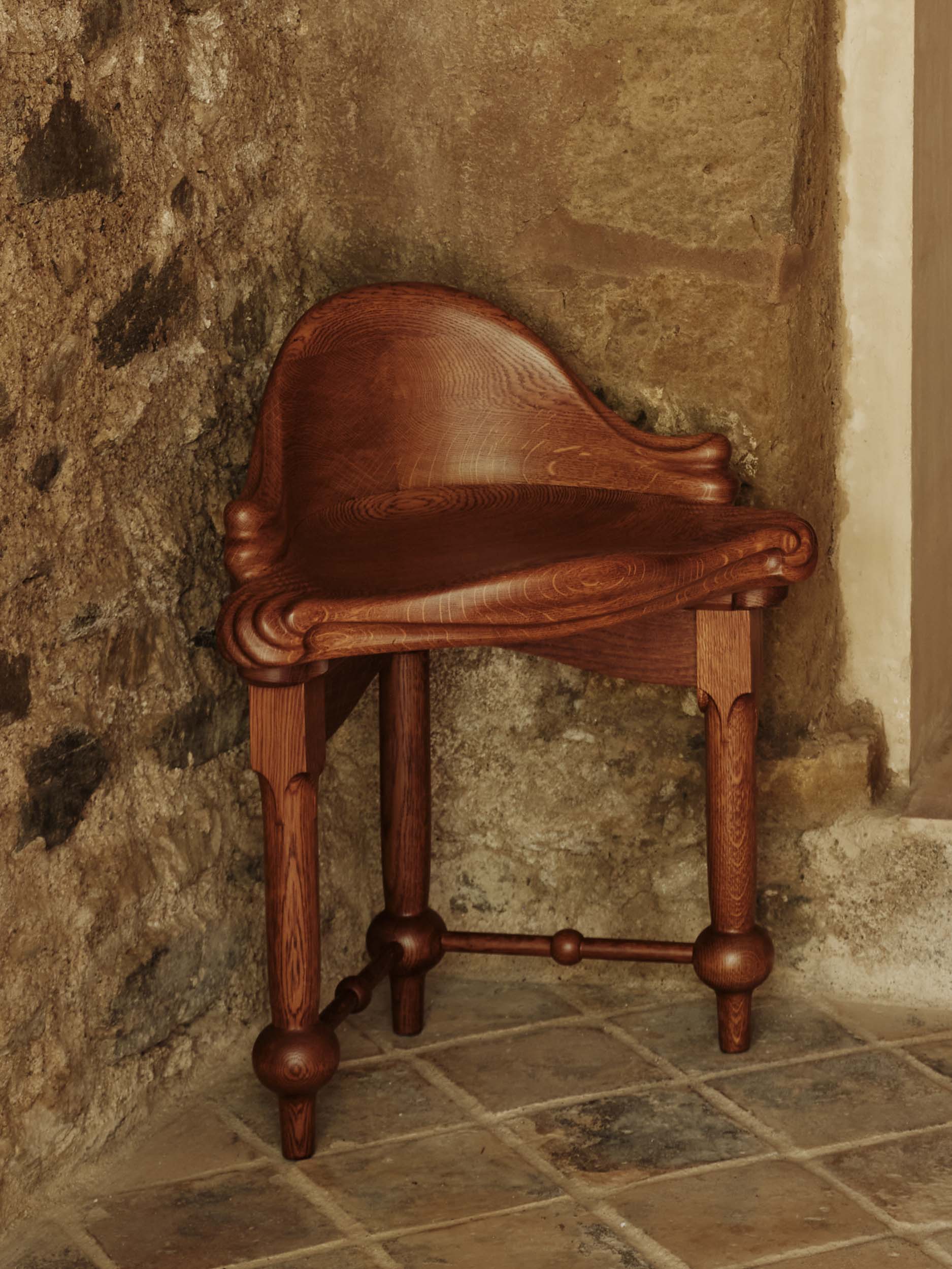 Its form is defined by rich, flowing contours, where the varnished oak grain curves upward into a subtly cornered backrest. Decorative elements are deliberately restrained, allowing the inherent beauty of the material and the precision of craftsmanship to take precedence. The stool’s symmetrical structure rests on three legs, enabling it to nest naturally into a corner while maintaining a strong sculptural presence