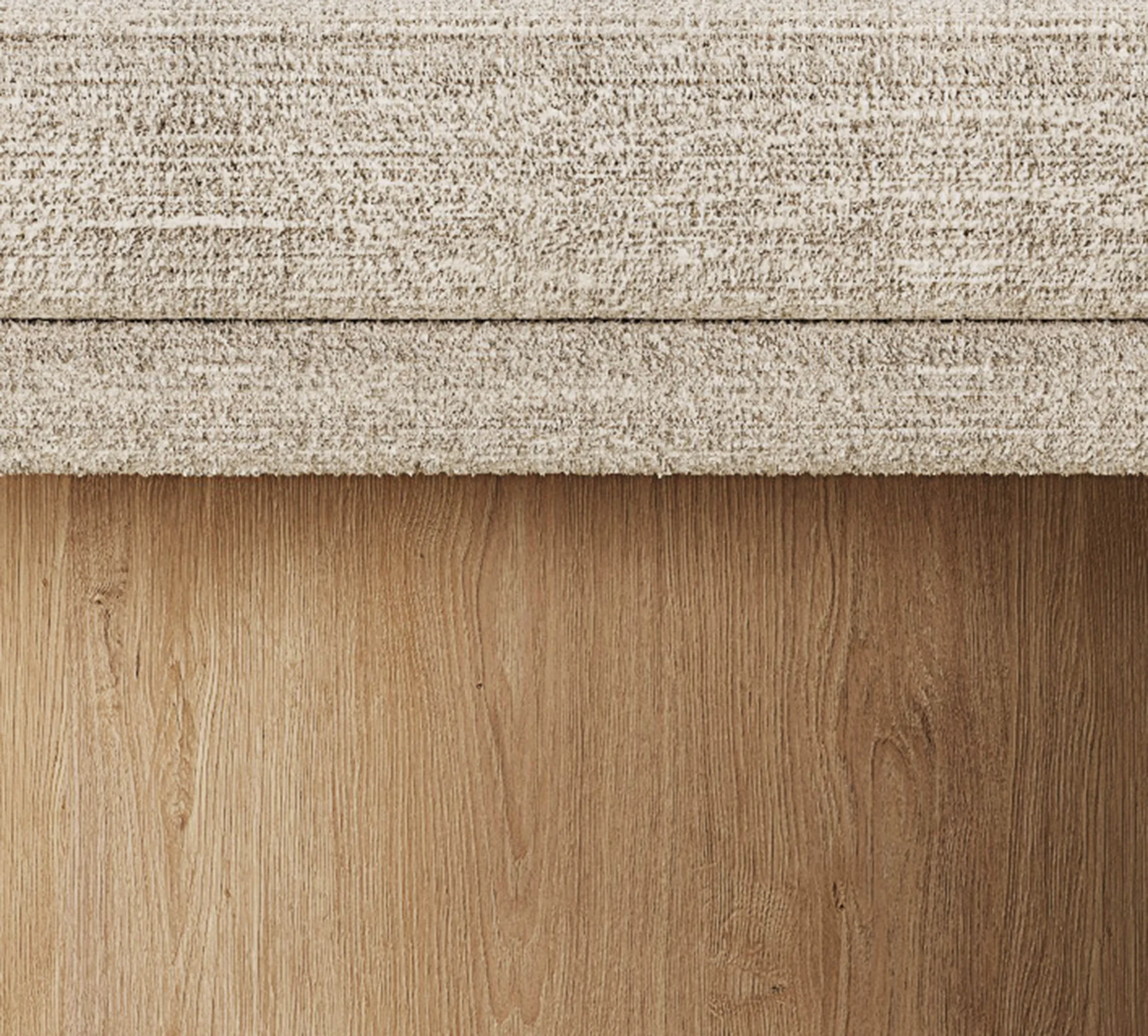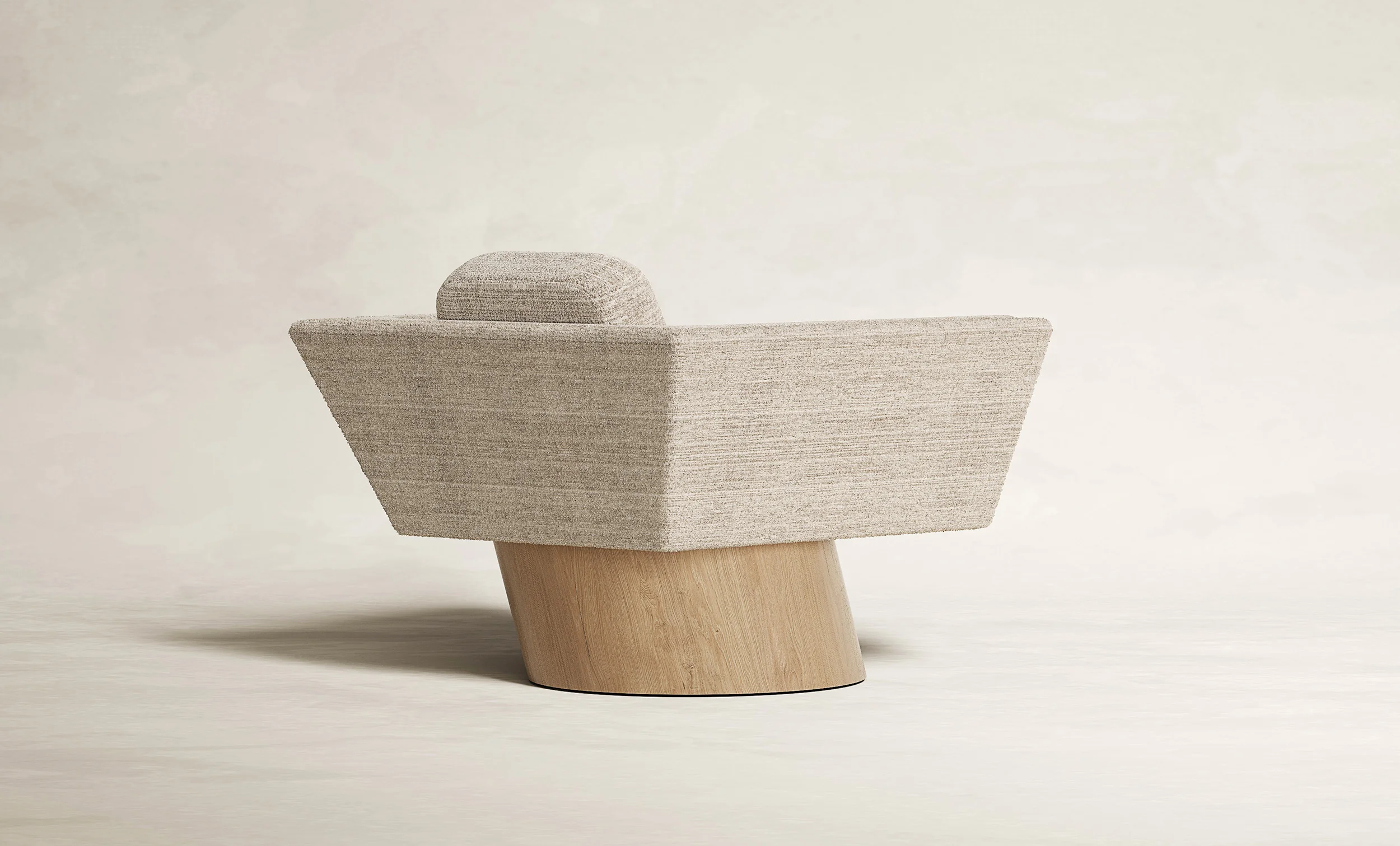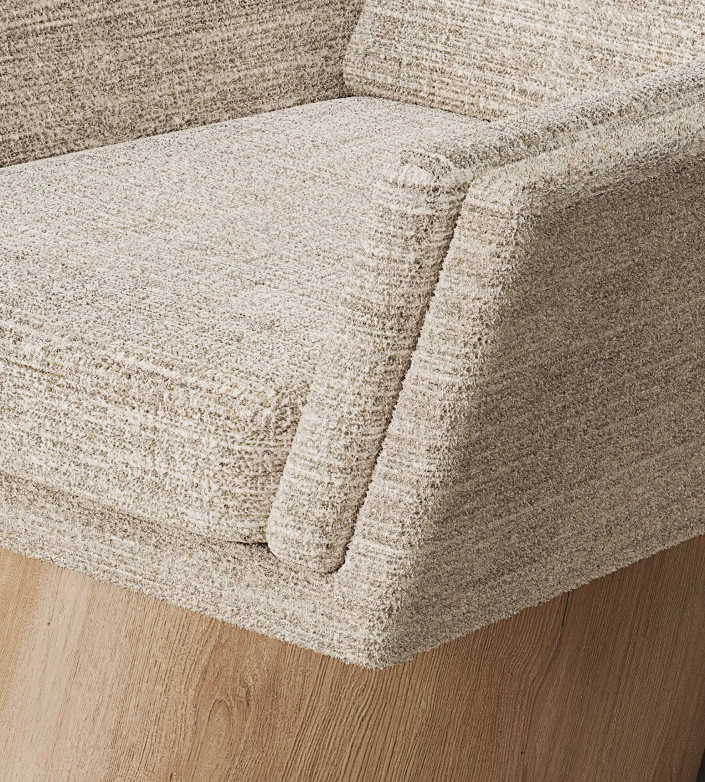 The oak base OF EACH WORK, with clean lines and precise angles, establishes a sturdy yet elegant canvas THAT ANCHORS each piece with a sense of grounded sophistication. In contrast to the solidity of oak, Alabastrino Travertine bearS witness to the passage of time with an ethereal beauty: As light dances across the veined textures of the travertine, the interplay between positive and negative space infuseS THE COLLECTION with a sense of timeless grace. Within this framework of angular geometries, the Paille Vuk fabric by Dedar SERVES as a tactile counterpoint OF softness and warmth. Its Luxurious texture create a dialogue with the structured formS, blurring the boundaries between solidity and fluidity, presence and absence