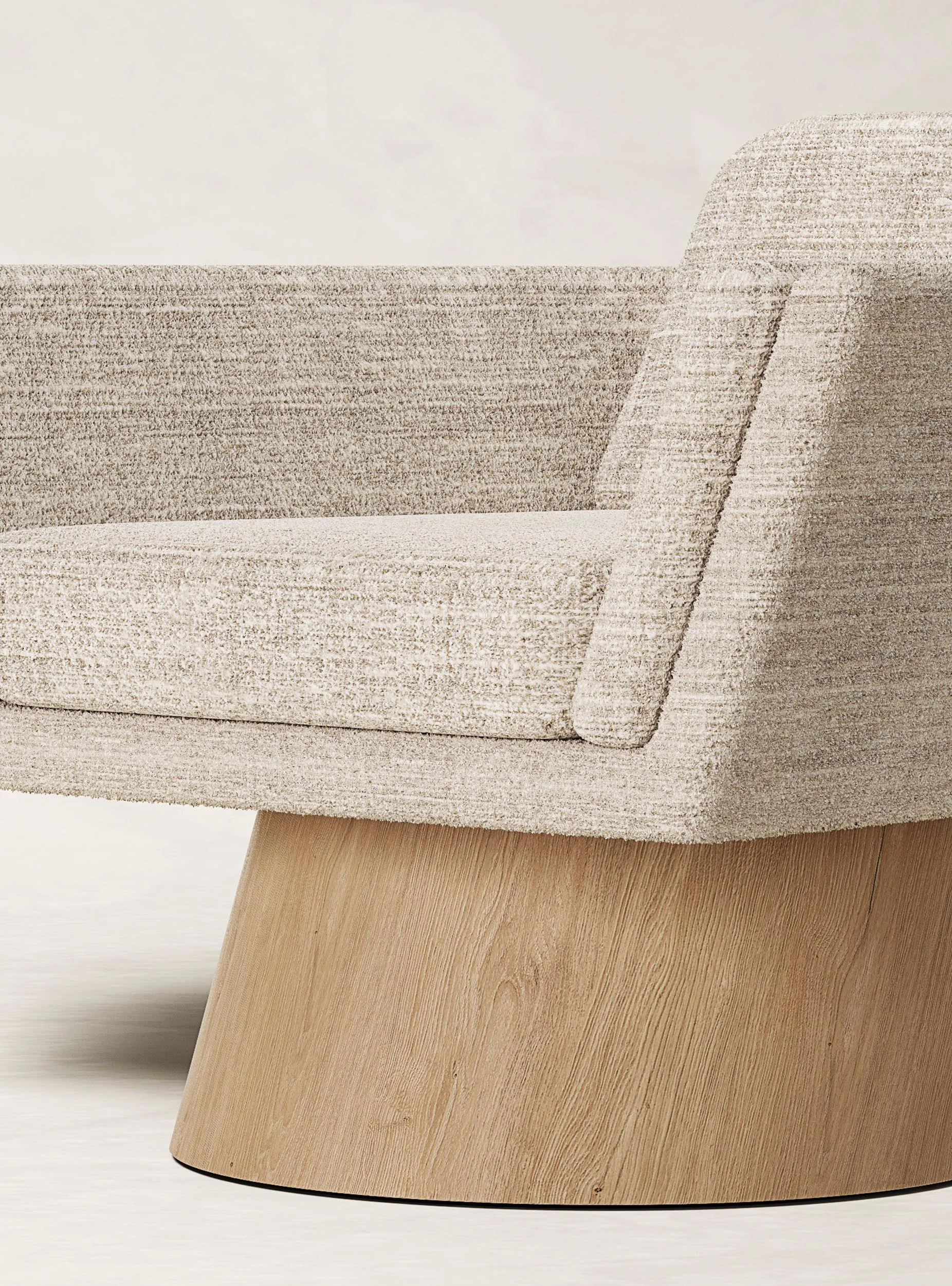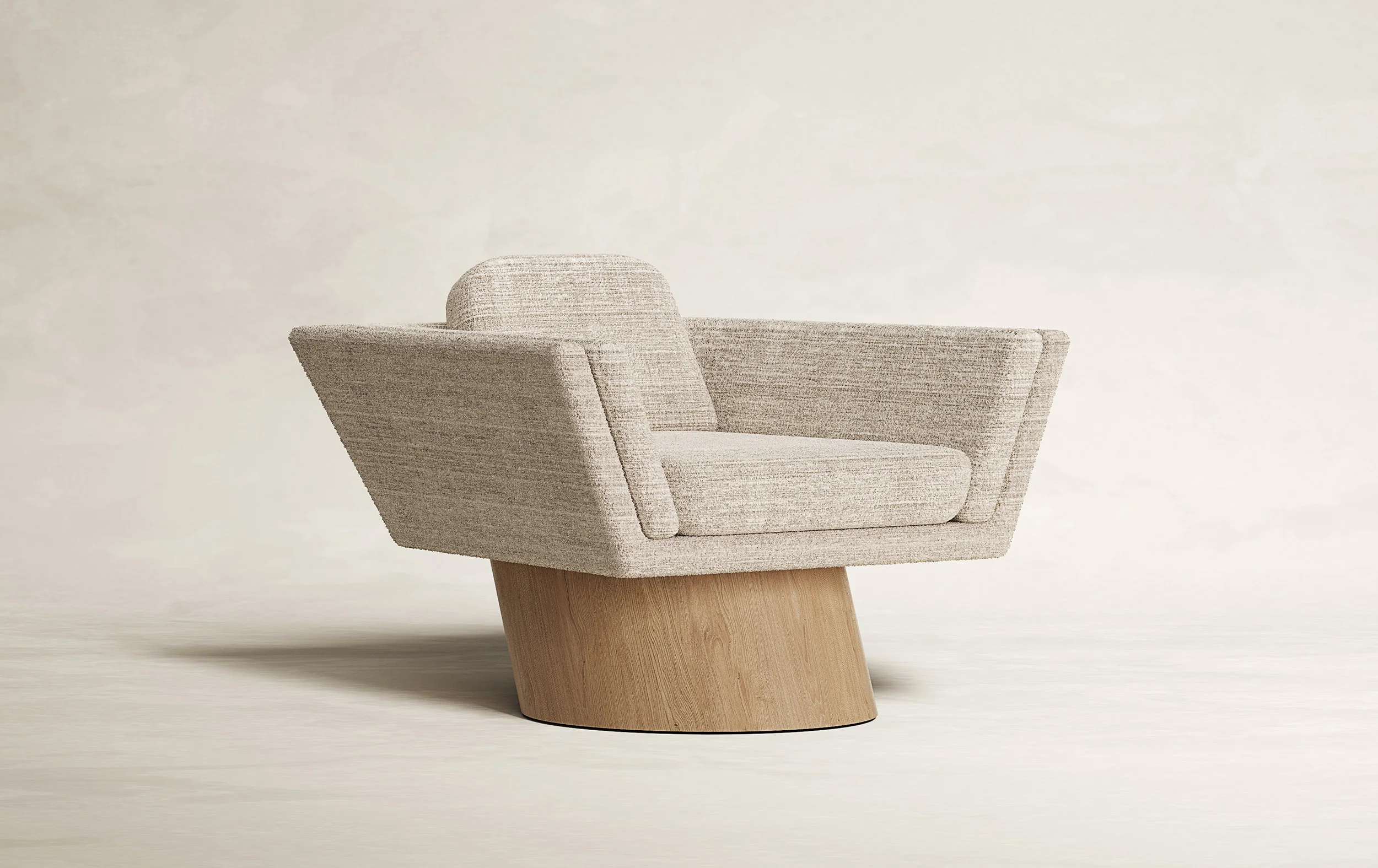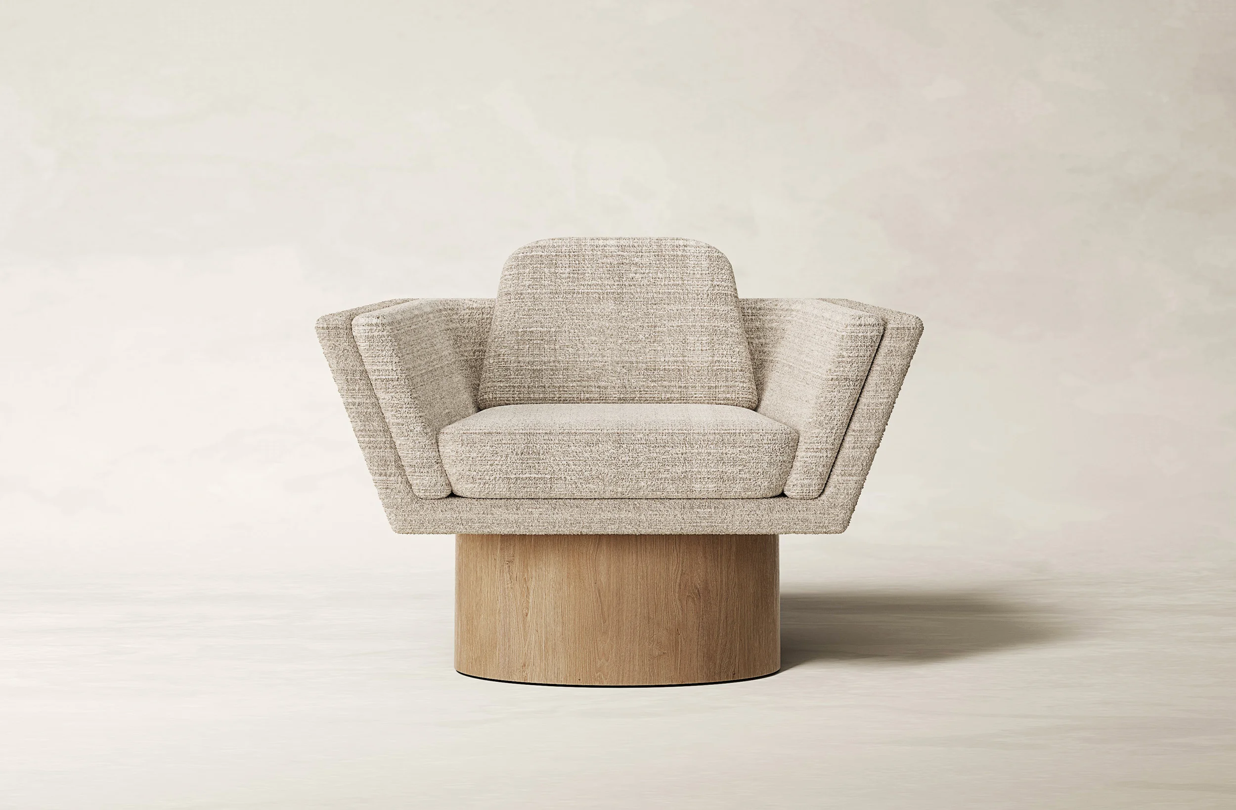 The oak base OF EACH WORK, with clean lines and precise angles, establishes a sturdy yet elegant canvas THAT ANCHORS each piece with a sense of grounded sophistication. In contrast to the solidity of oak, Alabastrino Travertine bearS witness to the passage of time with an ethereal beauty: As light dances across the veined textures of the travertine, the interplay between positive and negative space infuseS THE COLLECTION with a sense of timeless grace. Within this framework of angular geometries, the Paille Vuk fabric by Dedar SERVES as a tactile counterpoint OF softness and warmth. Its Luxurious texture create a dialogue with the structured formS, blurring the boundaries between solidity and fluidity, presence and absence