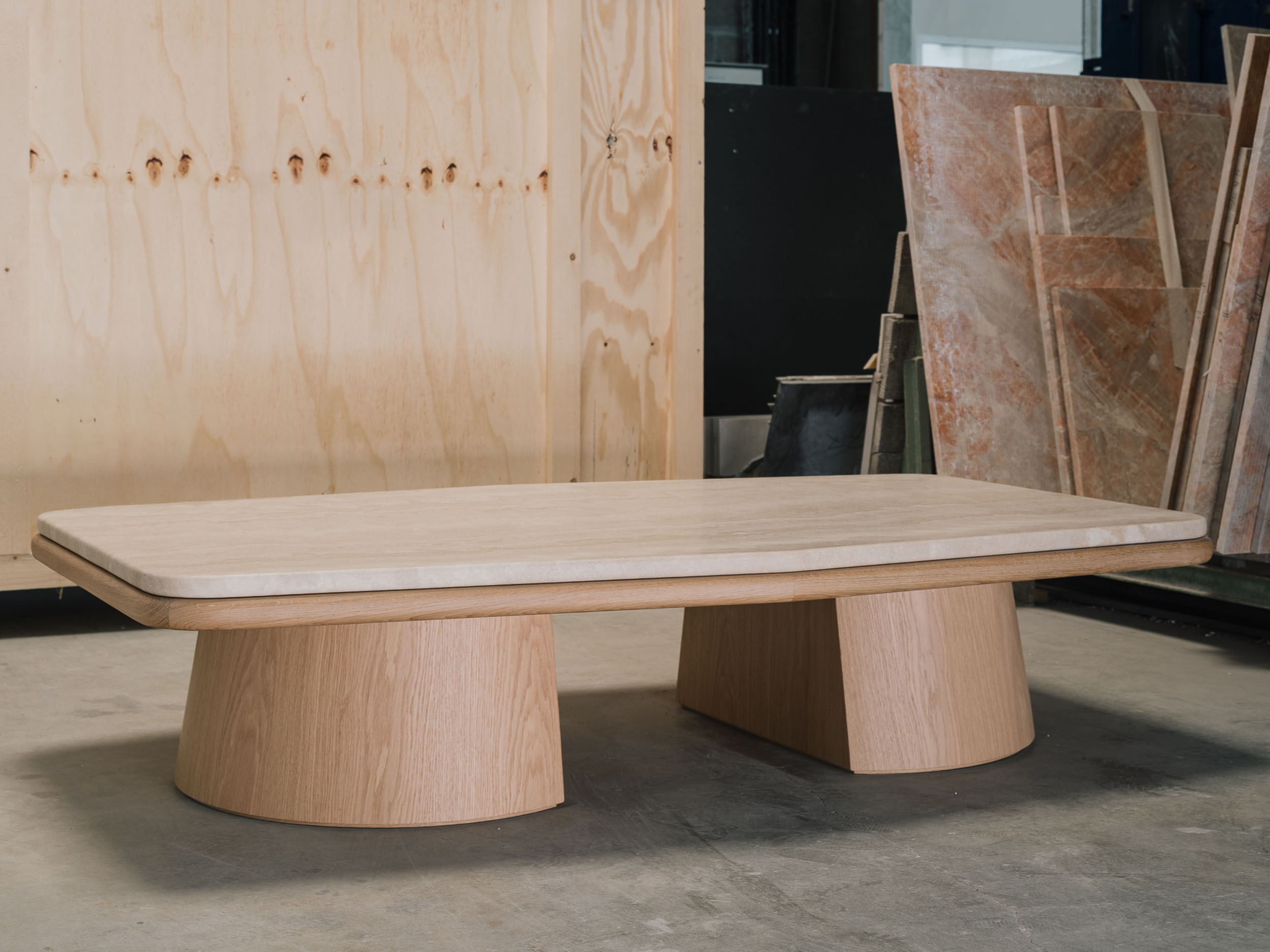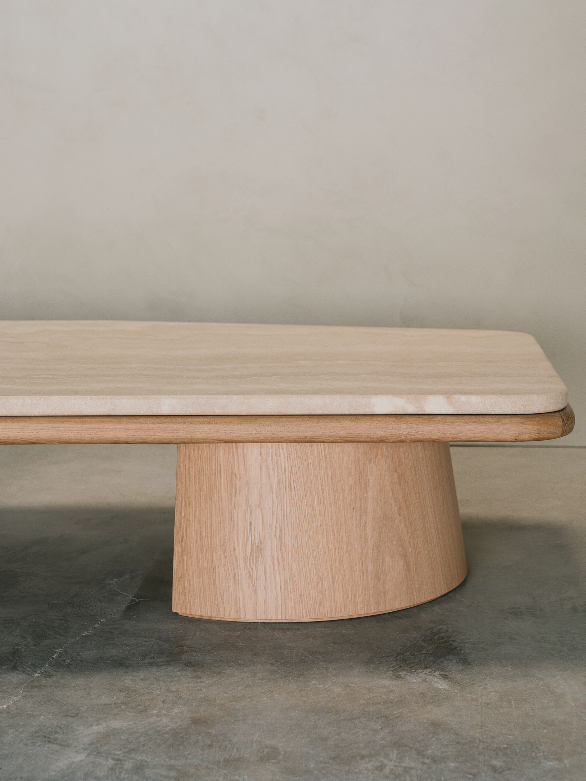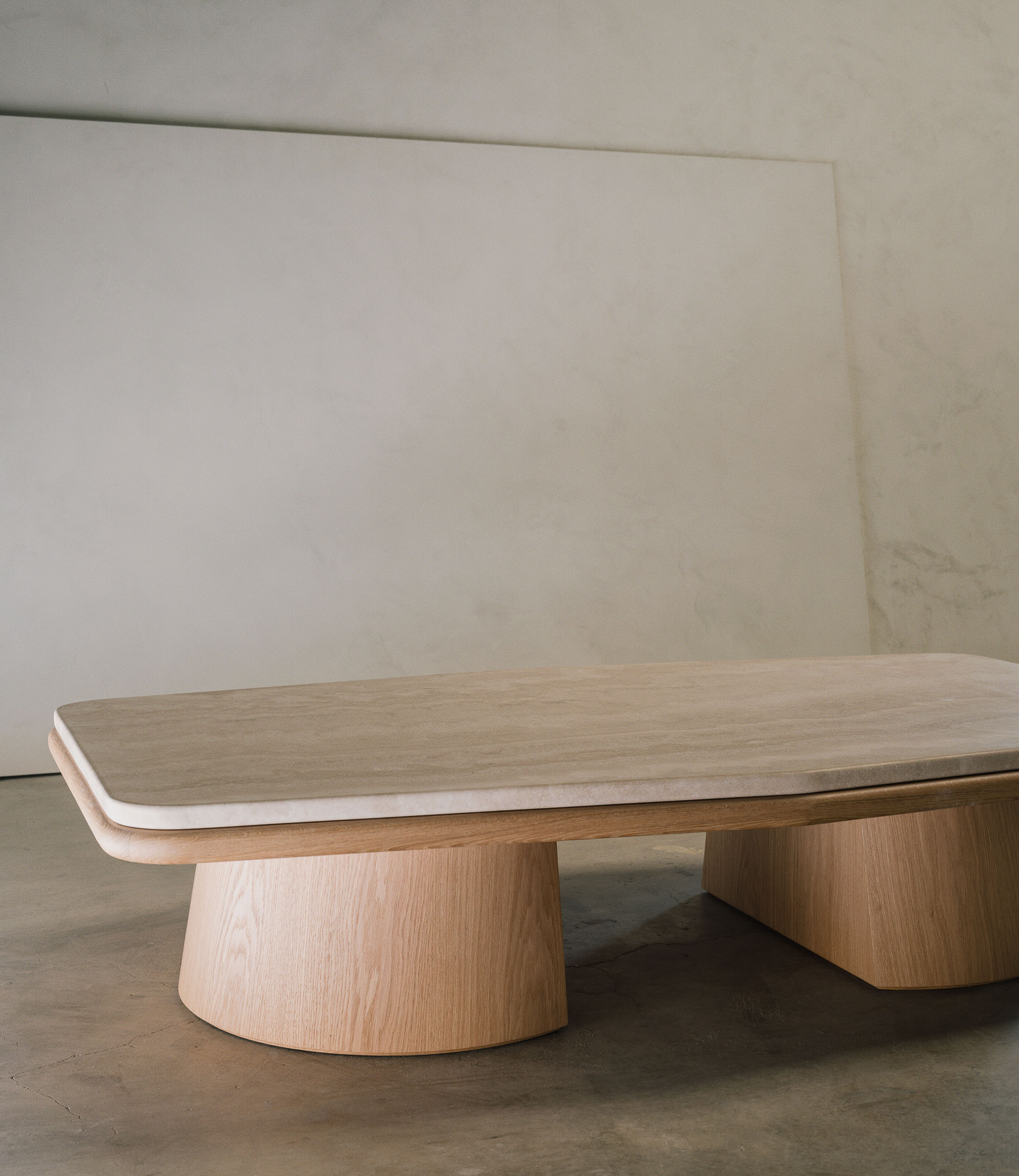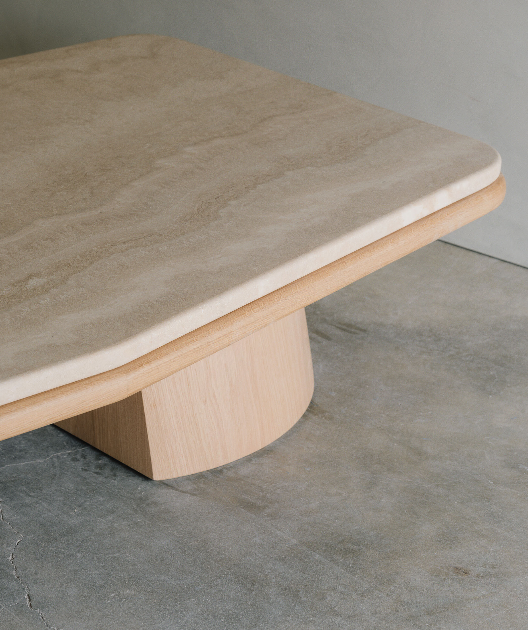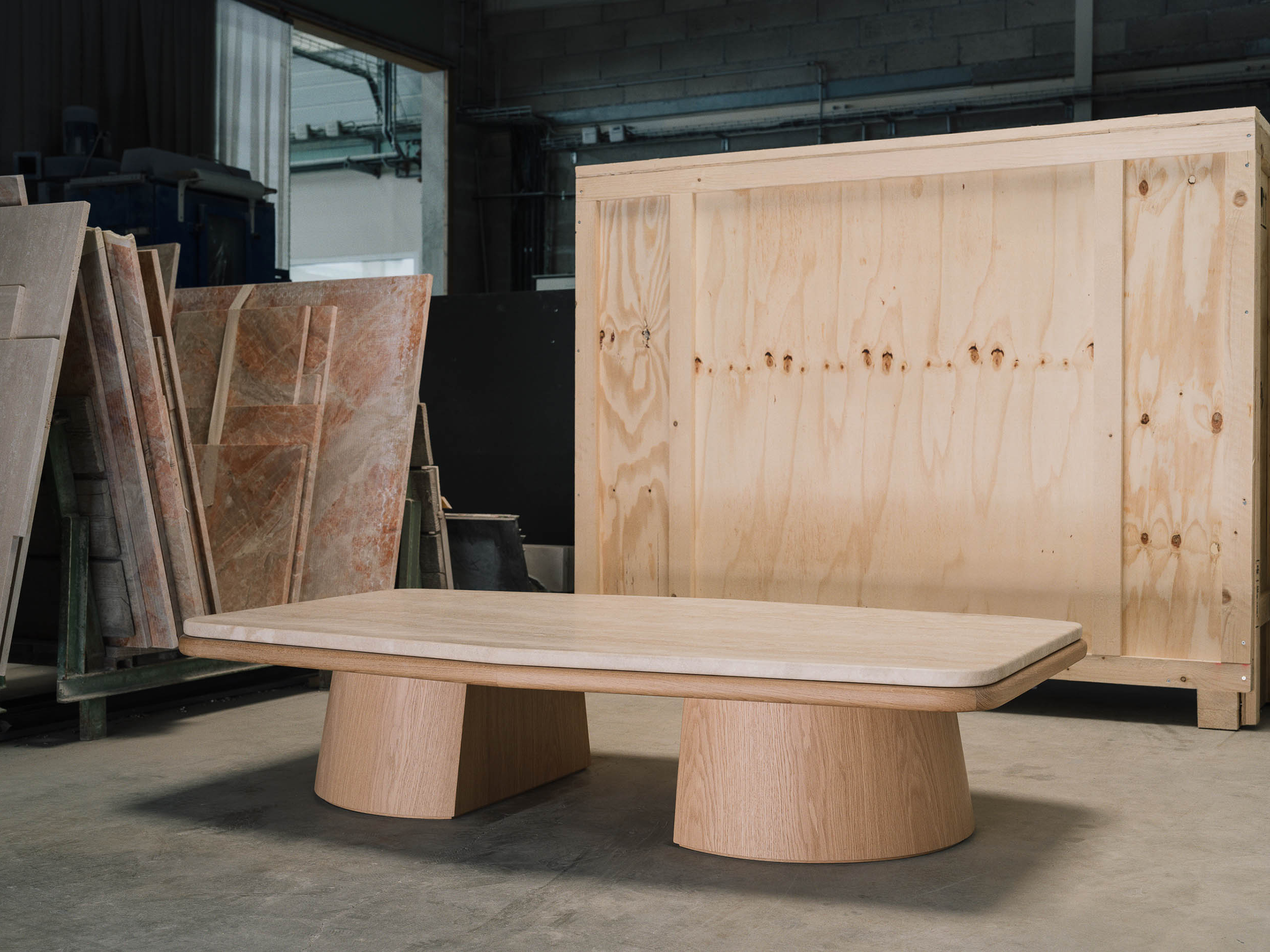 The oak base OF EACH WORK, with clean lines and precise angles, establishes a sturdy yet elegant canvas THAT ANCHORS each piece with a sense of grounded sophistication. In contrast to the solidity of oak, Alabastrino Travertine bearS witness to the passage of time with an ethereal beauty: As light dances across the veined textures of the travertine, the interplay between positive and negative space infuseS THE COLLECTION with a sense of timeless grace. Within this framework of angular geometries, the Paille Vuk fabric by Dedar SERVES as a tactile counterpoint OF softness and warmth. Its Luxurious texture create a dialogue with the structured formS, blurring the boundaries between solidity and fluidity, presence and absence