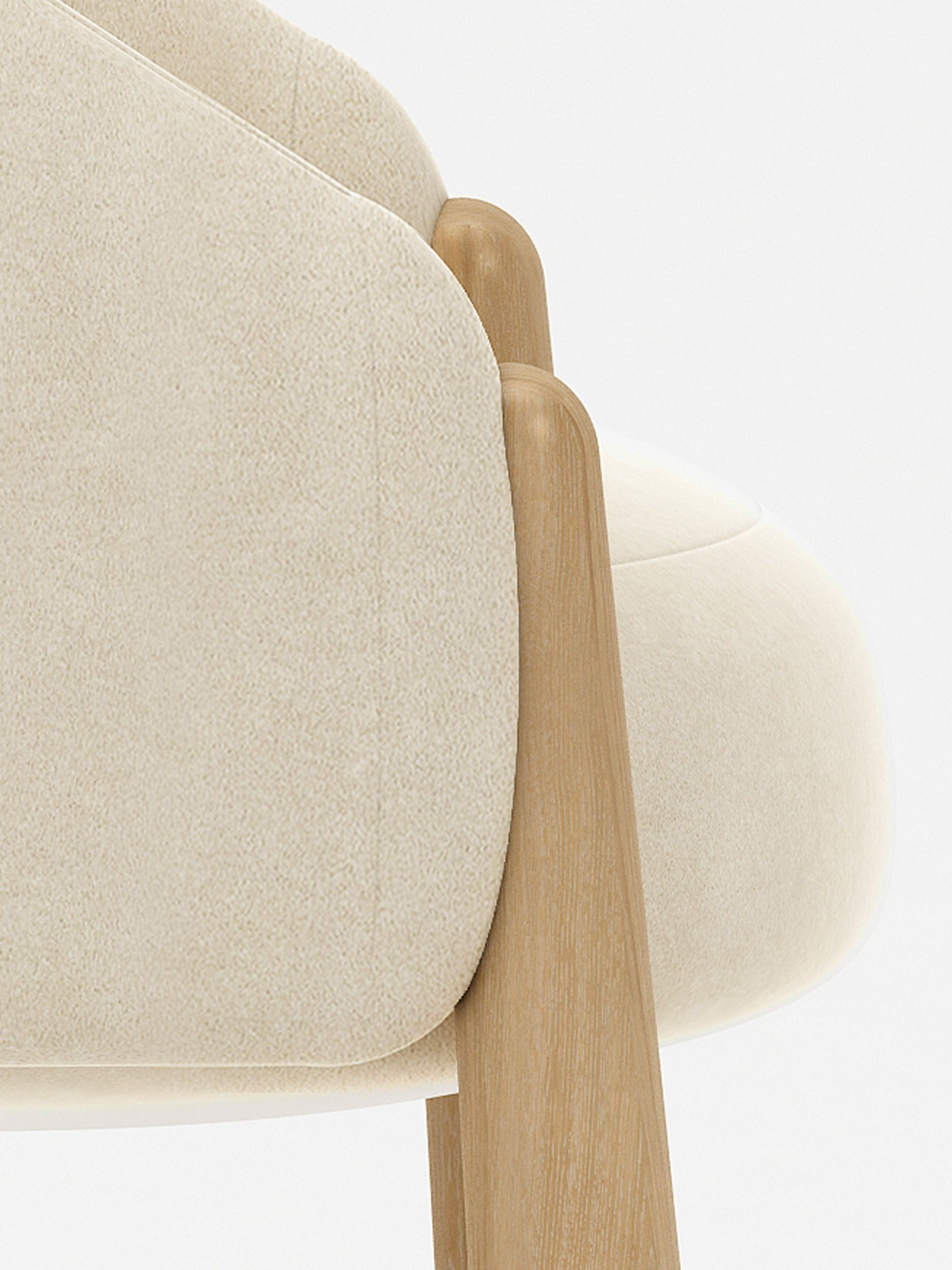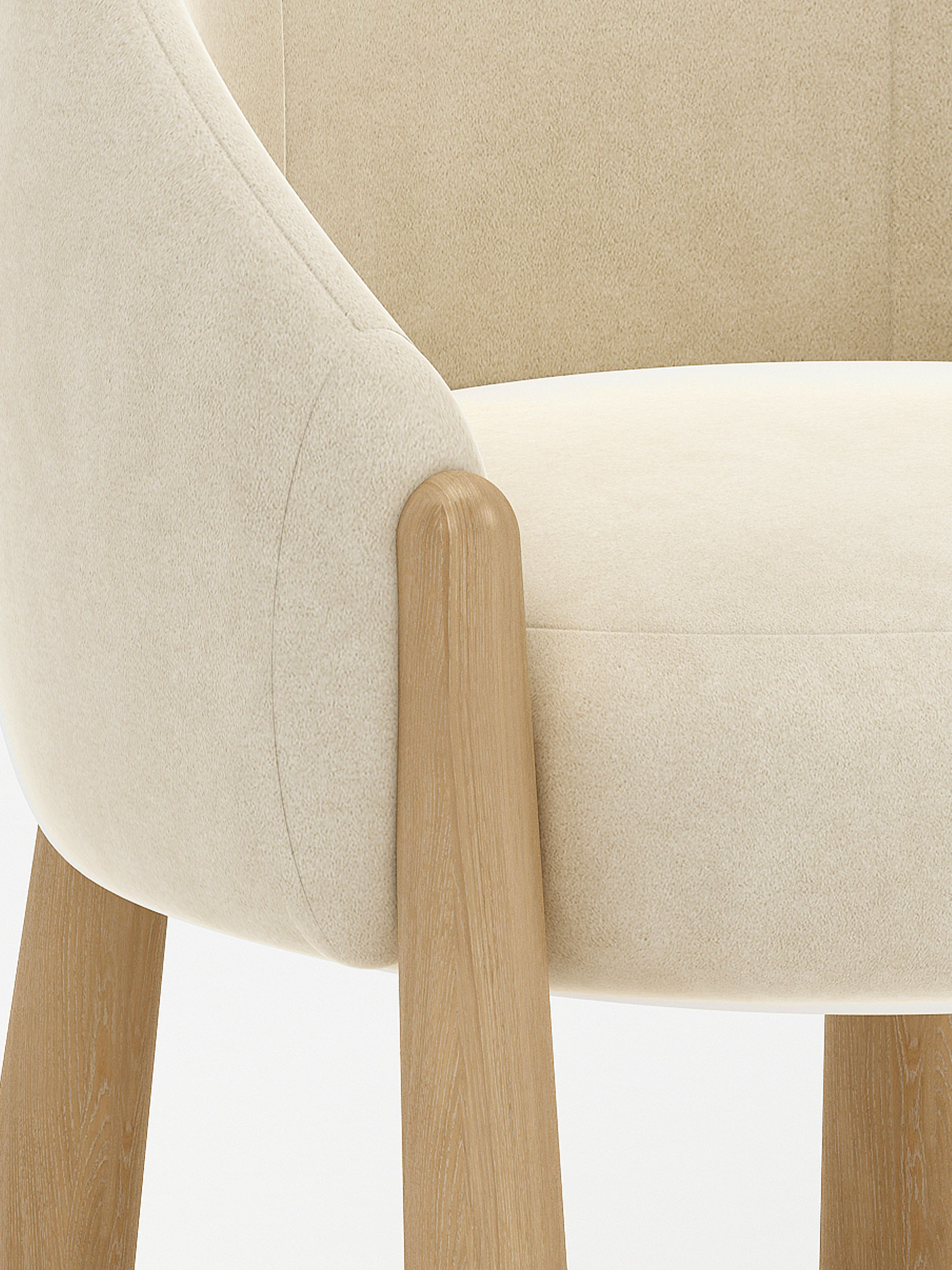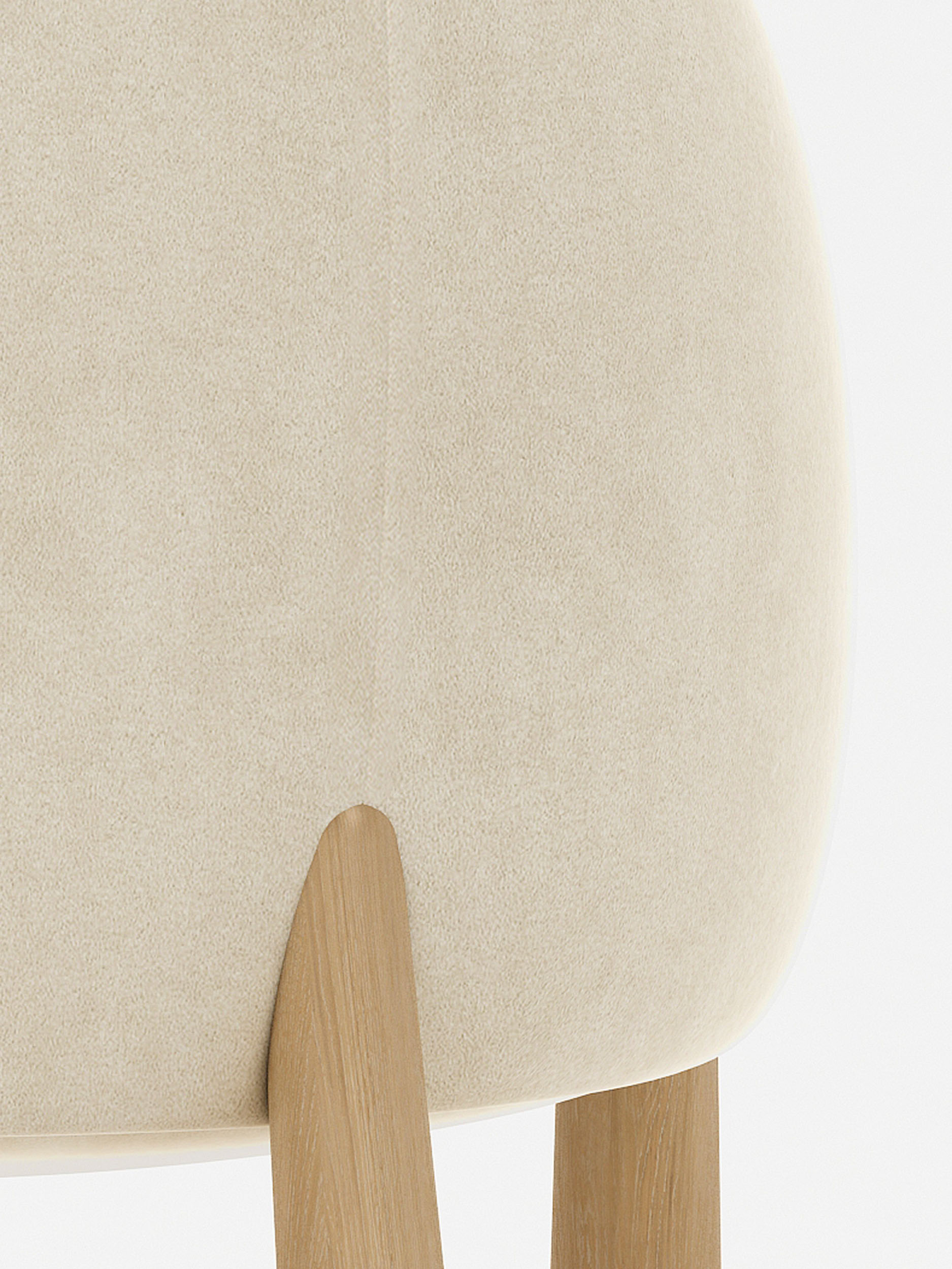 The slender cylindrical legs, carved from solid natural oak, evoke the fine yet resilient limbs of long-legged waterbirds. Their upper joints resolve in hemispherical forms that press seamlessly into the upholstered body, eliminating superfluous transitions. This precise junction underscores the duality at the heart of the collection: structure and softness, mass and lift, rigor and tactility