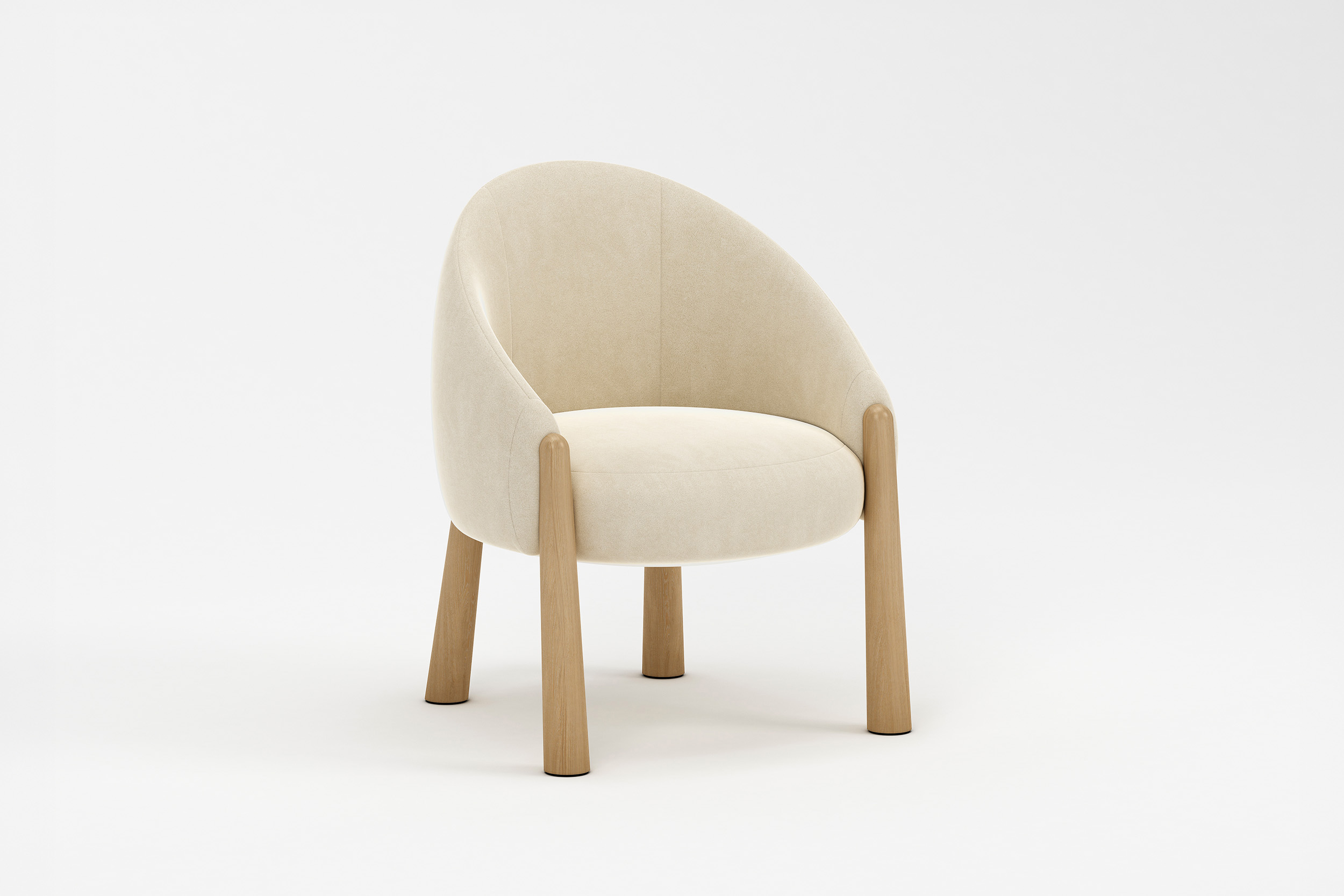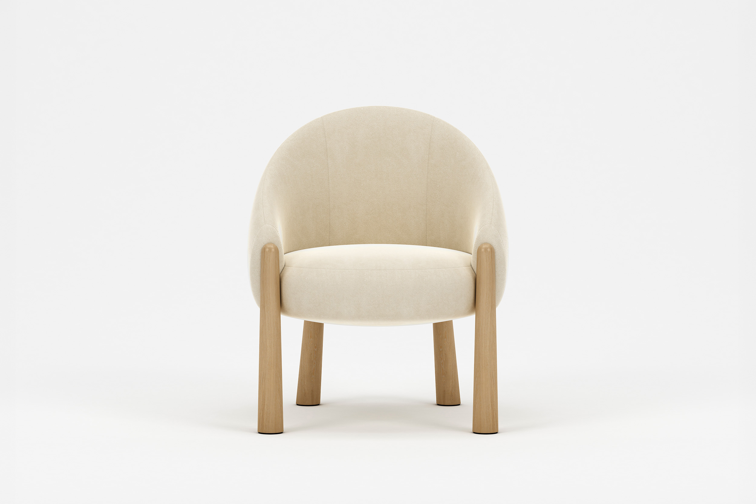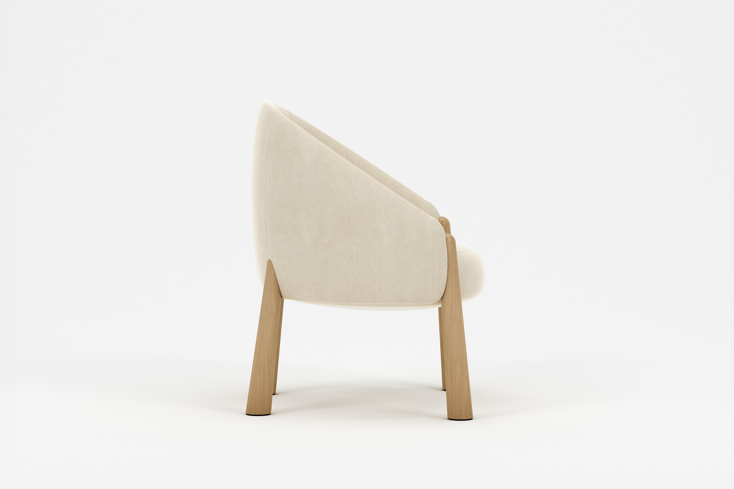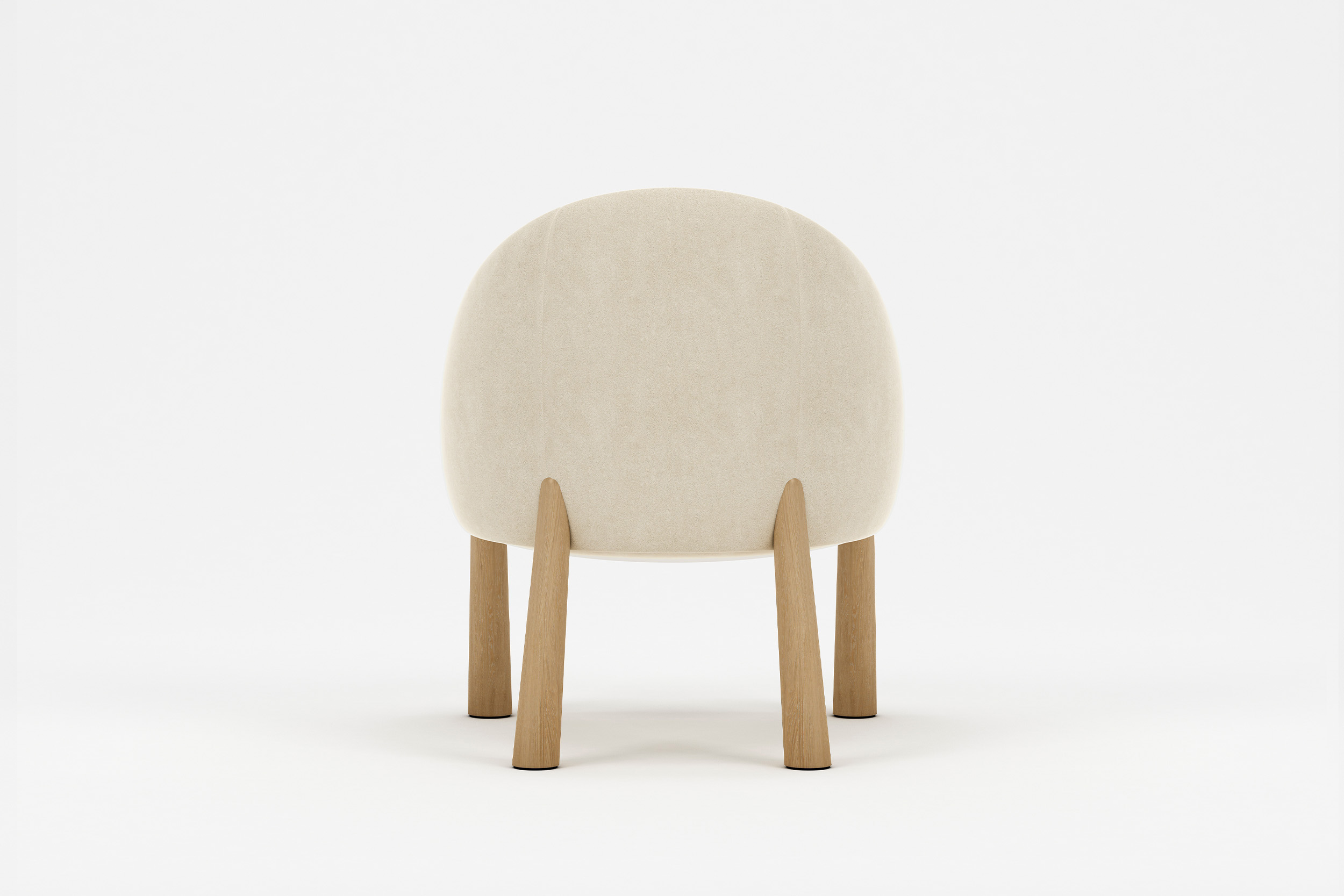 The slender cylindrical legs, carved from solid natural oak, evoke the fine yet resilient limbs of long-legged waterbirds. Their upper joints resolve in hemispherical forms that press seamlessly into the upholstered body, eliminating superfluous transitions. This precise junction underscores the duality at the heart of the collection: structure and softness, mass and lift, rigor and tactility