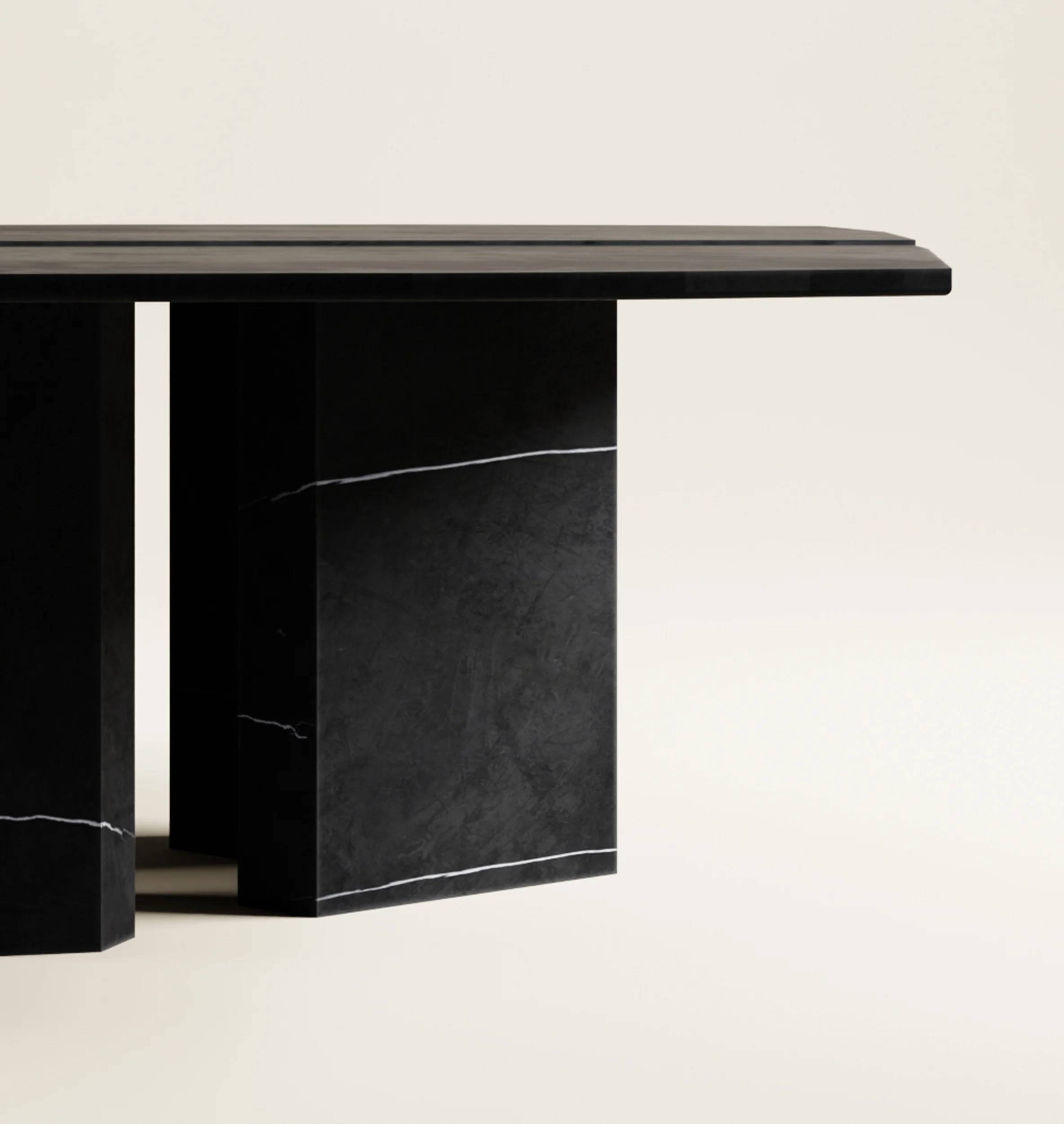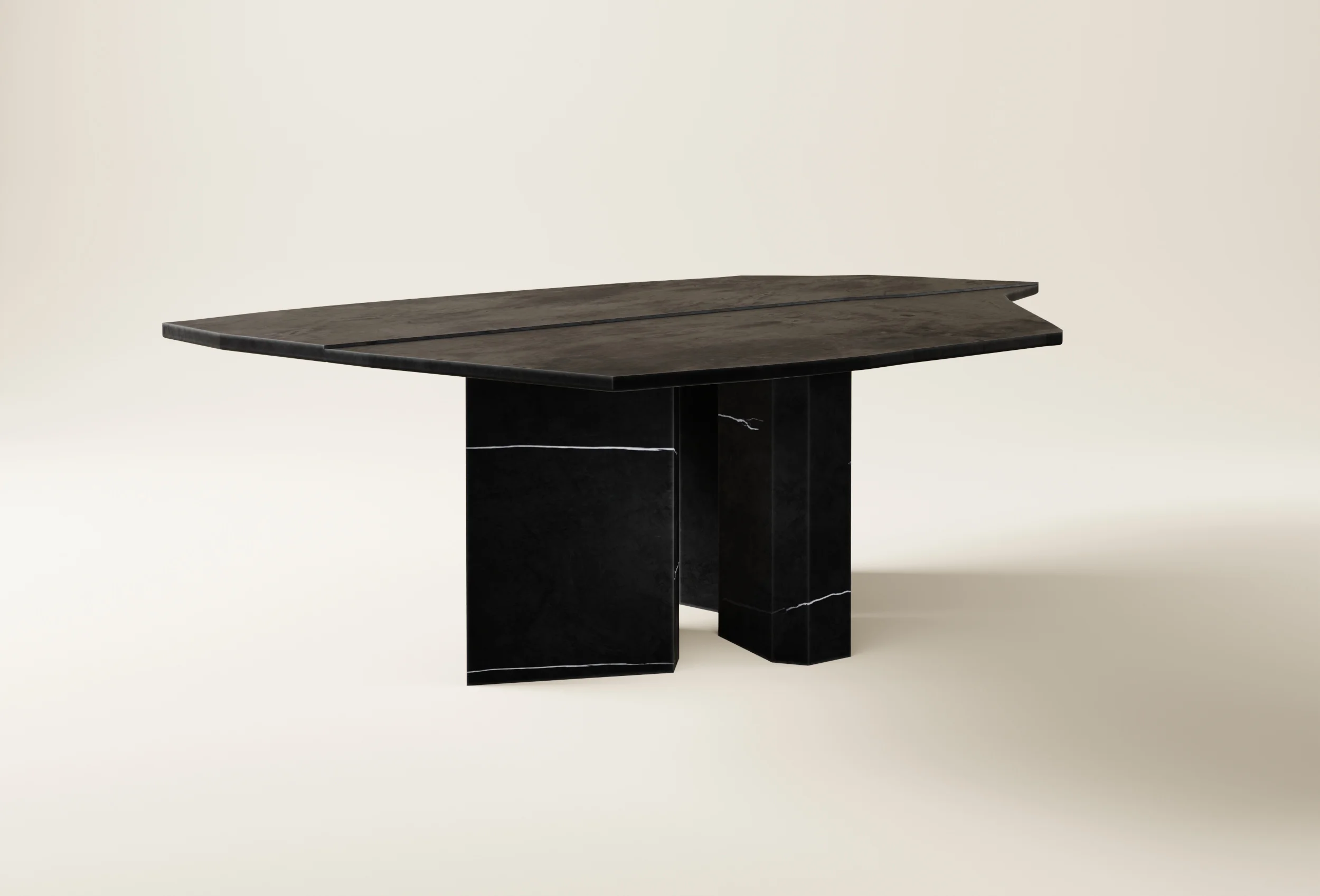The Flint table emerges from Pierre Bleue, a distinctive blue limestone quarried between Belgium and France. Its linear composition, marked by subtle variations in elevation and spacing, recalls the meeting of tectonic layers or the precise gap of a fault line. The restrained geometry underscores the innate texture and tone of the stone, balancing rigor with quiet imperfection