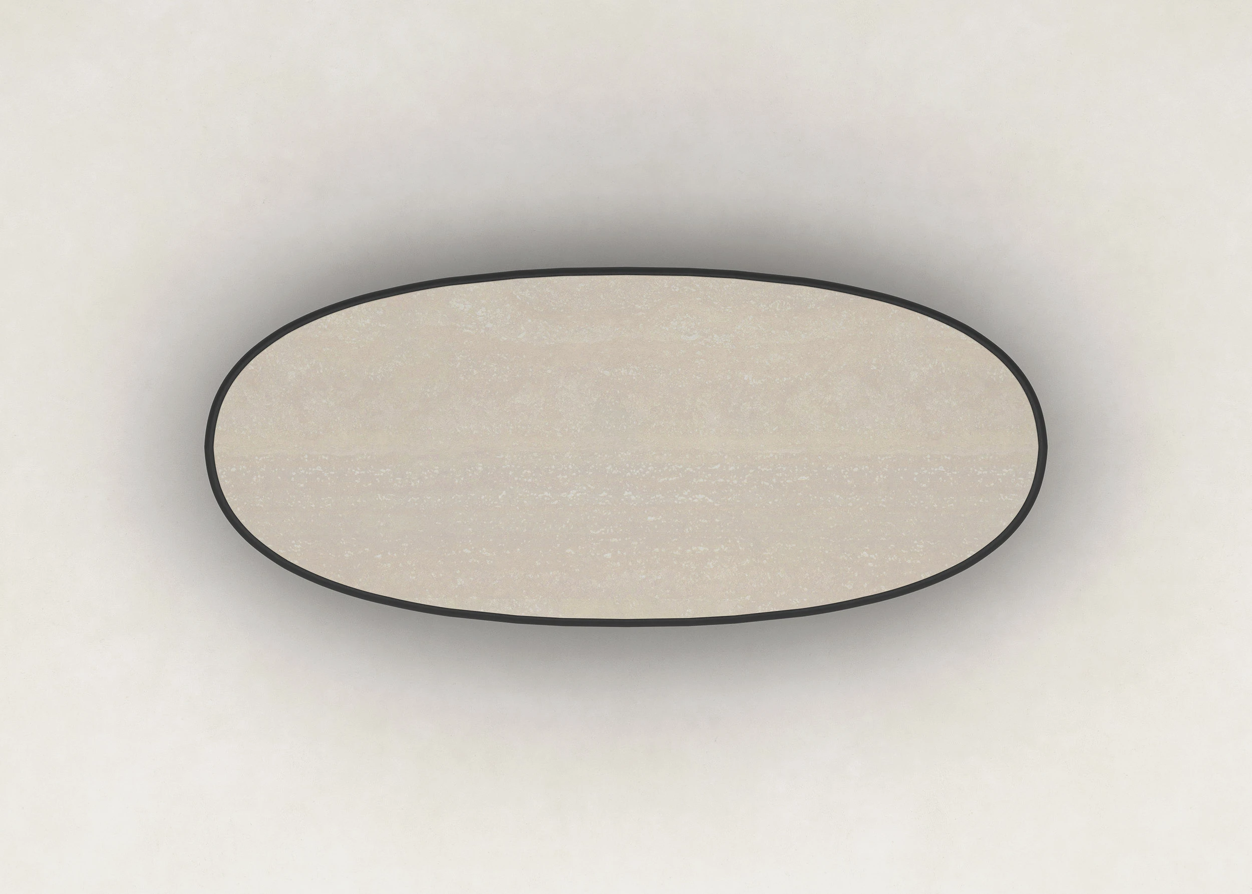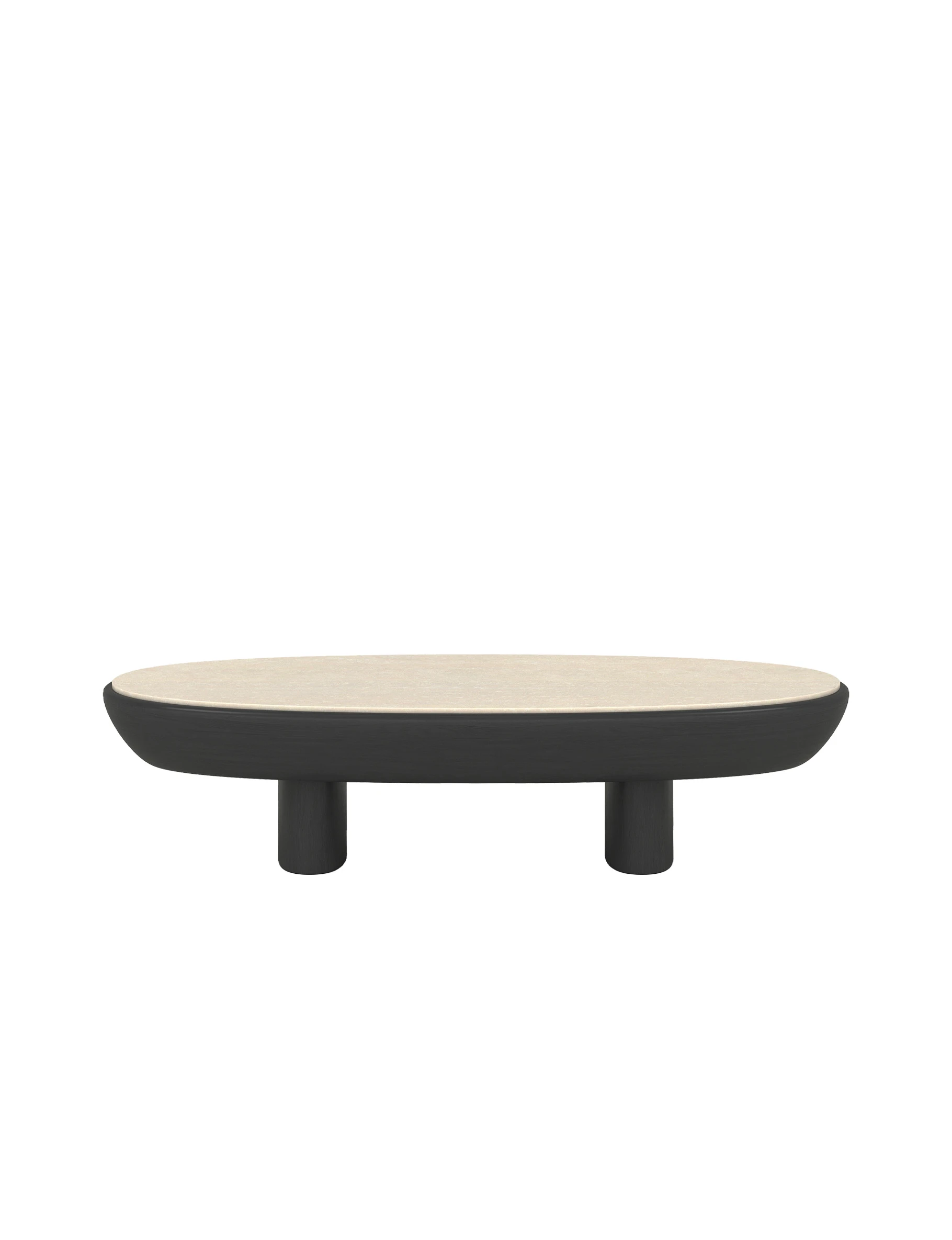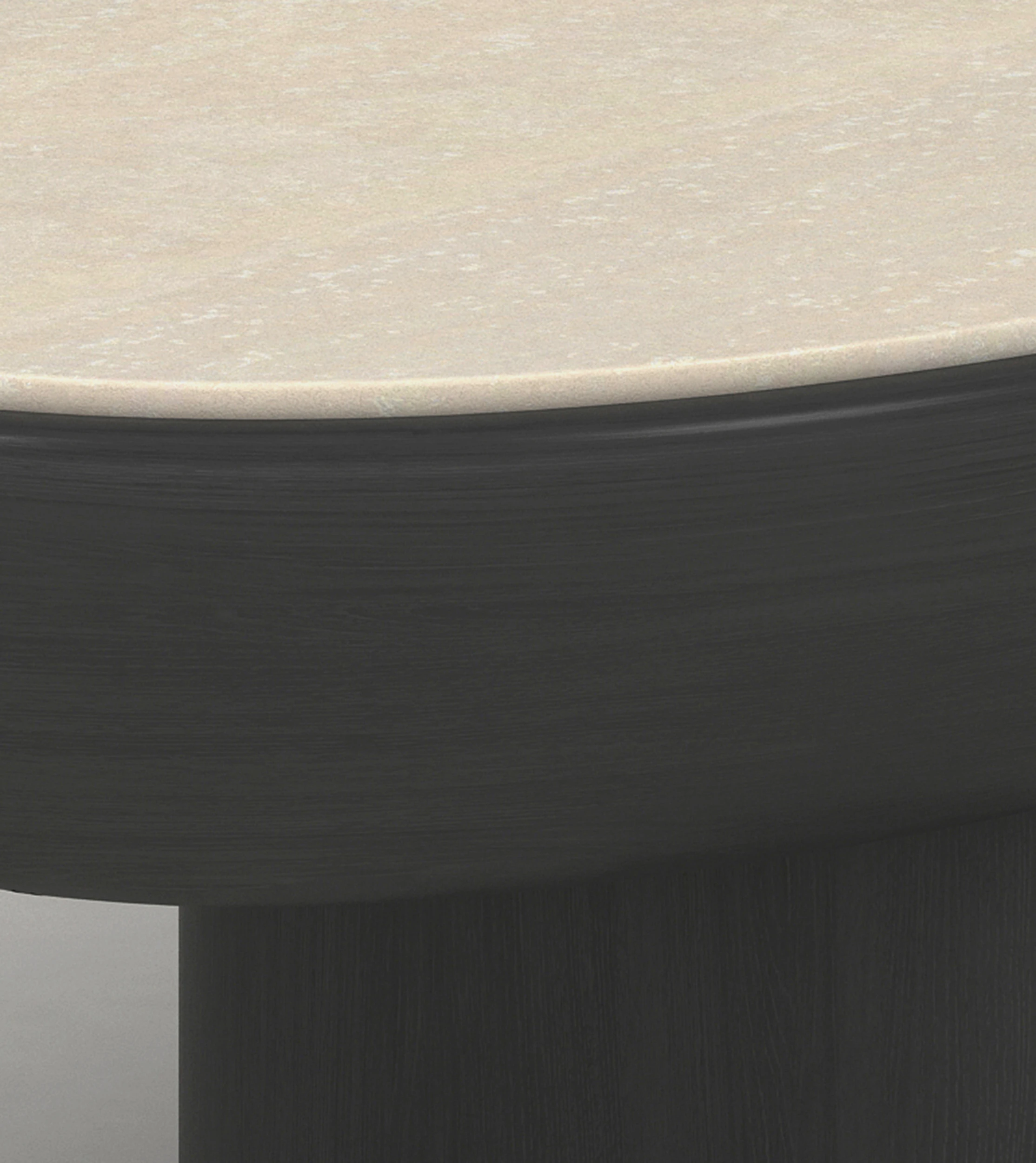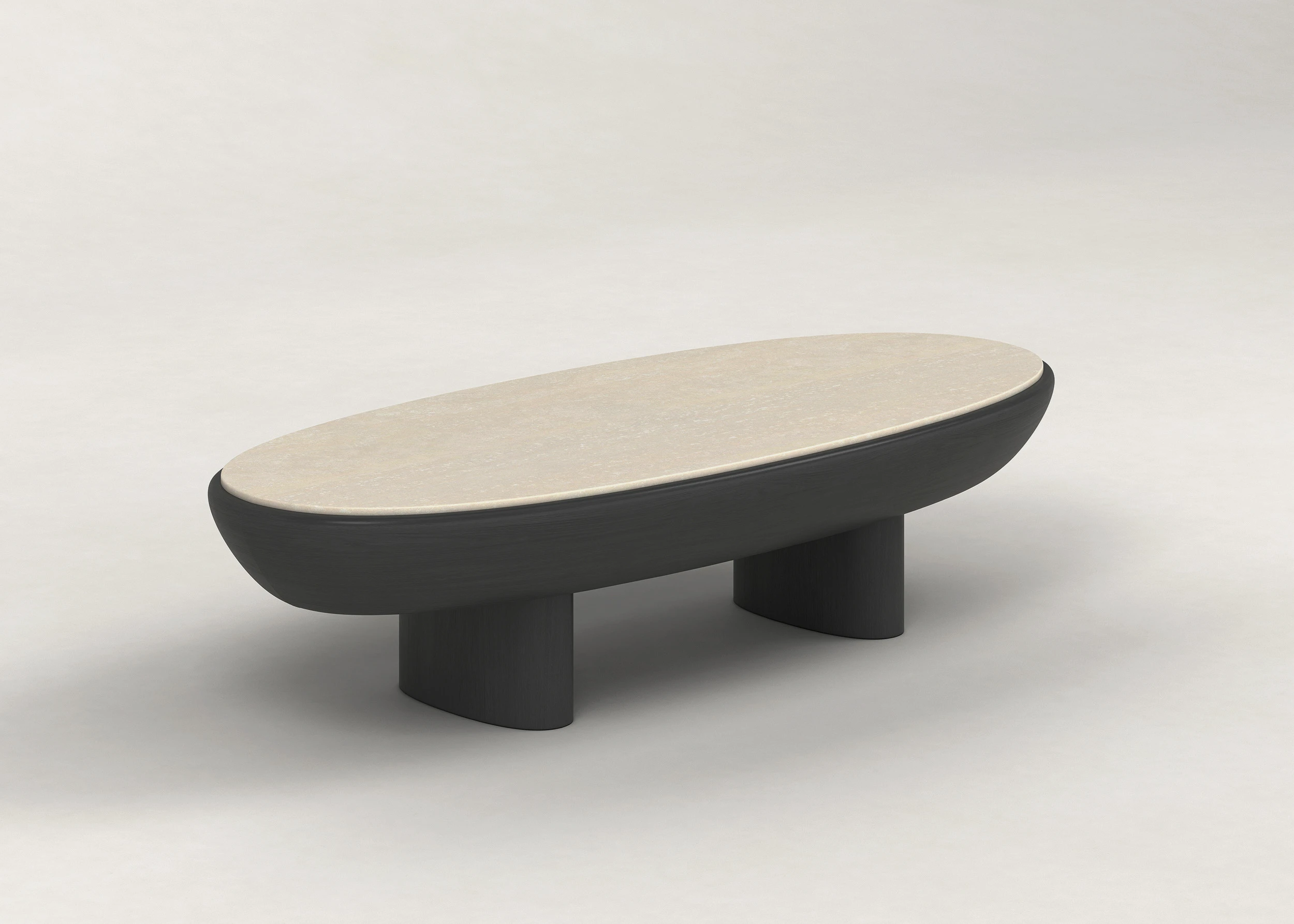 This sense of movement is grounded by a deliberate simplicity. The legs taper to their most essential expression, resting on elliptical or circular bases that echo the natural rhythm of the design. Above, a smooth stone top introduces a contrasting stillness, its pale surface reflecting light like the surface of a calm river. In the juxtaposition between the organic warmth of wood and the mineral rigor of stone, the entire work is unified. As a boat becomes itself when placed in water, the components achieve meaning only in conversation with each other