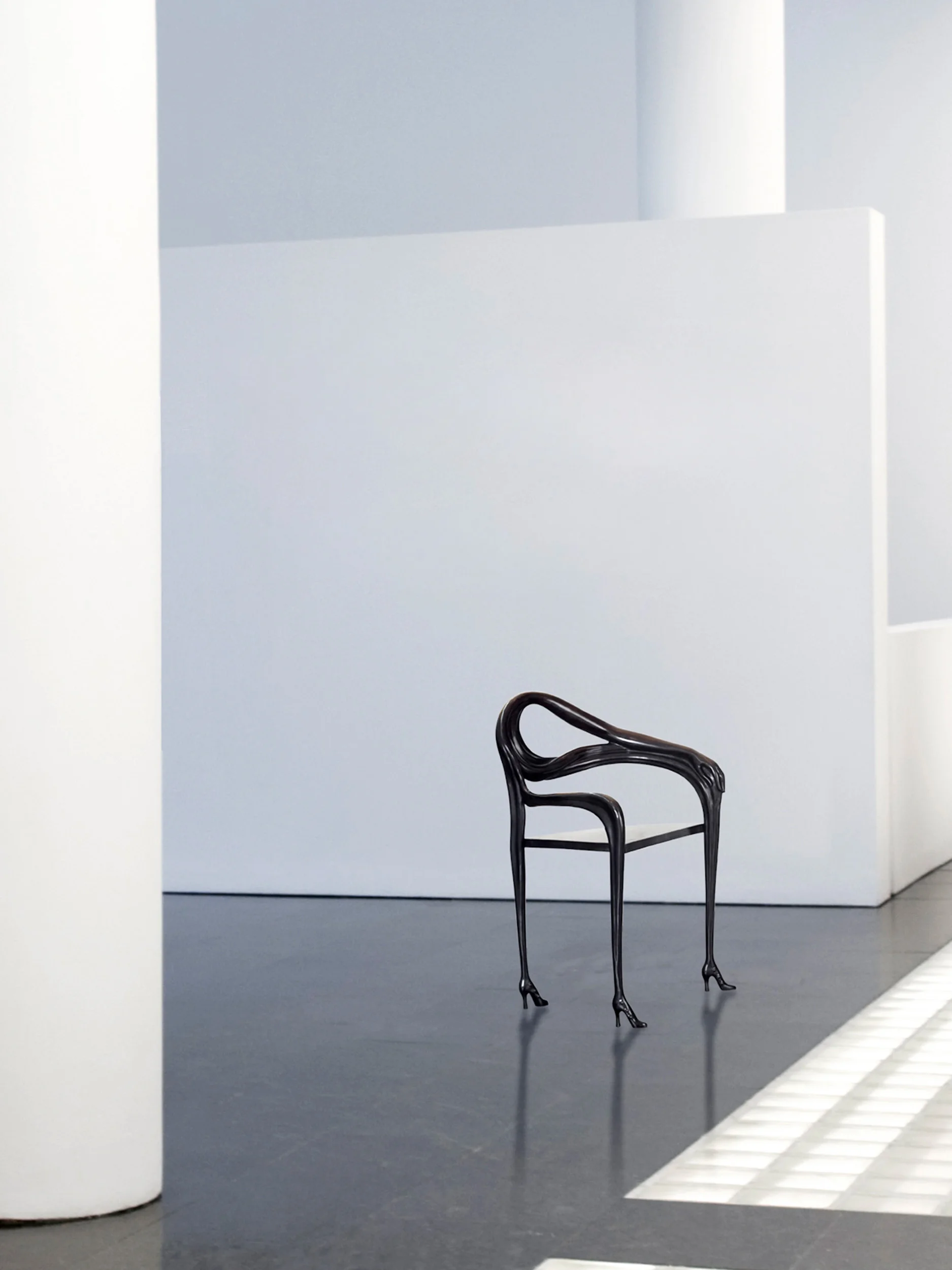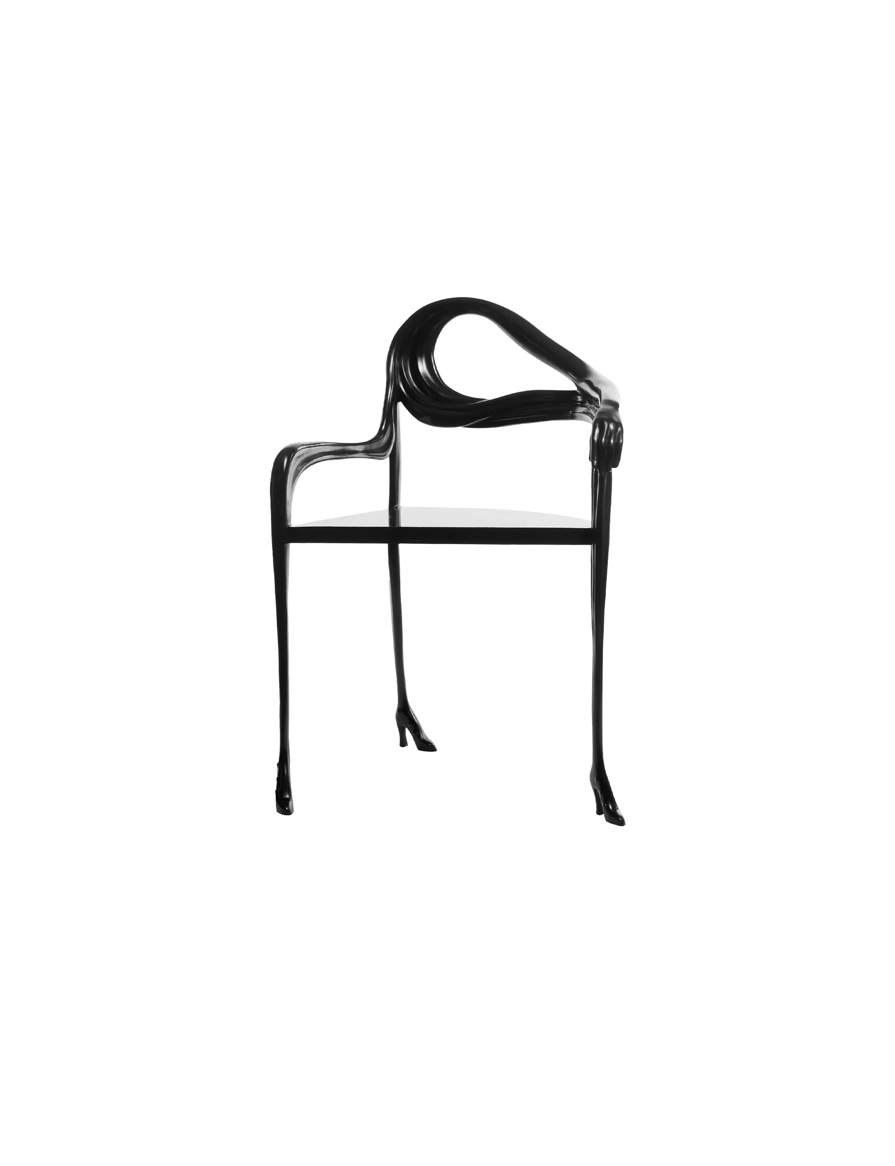 The design is directly inspired by Dalí’s painting Woman with a Head of Roses (1935), in which the female figure becomes a site of metamorphosis and symbolic tension. In LEDA, this imagery is brought into the three-dimensional world: a brass body shapes the seat, while an elongated arm curves around to form the backrest, terminating in a sculpted hand that clasps the armrest. The figure rests on three slender legs that taper downward into gleaming high heels, reinforcing the anthropomorphic presence of the piece
