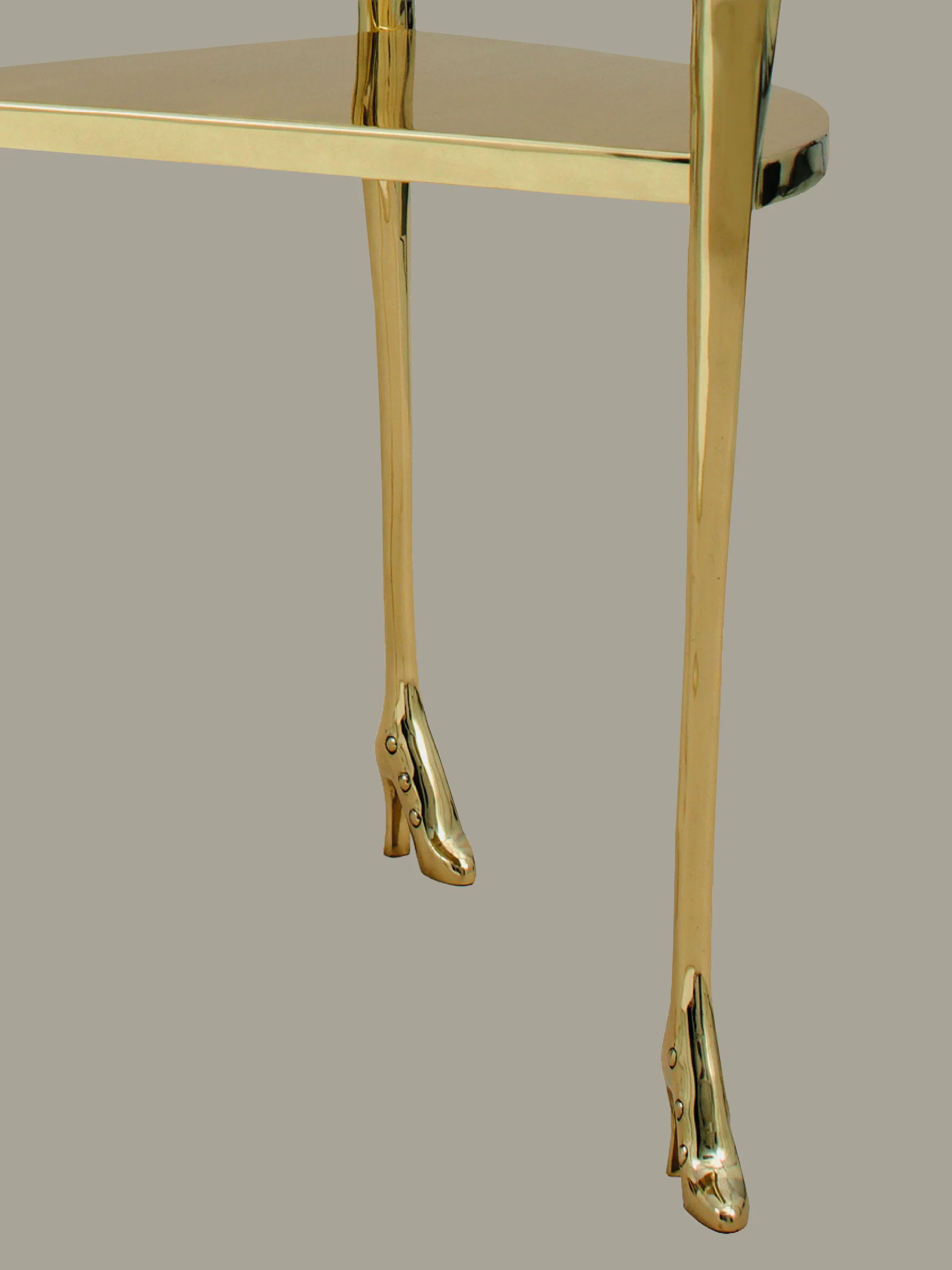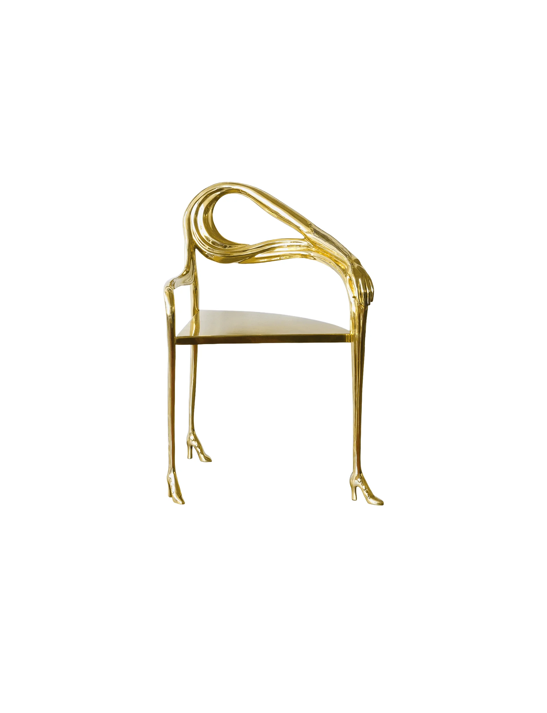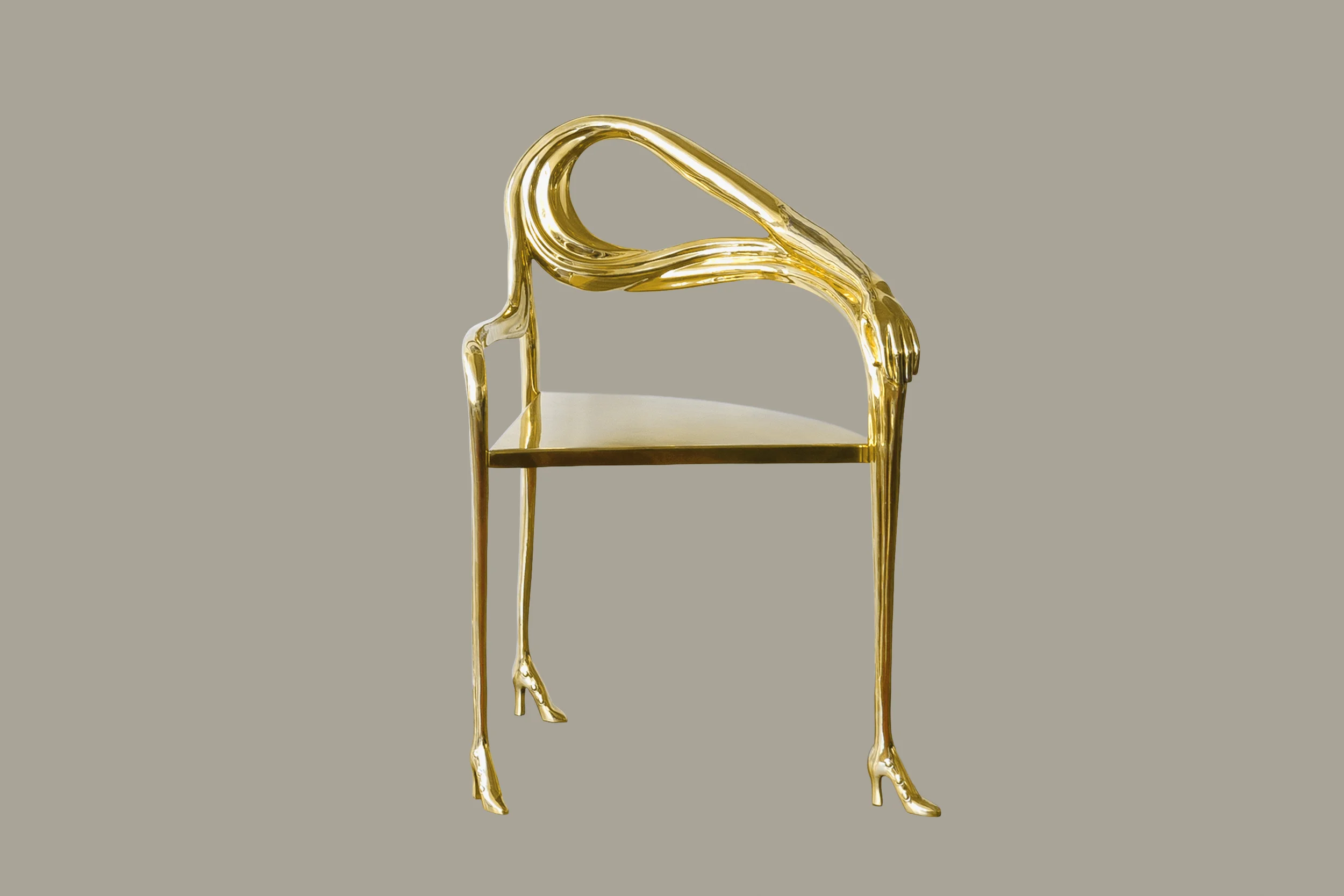 The design is directly inspired by Dalí’s painting Woman with a Head of Roses (1935), in which the female figure becomes a site of metamorphosis and symbolic tension. In LEDA, this imagery is brought into the three-dimensional world: a brass body shapes the seat, while an elongated arm curves around to form the backrest, terminating in a sculpted hand that clasps the armrest. The figure rests on three slender legs that taper downward into gleaming high heels, reinforcing the anthropomorphic presence of the piece