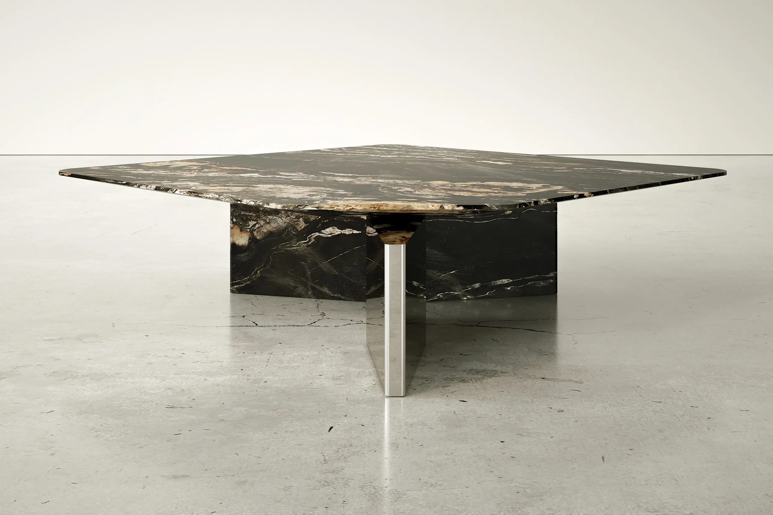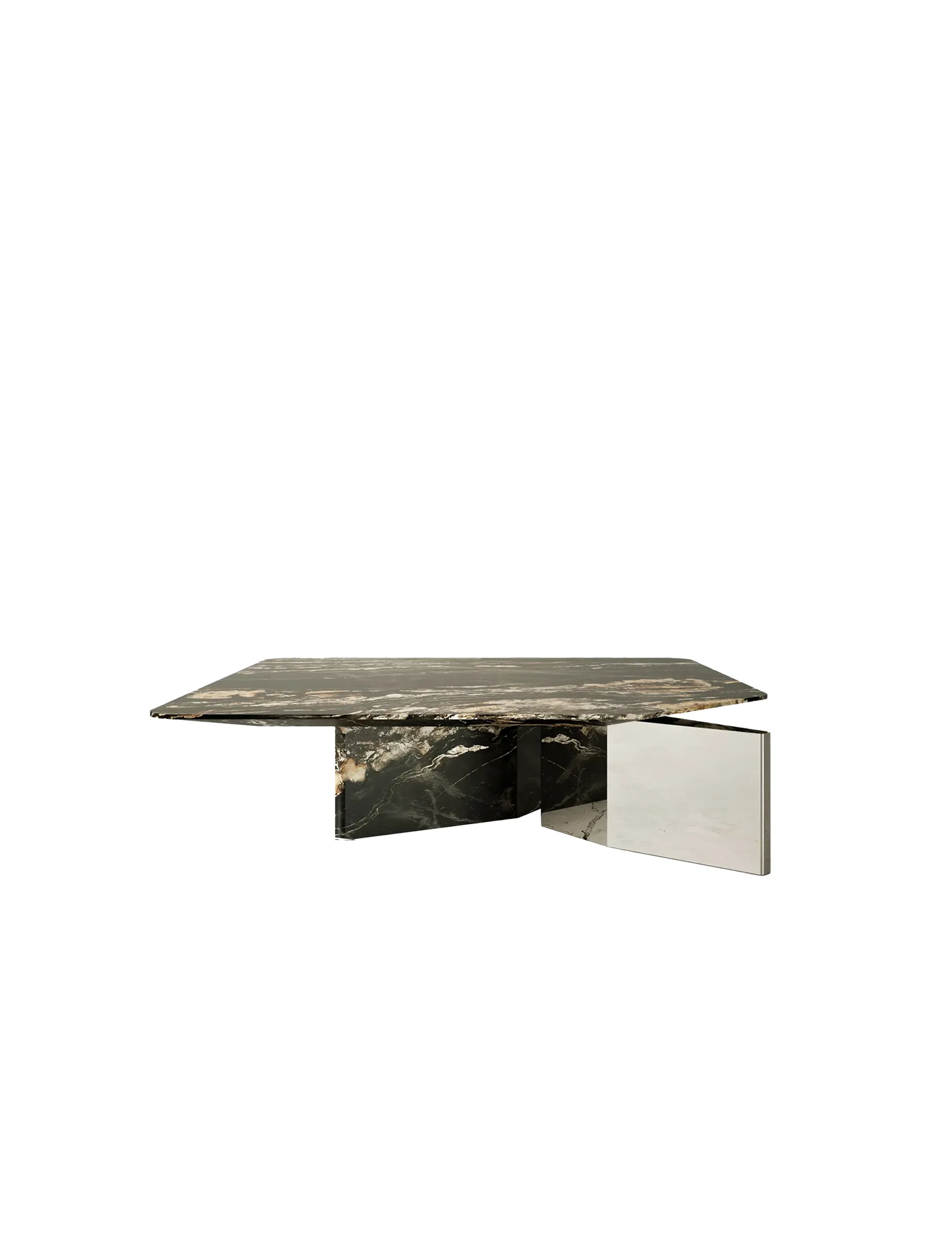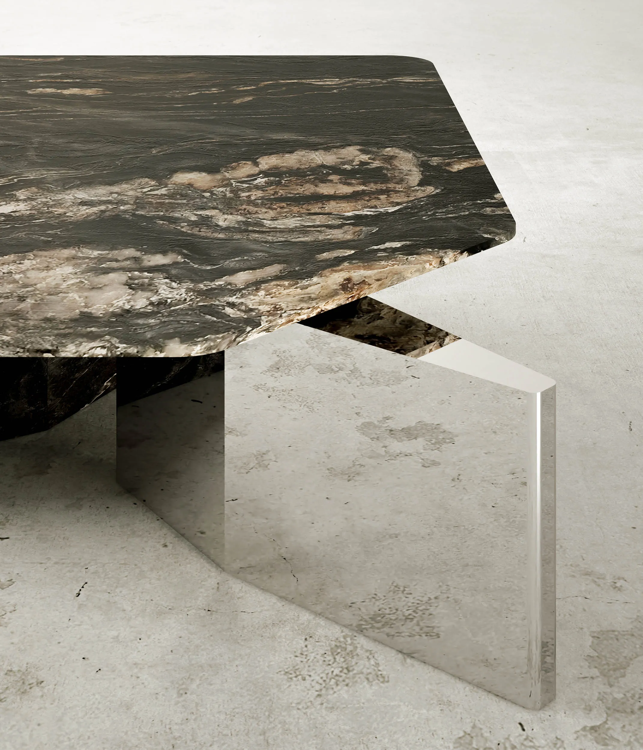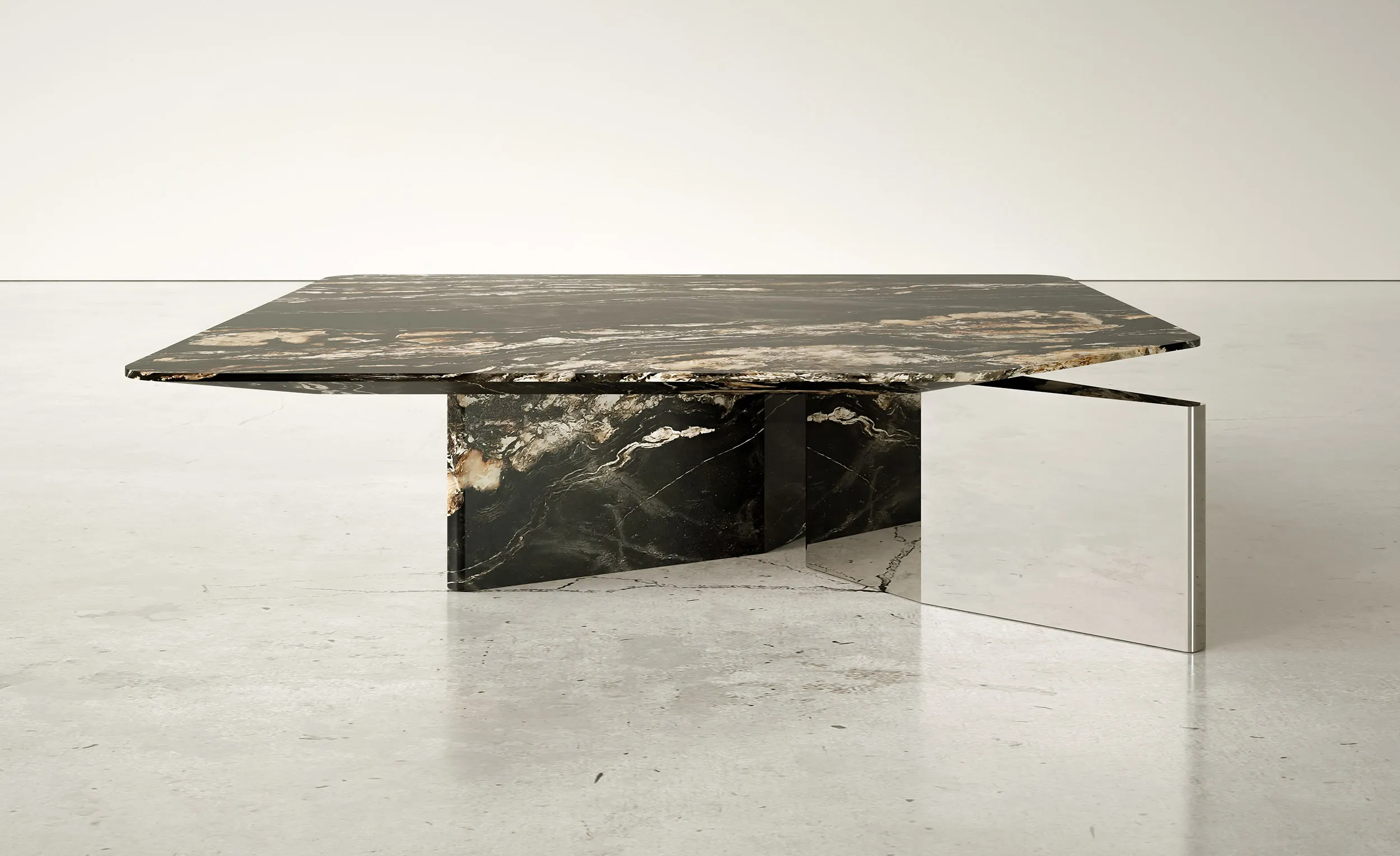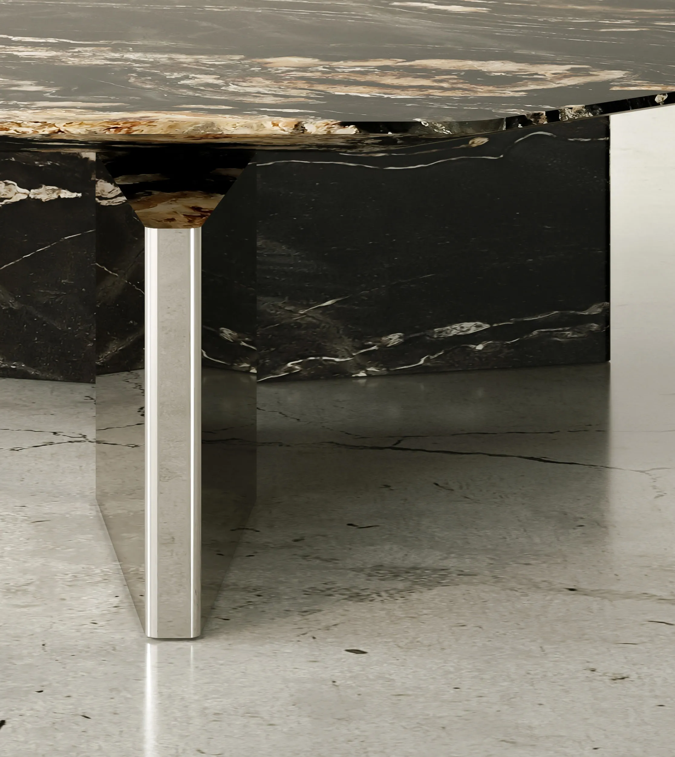 The marble tops possess a commanding physicality, echoing the mass and permanence of mountain plateaus. In contrast, mirror-polished steel elements introduce a sensation of altitude and air. Their reflective surfaces dissolve into the surrounding environment, capturing fragments of architecture, sky, and movement, and visually lifting the stone above the ground plane. The effect is one of suspension: vast weight rendered unexpectedly buoyant, like a peak emerging through cloud