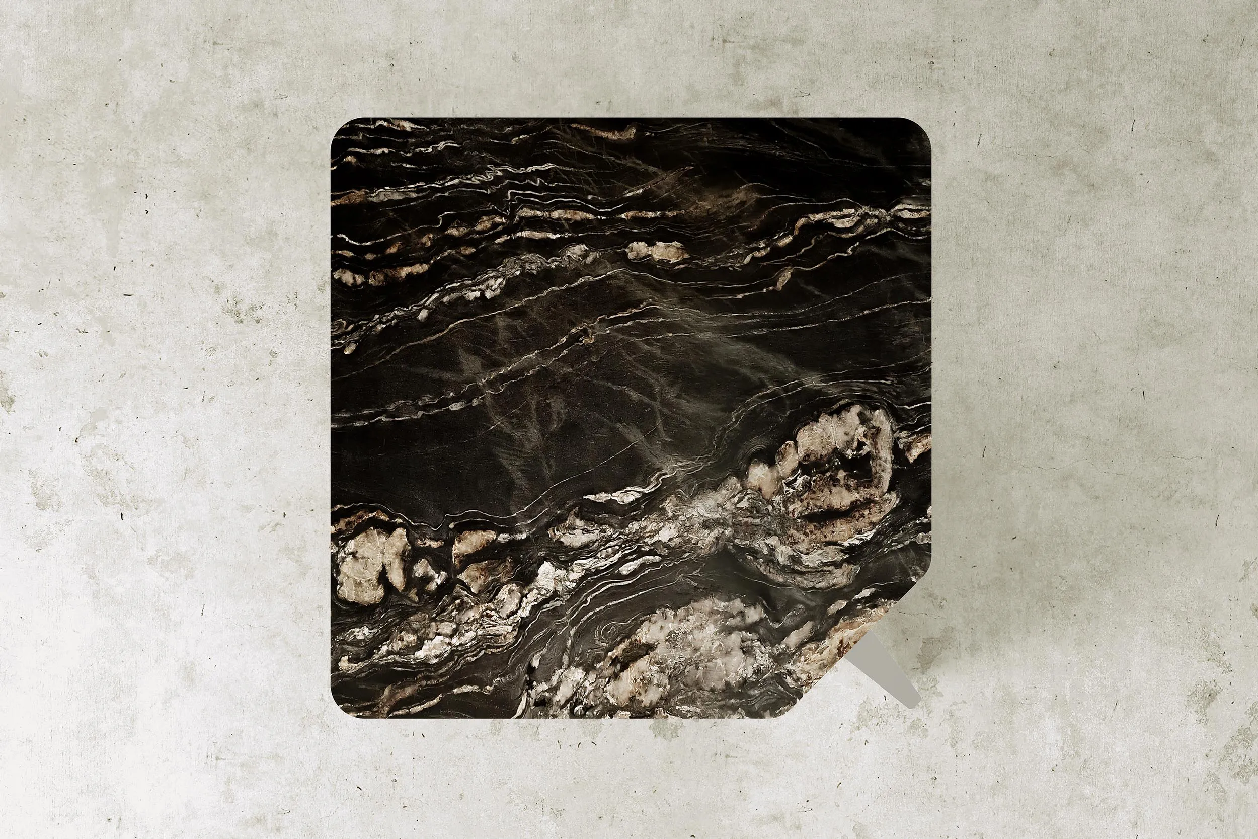At the heart of the collection is Belvedere Marble, a rare quartzite quarried in Northern Italy. Its deep black ground is traversed by incandescent veins of gold and amber, recalling fissures of light cutting through alpine rock faces at dusk. The dramatic veining suggests tectonic movement and geological time, as though each slab carries the compressed memory of the mountains. Carefully selected and oriented, the stone’s striations flow across the surfaces like ridgelines and horizons, transforming each work into an abstracted landscape