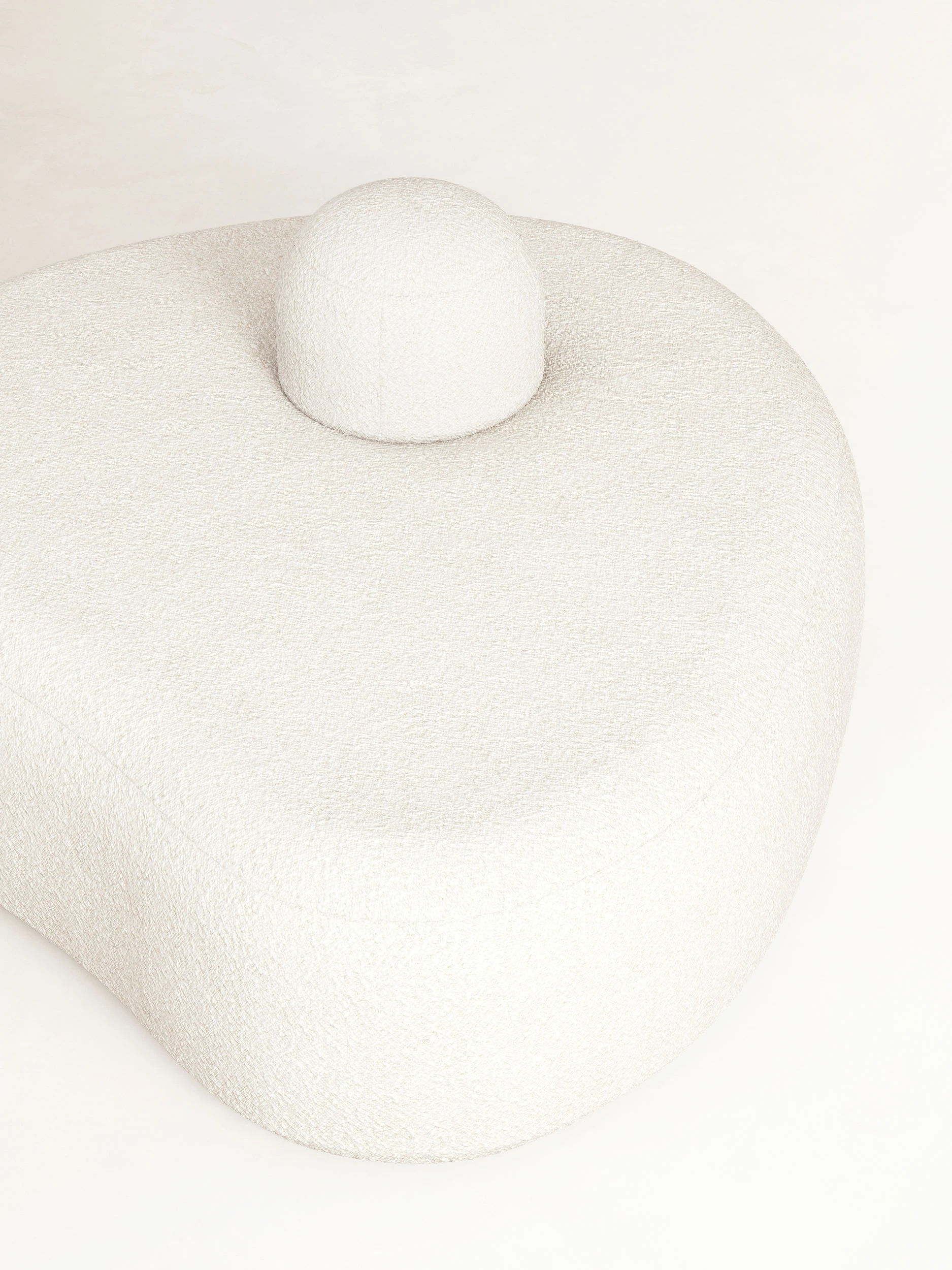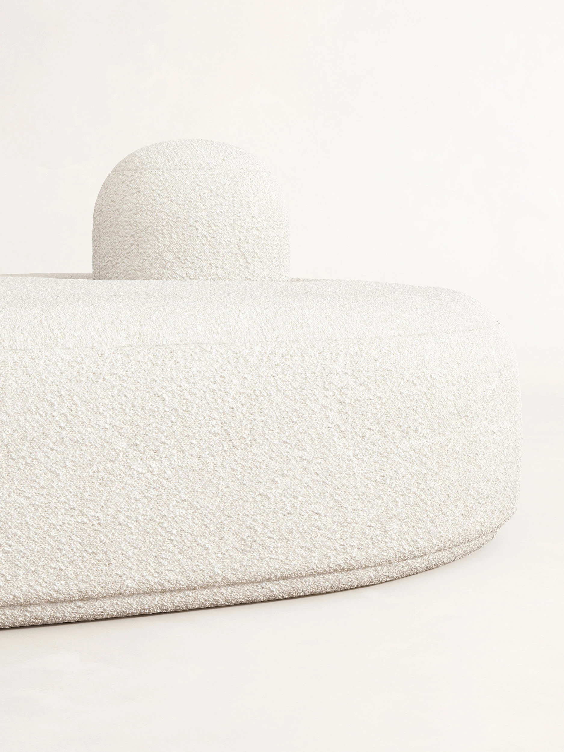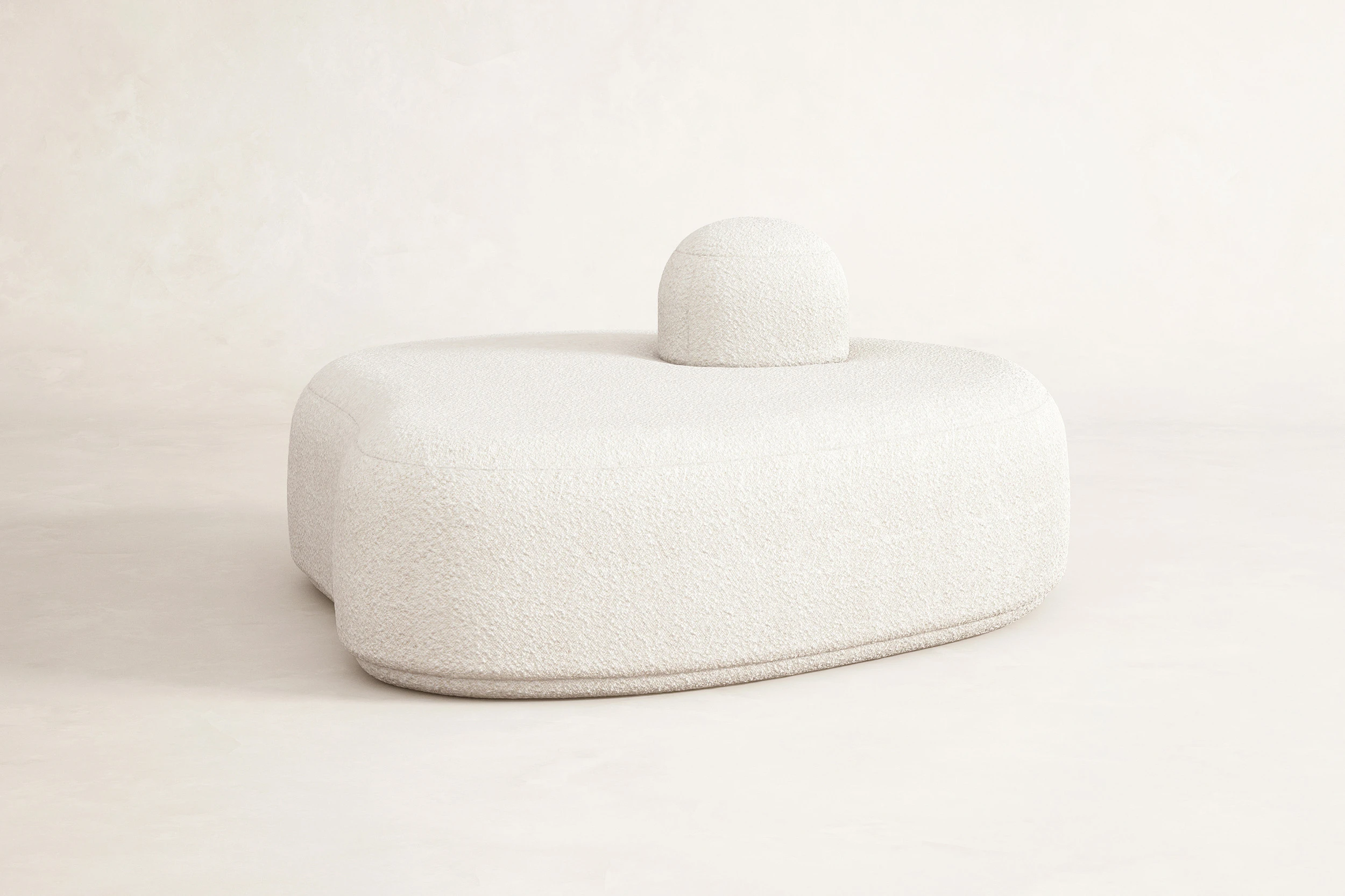 Rounded silhouettes, generous proportions, and tactile surfaces create an immediate sense of familiarity, as though these forms had always been nearby. The seating appears gently shaped by hand, recalling the reassuring presence of plush companions, quiet, still, yet alive with an inner world. Upholstered in bouclé fabric by Dedar, the surfaces carry the warmth of an ancestral touch, something felt before it is fully understood