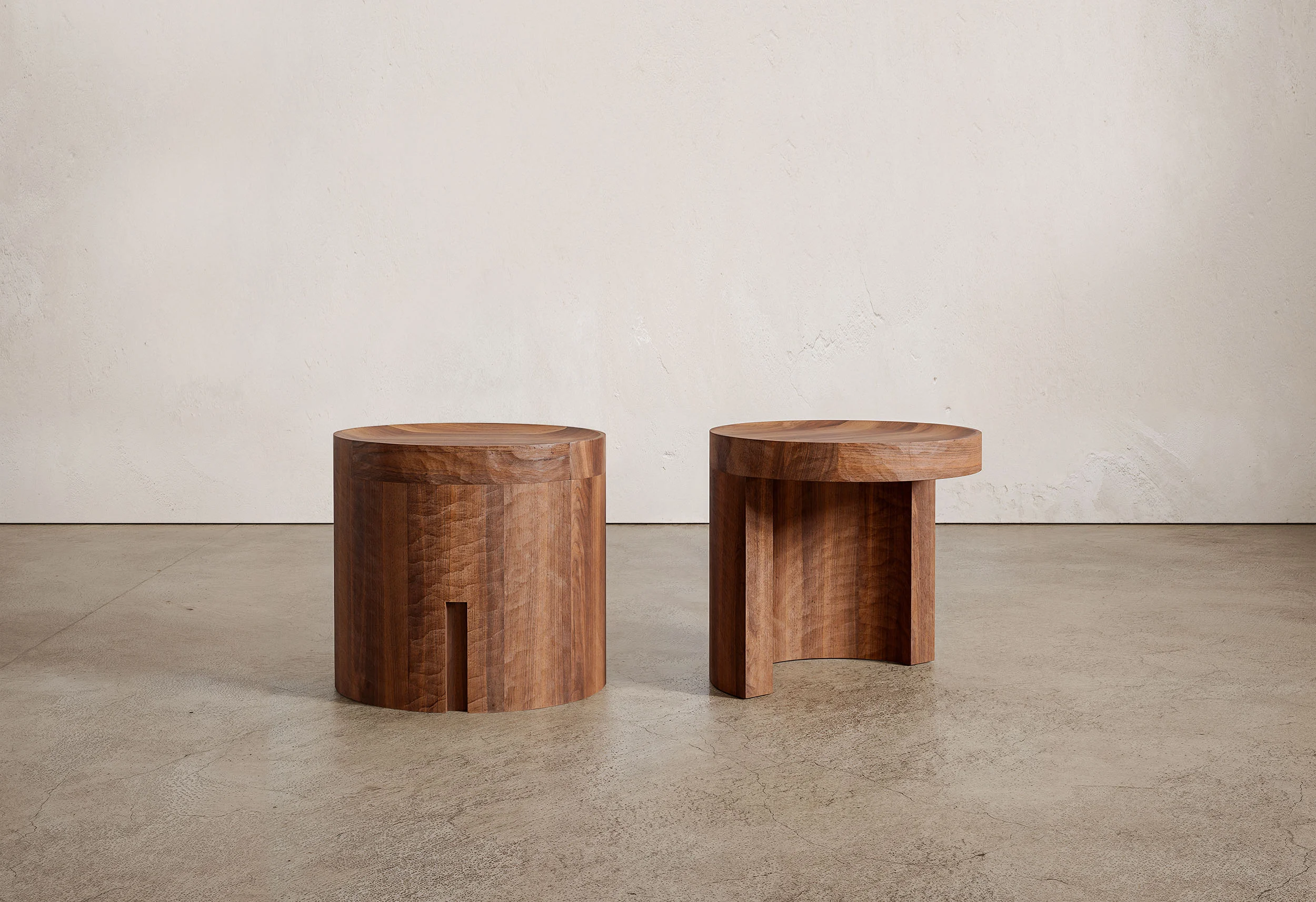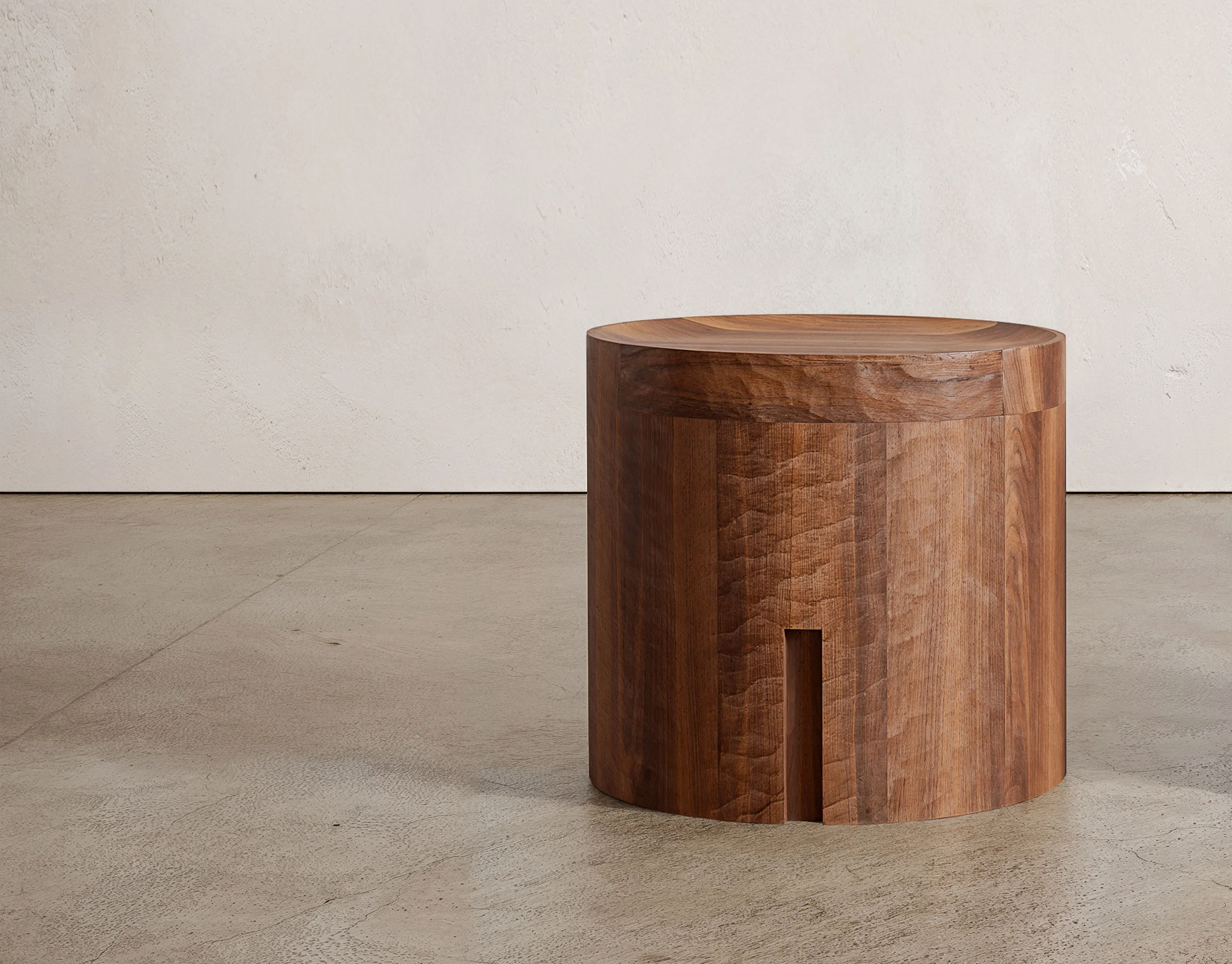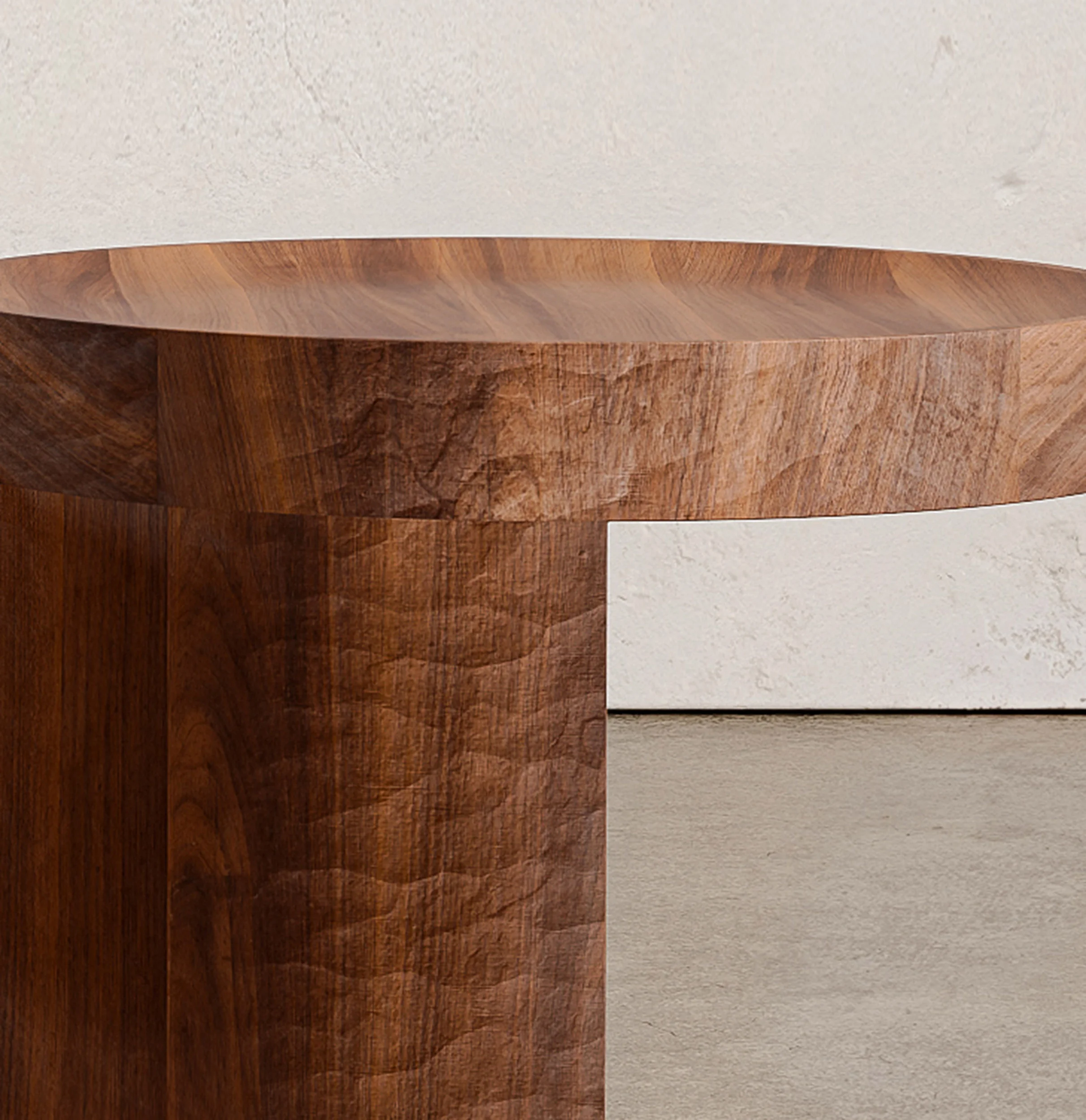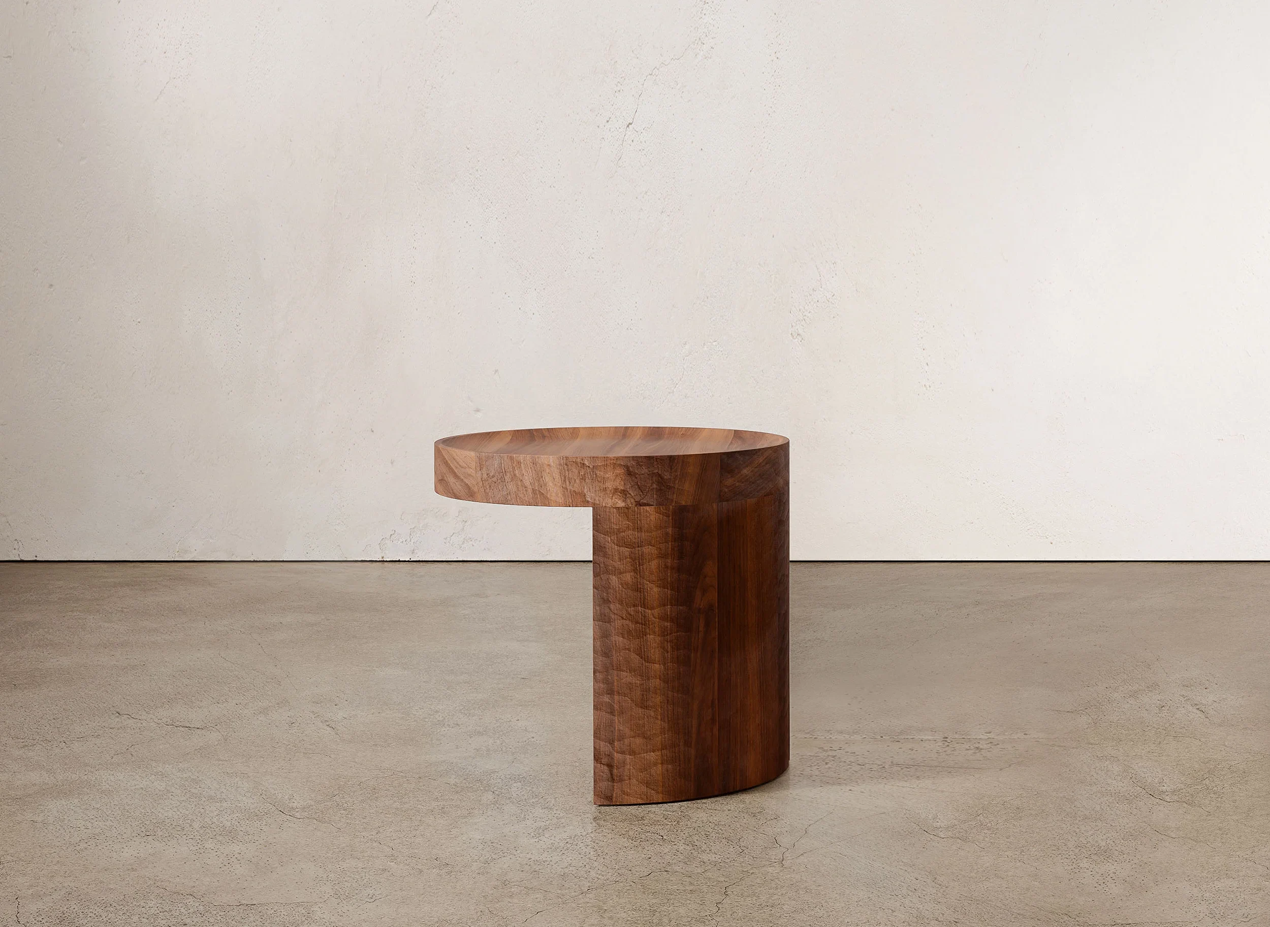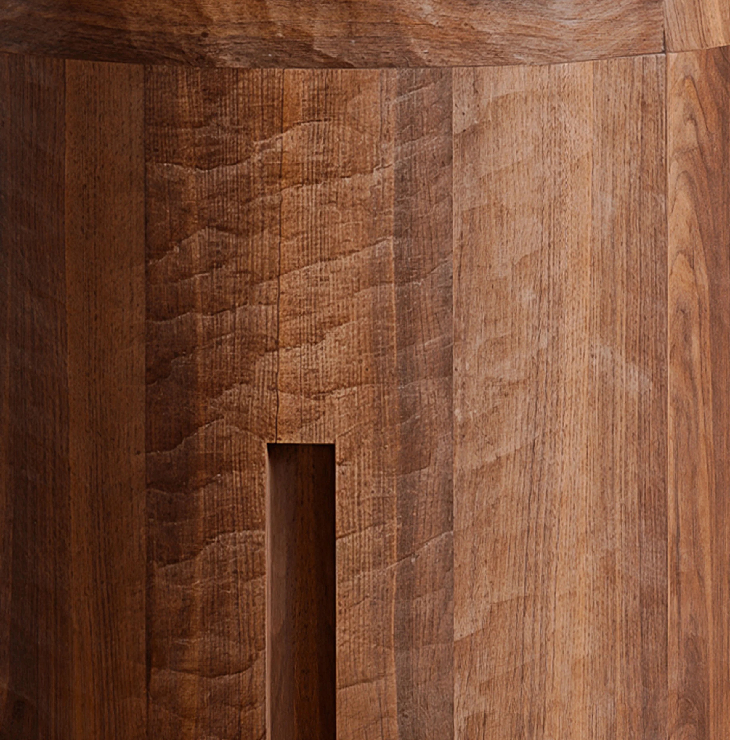 Solid timber, dyed a deep black, becomes the medium through which the primal monumental character of Pantalica is reimagined. Surfaces are manually brutalized through planing and irregular carving, echoing the raw, time-worn presence of rock shaped by both erosion and human intervention. The resulting forms are not polished into submission but retain the marks of their making, carrying forward the traces of labor and touch
