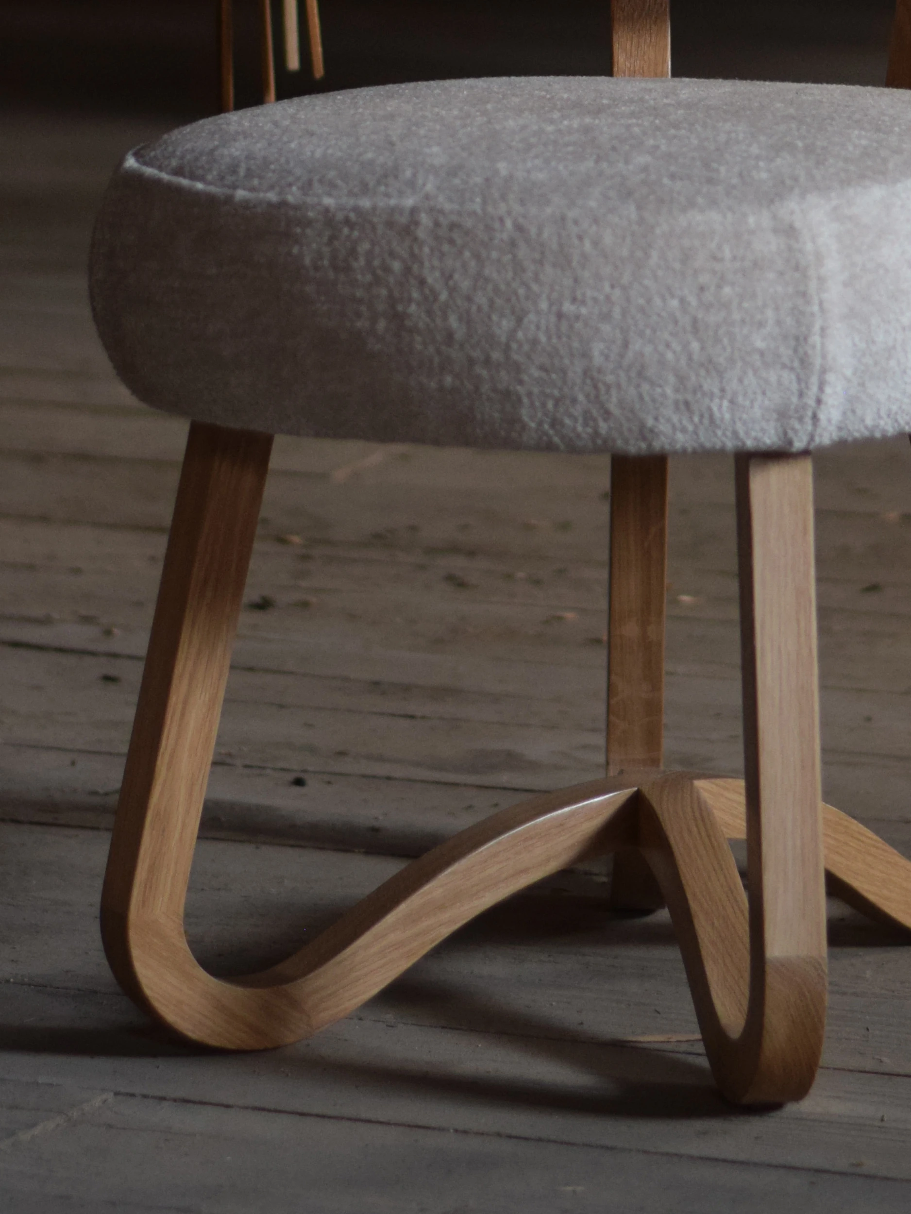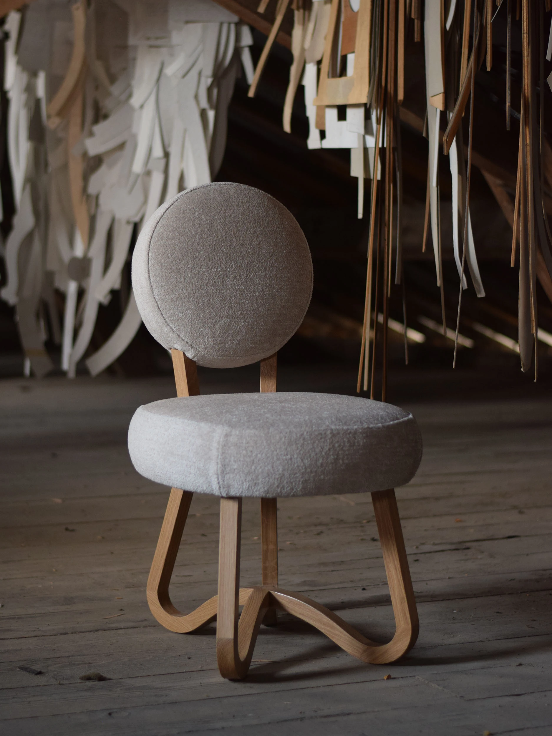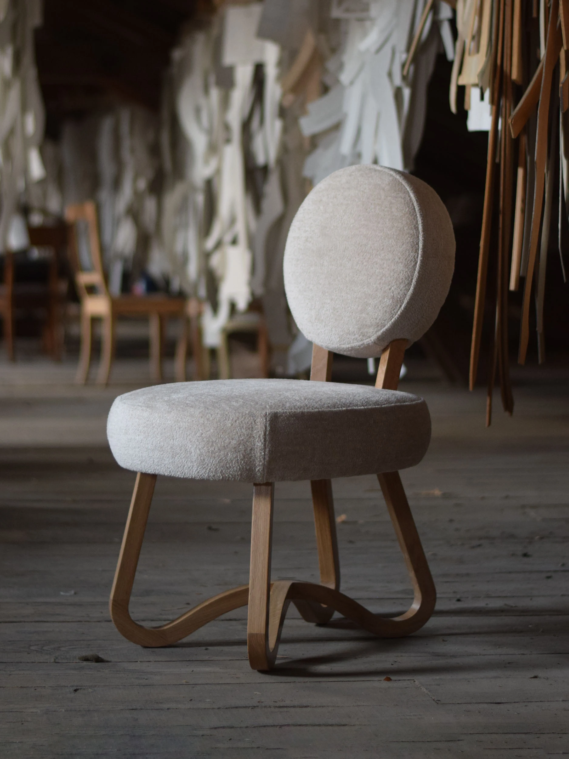 Each piece is rooted in a playful sense of repetition—the refined curvature and spindly exuberance of the legs provide a delicate counterpoint to the luxuriously plush, cloud-like seat. The base of tentacled legs has been carefully designed and engineered to create an airy effect and a sensation of lightness, a kind of carefree floating as if atop the gentlest ocean waves. Meticulously handcrafted, the legs are constructed of painted steel or natural wood, which stand in gorgeous contrast to the ultra-soft textile of the seat and back of each piece