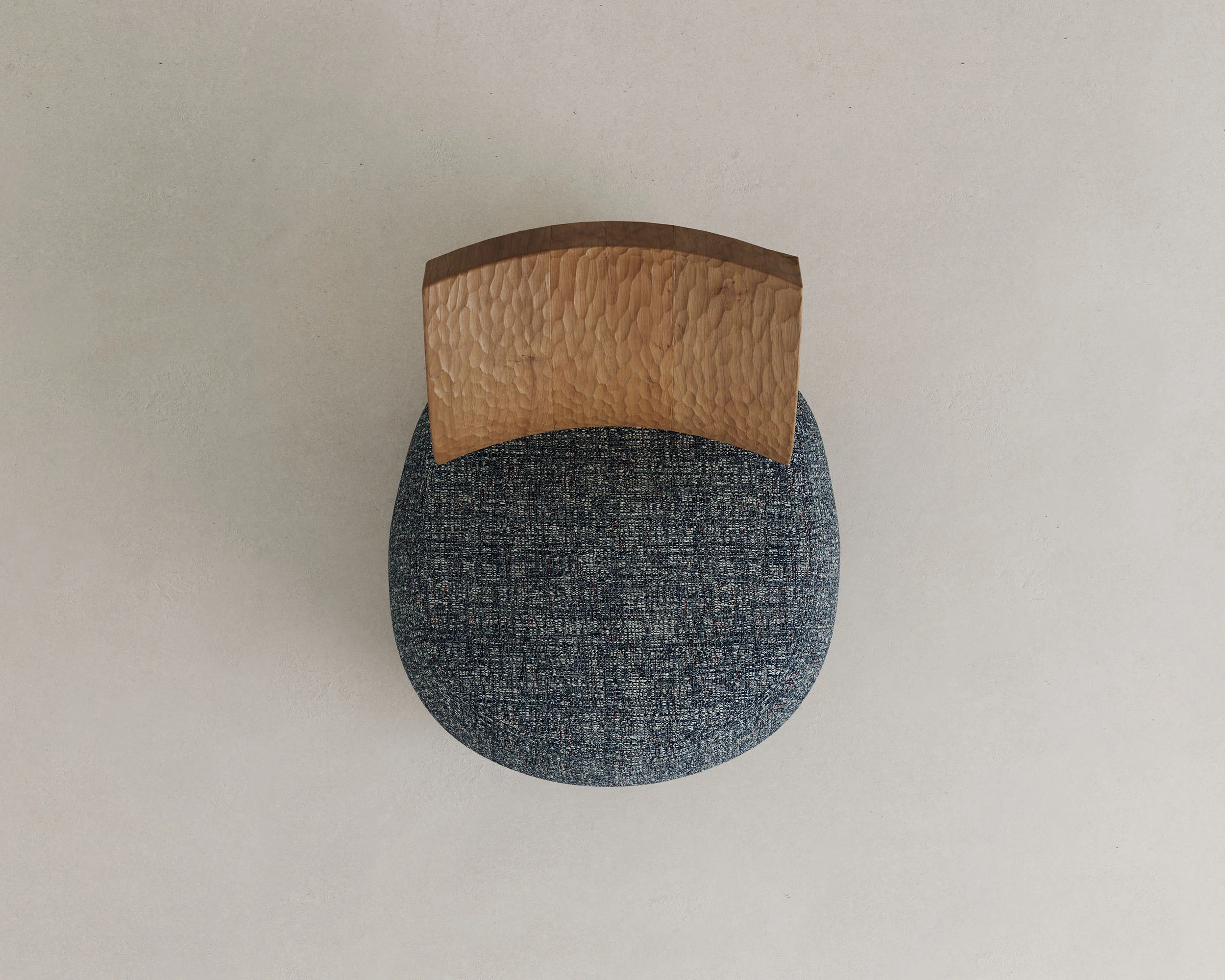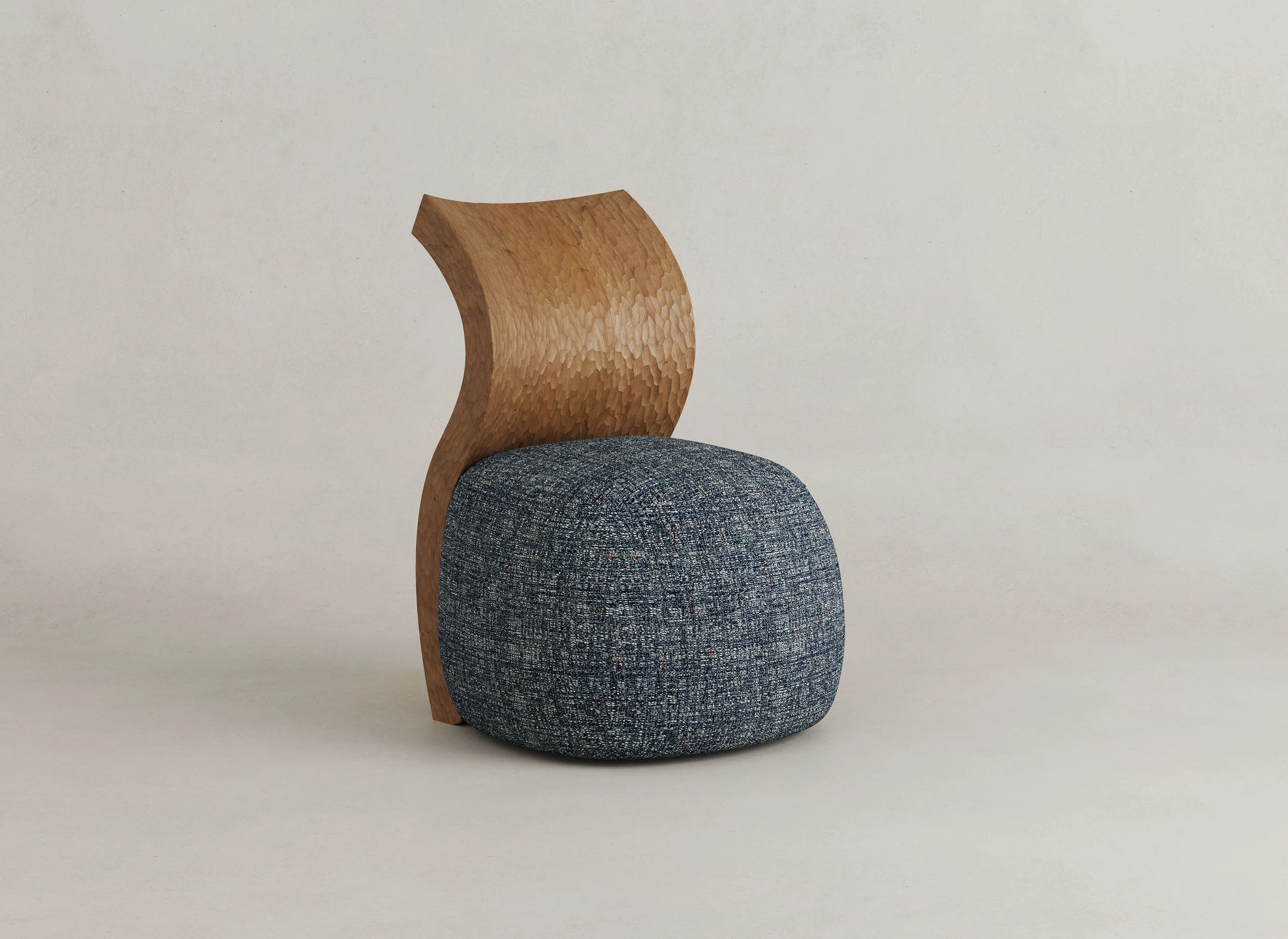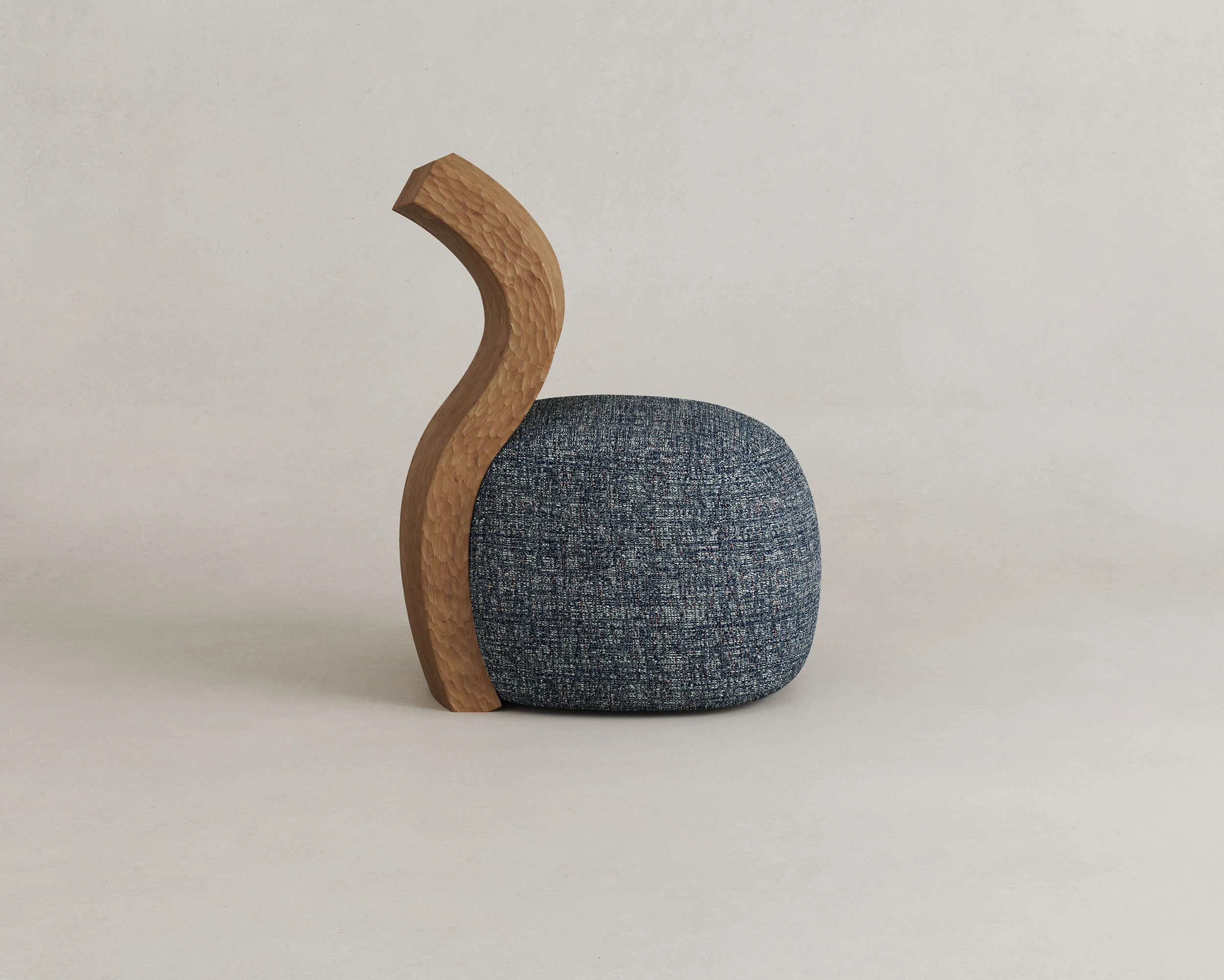 The PUFF stool feels at once hewn from a monolith and grown from the forest floor. A massive, sculptural base curves upward with solemn gravity, only to be interrupted by the unexpected softness of its rounded cushion, an organic cap that clings to its surface like a living growth. its silhouette recalls the strangeness of natural forms, like a giant mushroom or the slow, rounded shell of a snail, carrying its weight with patient grace. This interplay of weight and suppleness, mass and softness, whimsy and utility transforms the stool into a biomorphic presence—part furniture, part living entity—inviting tactile encounter and romantic interpretation