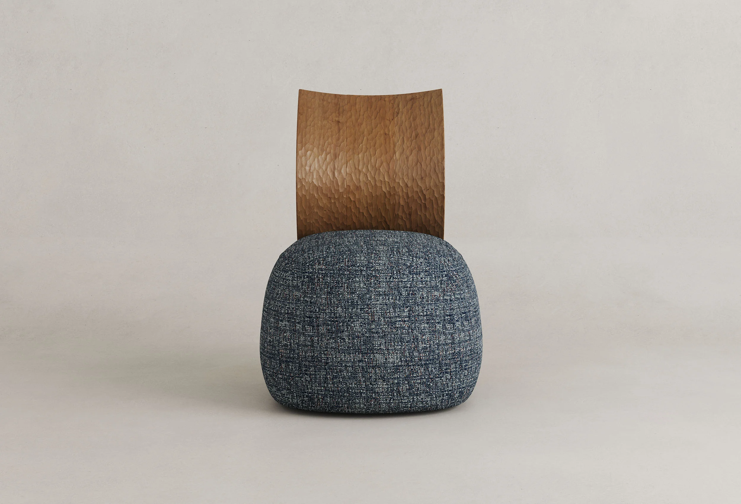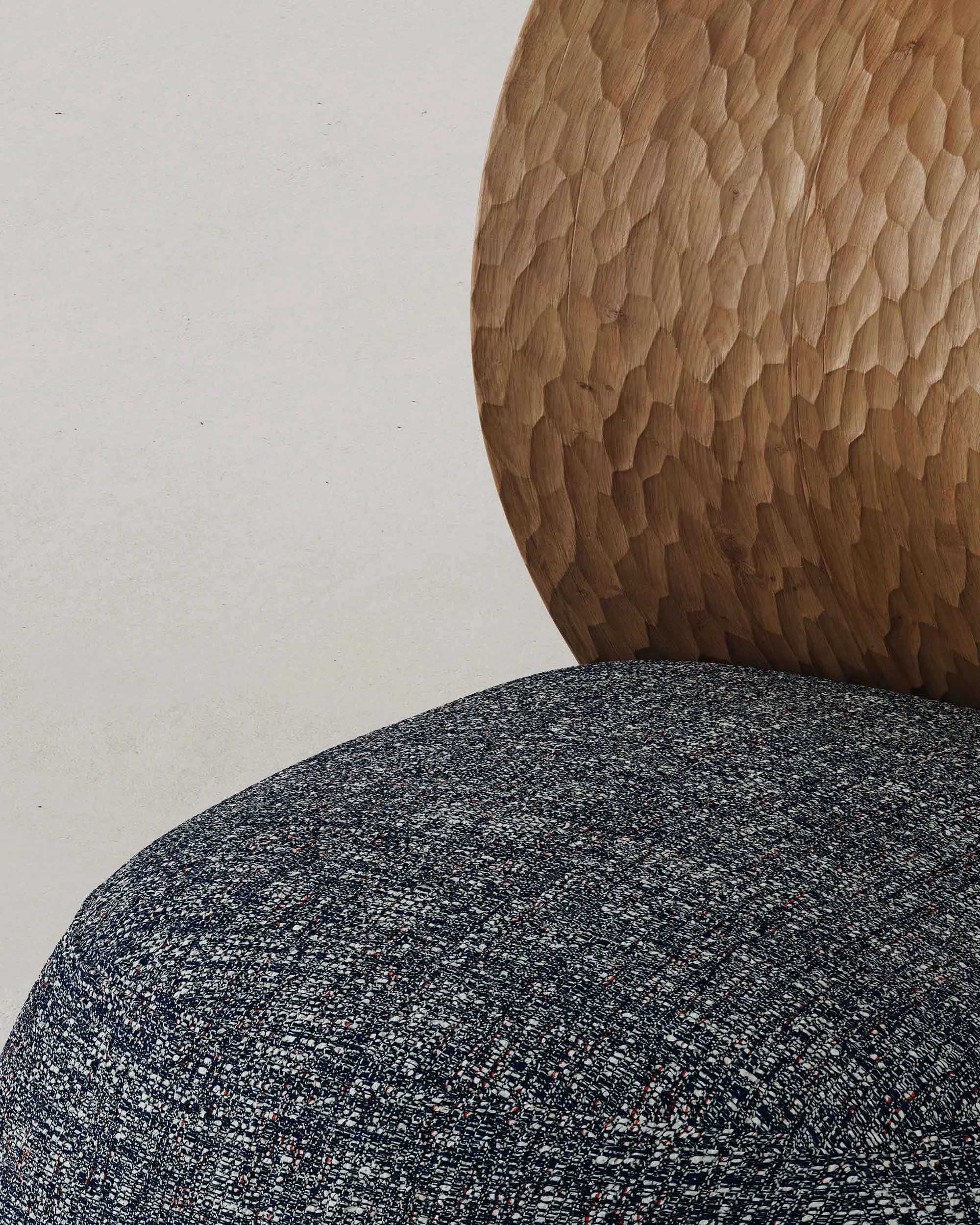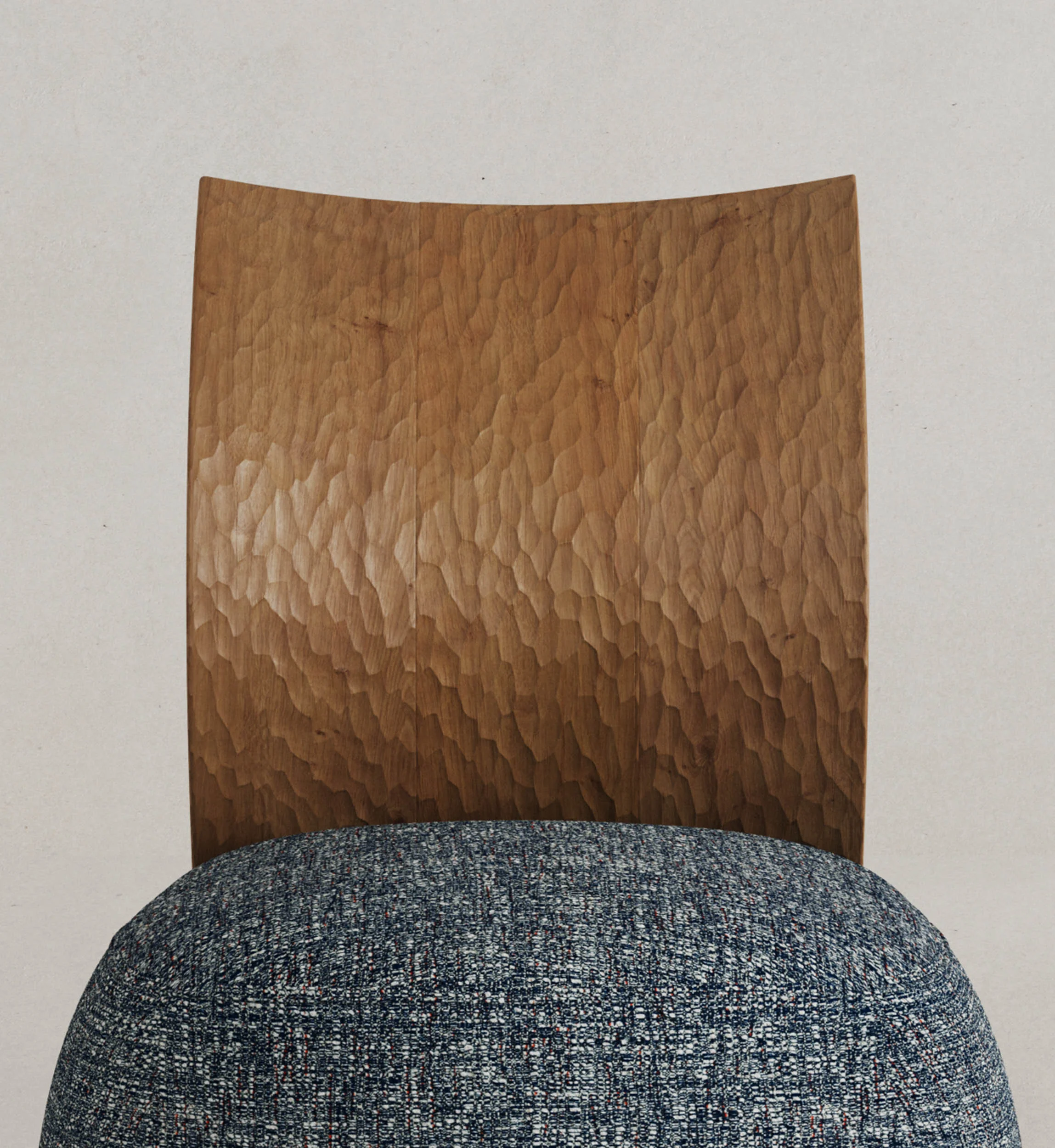 The PUFF stool feels at once hewn from a monolith and grown from the forest floor. A massive, sculptural base curves upward with solemn gravity, only to be interrupted by the unexpected softness of its rounded cushion, an organic cap that clings to its surface like a living growth. its silhouette recalls the strangeness of natural forms, like a giant mushroom or the slow, rounded shell of a snail, carrying its weight with patient grace. This interplay of weight and suppleness, mass and softness, whimsy and utility transforms the stool into a biomorphic presence—part furniture, part living entity—inviting tactile encounter and romantic interpretation