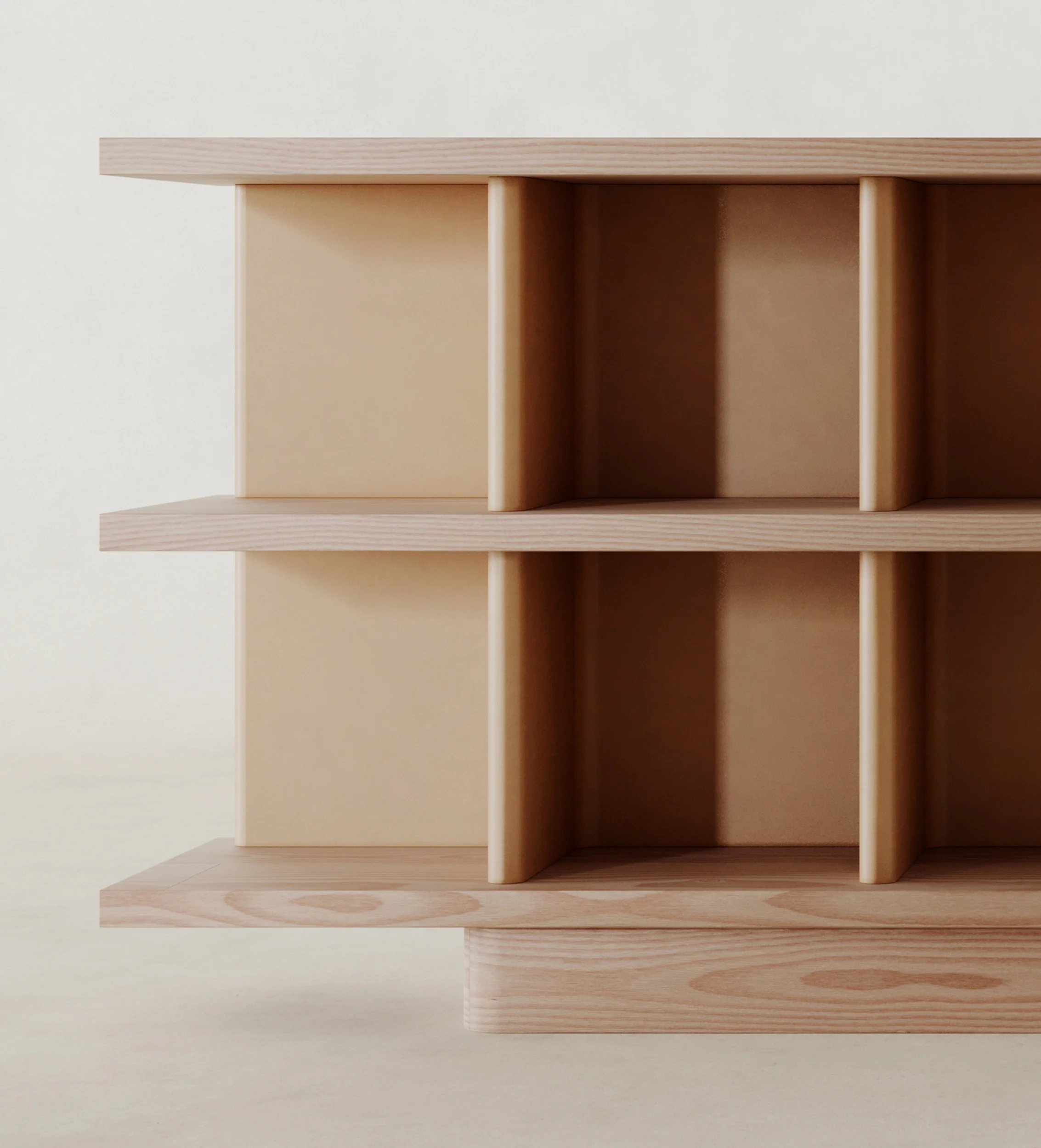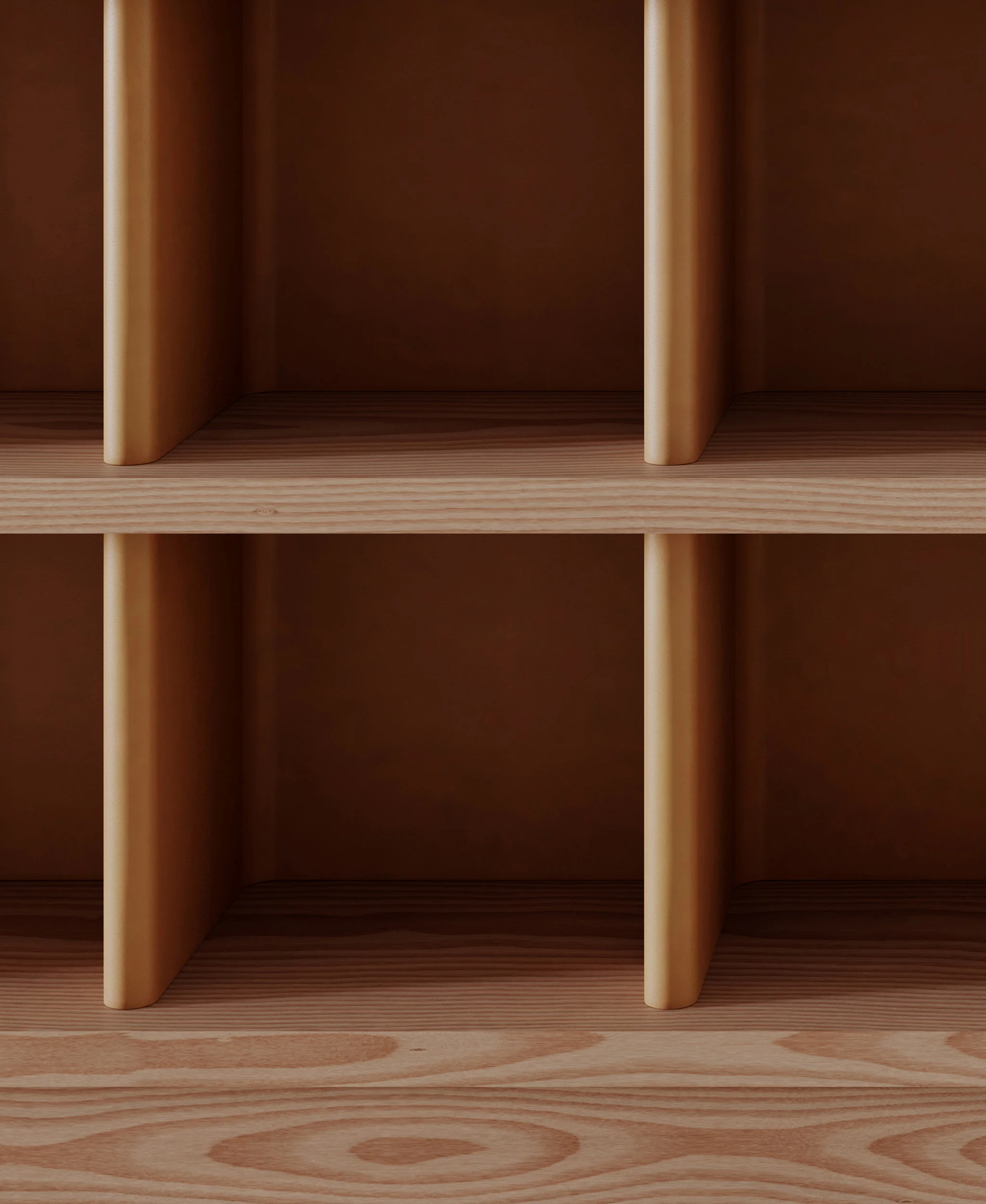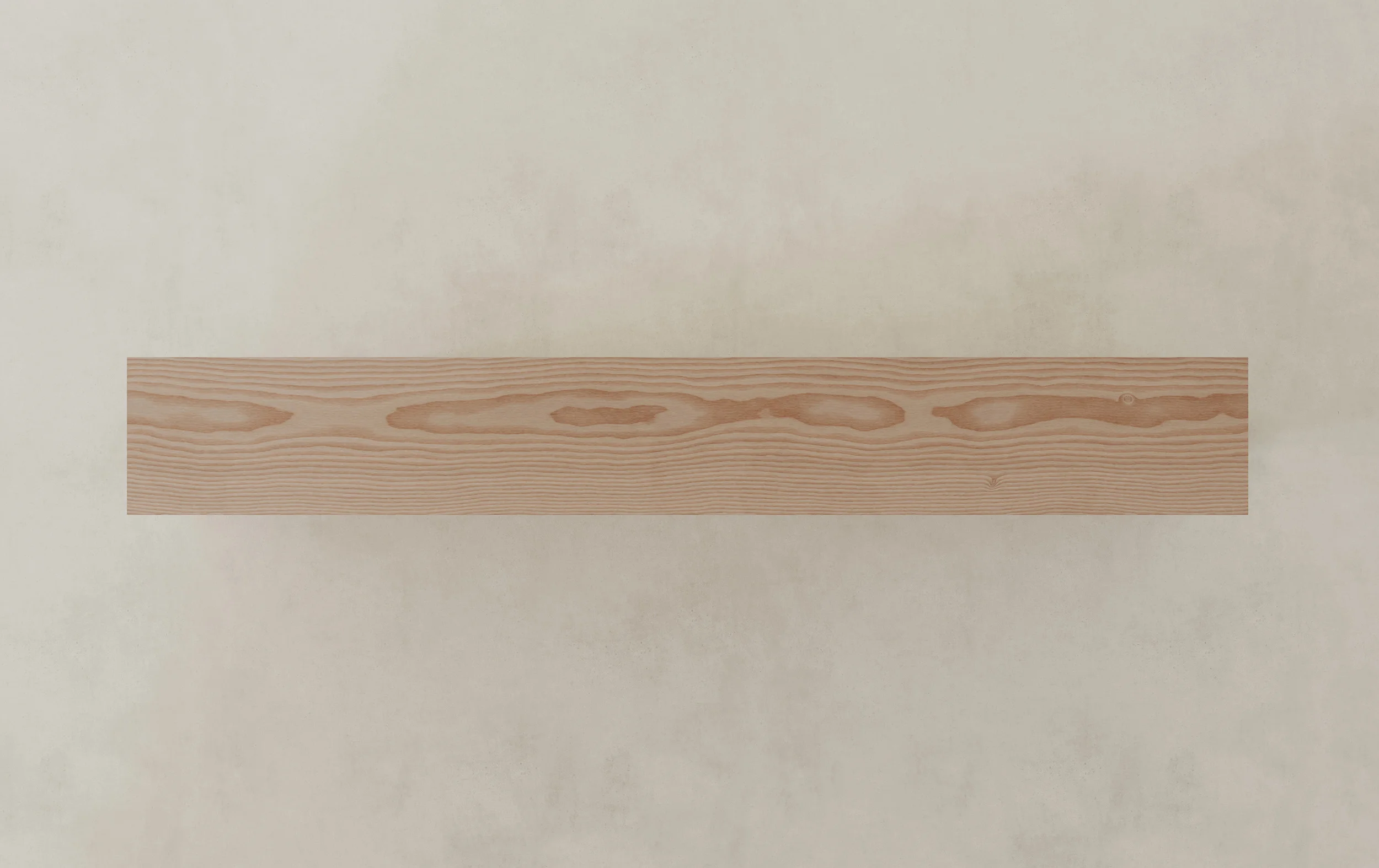 The collection is crafted primarily in solid Douglas wood, selected for its expressive graining and warm tonal shifts. Broad surfaces act as fields of texture where the life of the tree is fully legible. Against this natural intensity, accents in white leather are introduced with precision, creating moments where softness meets structure, tactility meets geometry. The contrast underscores the collection’s central dialogue: austerity and sensuality held in equilibrium