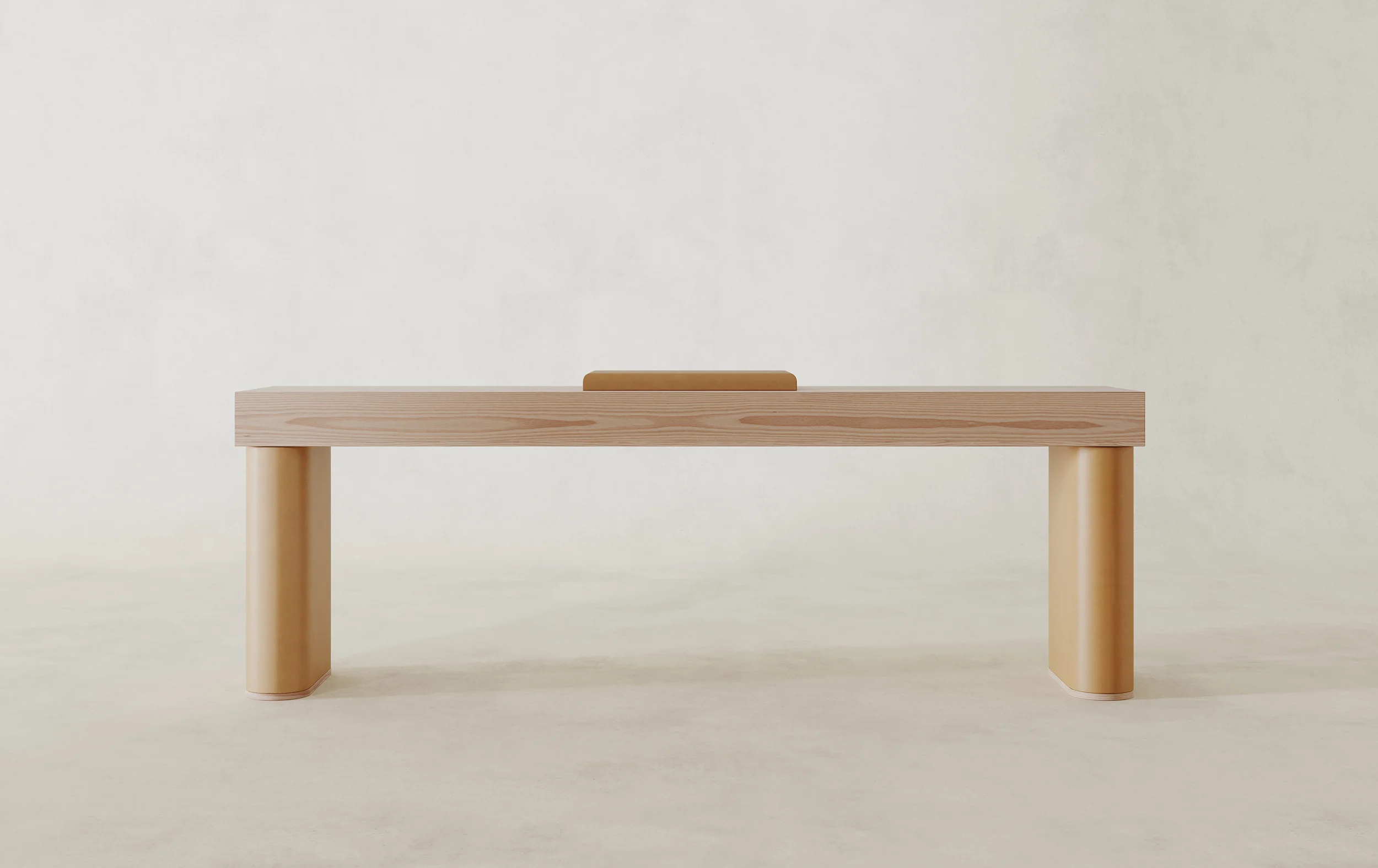 The collection is crafted primarily in solid Douglas wood, selected for its expressive graining and warm tonal shifts. Broad surfaces act as fields of texture where the life of the tree is fully legible. Against this natural intensity, accents in white leather are introduced with precision, creating moments where softness meets structure, tactility meets geometry. The contrast underscores the collection’s central dialogue: austerity and sensuality held in equilibrium
