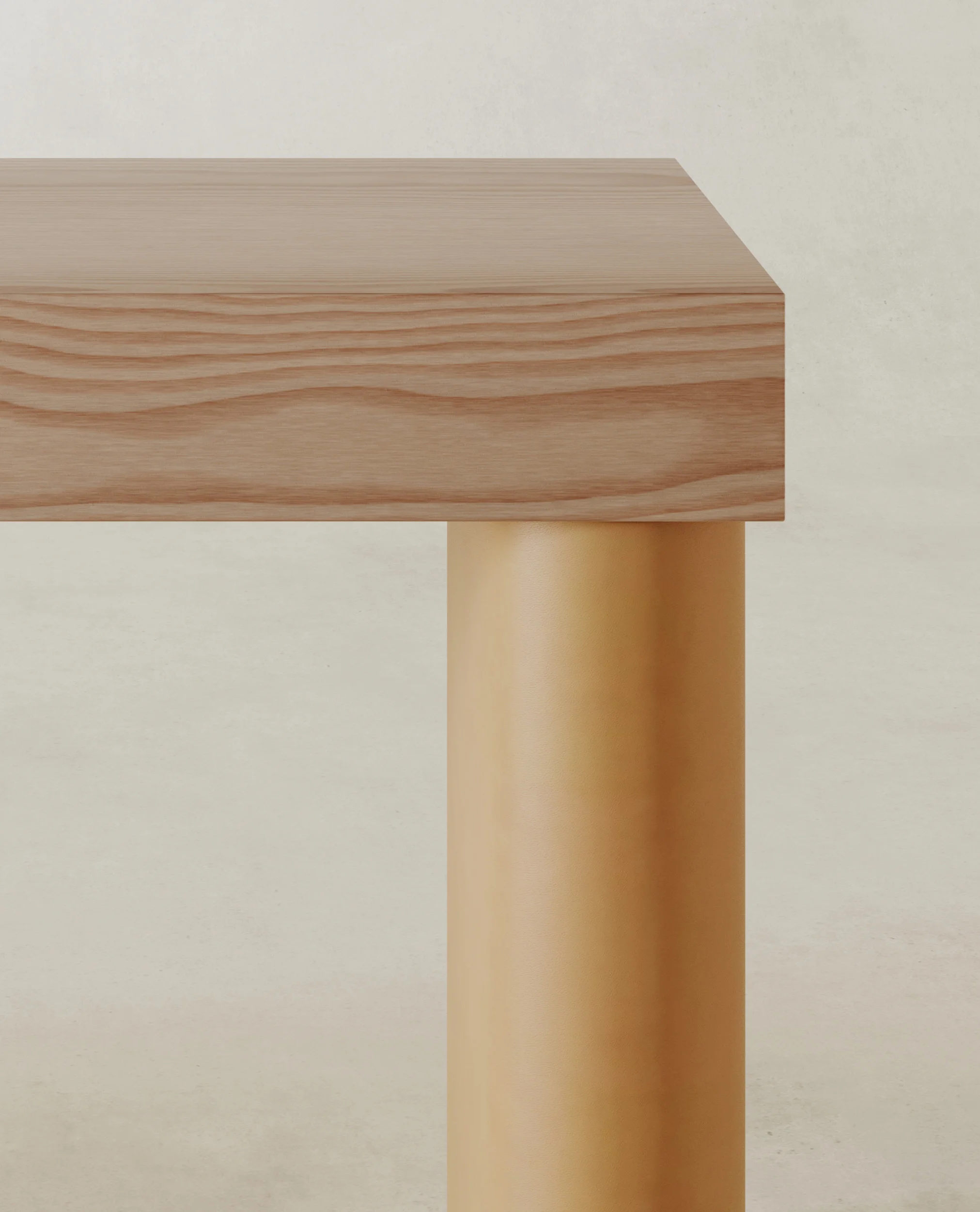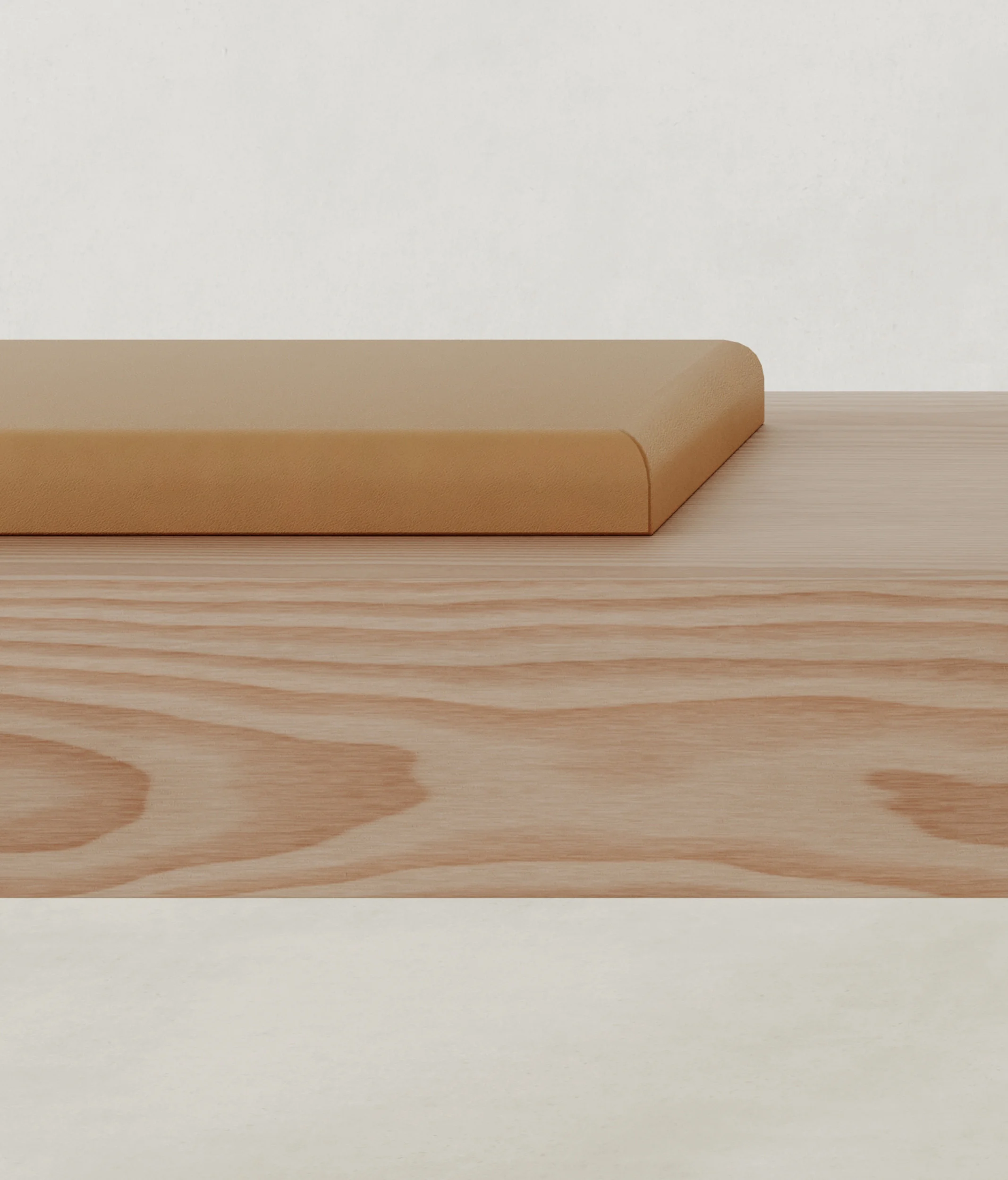 The collection is crafted primarily in solid Douglas wood, selected for its expressive graining and warm tonal shifts. Broad surfaces act as fields of texture where the life of the tree is fully legible. Against this natural intensity, accents in white leather are introduced with precision, creating moments where softness meets structure, tactility meets geometry. The contrast underscores the collection’s central dialogue: austerity and sensuality held in equilibrium