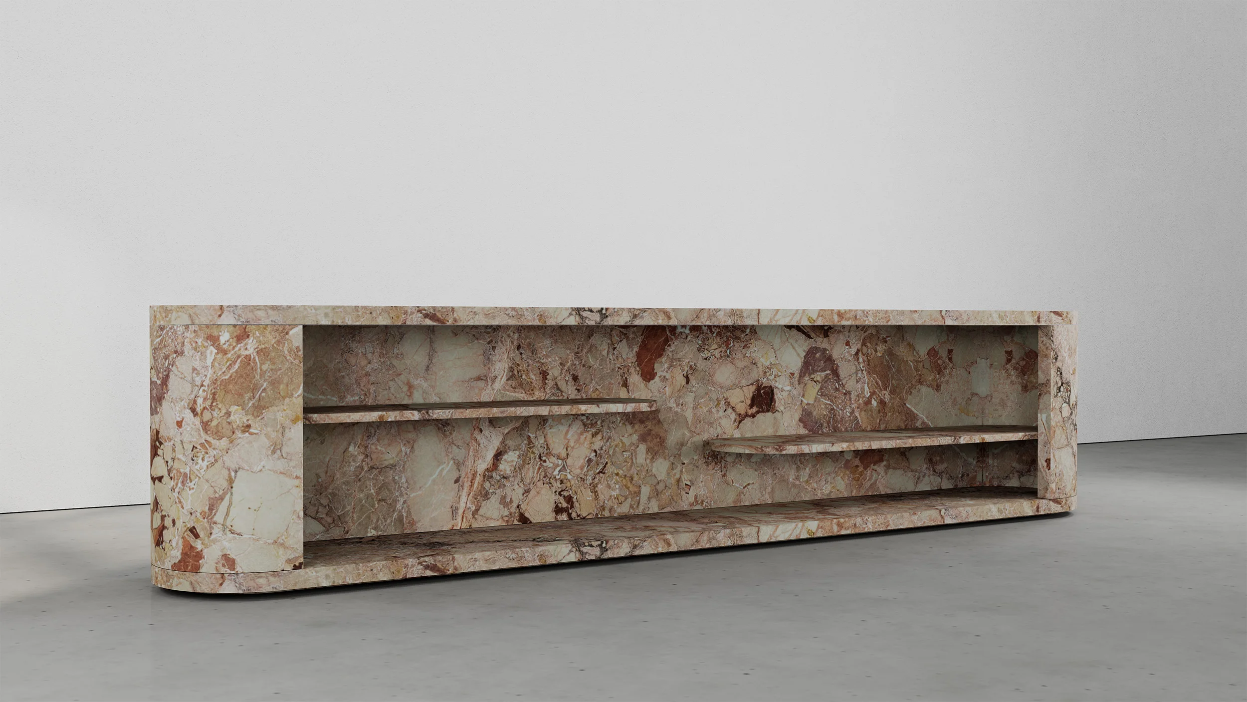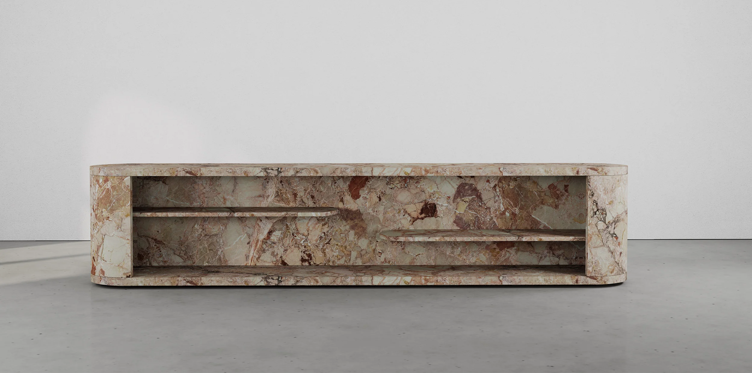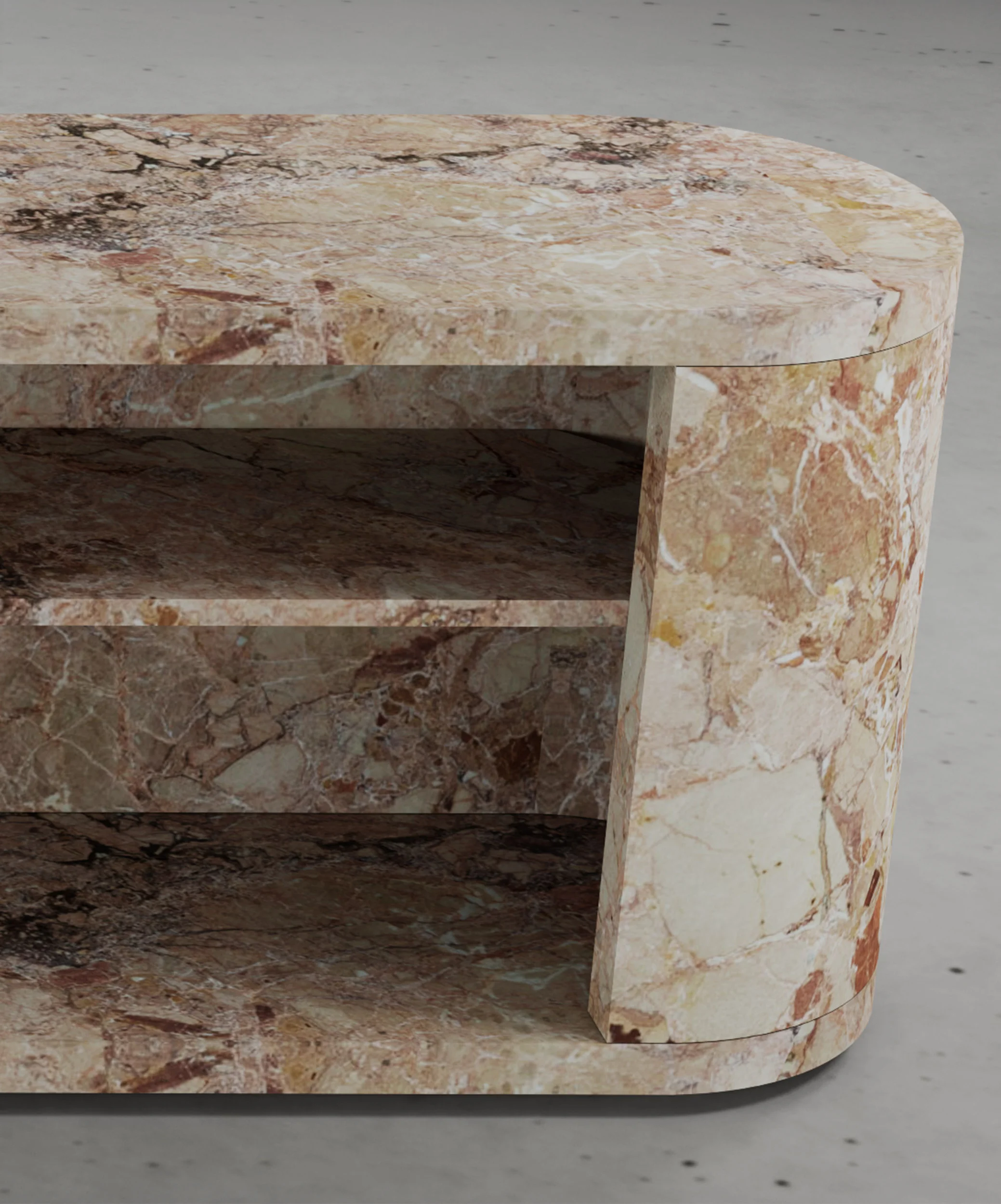 Each piece is meticulously handcrafted in Italy from Breccia Pernice marble, a richly expressive stone distinguished by warm tonal variations and intricate veining. Echoing the geological complexity of the Conero cliffs, the material carries within it a sense of depth and movement, as if shaped by centuries of natural forces. Its textured surface becomes both medium and narrative, grounding each work in a tangible sense of place