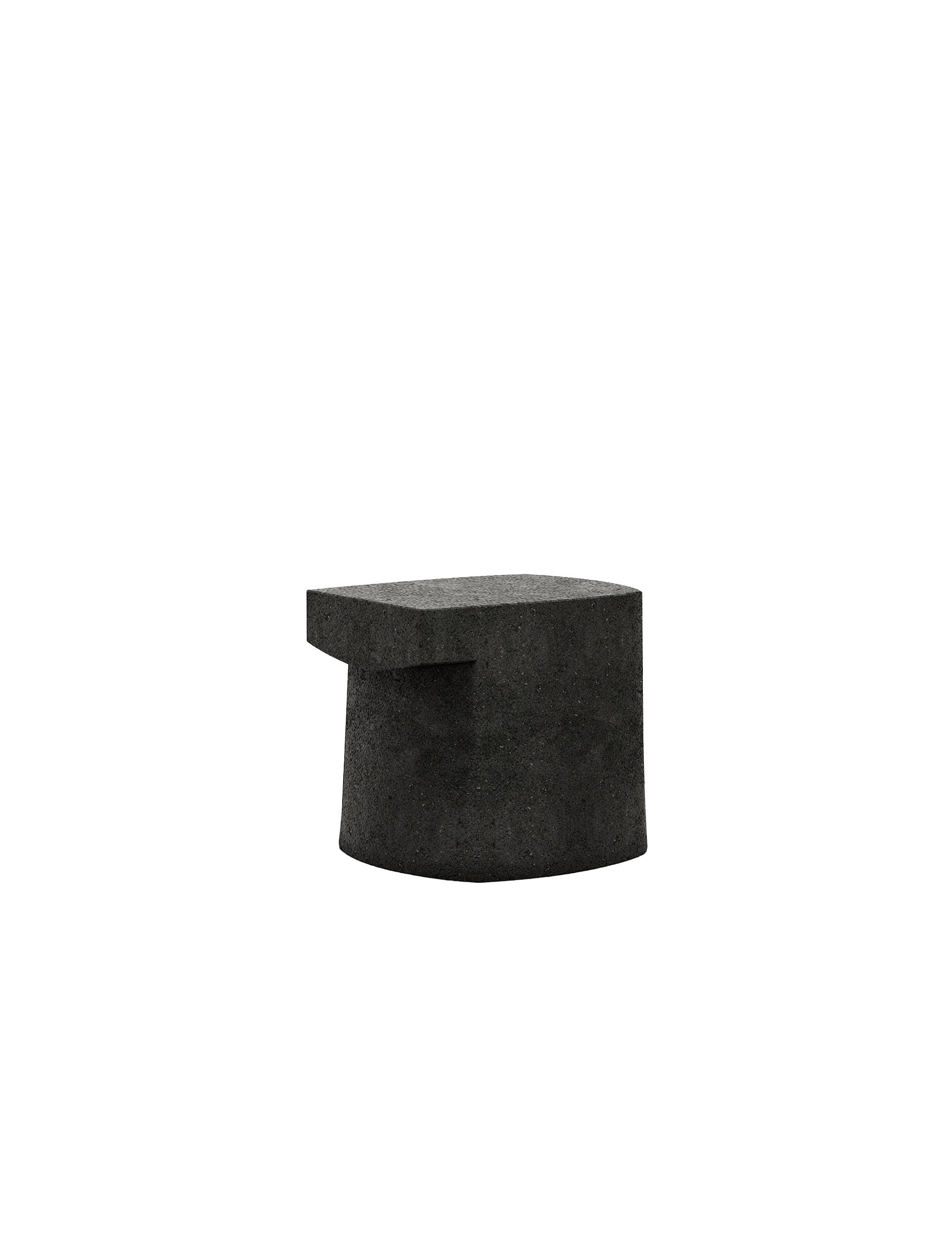 The tabletop, with its flat and refined surface, reveals underneath a concave curve—a negative mold of Volvic’s extinct craters. This inverted form, a silent tribute to past volcanic activity, creates a contrast between the rigor of the tabletop and the organic memory of the stone. The deep black of the material dialogues with this shape to create a pure expression, where the stone inspires the craft and the craft reveals its essence