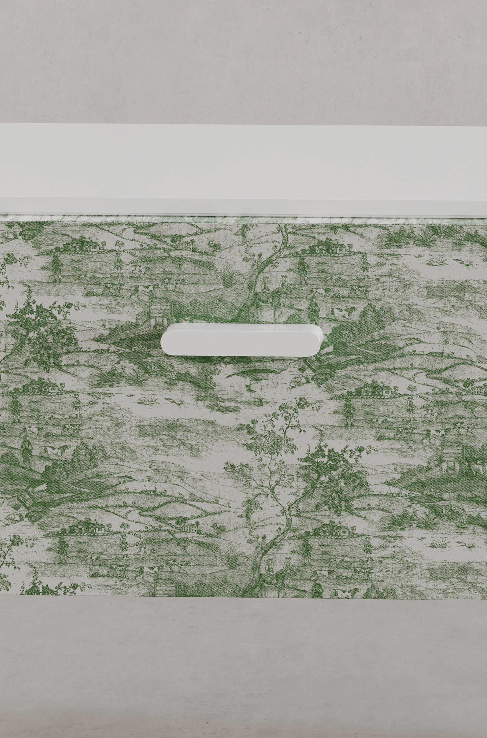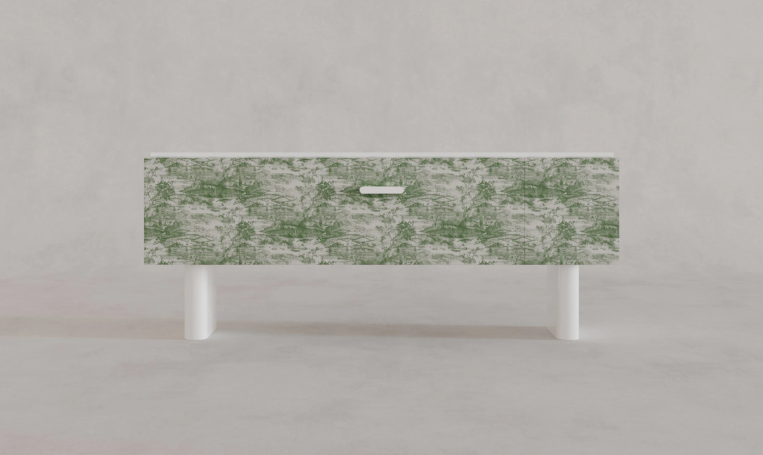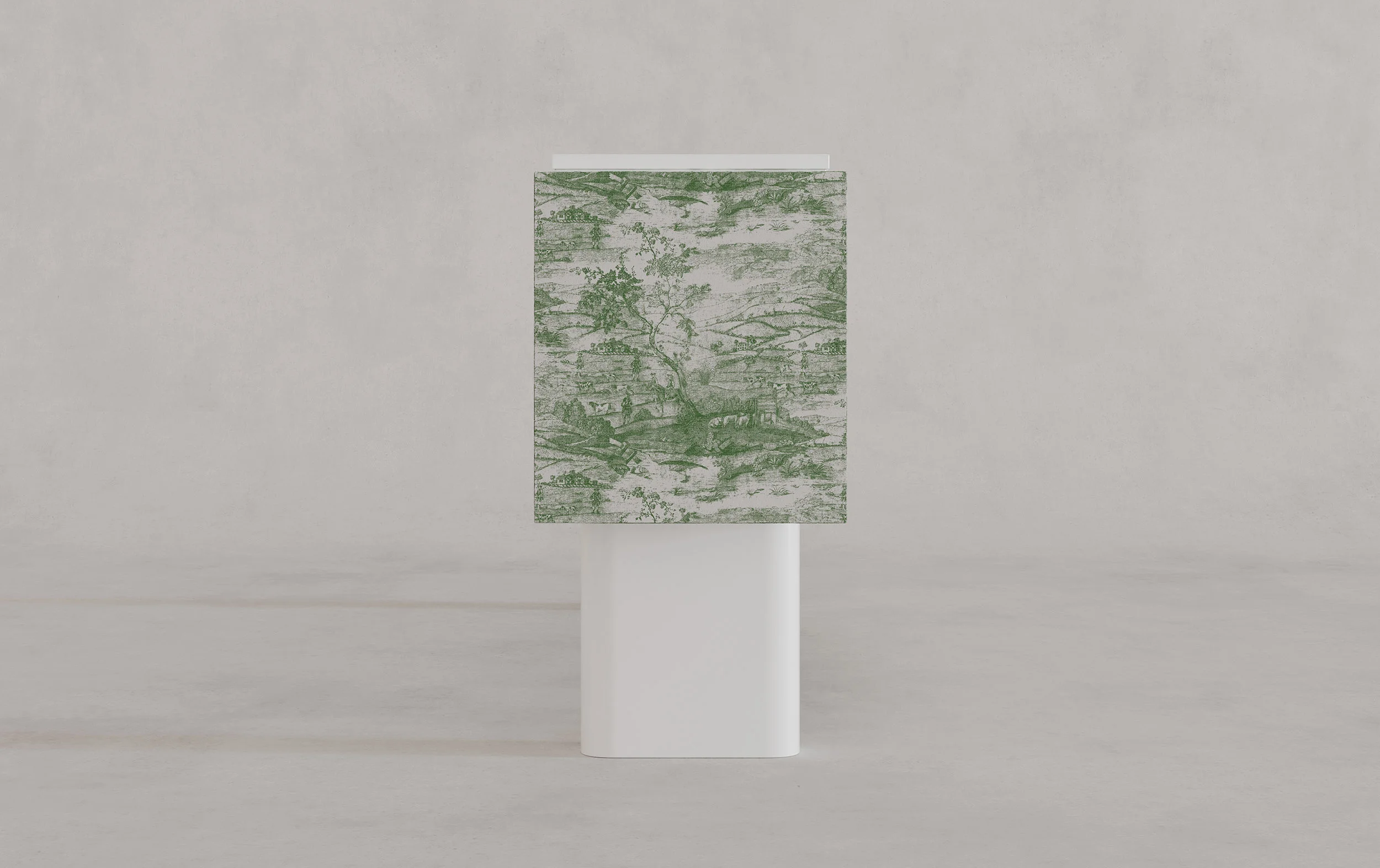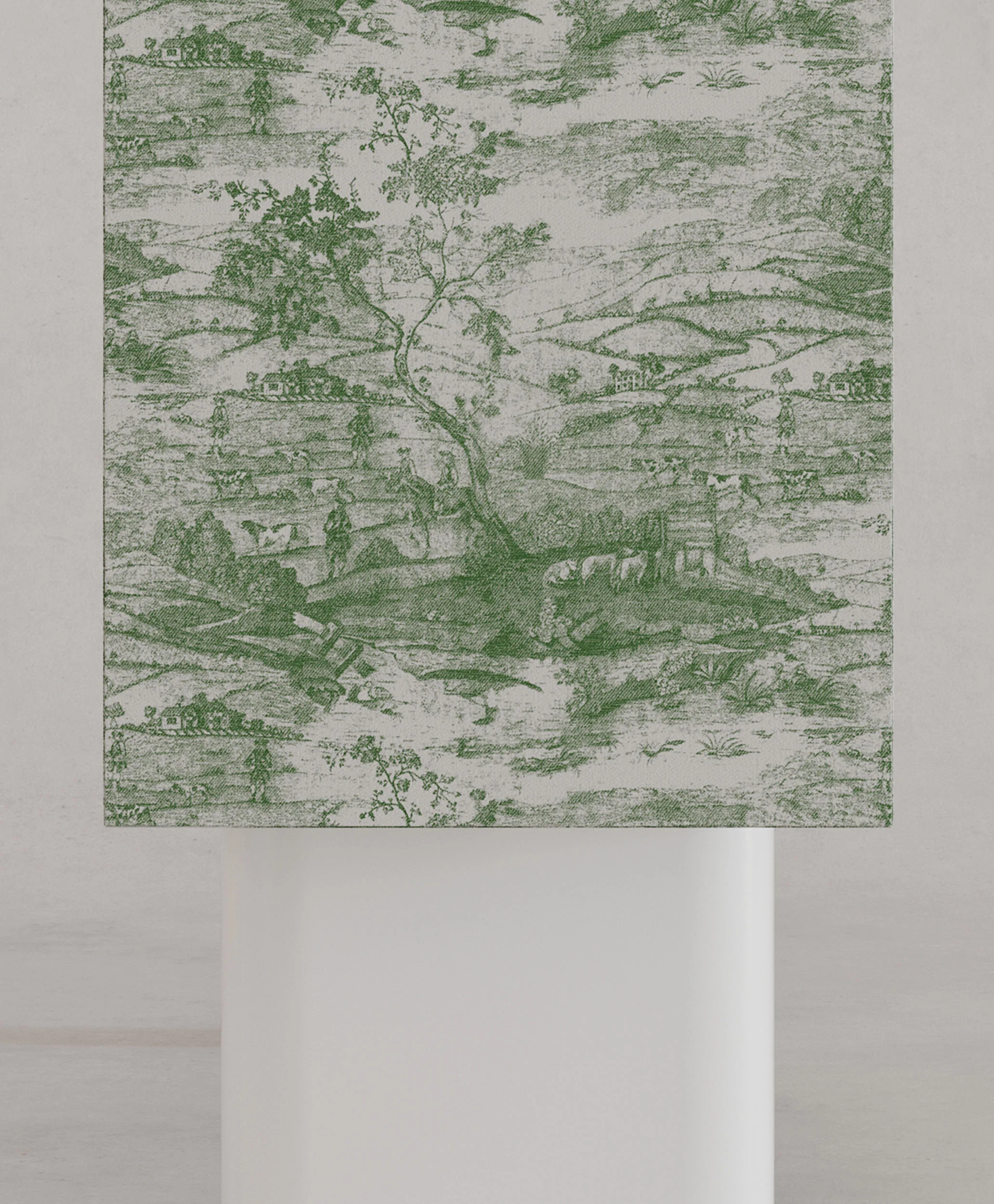 Each work in Tessuto is available in two fabric finishes, offering distinct readings of the same architectural form and underscoring the Villa Medici’s dual identity as a site of historical continuity and contemporary innovation. The first is Derby Toile, a historic jacquard by Rubelli inspired by French Toile de Jouy, in which pastoral imagery is rendered with rich texture and material depth. The second is Elucide, a contemporary jacquard by Rubelli characterized by geometric complexity and a sense of ordered chaos. Drawing from Moorish tile patterns that traveled across the Mediterranean into Europe, Elucide introduces a more radical visual language, reflecting the Villa’s irreverent mid-century reimagining under Balthus