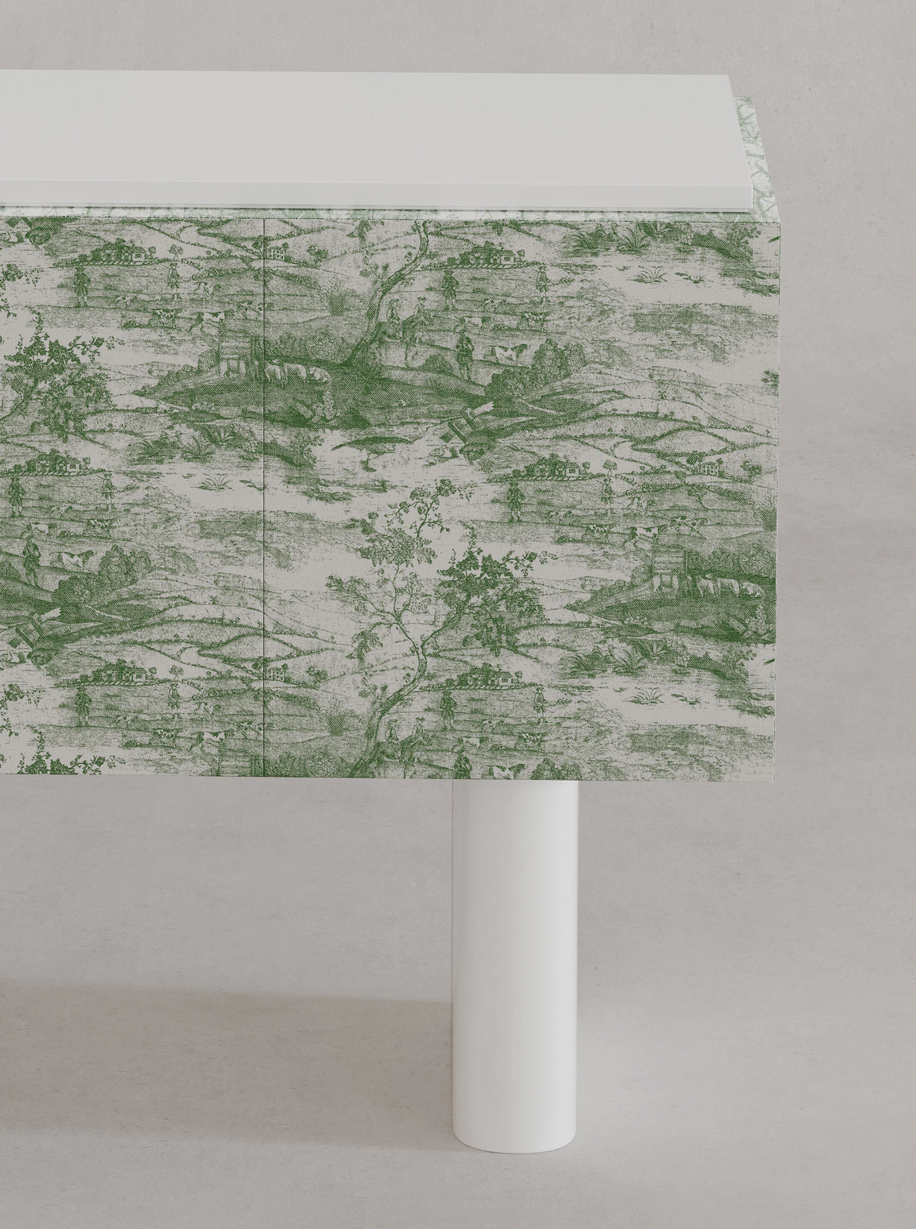 Tessuto I, designed prior to Balzano’s arrival in Rome, is a kind of architectural reverie, a fantasy of the storied Roman Villa as imagined from a distance. Characterized by weighty volumes and enveloped in luxurious Rubelli fabrics, the collection evokes a contemporary reinterpretation of Renaissance grandeur, gravitas, and sensuality. These works operate as imagined monuments, informed by history but filtered through desire, anticipation, and romantic expectation