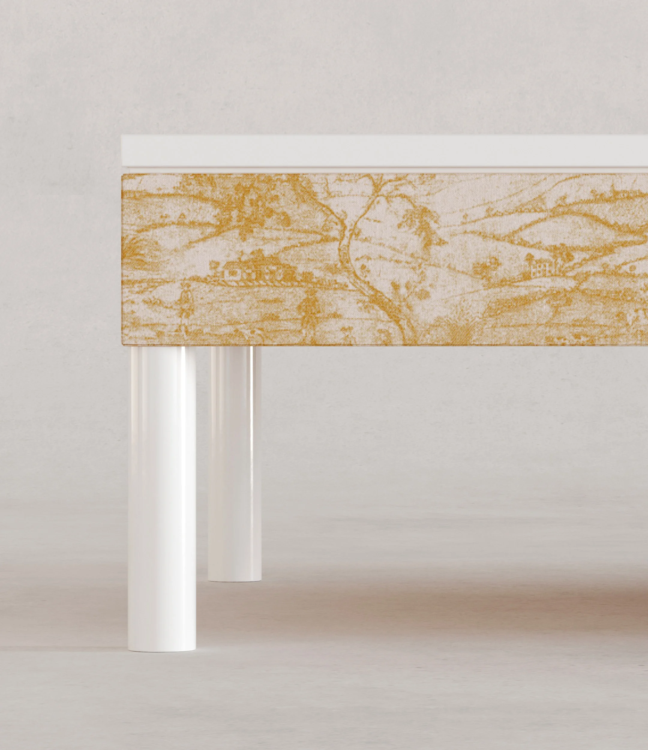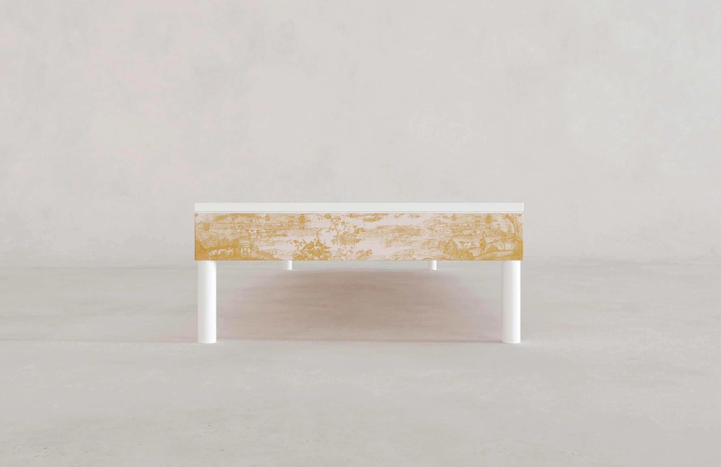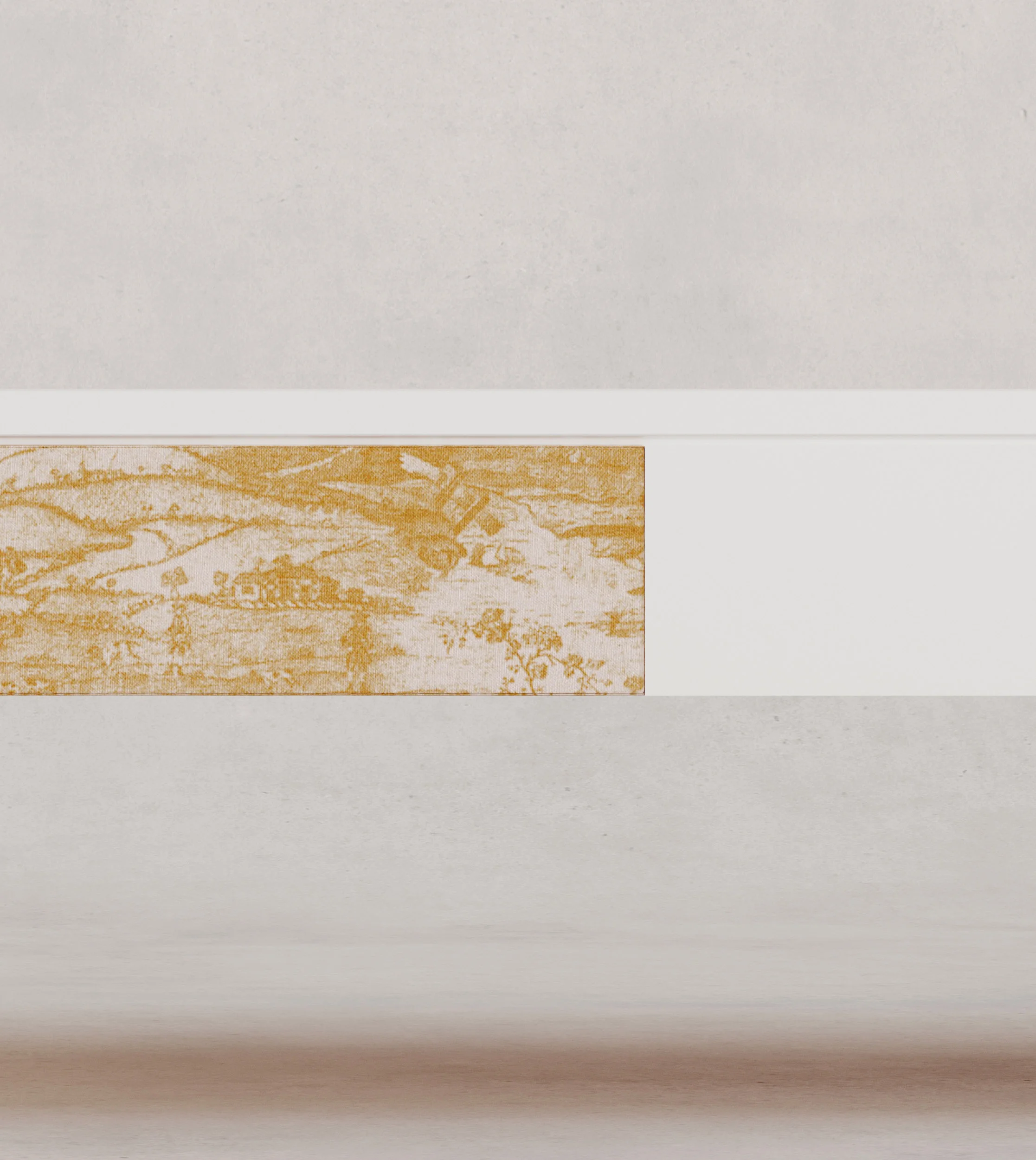 Each work in Tessuto is available in two fabric finishes, offering distinct readings of the same architectural form and underscoring the Villa Medici’s dual identity as a site of historical continuity and contemporary innovation. The first is Derby Toile, a historic jacquard by Rubelli inspired by French Toile de Jouy, in which pastoral imagery is rendered with rich texture and material depth. The second is Elucide, a contemporary jacquard by Rubelli characterized by geometric complexity and a sense of ordered chaos. Drawing from Moorish tile patterns that traveled across the Mediterranean into Europe, Elucide introduces a more radical visual language, reflecting the Villa’s irreverent mid-century reimagining under Balthus