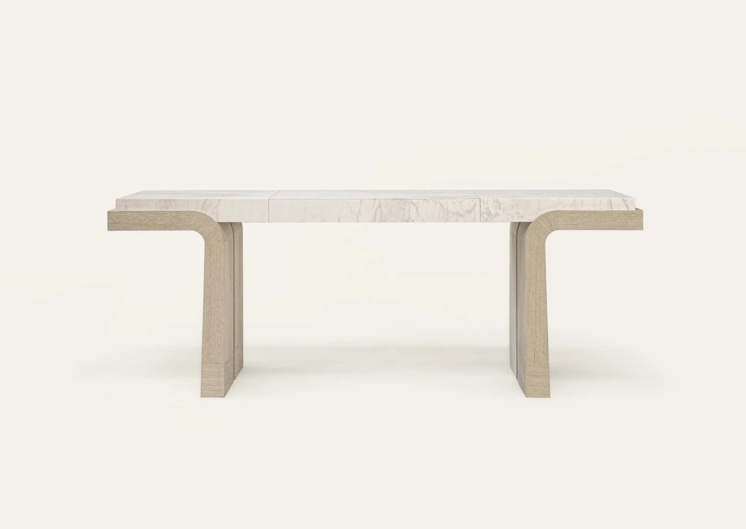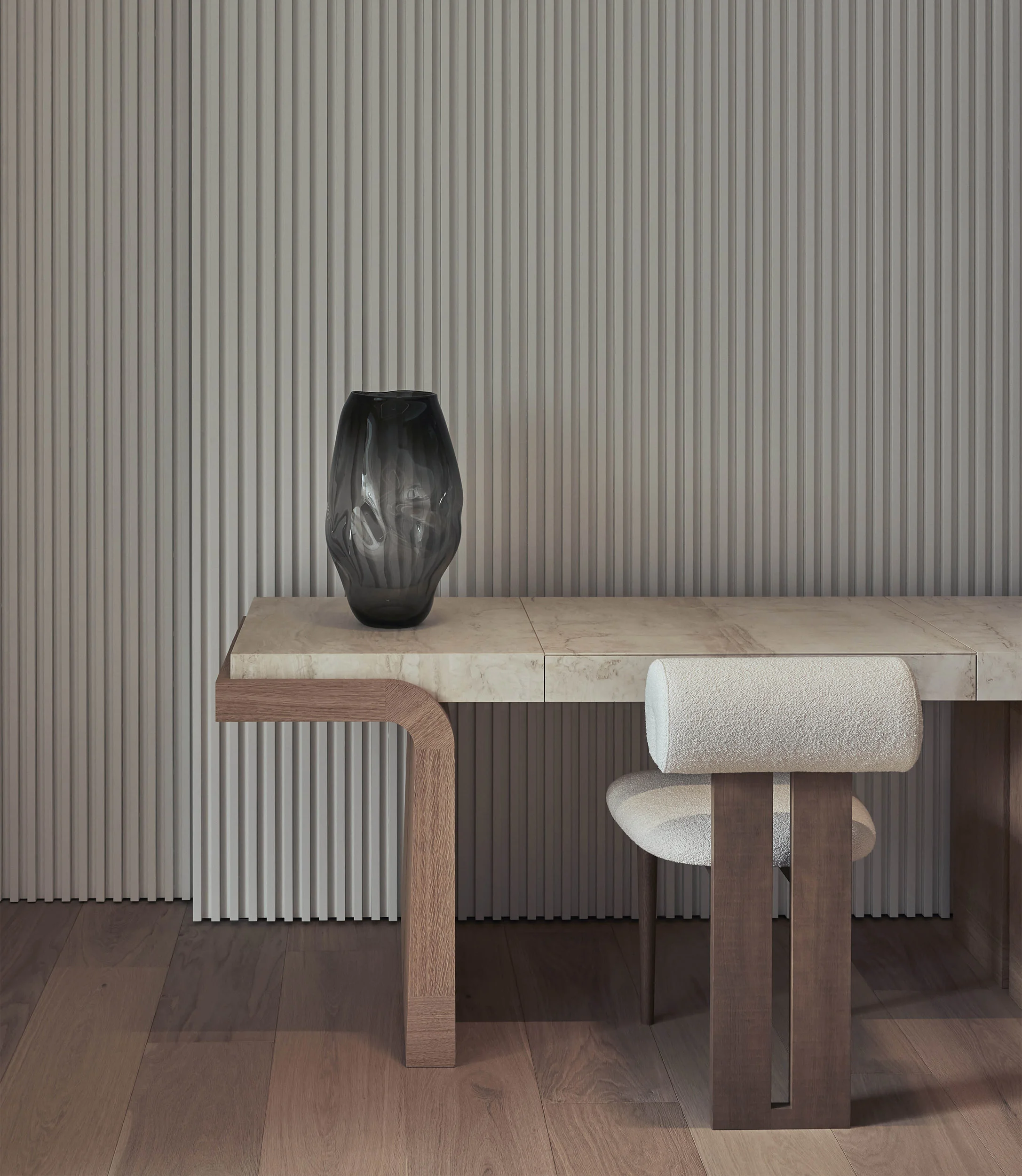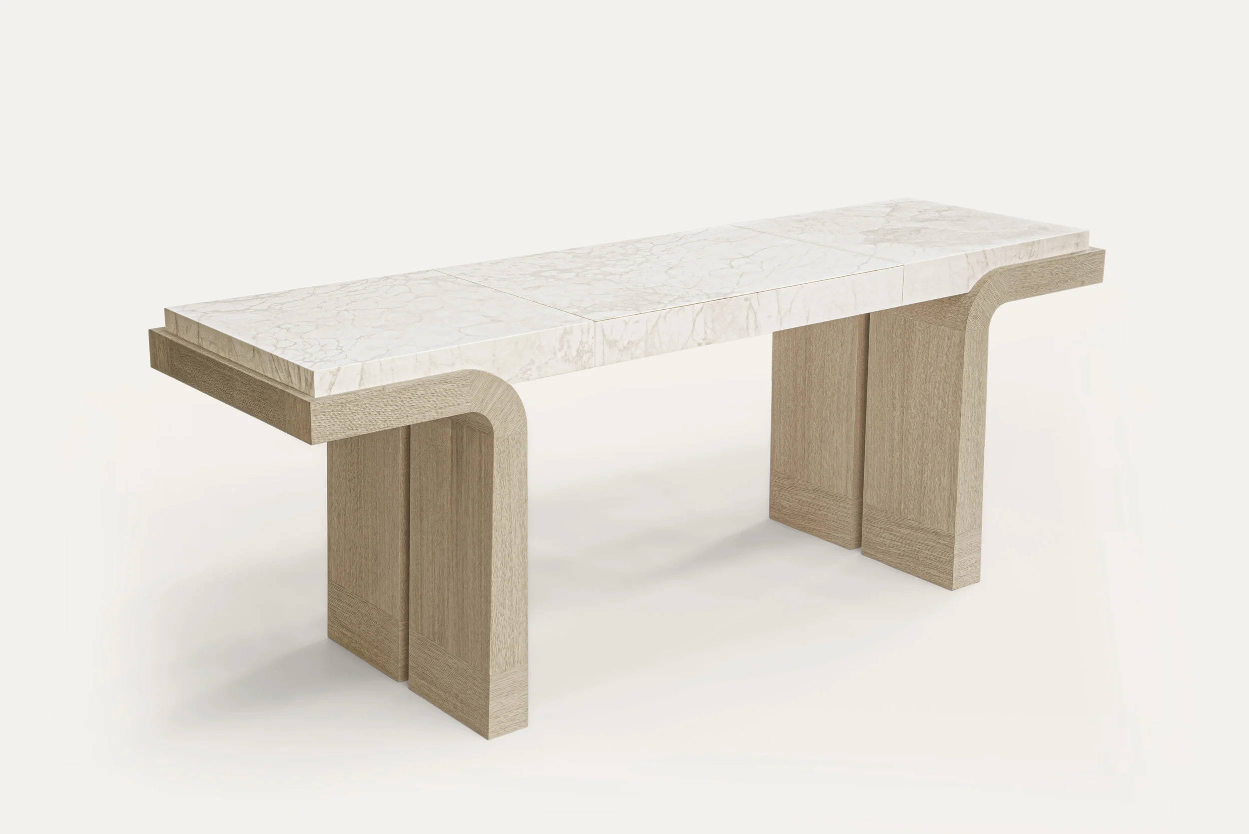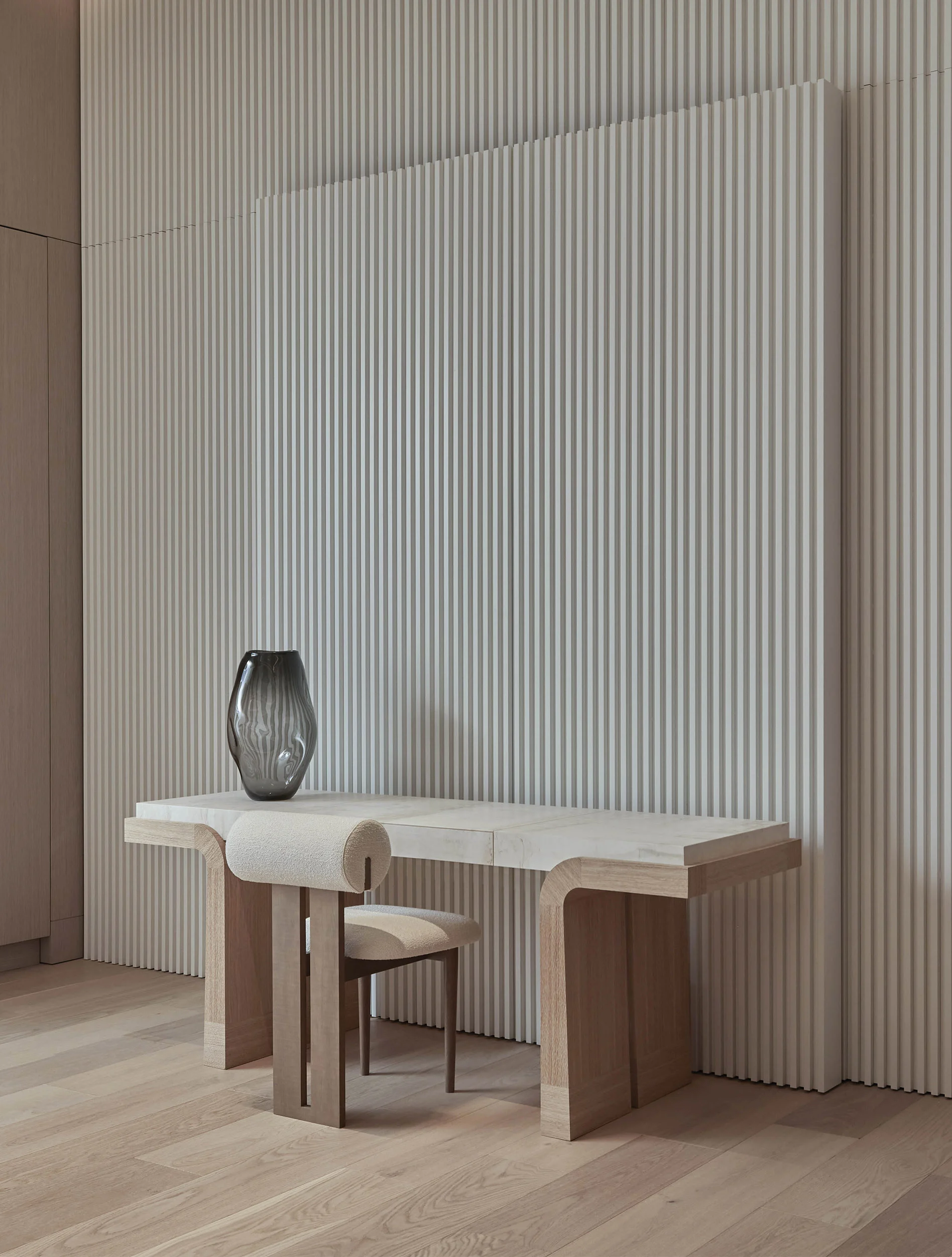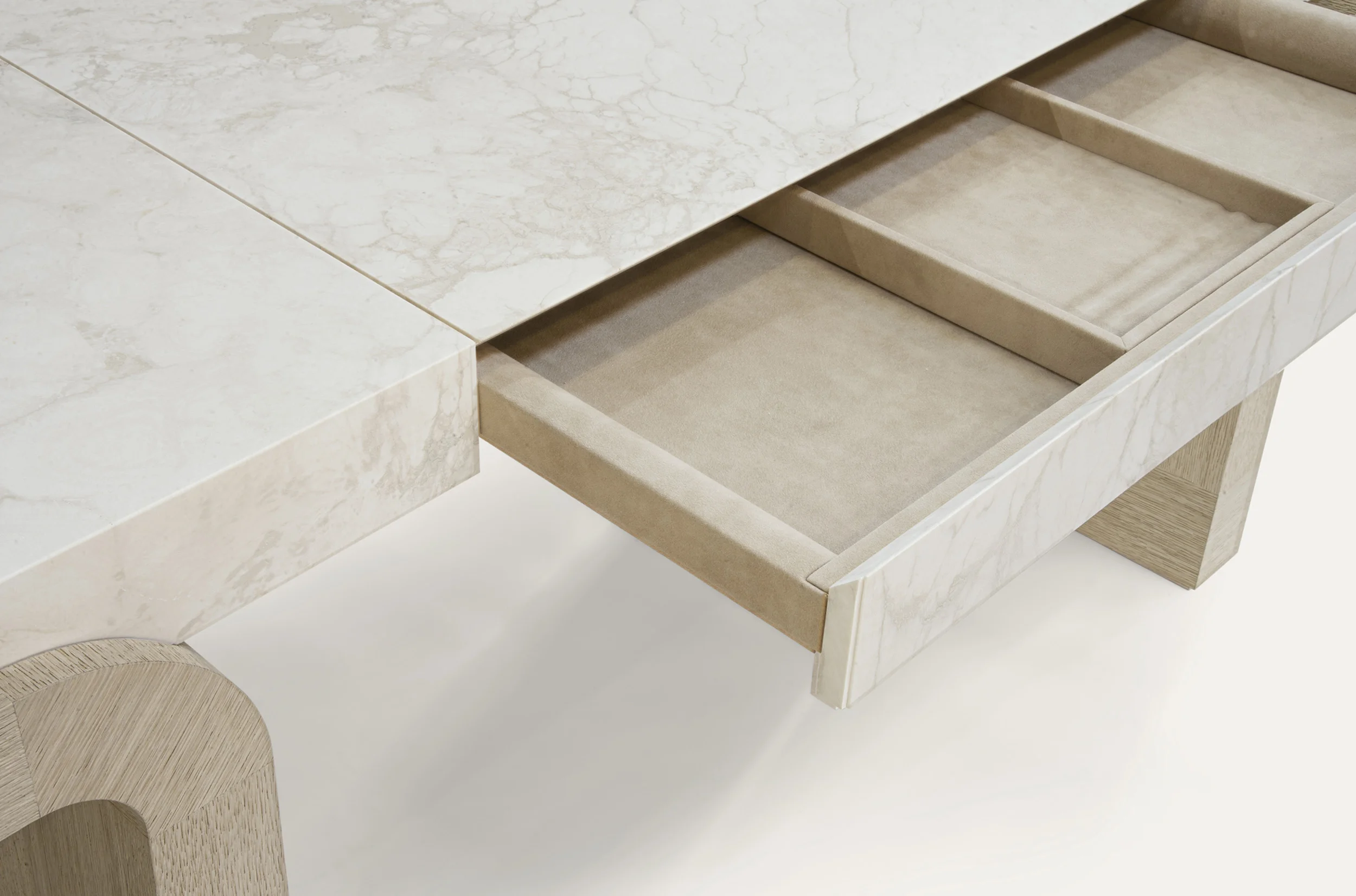 Handcrafted by master artisans, the collection features an array of fine noble materials like bronze, travertine, and oak, along with ultramodern accents and textiles