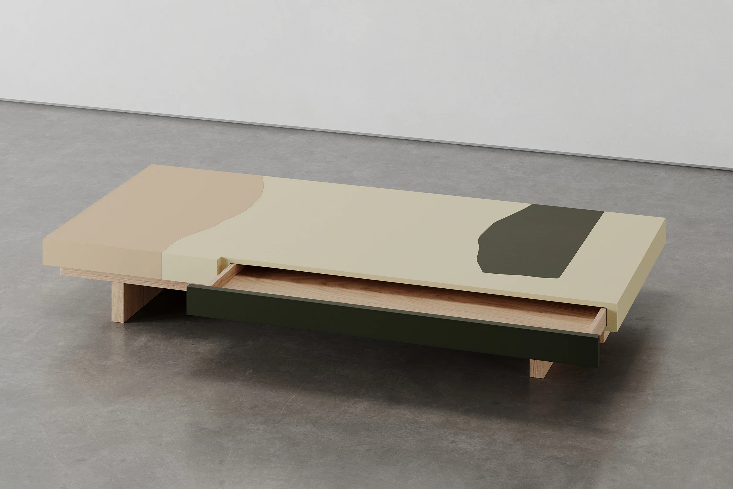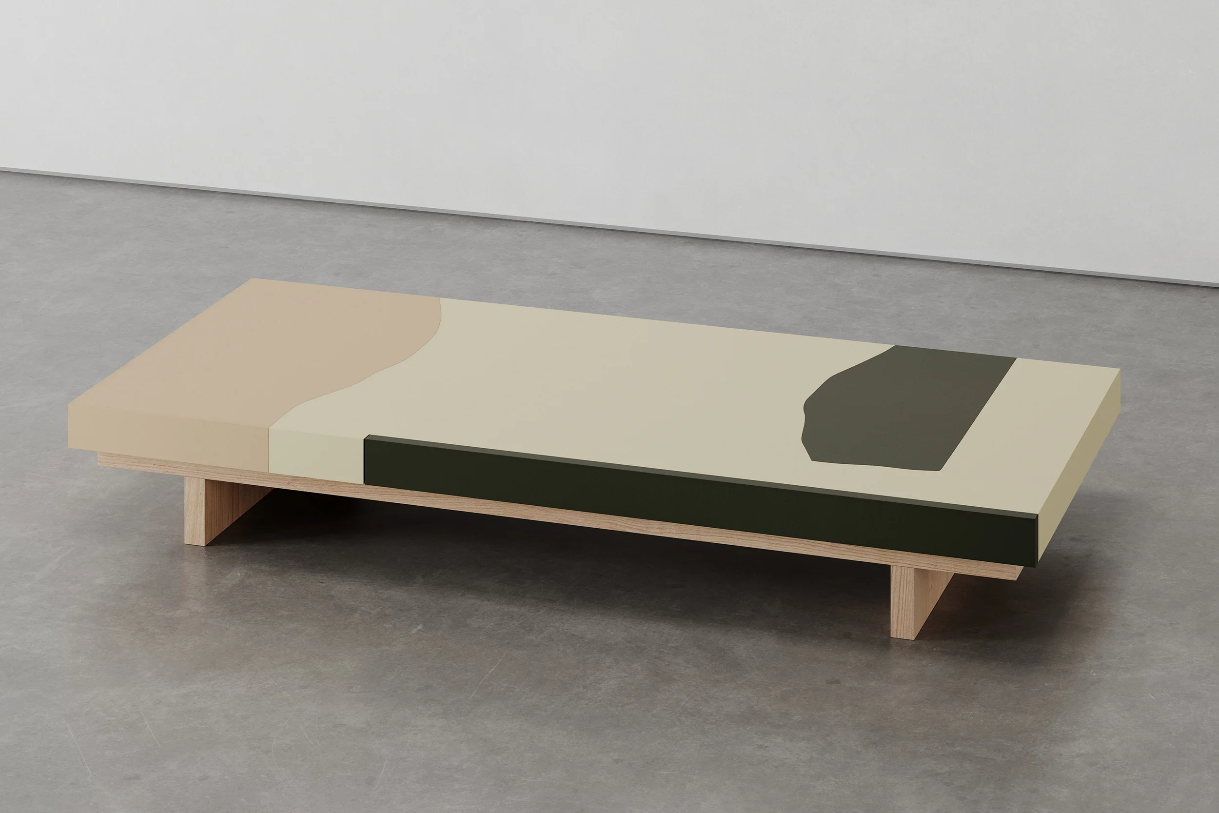 Each tabletop is conceived like an abstract painting laid horizontally. Organic, almost topographic forms meet and overlap, generating a quiet internal dialogue across the surface. These motifs are intentionally irregular, guided by gesture rather than symmetry. They retain the memory of the hand, the vitality of material, and the physicality of cutting, assembling, and layering, echoing the slow processes of painting and collage