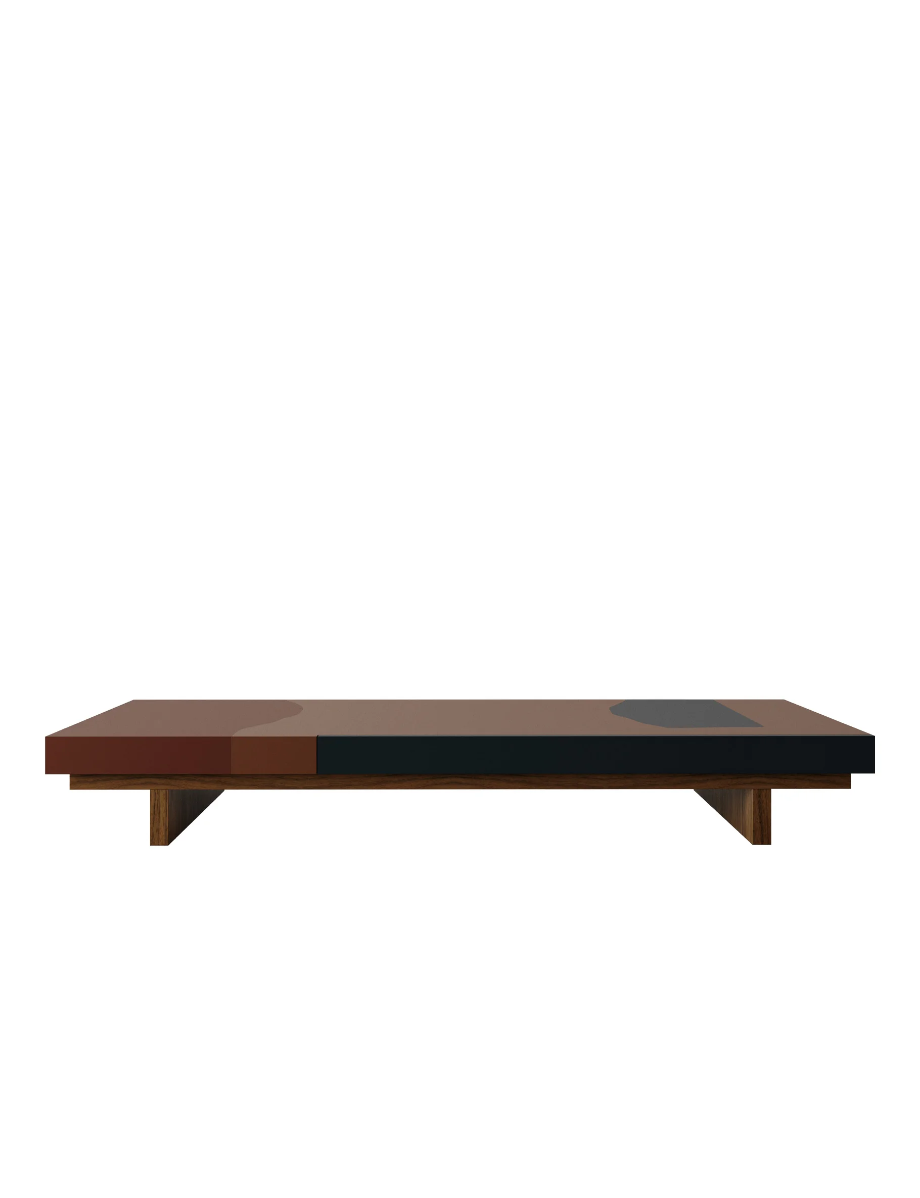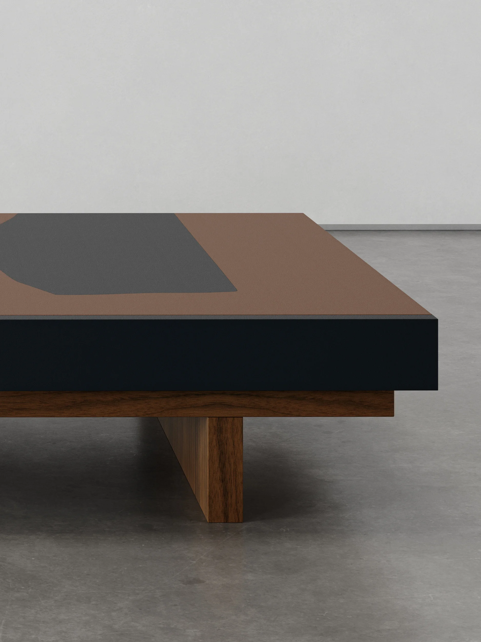 Each tabletop is conceived like an abstract painting laid horizontally. Organic, almost topographic forms meet and overlap, generating a quiet internal dialogue across the surface. These motifs are intentionally irregular, guided by gesture rather than symmetry. They retain the memory of the hand, the vitality of material, and the physicality of cutting, assembling, and layering, echoing the slow processes of painting and collage