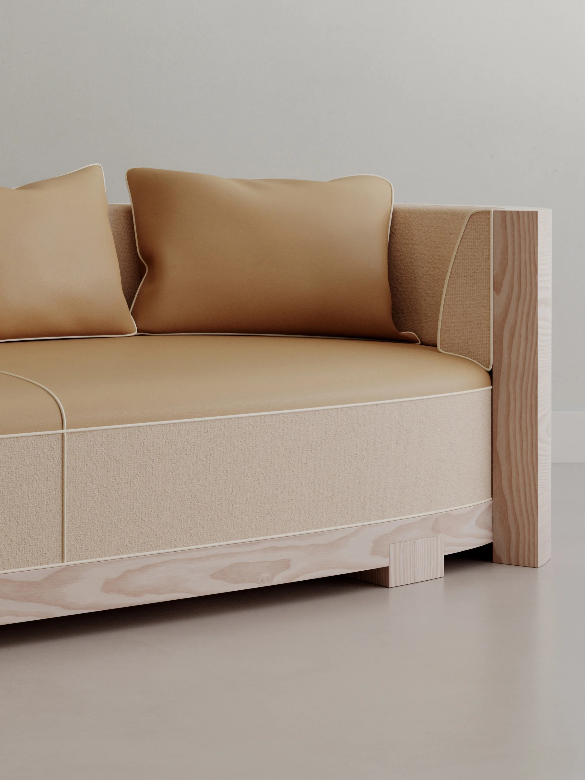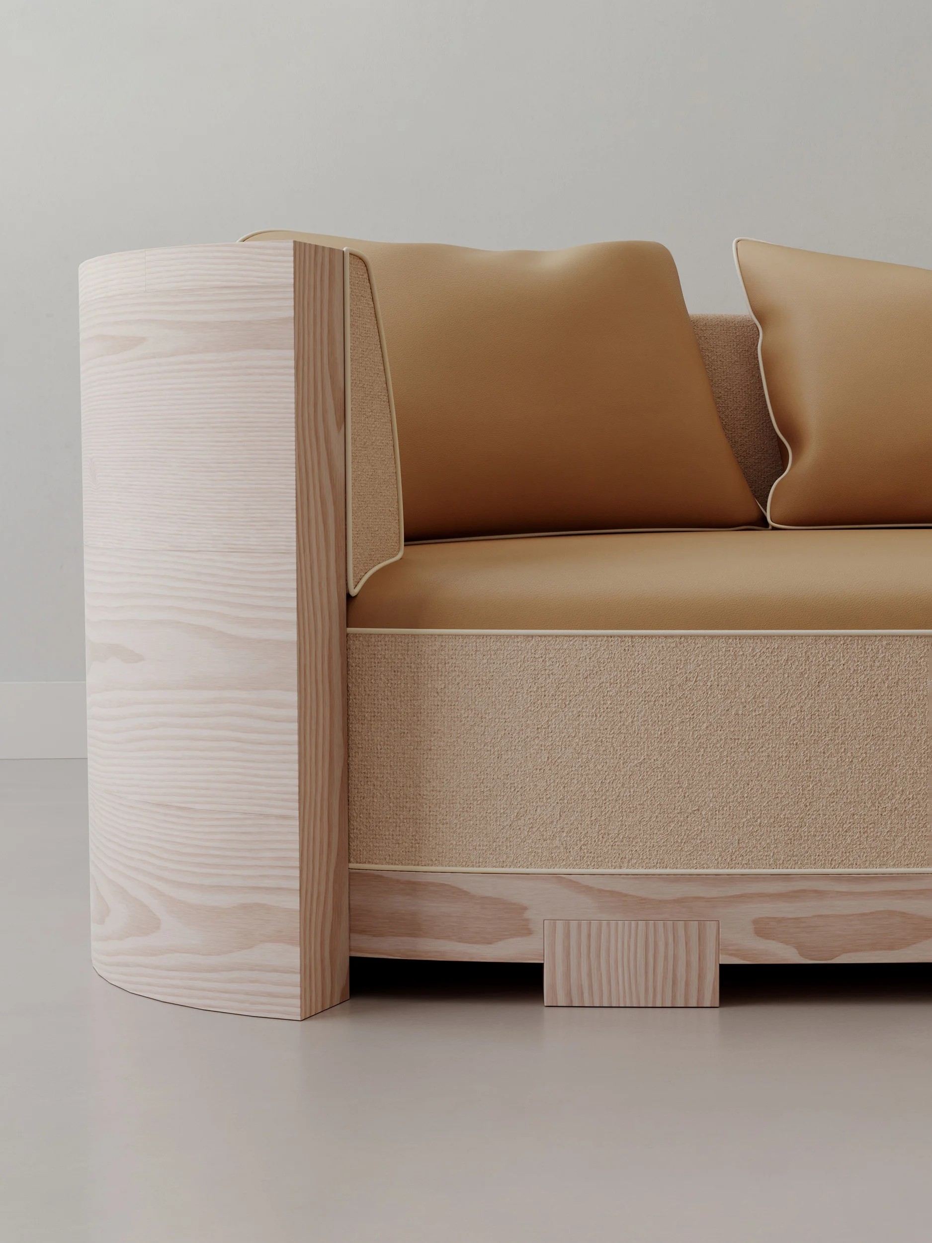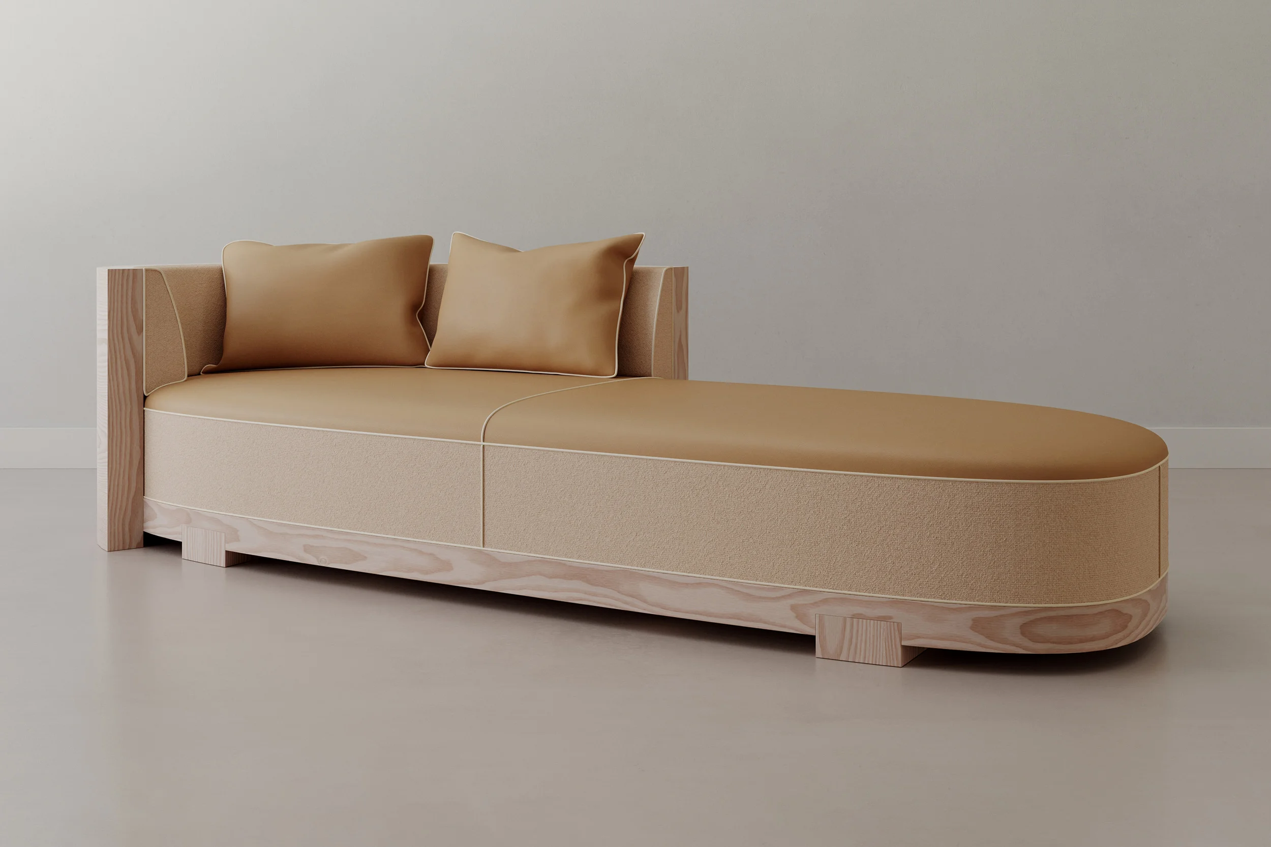 Natural Douglas wood asserts the structural logic of each piece, revealing the artisanal gesture through grain, curvature, and joinery. Seams and joints are intentionally left visible, not as technical necessities but as compositional elements. They function as a graphic signature, expressing how the object is made and standing as one of the defining aesthetic markers of Sattio Studio