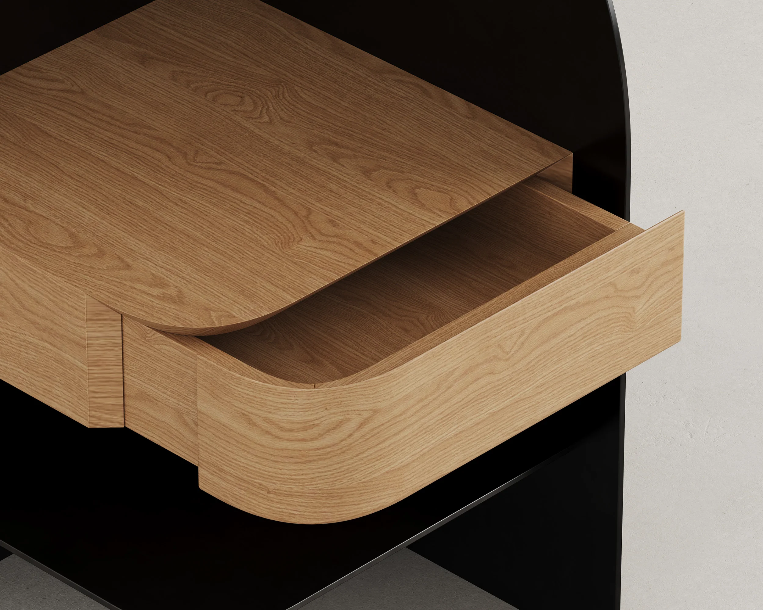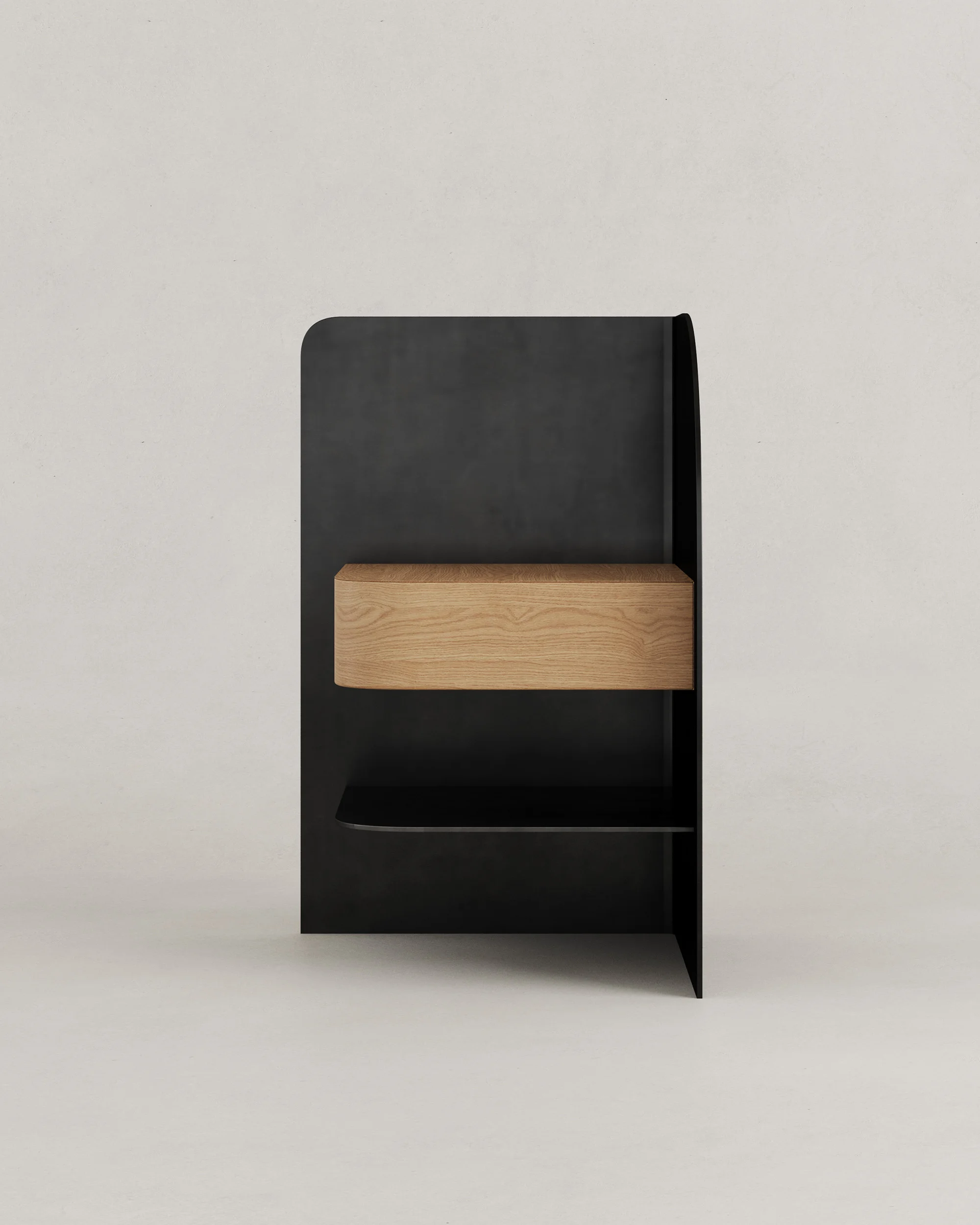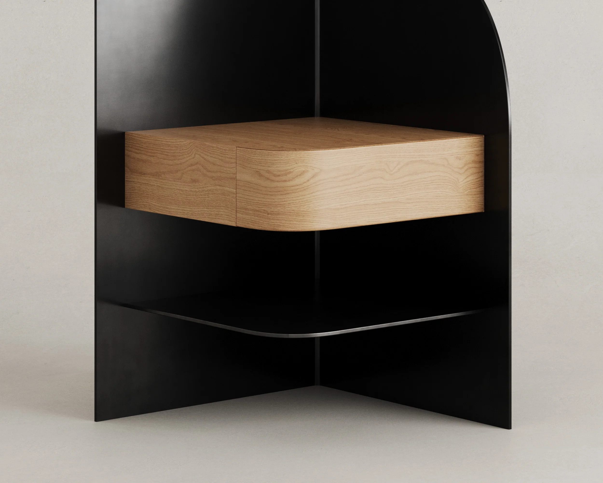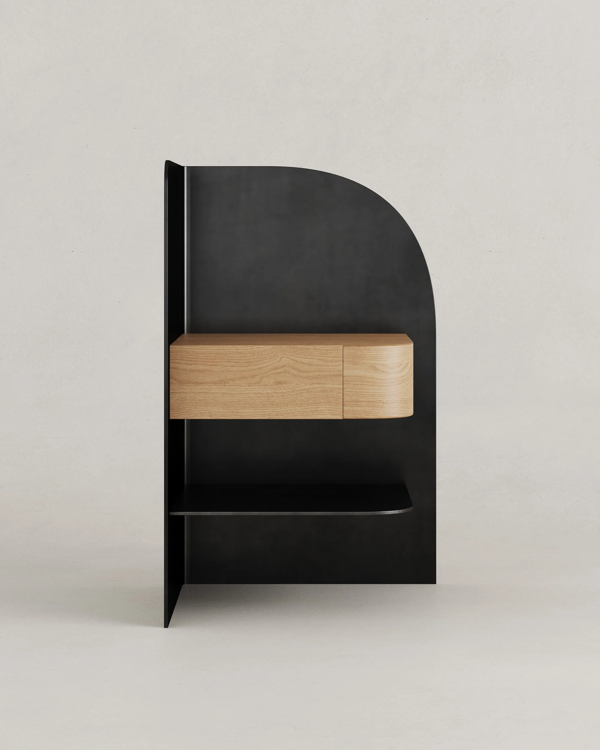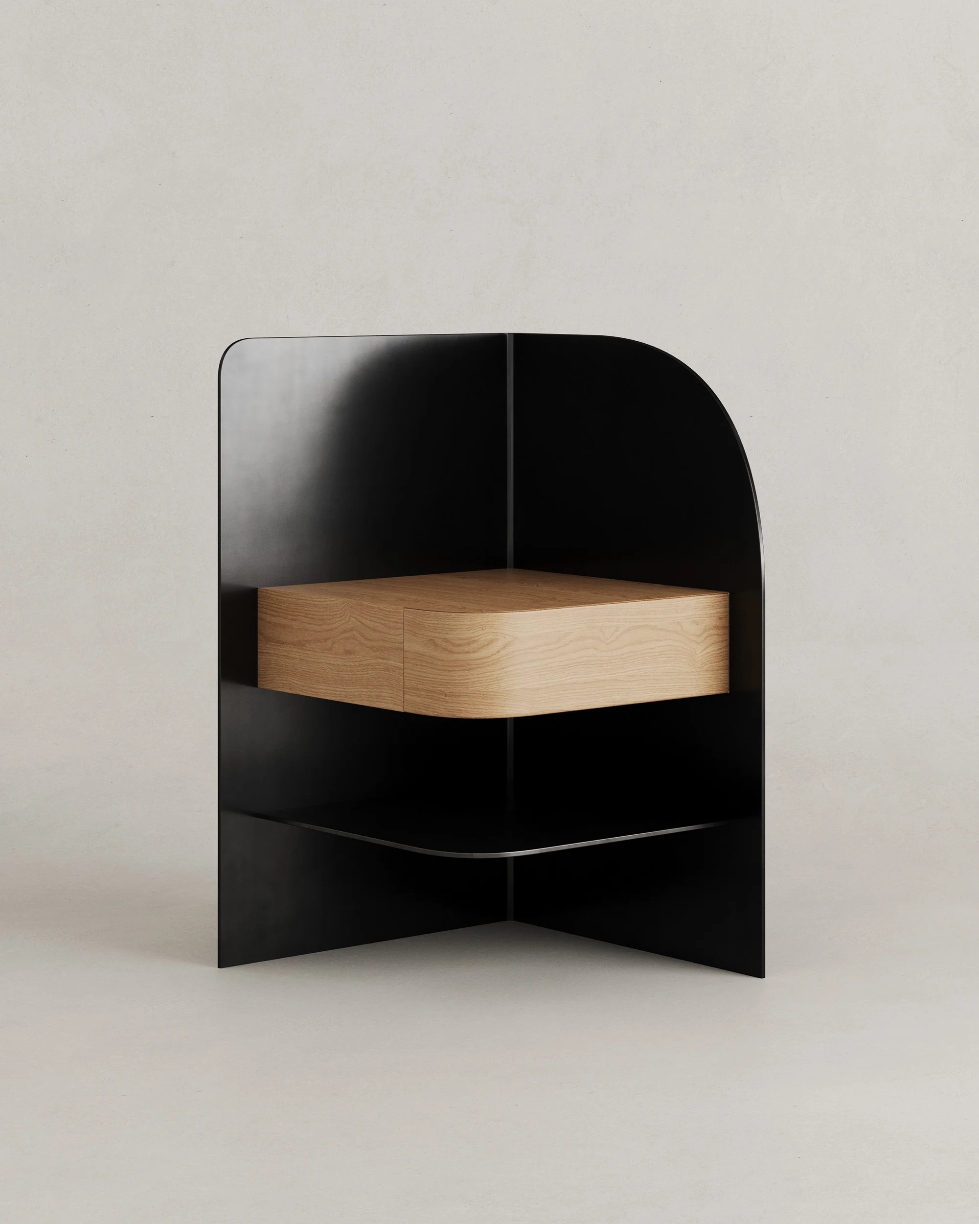 Named after the Slavic word for “corner” or “angle,” the UGOL series translates a single folded sheet of metal into a sculptural container for personal rituals. The austerity of the metal is softened by wooden elements, and in the illuminated version, by a diffused glow that transforms severity into intimacy. The resulting forms embody a tension between weight and lightness, sharpness and softness, material and immaterial. UGOL thus operates as both function and reflection, marking a liminal space between necessity and contemplation
