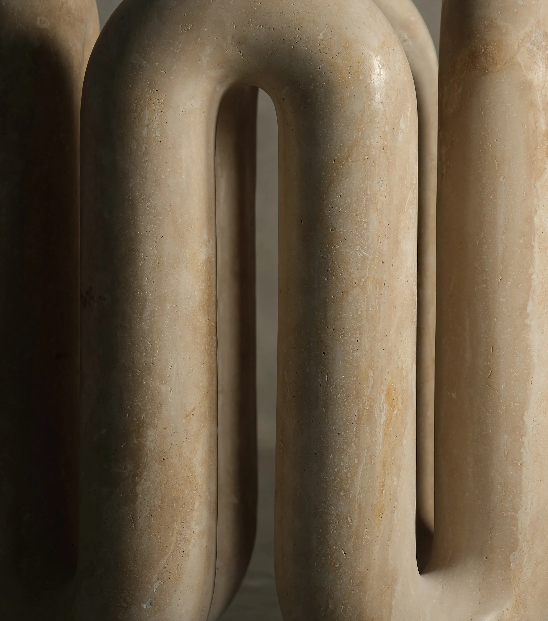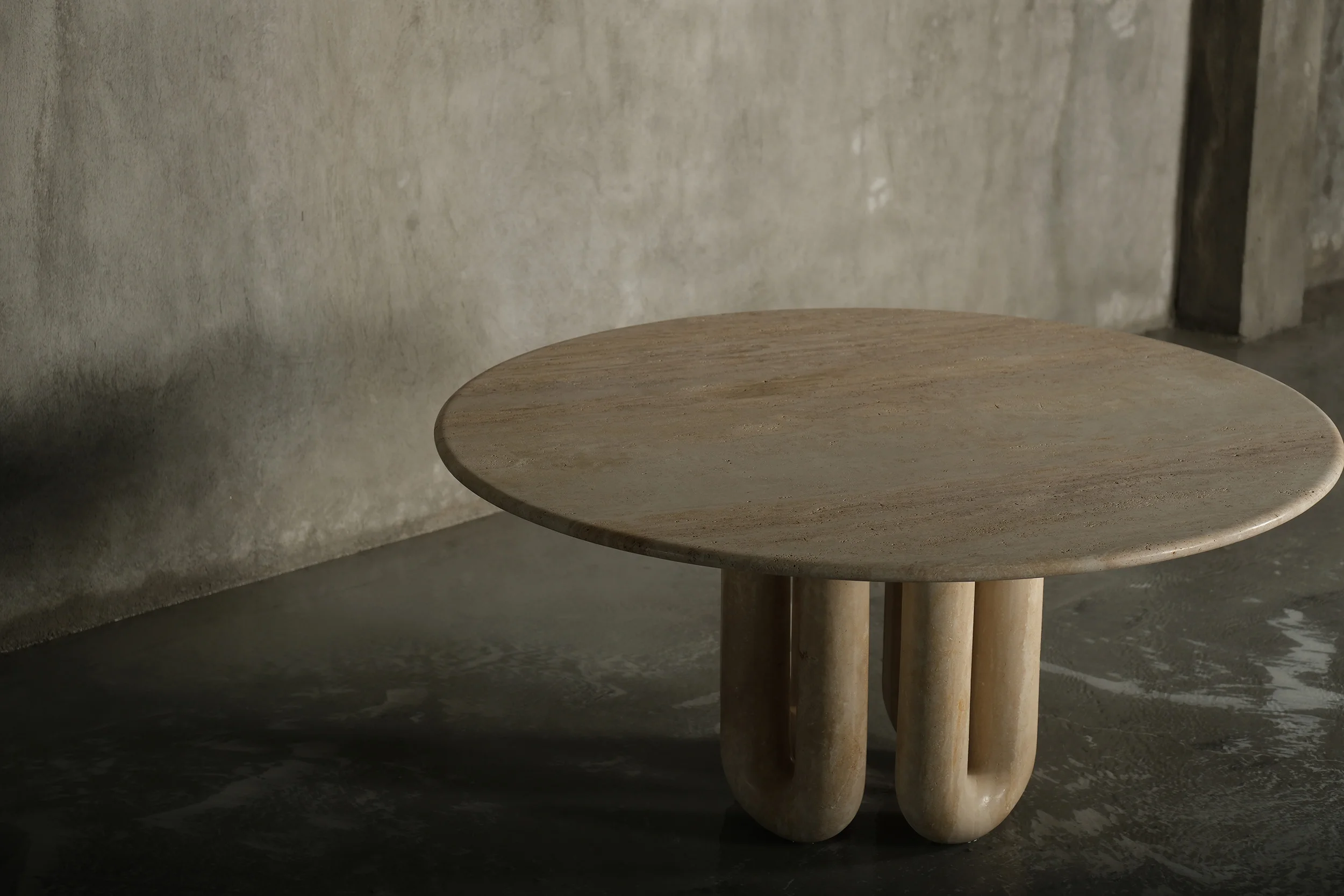 A bravura display of design ingenuity and excellence in stonemasonry, each universe table is crafted in turkey from travertine, the storied limestone synonymous with monumental design. The base and tabletop are each exquisitely carved and finished from a single piece of travertine that merge to create pieces that are absolutely timeless in their grace and majesty. Bold in vision and flawless in execution