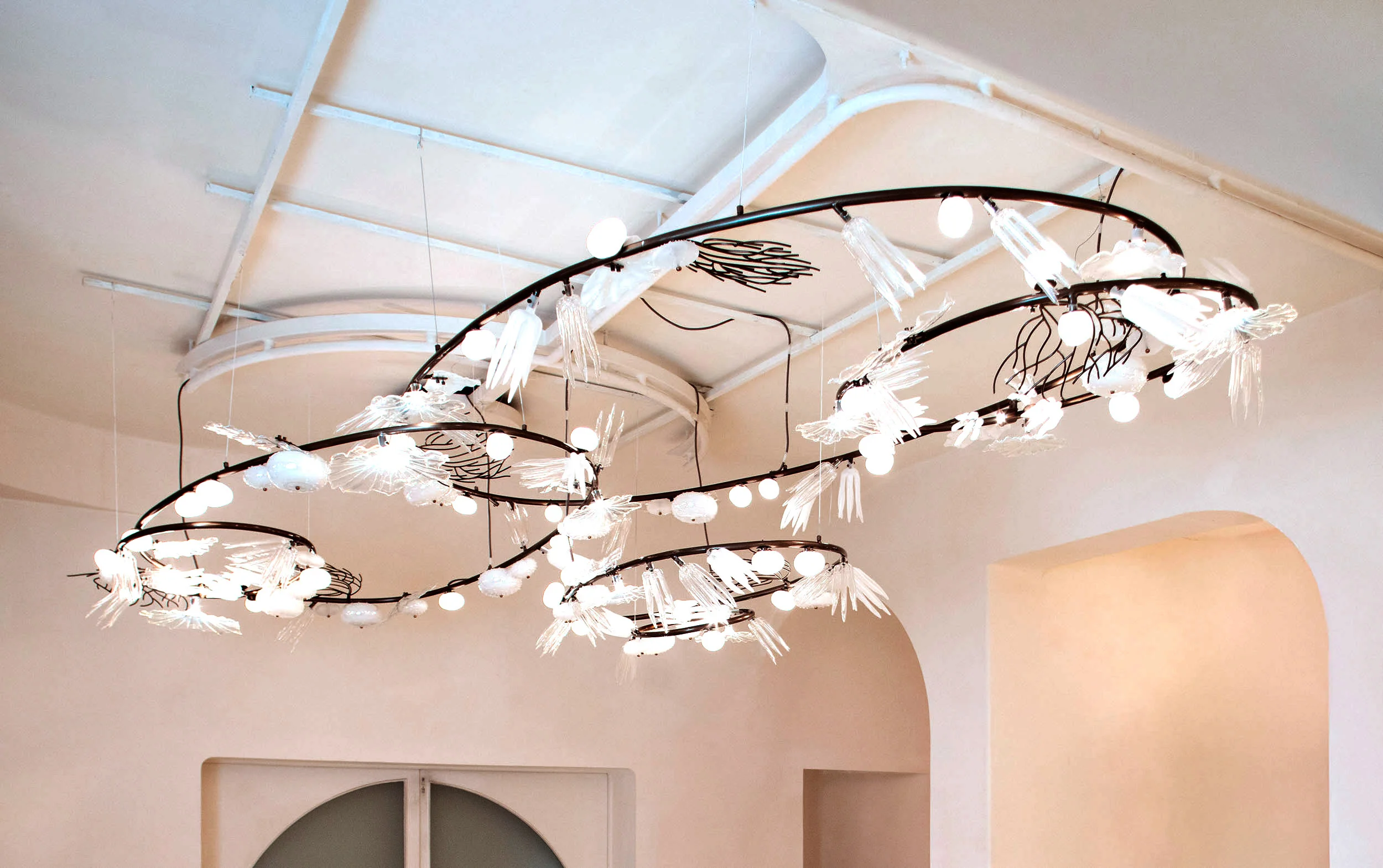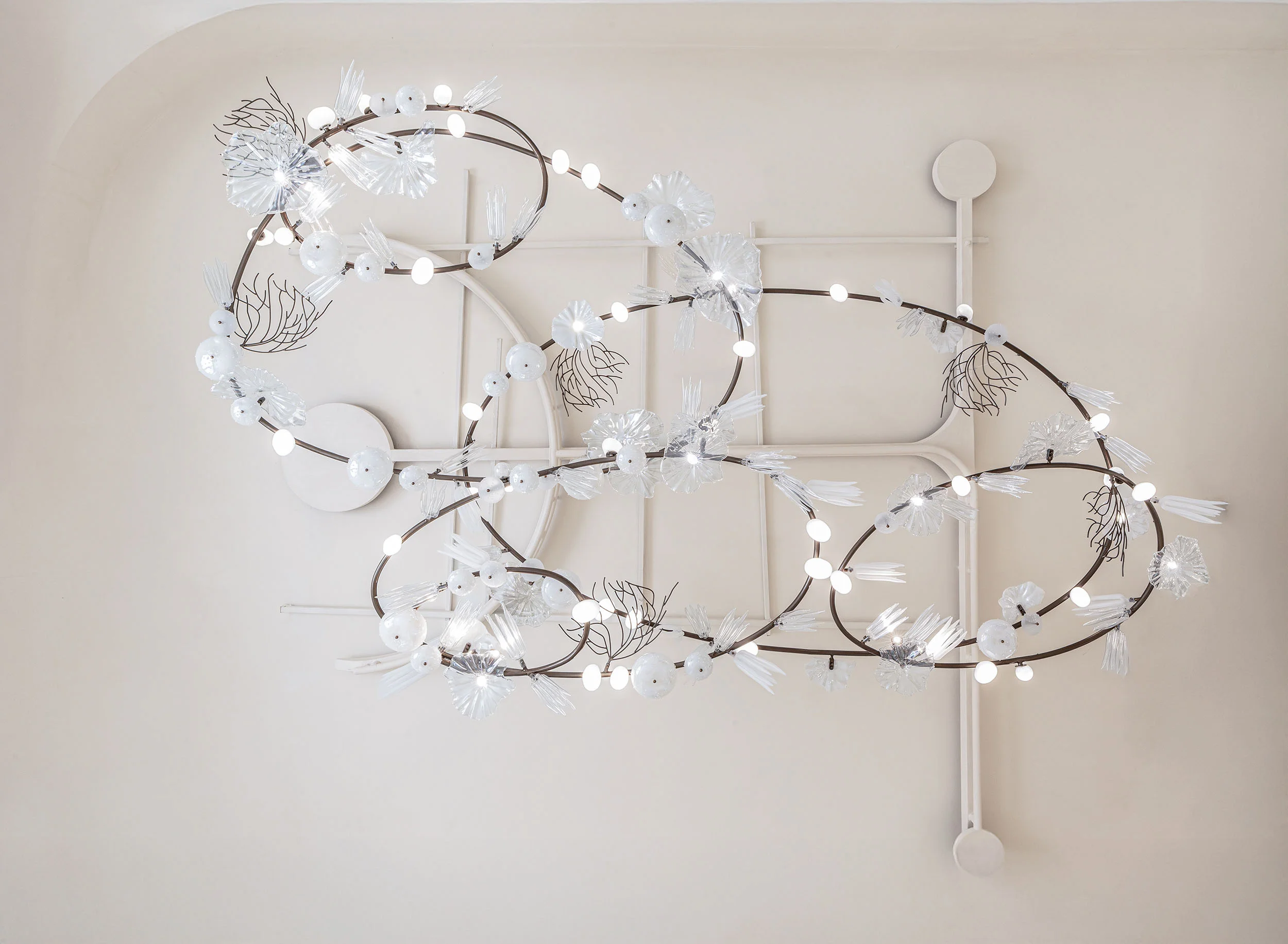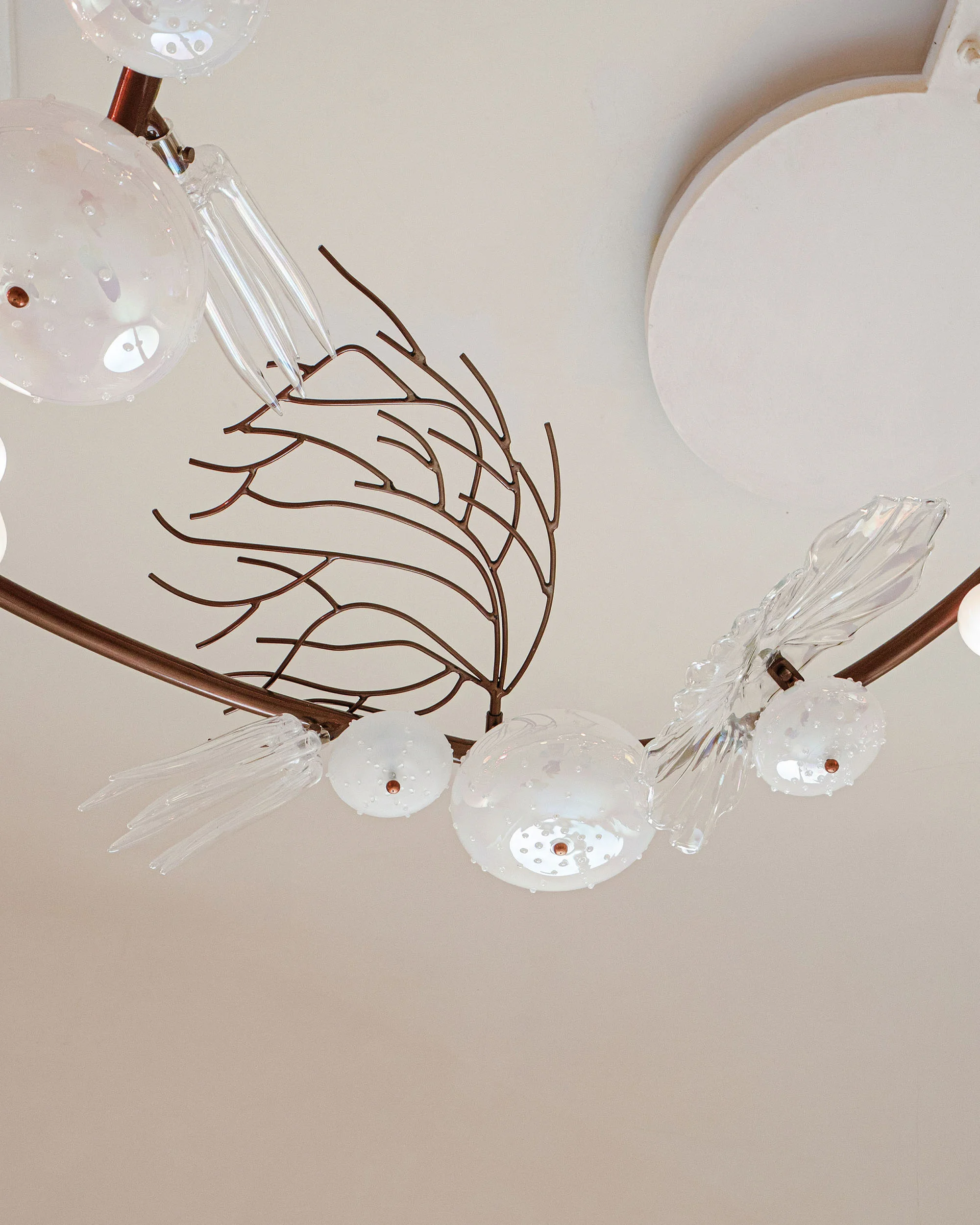 The cascading Aqua chandelier unfurls like a sea vine suspended in eternal drift, while the Aqua Mirror recalls coral forms weathered by time and tide. Together they conjure an atmosphere of suspended serenity—of standing beneath the surface, surrounded by glimmers that seem to breathe. Here, glass becomes water made still, a vessel of quiet movement and reflection