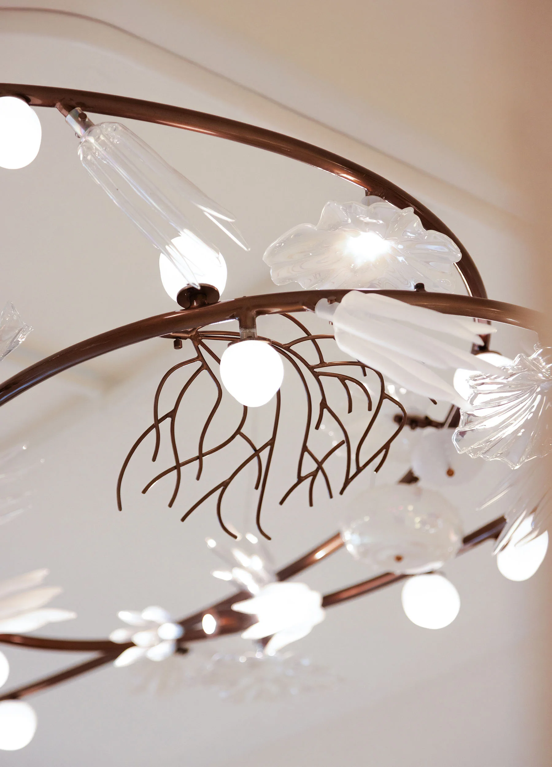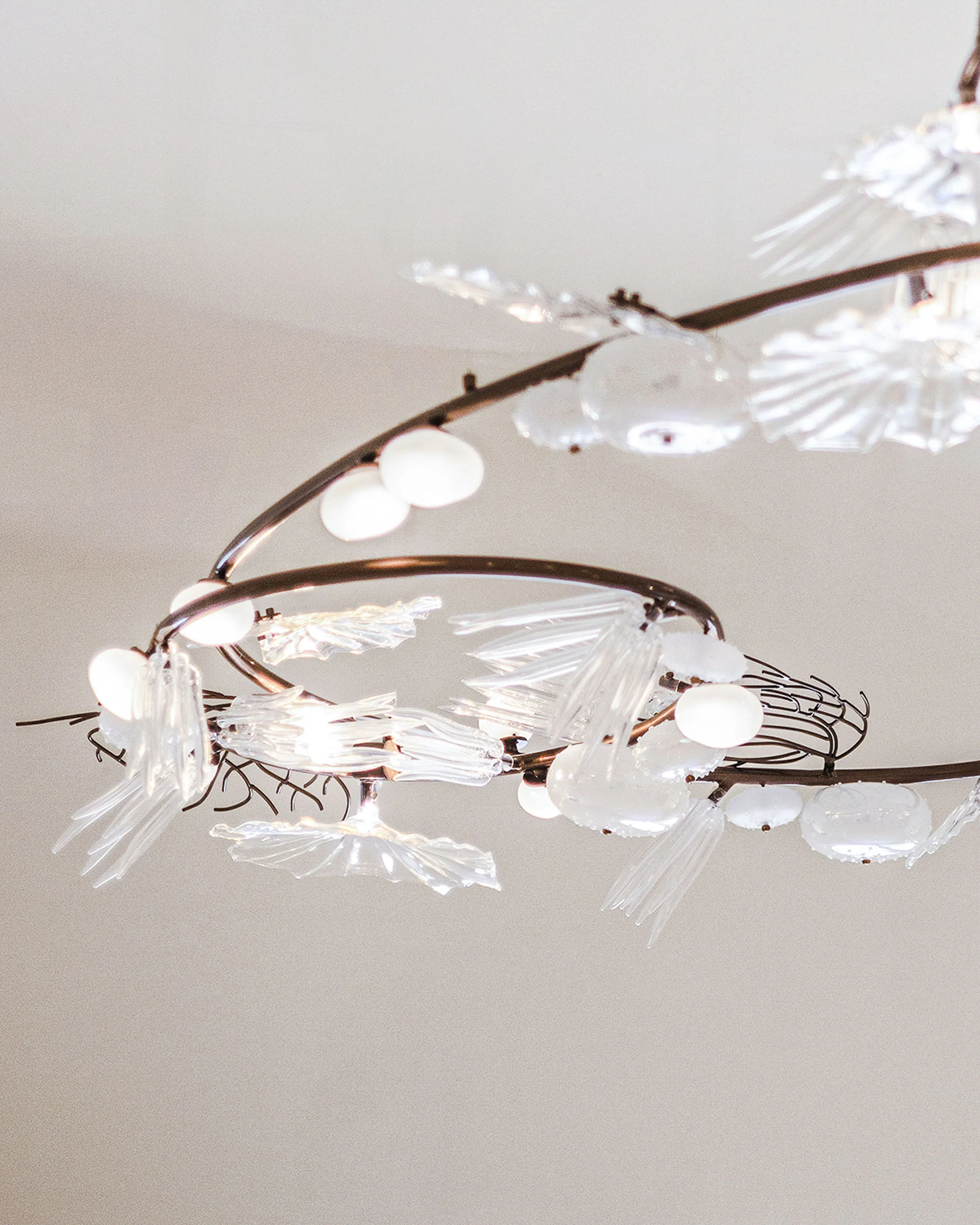 The cascading Aqua chandelier unfurls like a sea vine suspended in eternal drift, while the Aqua Mirror recalls coral forms weathered by time and tide. Together they conjure an atmosphere of suspended serenity—of standing beneath the surface, surrounded by glimmers that seem to breathe. Here, glass becomes water made still, a vessel of quiet movement and reflection