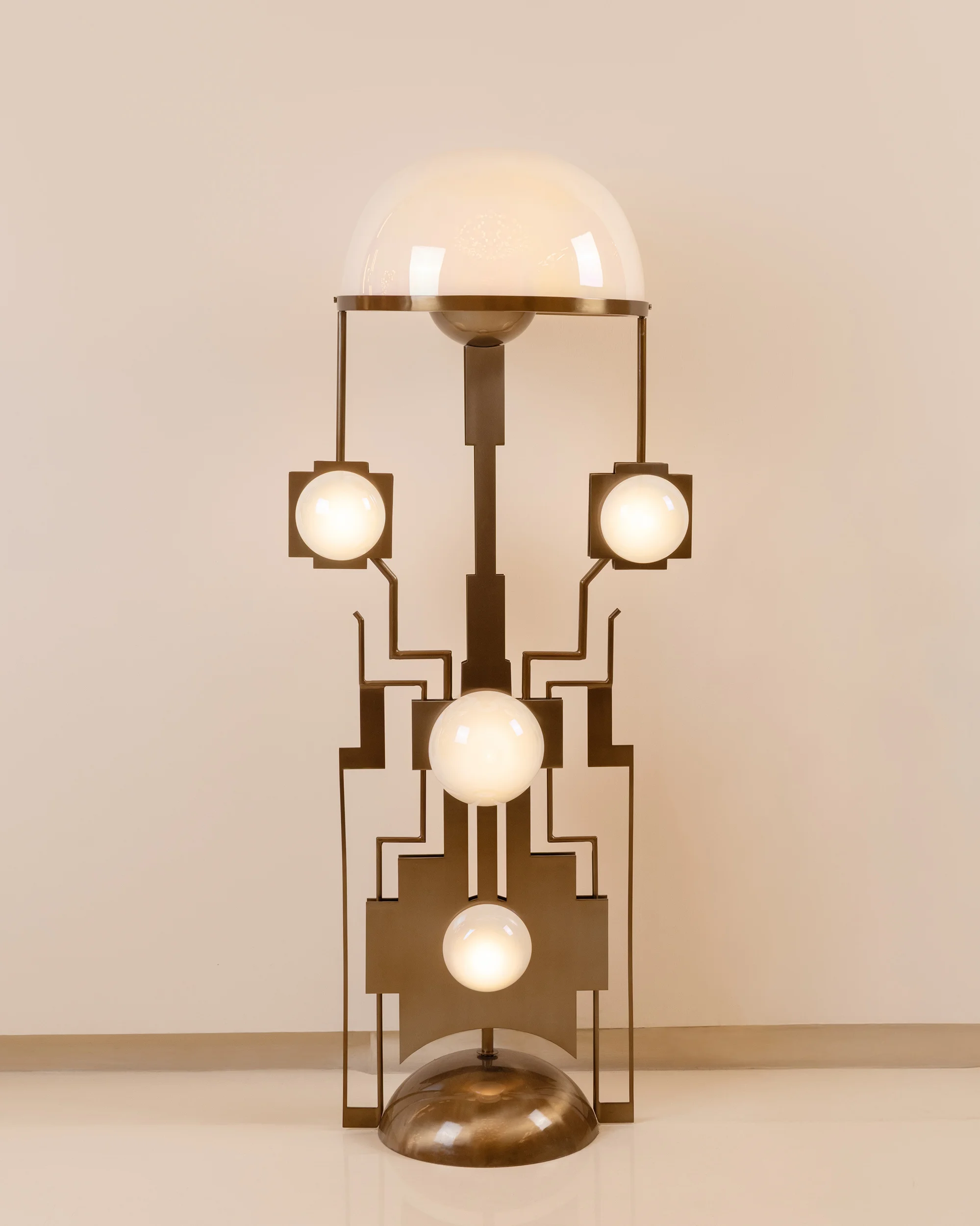 Antique brass and hand-blown glass form its visual language: polished planes and interlocking motifs shimmer with precision, softened by the gentle diffusion of light. Each work reflects the movement’s iconic vocabulary—its balance between structure and sensuality, its devotion to proportion, and its fascination with modernity—while infusing it with a contemporary sensibility with interlocking planes and bold linearity reminiscent of Cubist abstraction