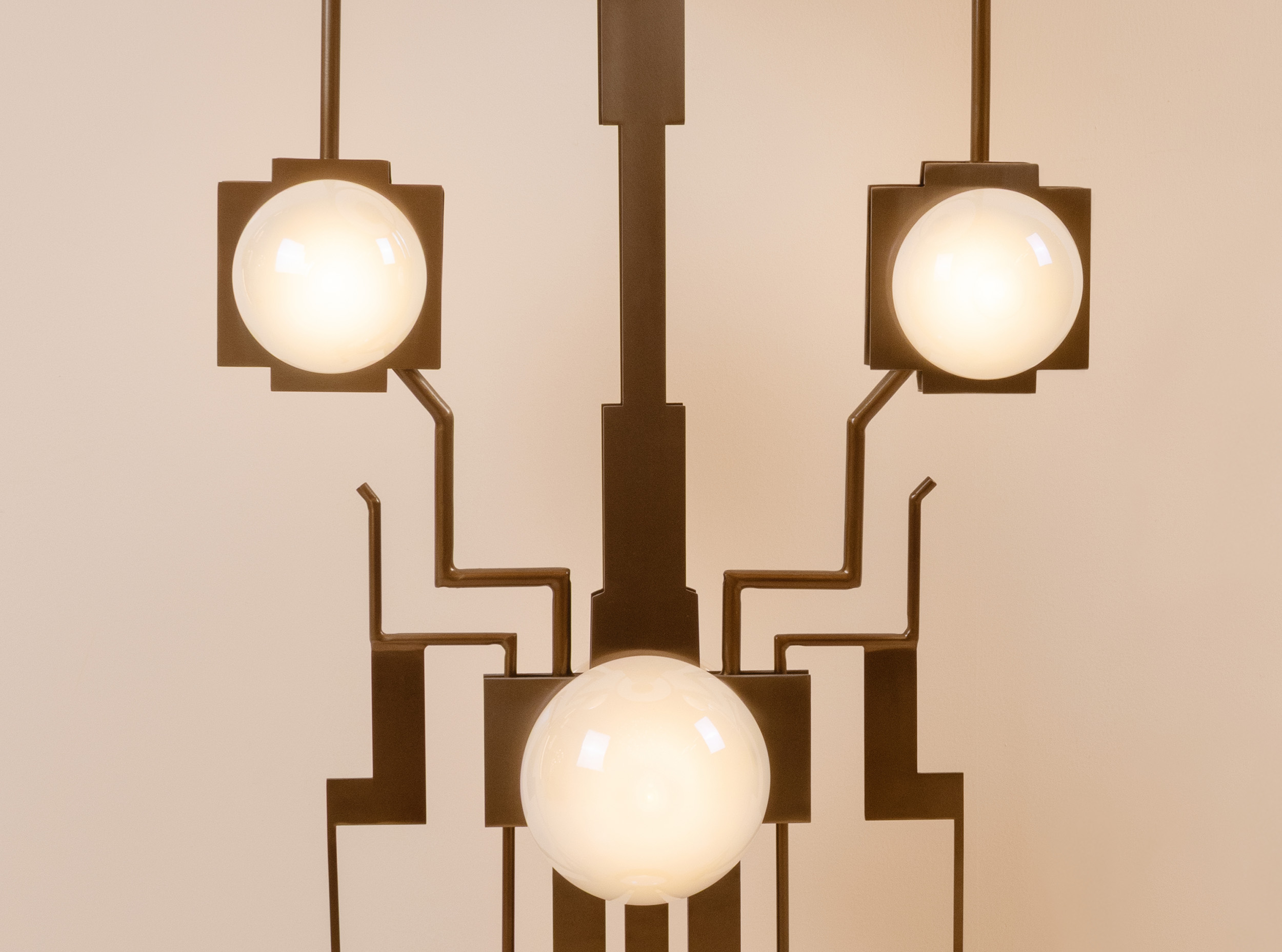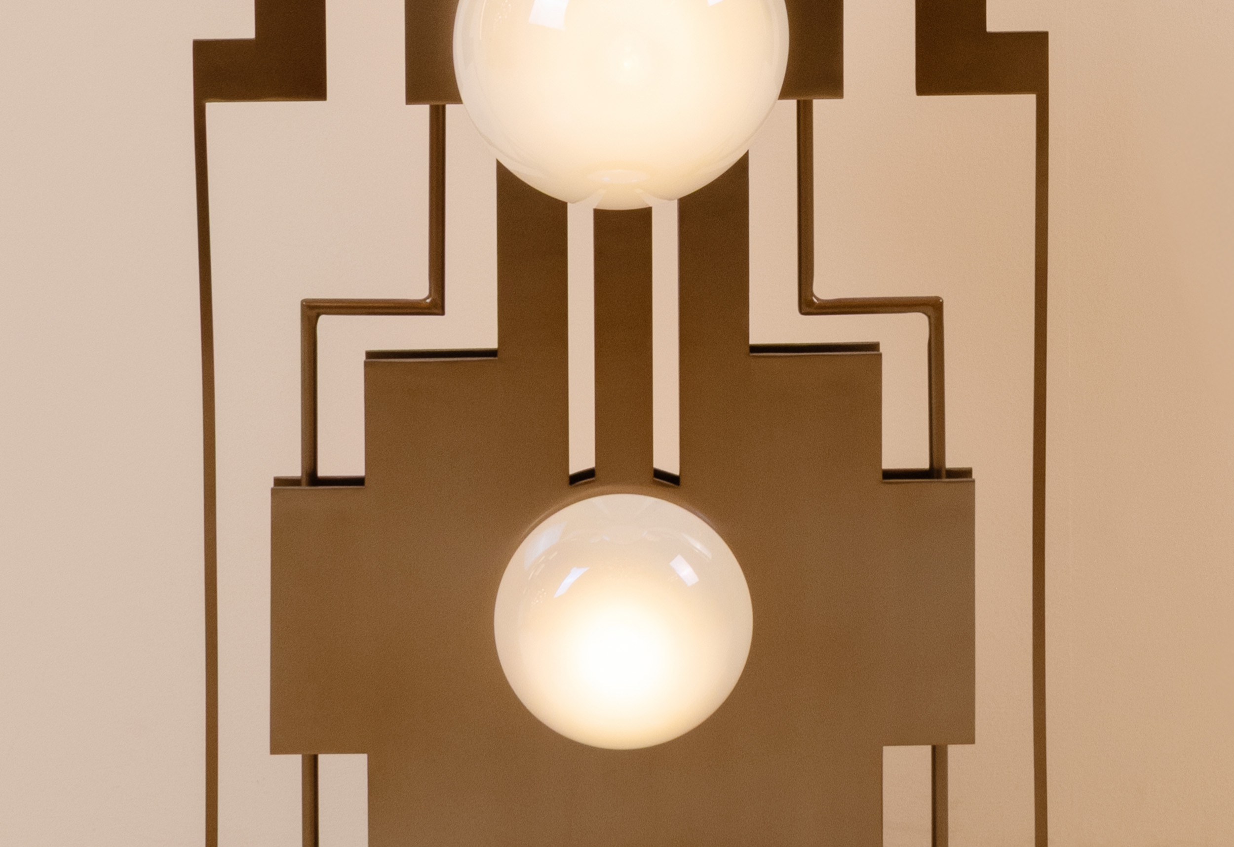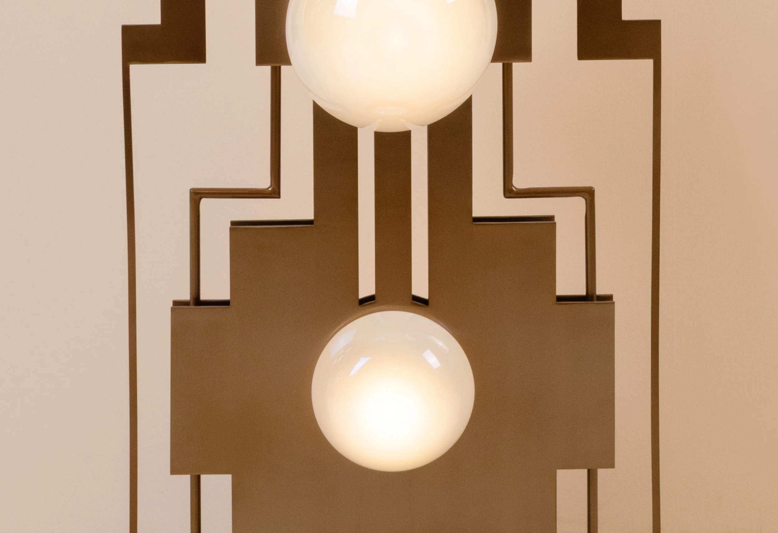 Antique brass and hand-blown glass form its visual language: polished planes and interlocking motifs shimmer with precision, softened by the gentle diffusion of light. Each work reflects the movement’s iconic vocabulary—its balance between structure and sensuality, its devotion to proportion, and its fascination with modernity—while infusing it with a contemporary sensibility with interlocking planes and bold linearity reminiscent of Cubist abstraction