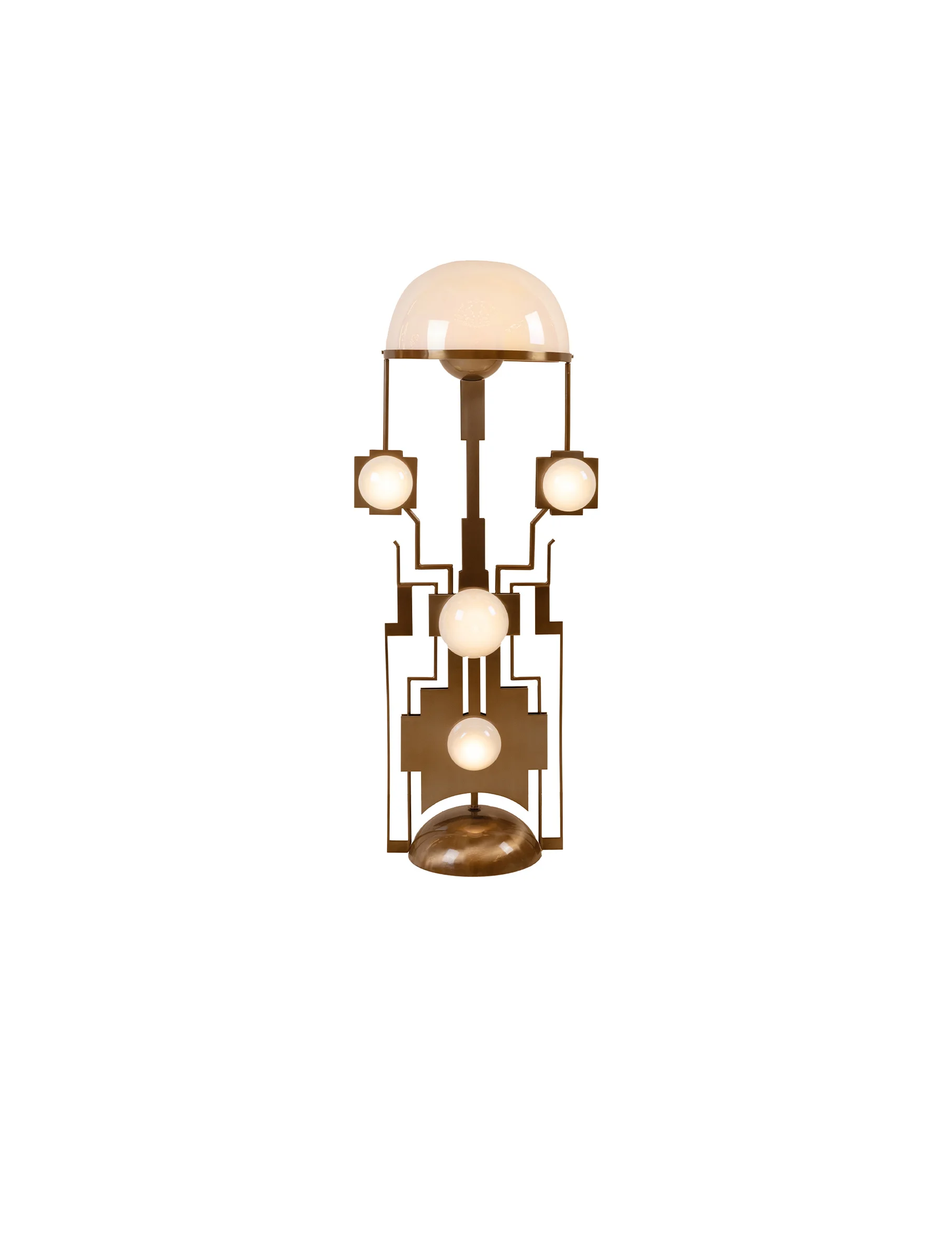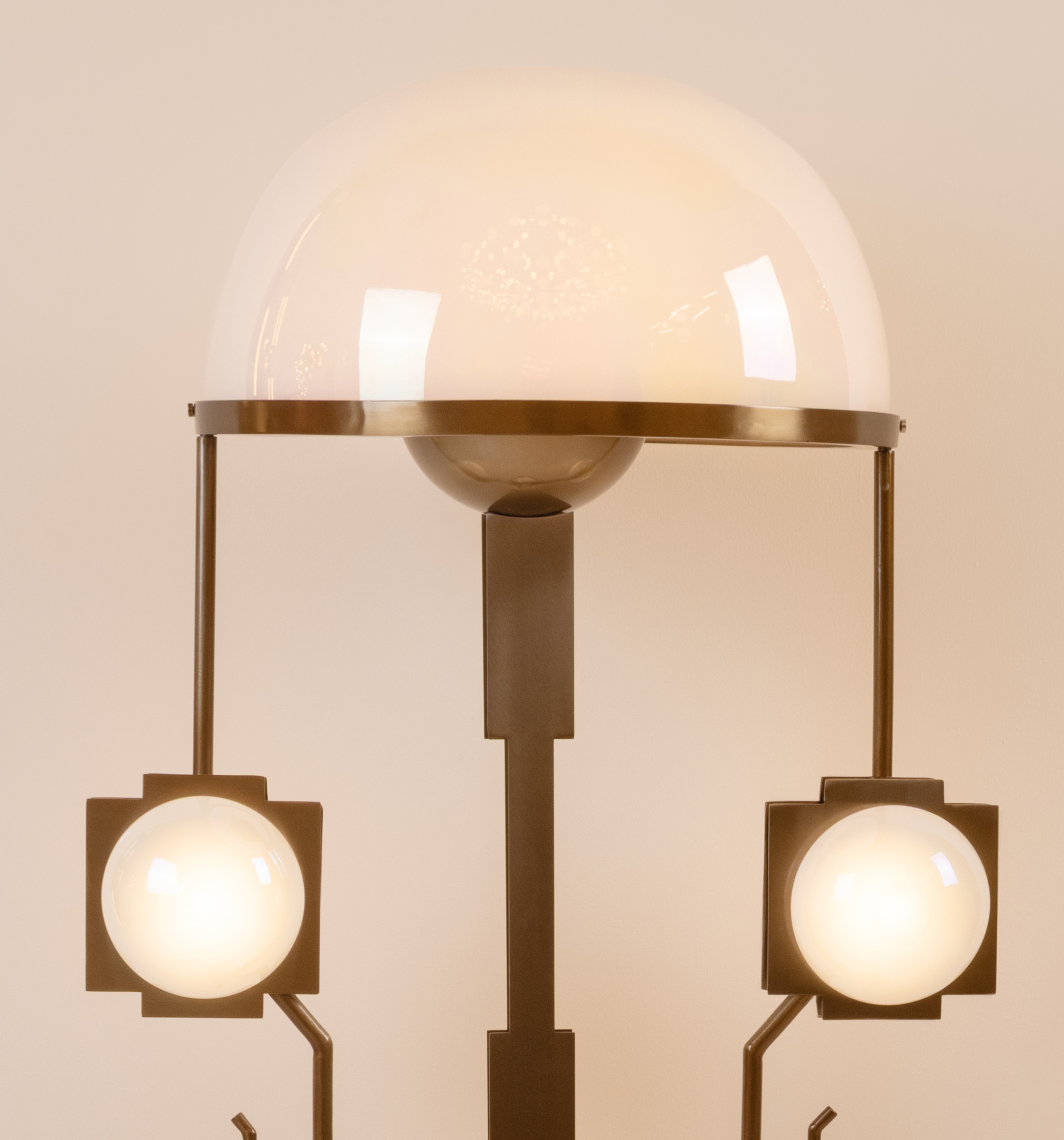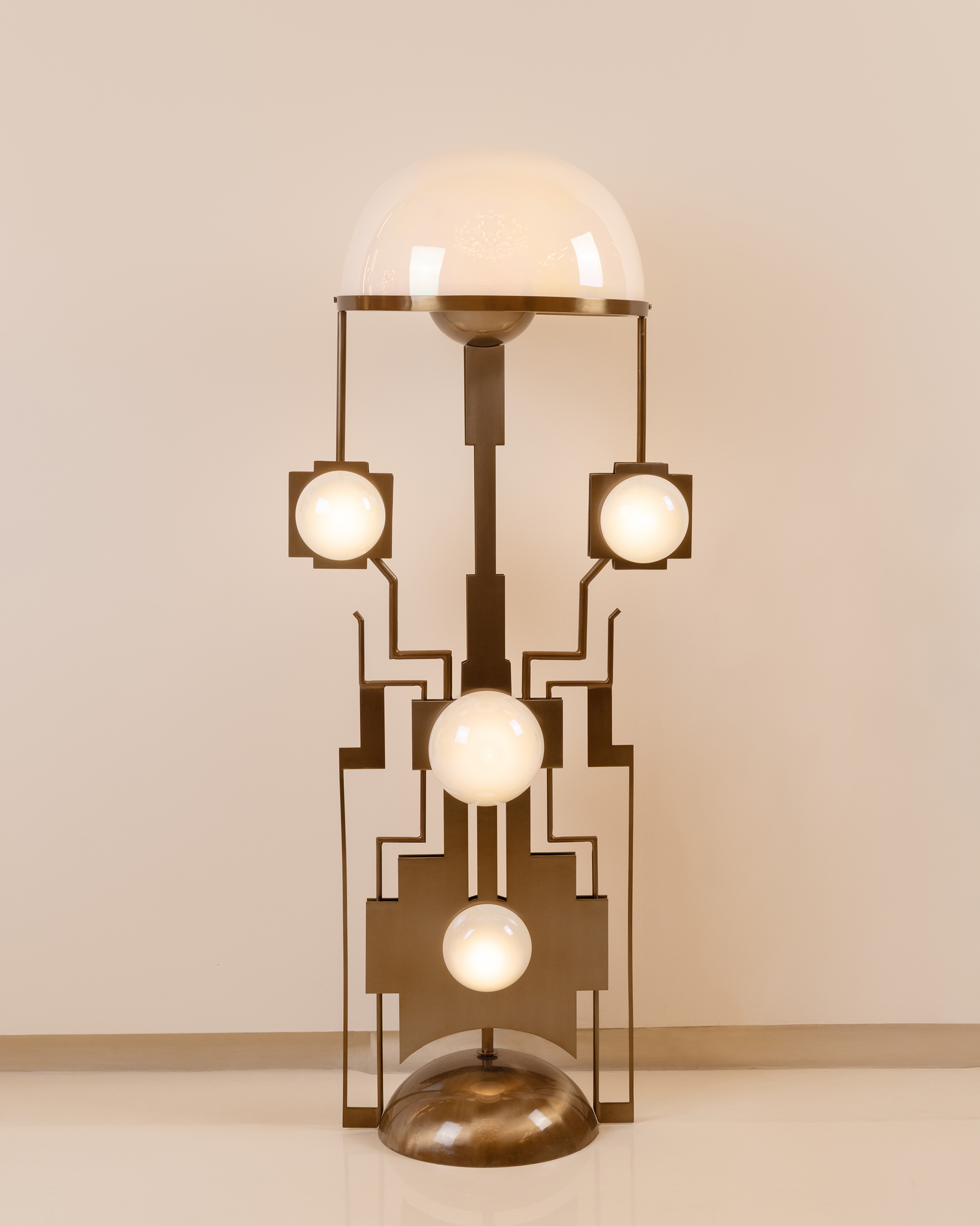 Antique brass and hand-blown glass form its visual language: polished planes and interlocking motifs shimmer with precision, softened by the gentle diffusion of light. Each work reflects the movement’s iconic vocabulary—its balance between structure and sensuality, its devotion to proportion, and its fascination with modernity—while infusing it with a contemporary sensibility with interlocking planes and bold linearity reminiscent of Cubist abstraction