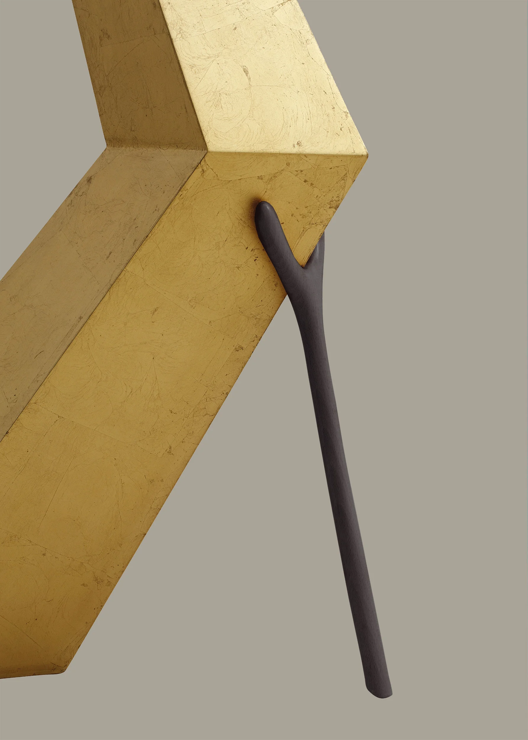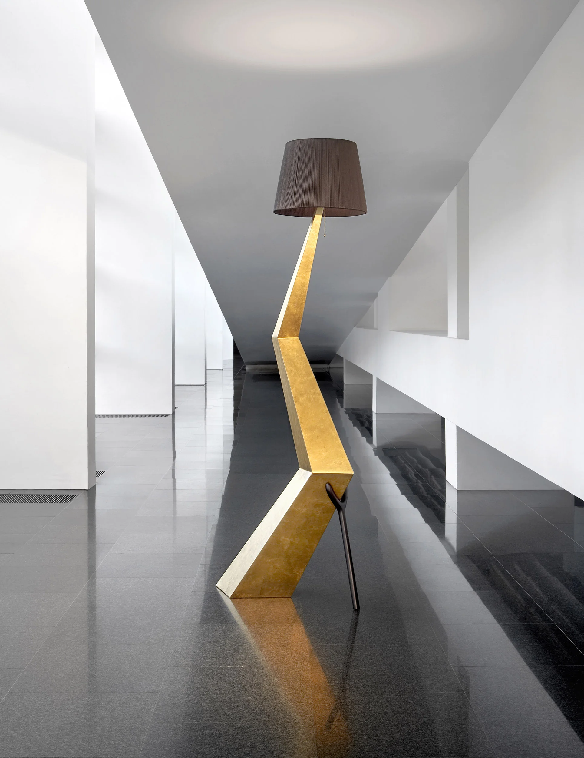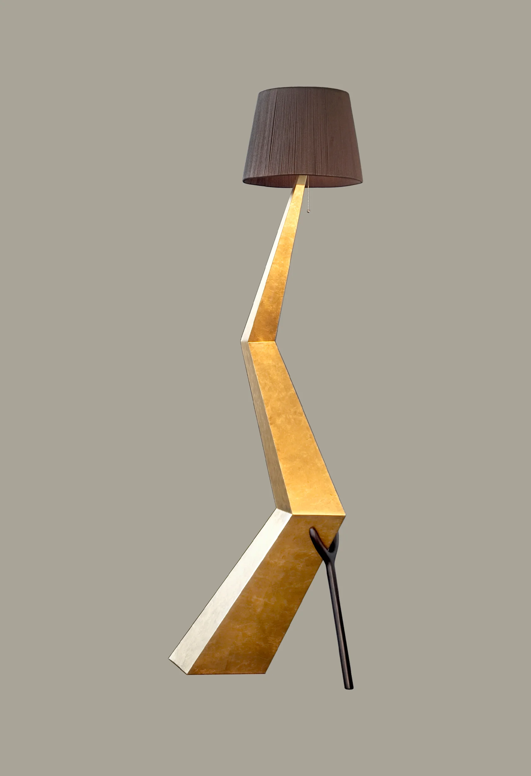The lamp’s sharply angular structure recalls a lightning bolt arrested in motion, descending into a pointed geometry that pierces the handcrafted, ivory-colored lampshade. Its dynamic silhouette creates a sense of tension and directional force, while the surface, finished in luminous gold leaf, heightens its sculptural presence and reflective depth. At the base, a wooden crutch-like support introduces both a structural anchor and a distinctly Surrealist gesture, reinforcing the object’s anthropomorphic and symbolic character