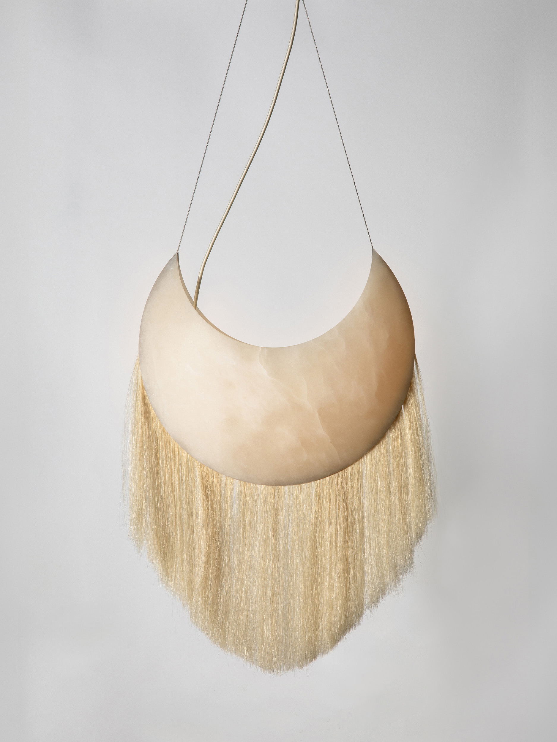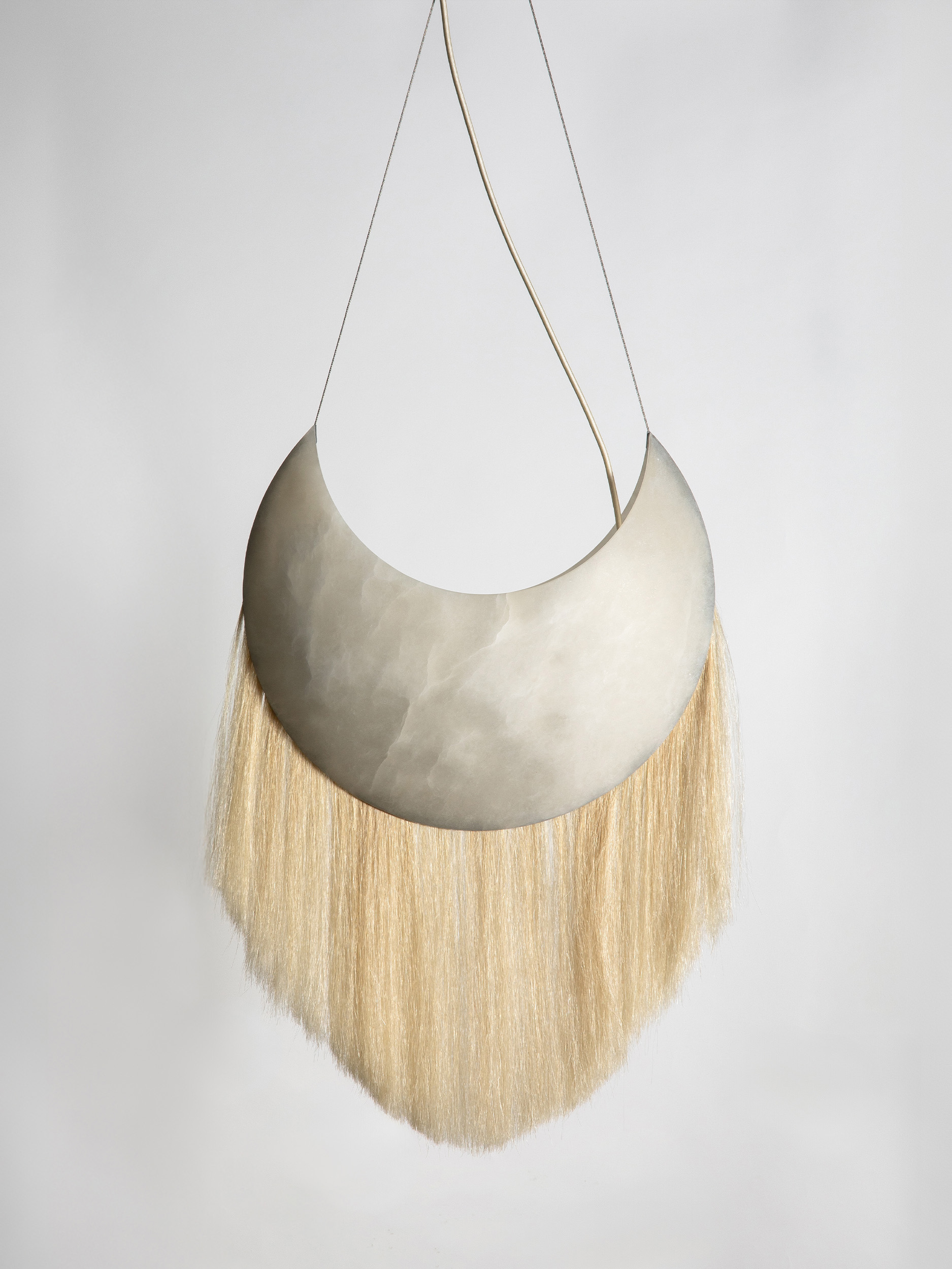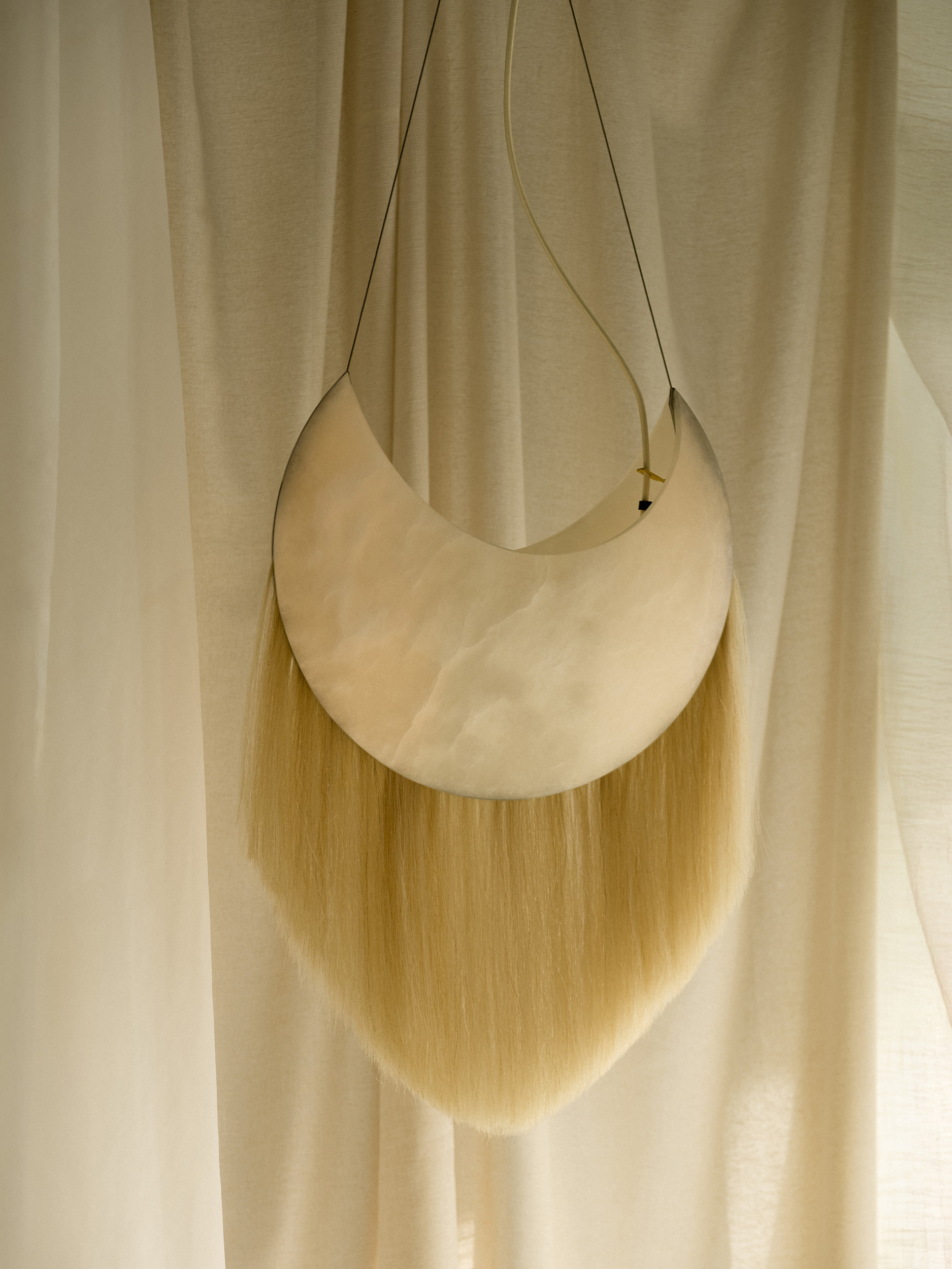 At its core, Cavalo is a meditation on materiality and meaning. Solid antique brass establishes a sense of weight and permanence, its patina suggesting age, ritual, and continuity. Hand-sculpted alabaster introduces a luminous counterpoint, soft and tactile, filtering light with a quiet, almost devotional restraint. Threaded through these elements is the fine silken weft of horse locs, an unexpected yet deliberate gesture that brings movement, sensuality, and a subtle sense of mythology