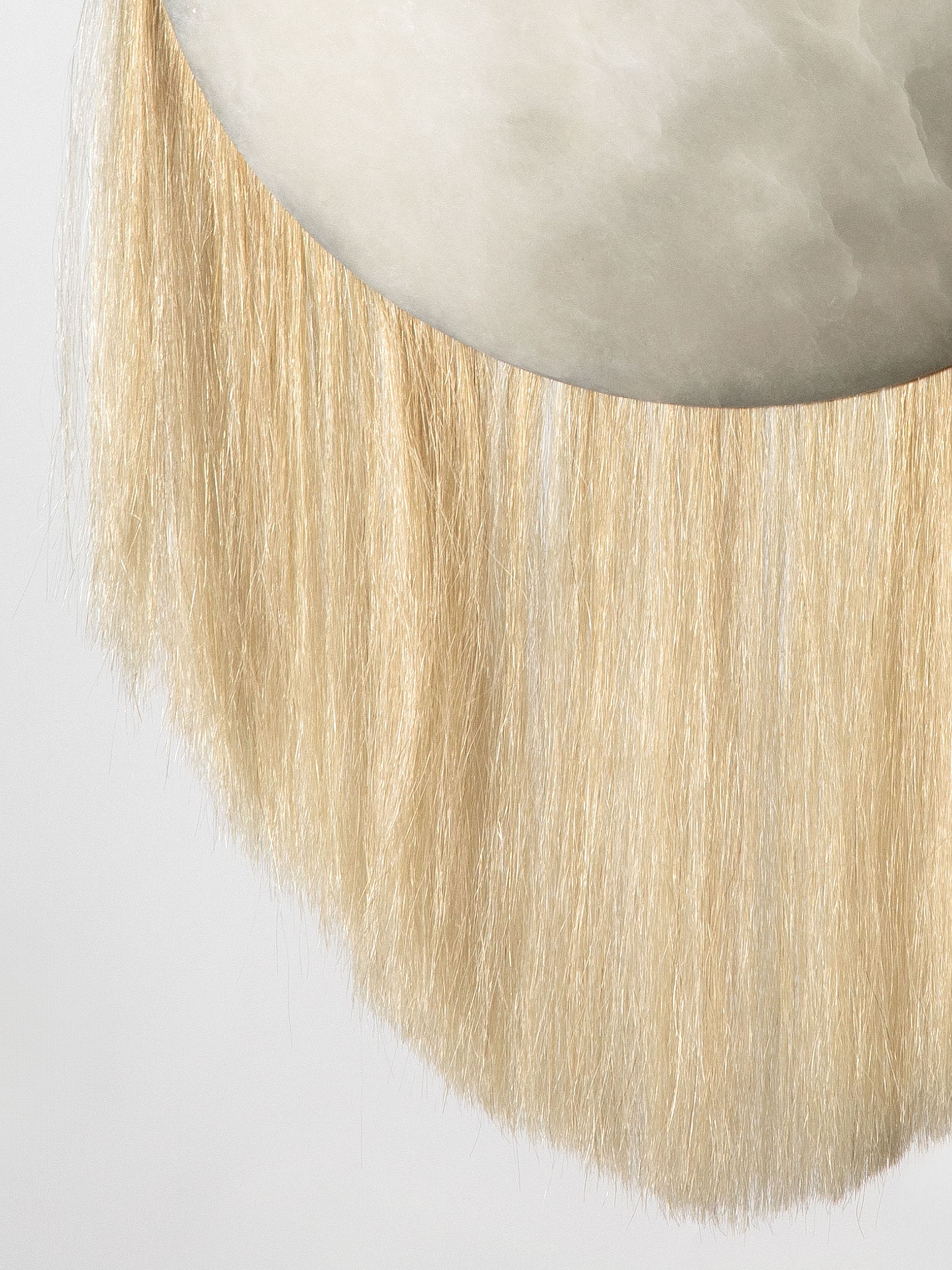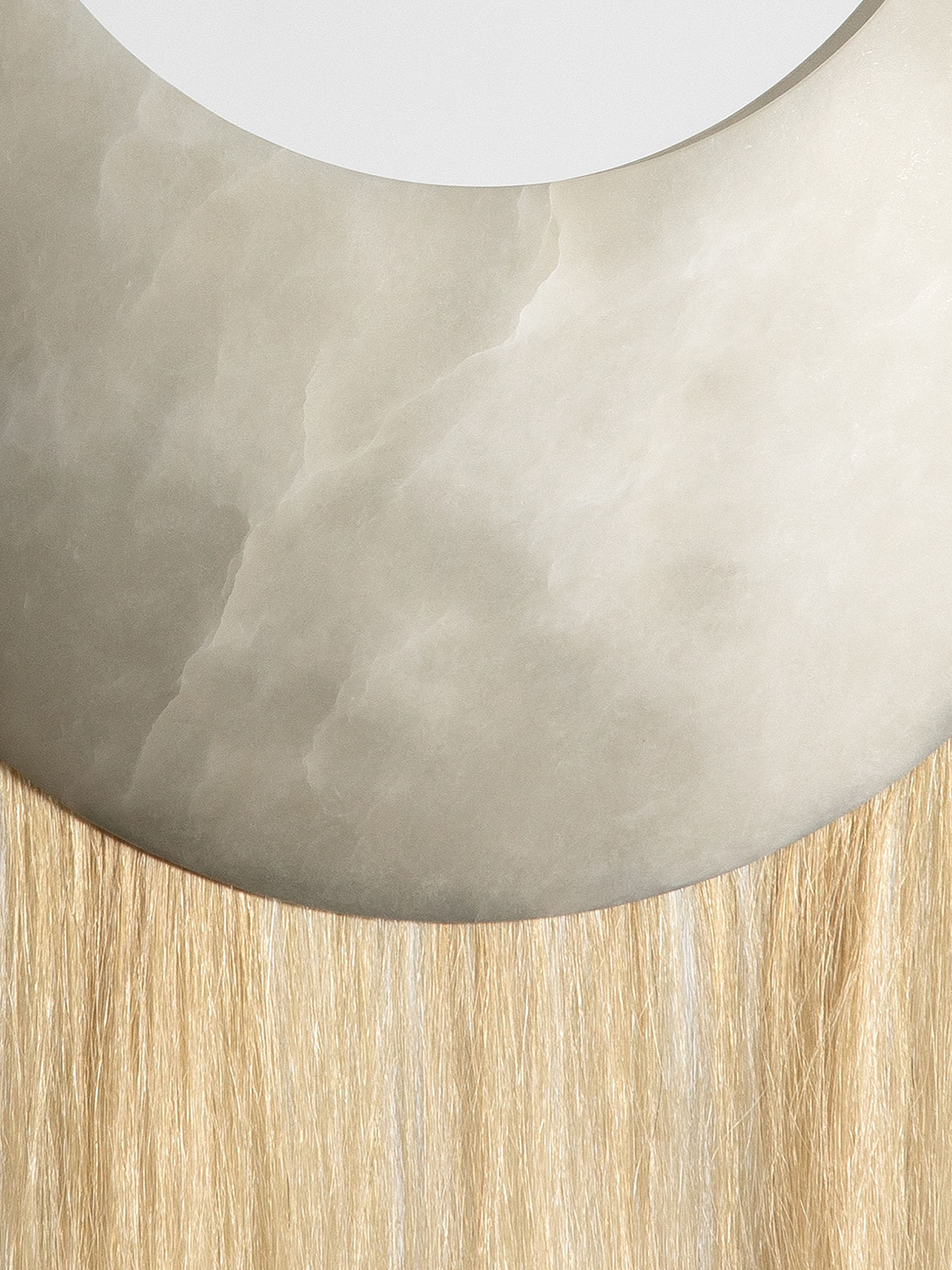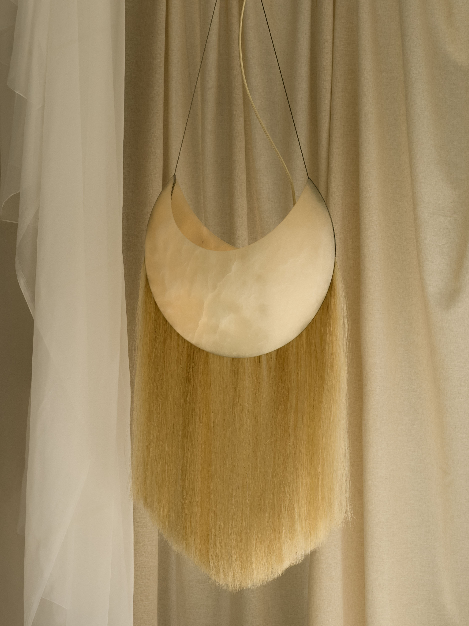 At its core, Cavalo is a meditation on materiality and meaning. Solid antique brass establishes a sense of weight and permanence, its patina suggesting age, ritual, and continuity. Hand-sculpted alabaster introduces a luminous counterpoint, soft and tactile, filtering light with a quiet, almost devotional restraint. Threaded through these elements is the fine silken weft of horse locs, an unexpected yet deliberate gesture that brings movement, sensuality, and a subtle sense of mythology