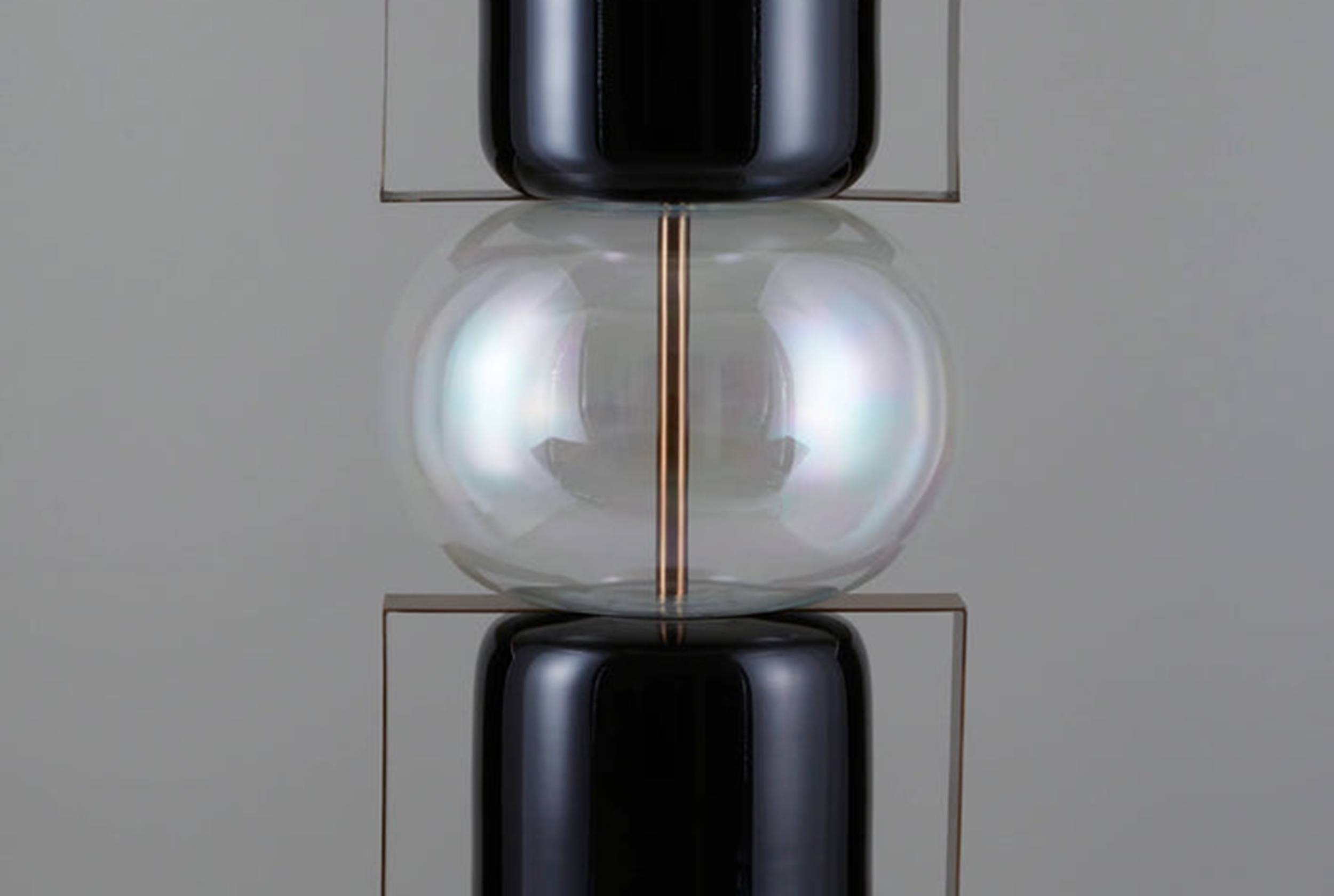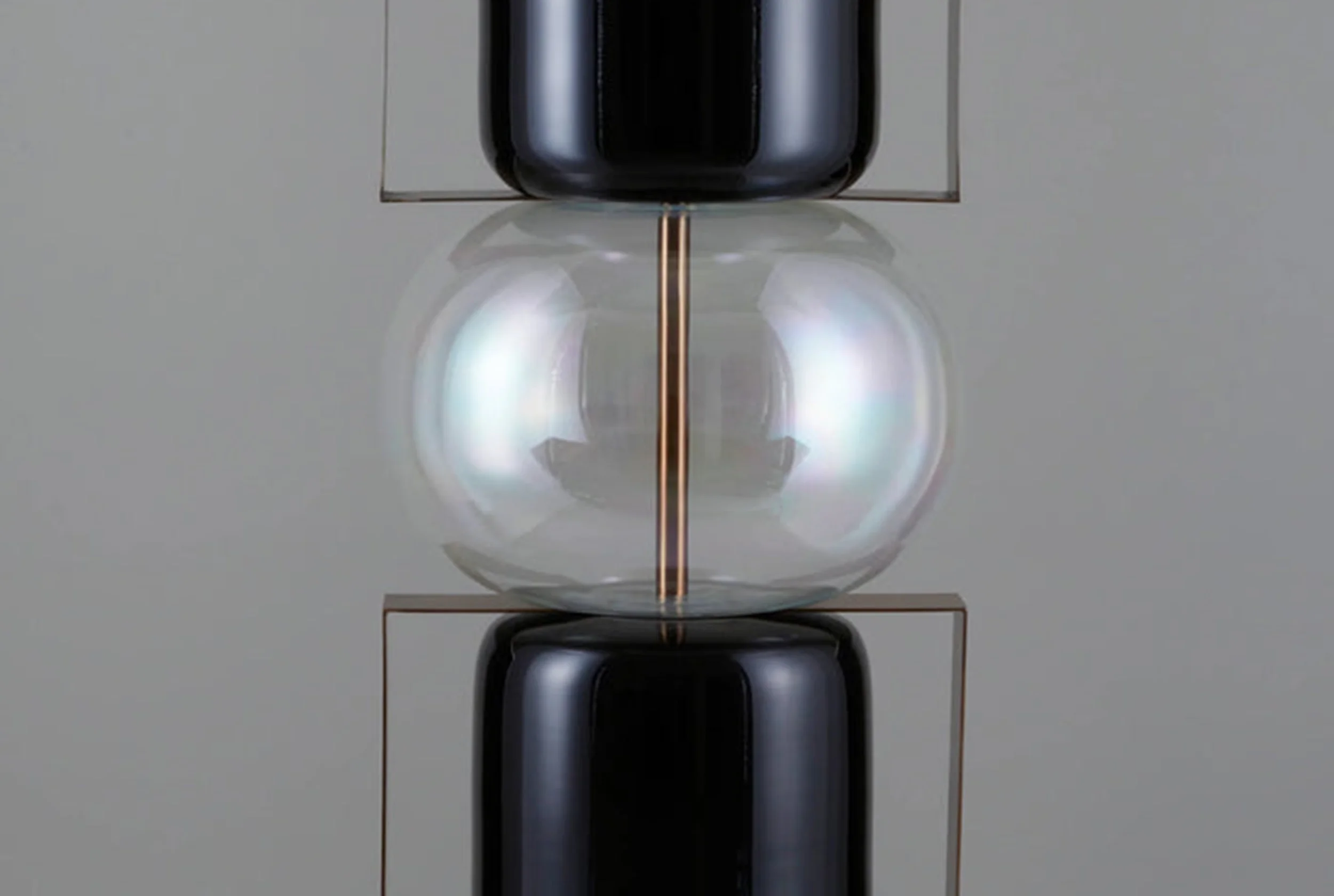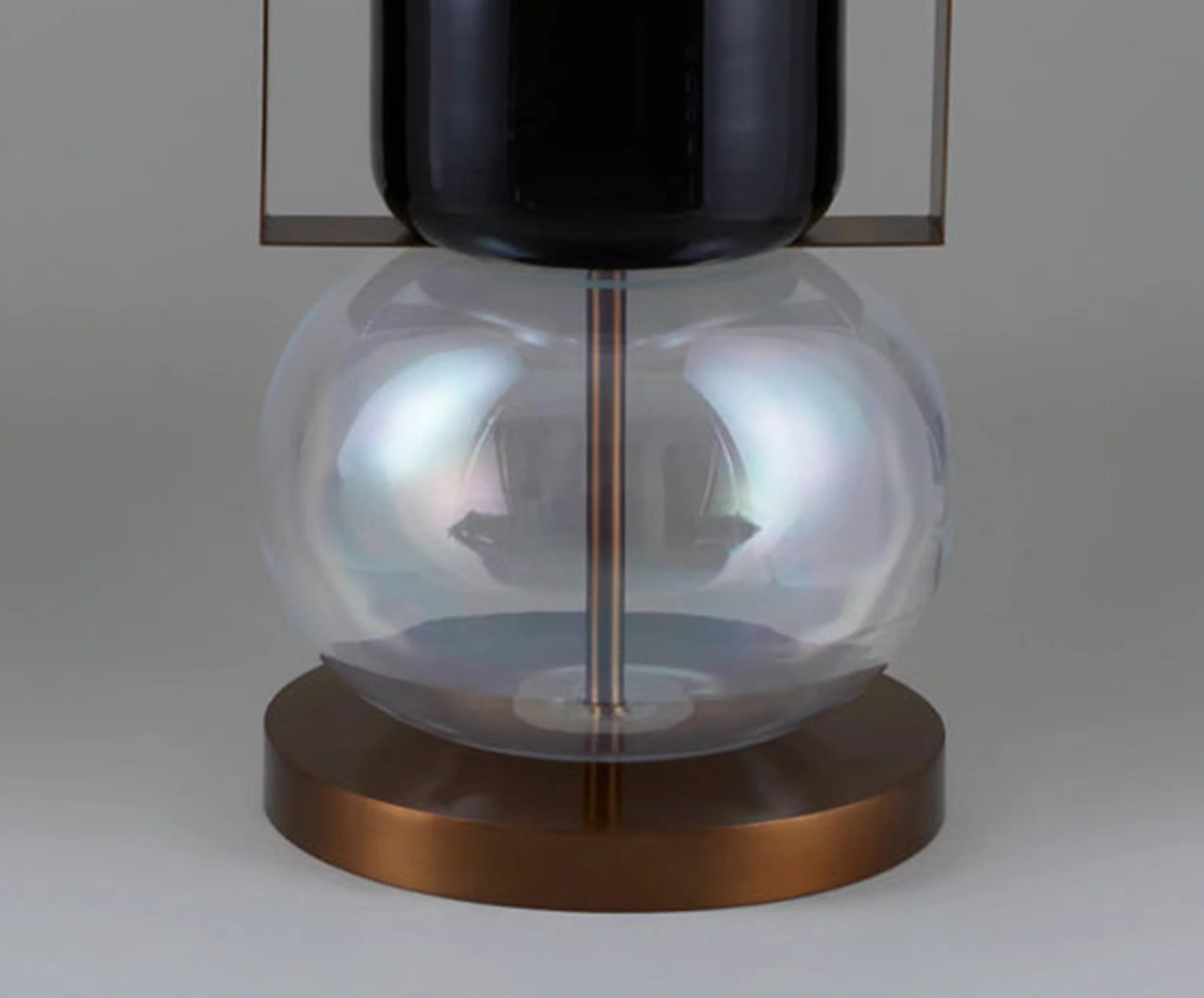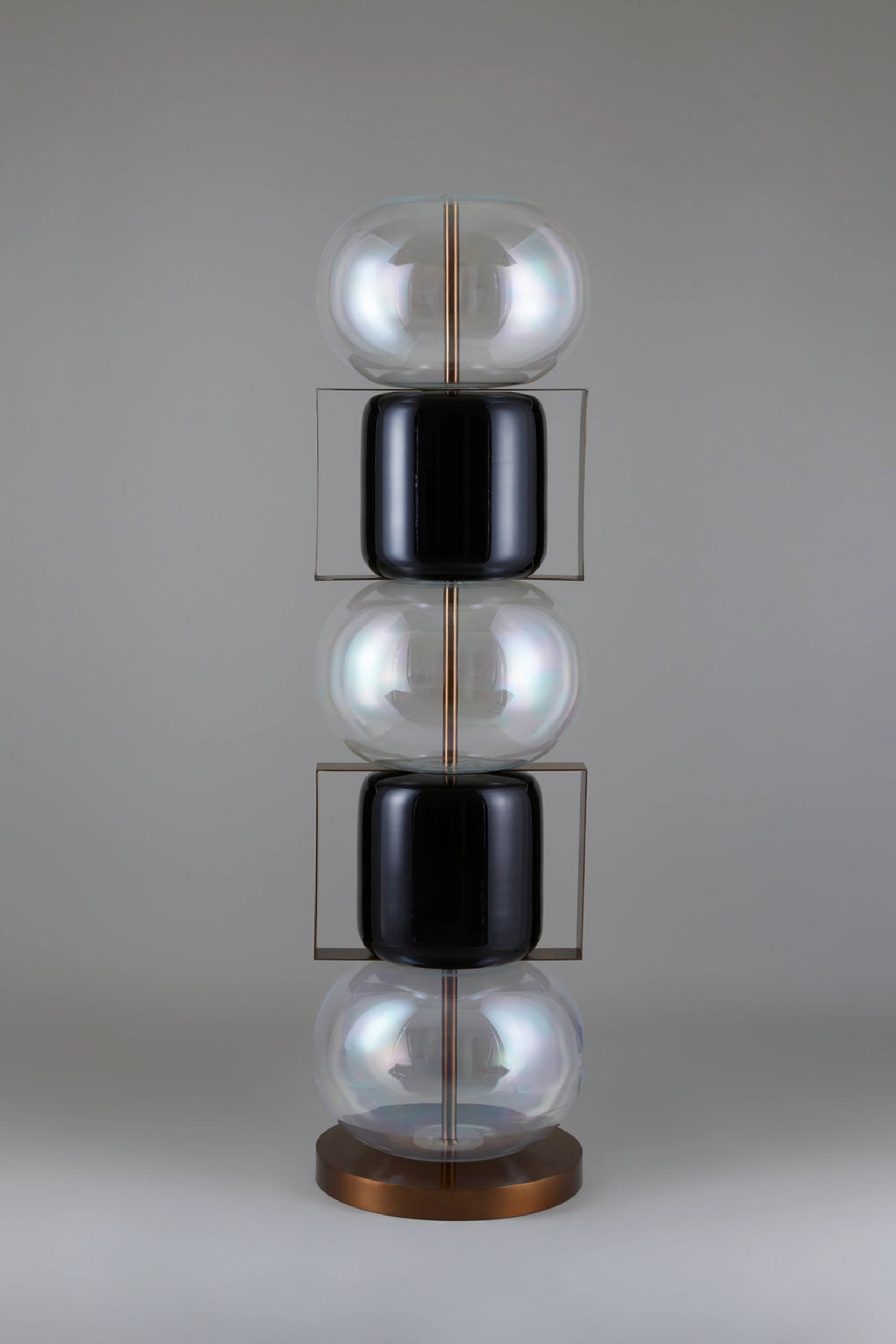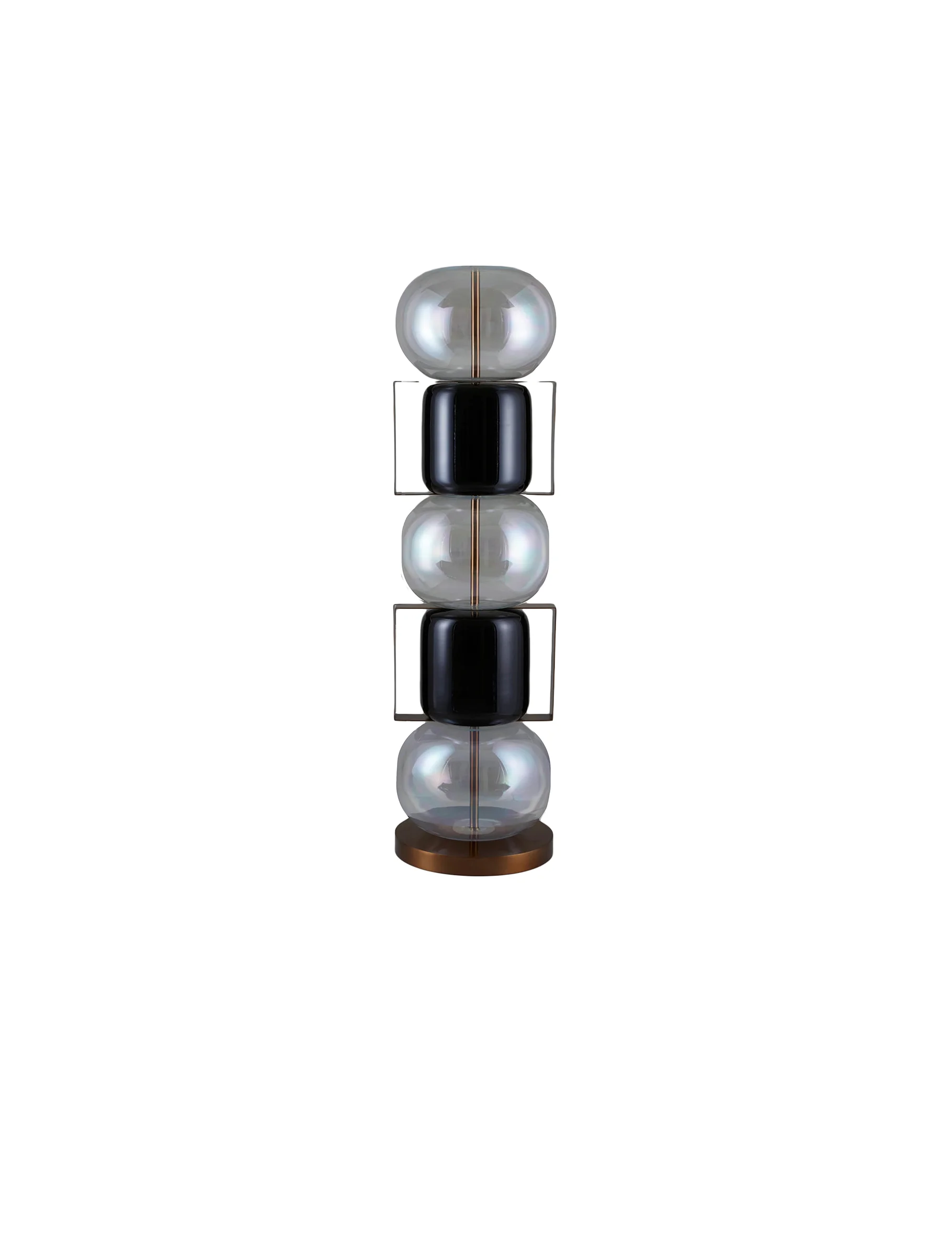 The Celestial Harmony Lamp is a sculptural meditation on balance, rhythm, and light, uniting the sensuality of fluid form with the precision of modern craftsmanship. Alternating spheres of clear and deep ebony glass rise in quiet succession along a brushed brass axis, composing a vertical symphony of contrast and reflection. This calibrated interplay evokes the waxing and waning of an eclipse—moments when darkness and illumination coexist in fragile equilibrium