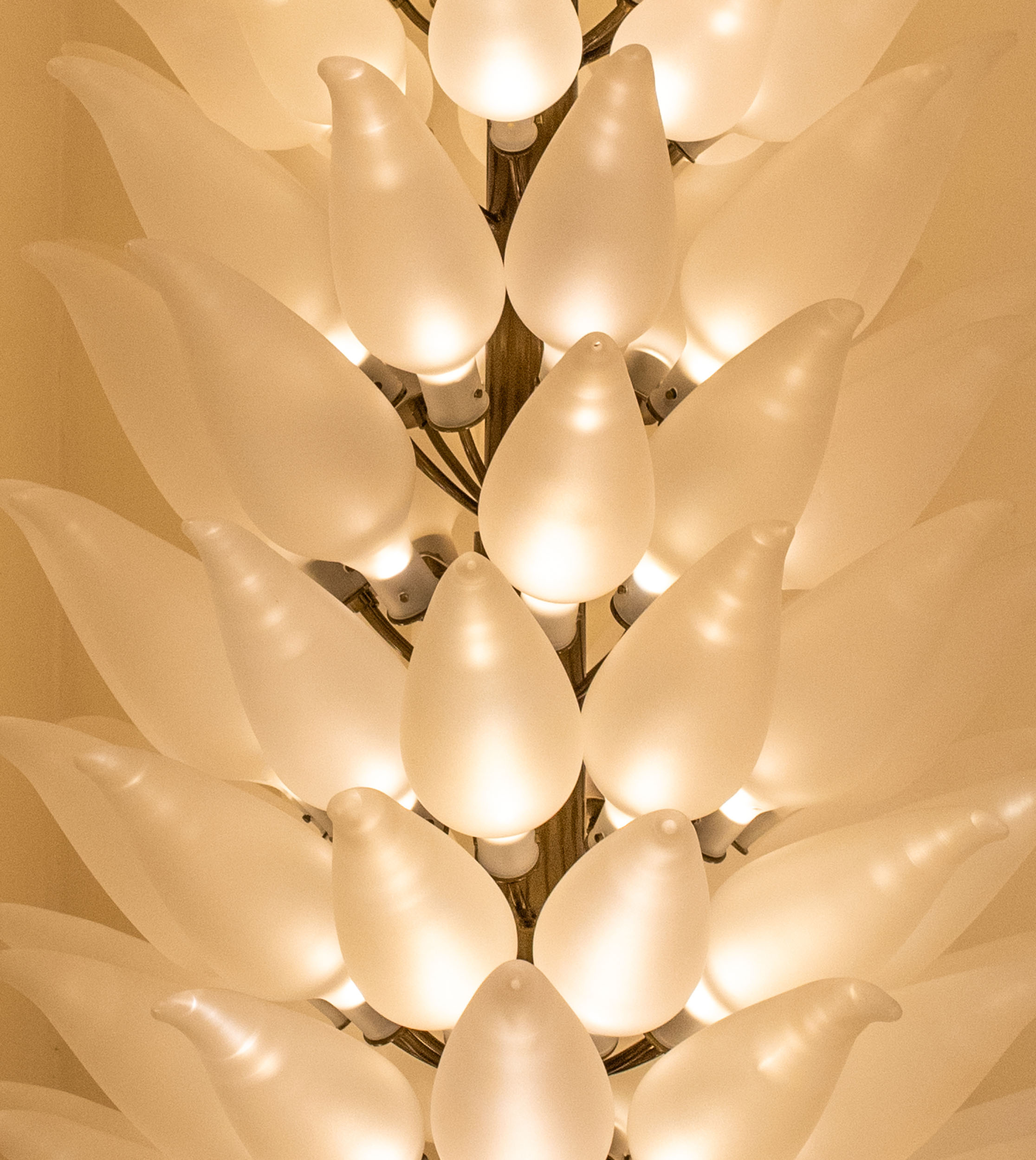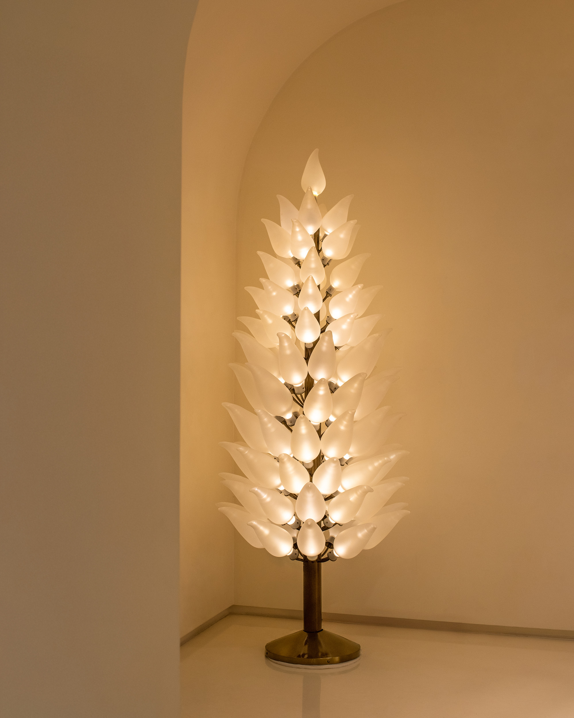 The lamp’s very name—meaning the tree of light—defines its spirit. Its handblown glass components emanate a warm, amber radiance reminiscent of sun filtering through a cascade of autumn foliage. The refined structure, at once architectural and organic, transforms light into a living texture, a quiet metaphor for the continuity between nature and craft
