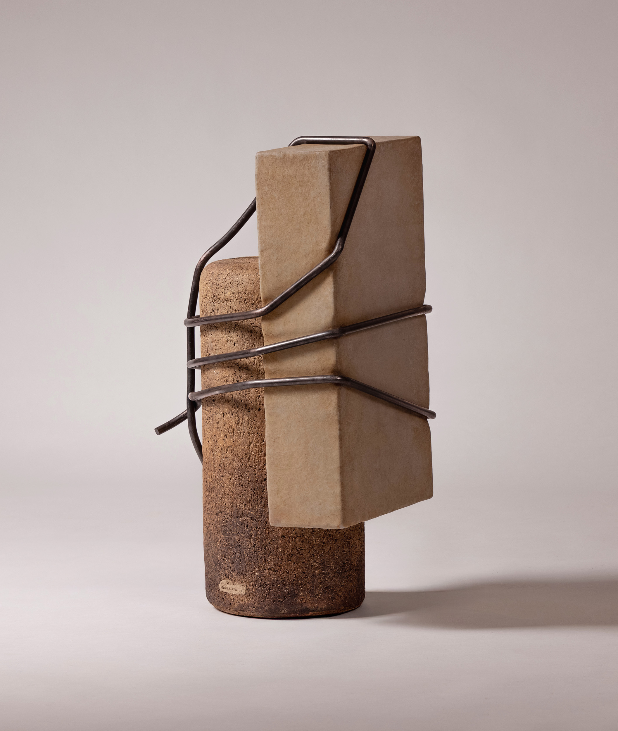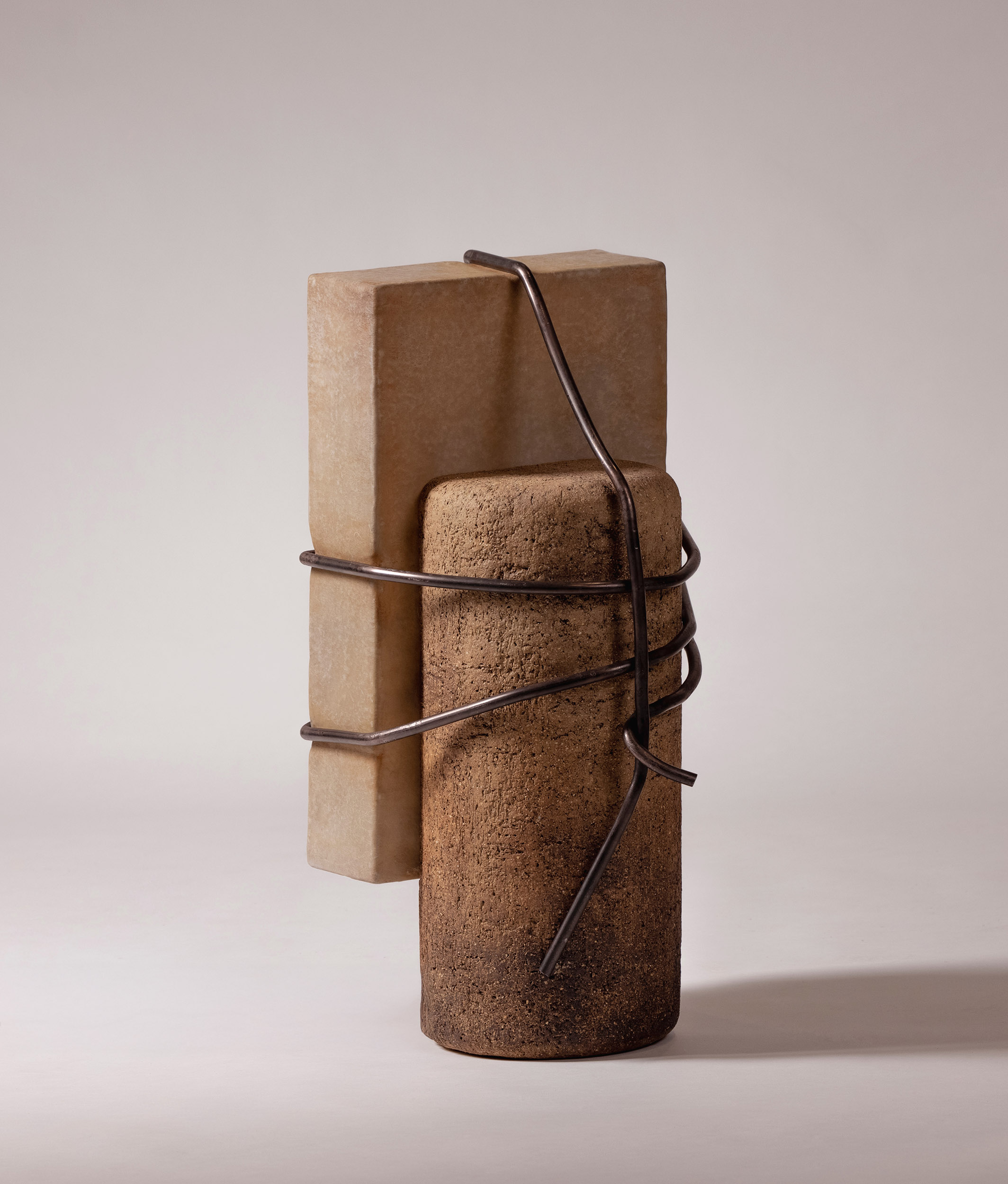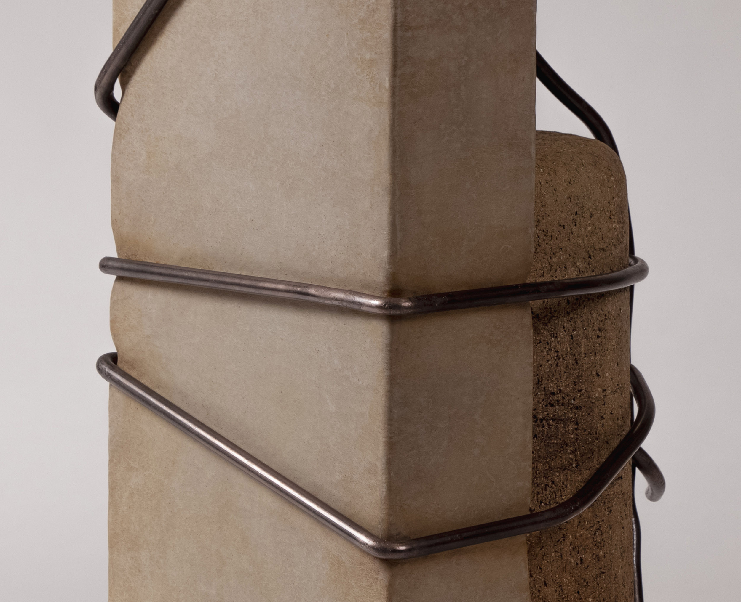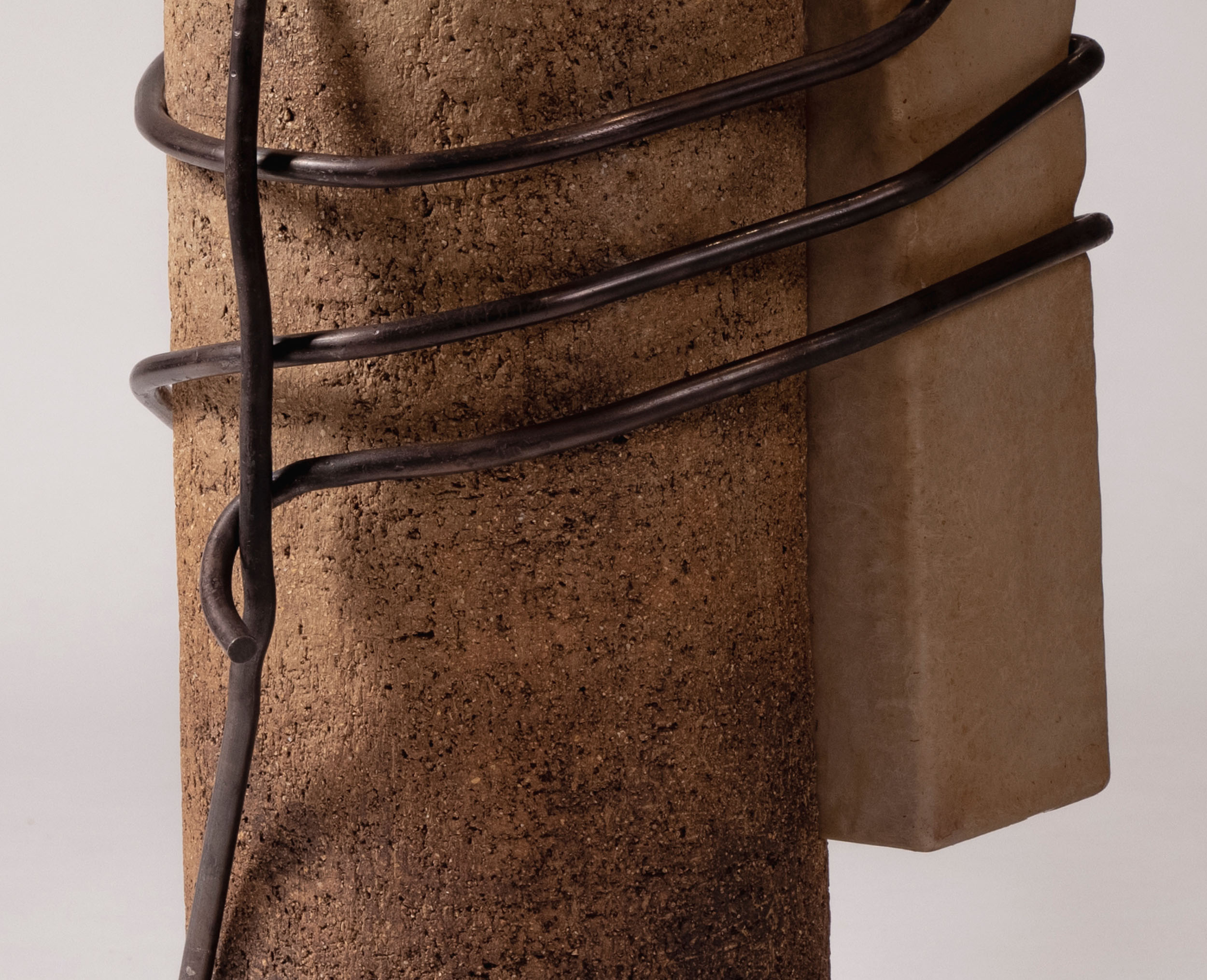 At its core, the work consists of a ceramic volume tightly encircled by a bent steel element. The metal band, simultaneously elegant and forceful, wraps the stoneware body in a gesture of restraint, compressing it until the surface yields. Subtle distortions emerge where clay meets steel, revealing a dialogue between strength and vulnerability, permanence and change. The marks left behind, softened scars and faint impressions, serve as physical memories of tension transformed, of structure under duress finding new equilibrium