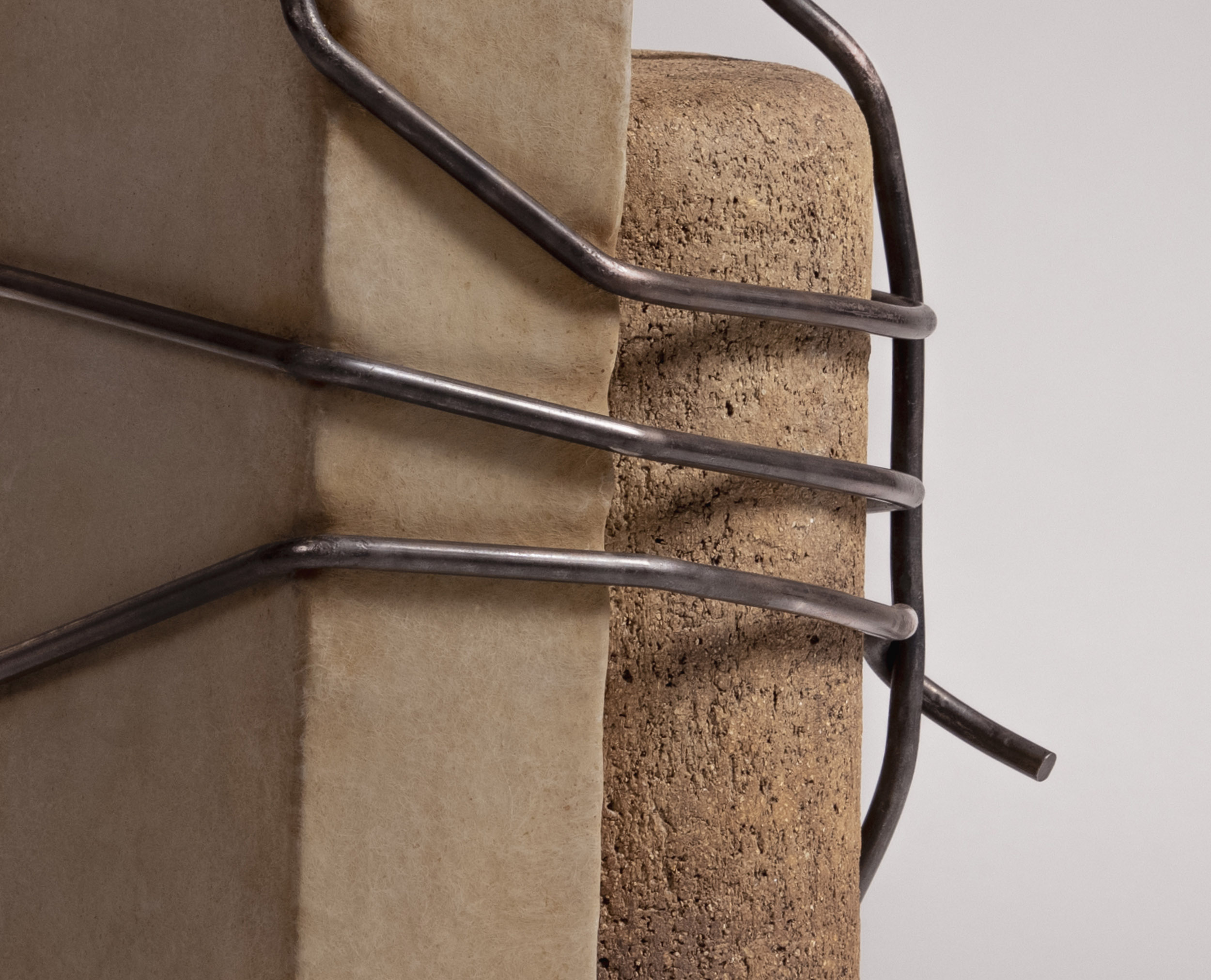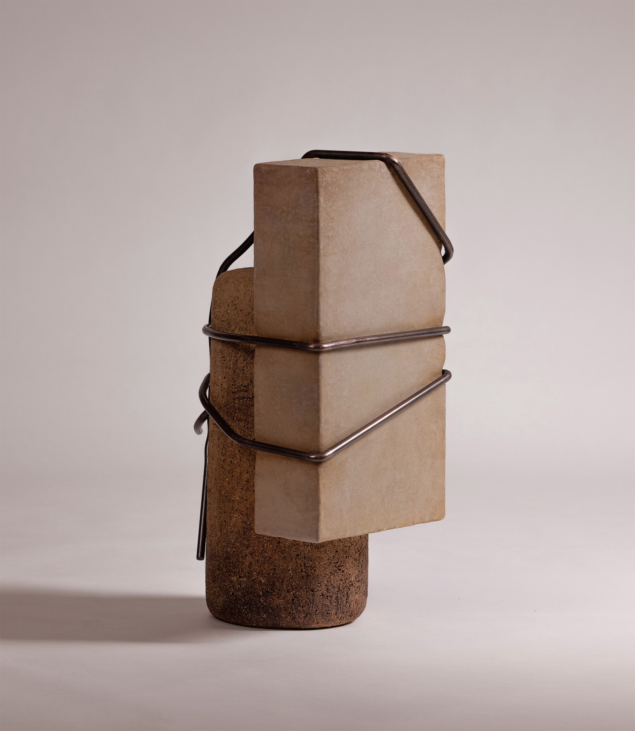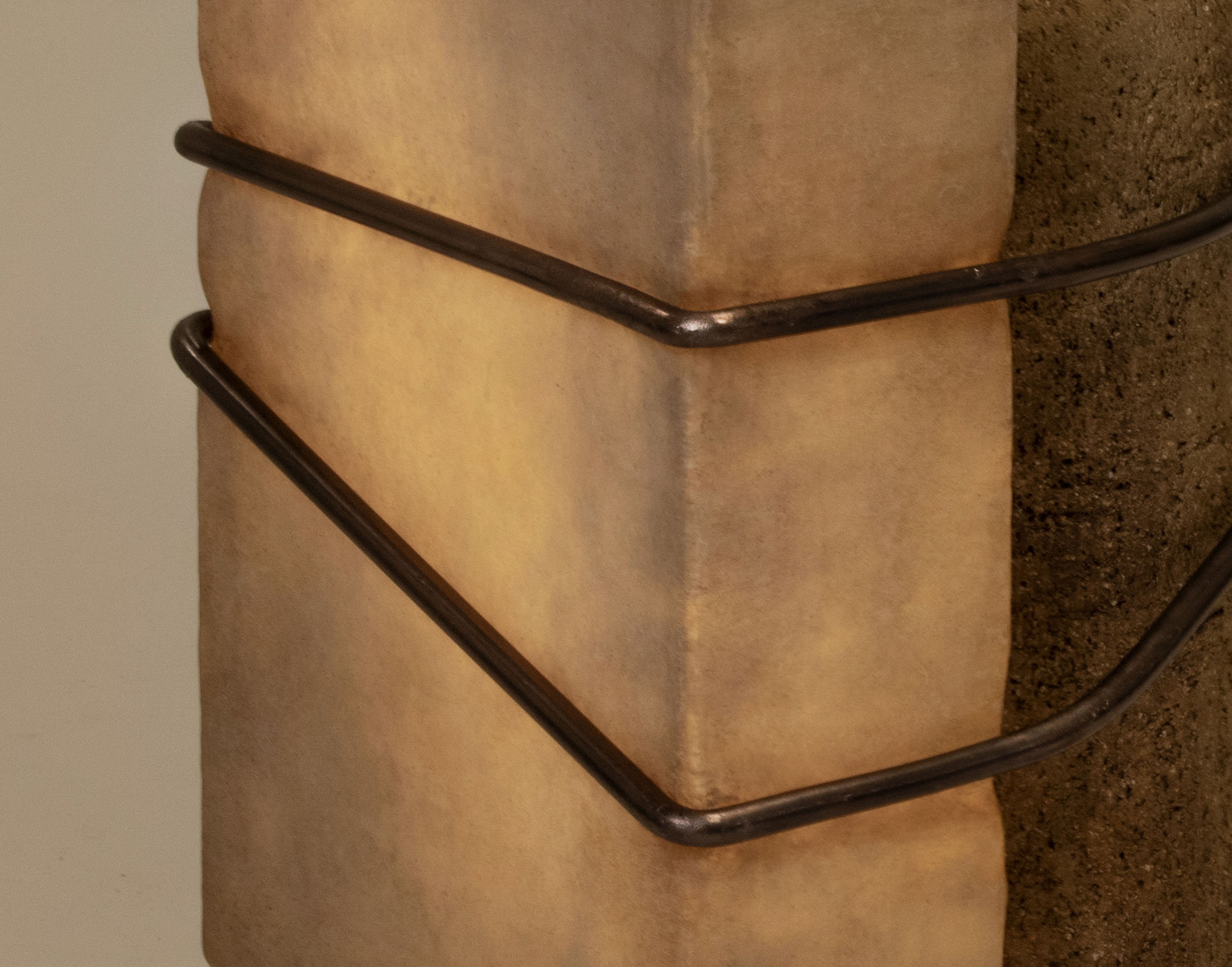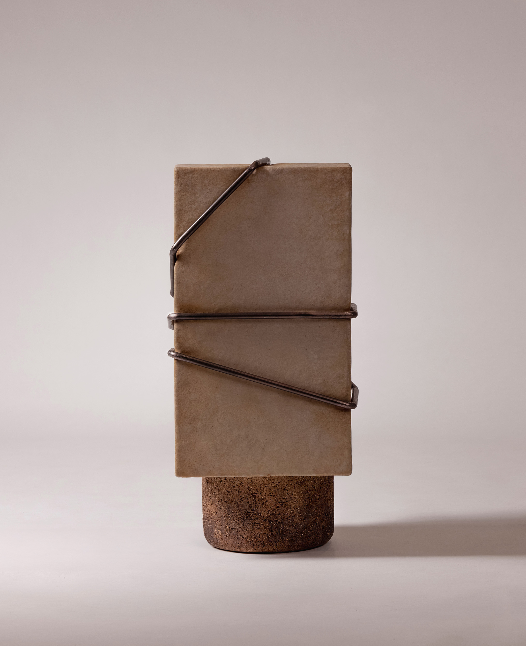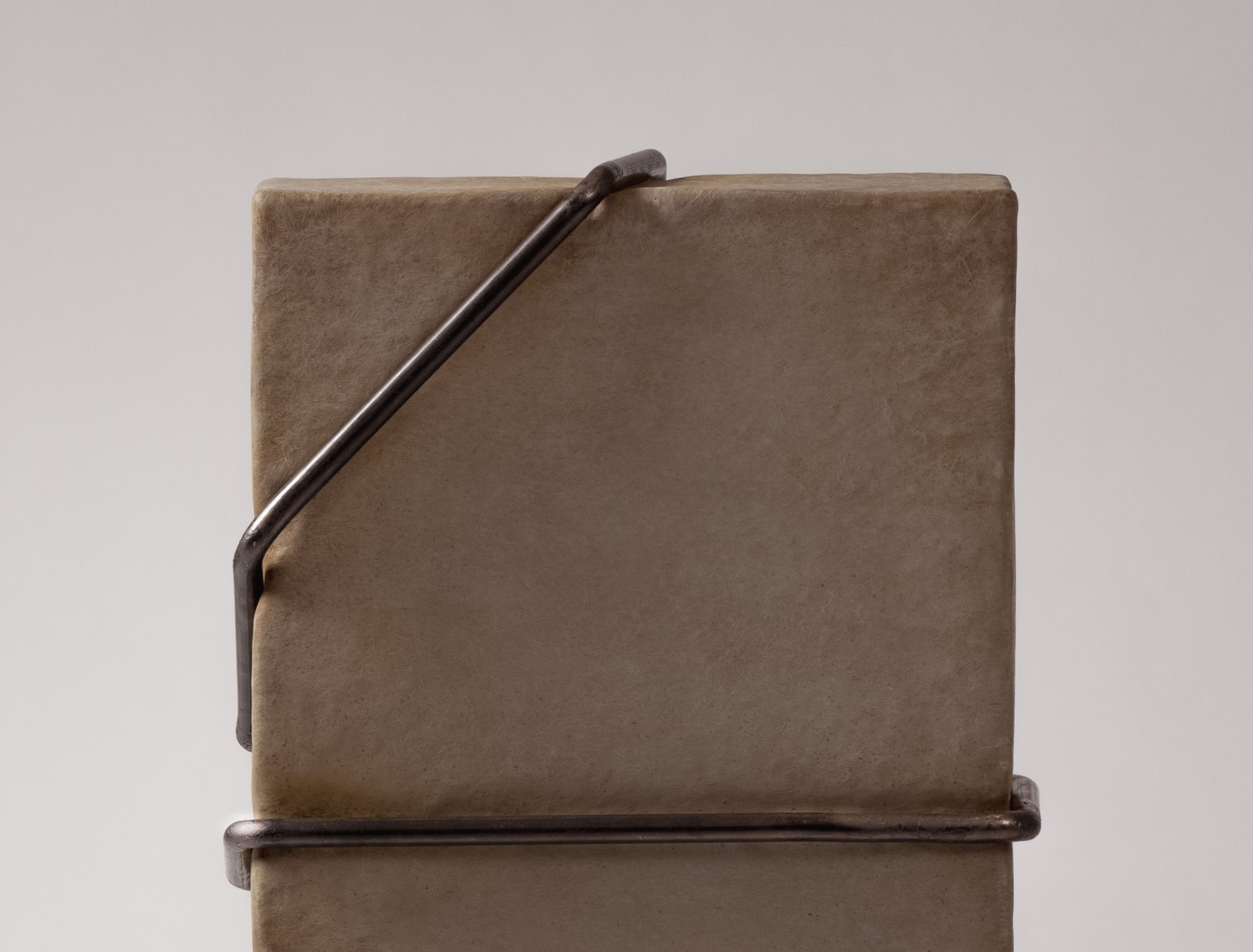 At its core, the work consists of a ceramic volume tightly encircled by a bent steel element. The metal band, simultaneously elegant and forceful, wraps the stoneware body in a gesture of restraint, compressing it until the surface yields. Subtle distortions emerge where clay meets steel, revealing a dialogue between strength and vulnerability, permanence and change. The marks left behind, softened scars and faint impressions, serve as physical memories of tension transformed, of structure under duress finding new equilibrium