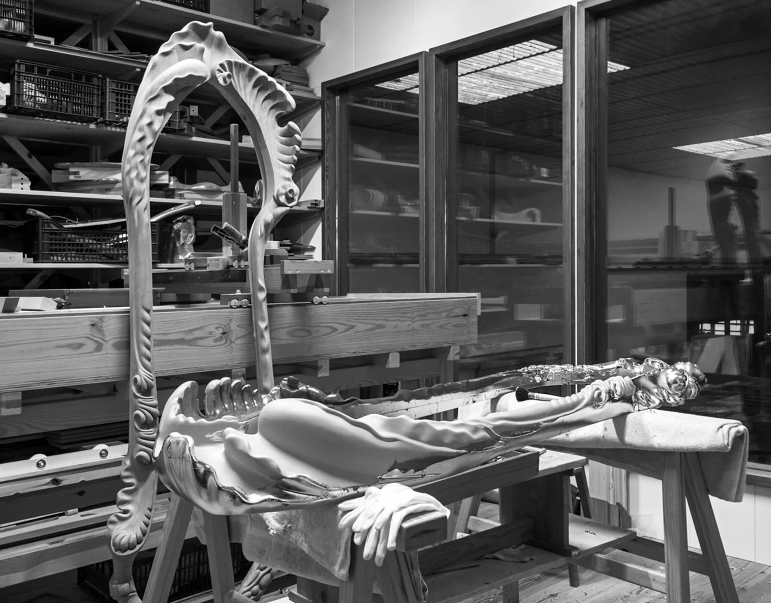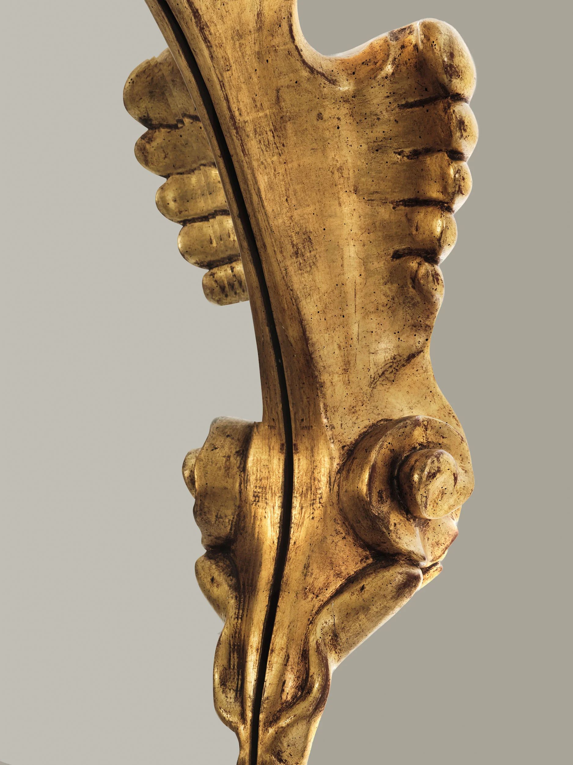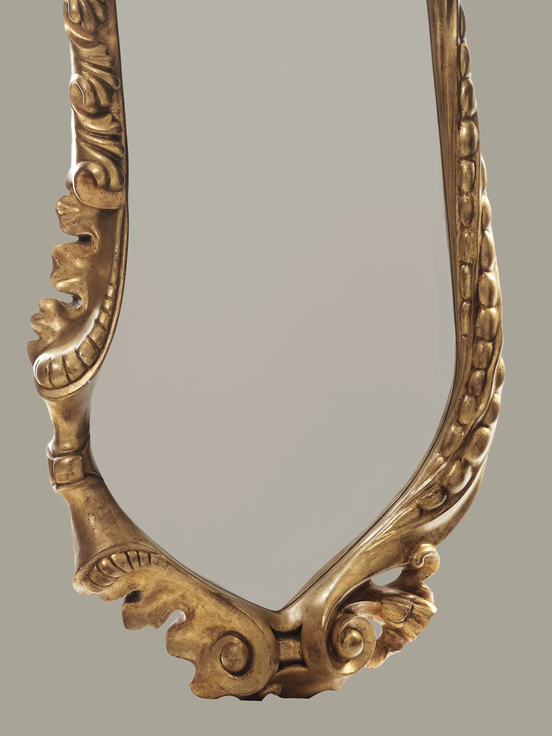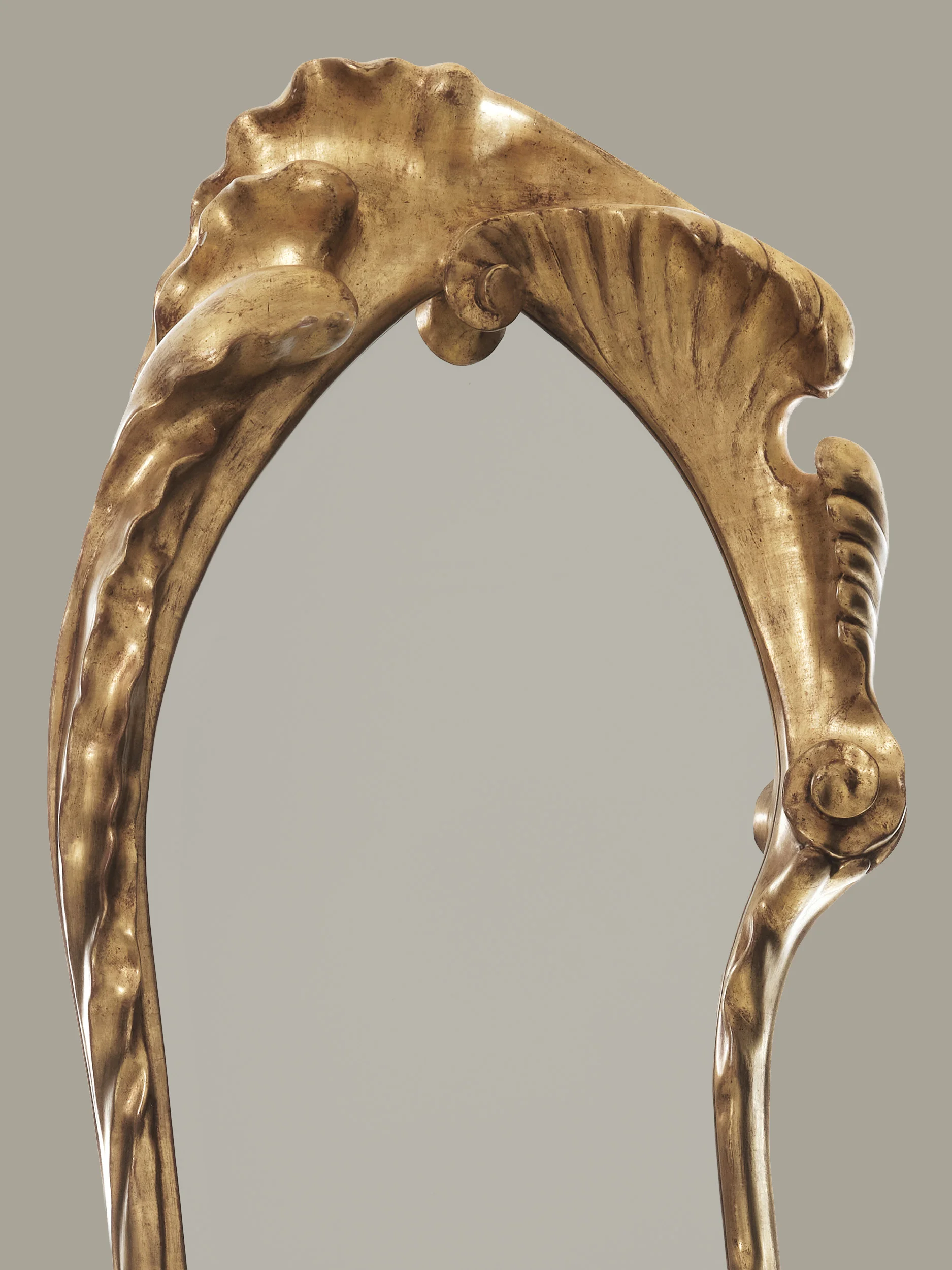 Defined by a sense of movement and tactile depth, the mirror’s frame unfolds in fluid, swirling forms that give the object a distinct personality. Gilded in gold leaf, the frame catches and animates light, enhancing the mirror’s visual impact within the space. The mirror glass itself is hand-shaped, reinforcing the artisanal character of the piece and elevating it beyond simple reflection into the realm of crafted sculpture