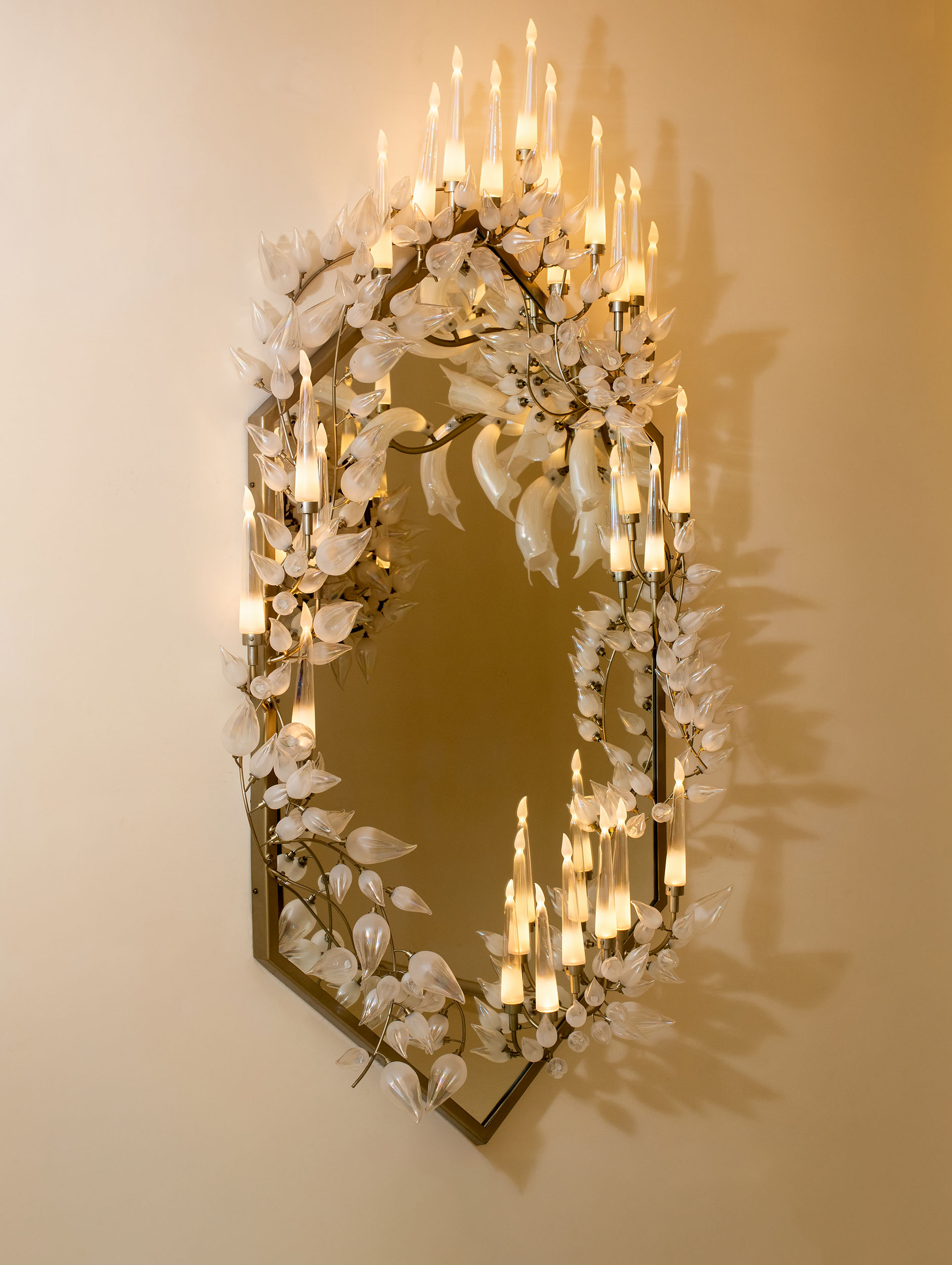 The companion mirror extends this dialogue between reflection and radiance. Its frame, adorned with the same shimmering glass leaves, transforms a functional surface into a sculptural experience. Viewed together, the collection embodies a refined duality: solidity and air, art and utility, presence and reflection